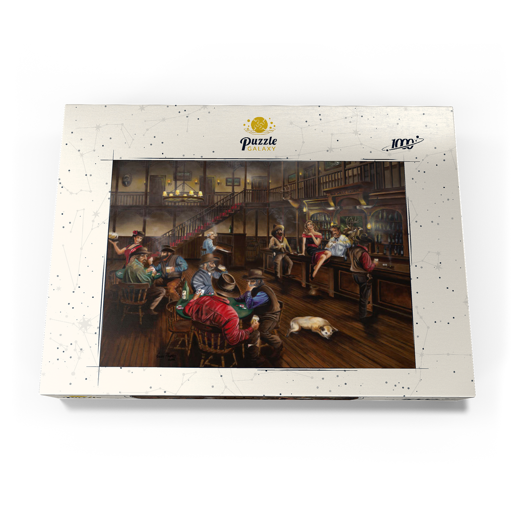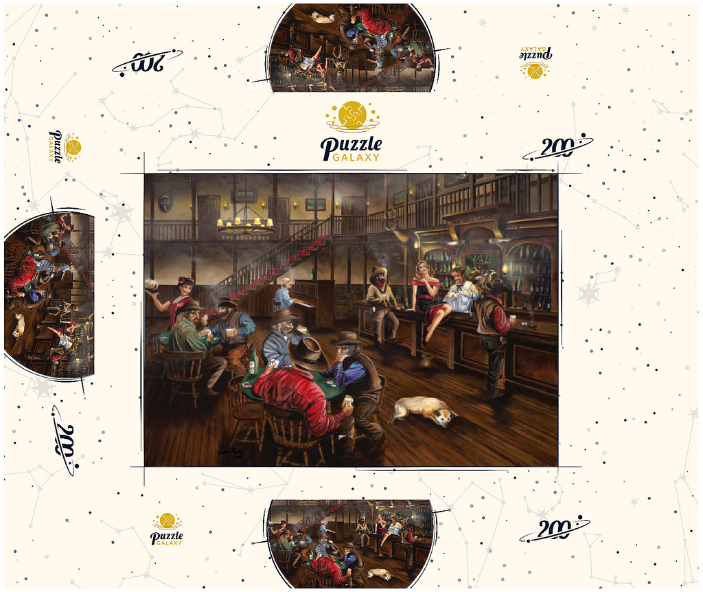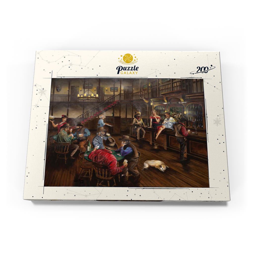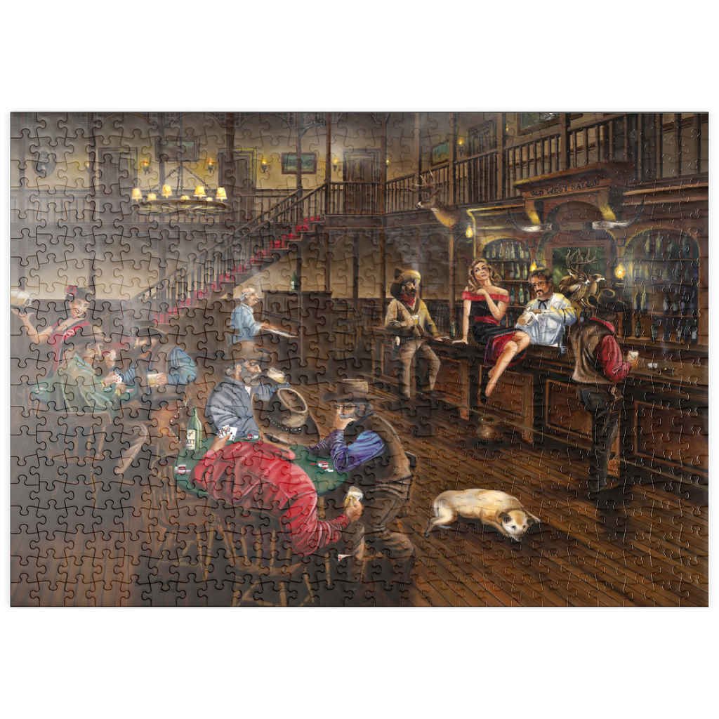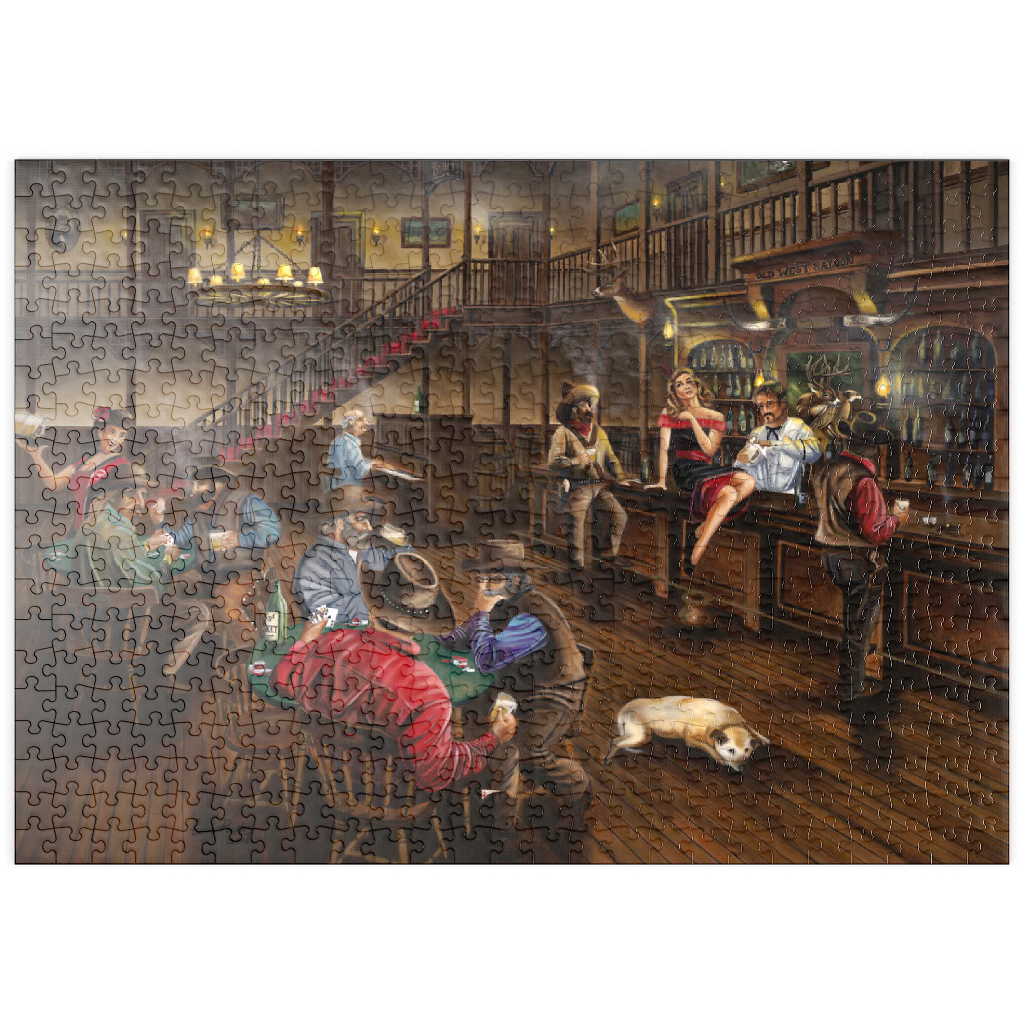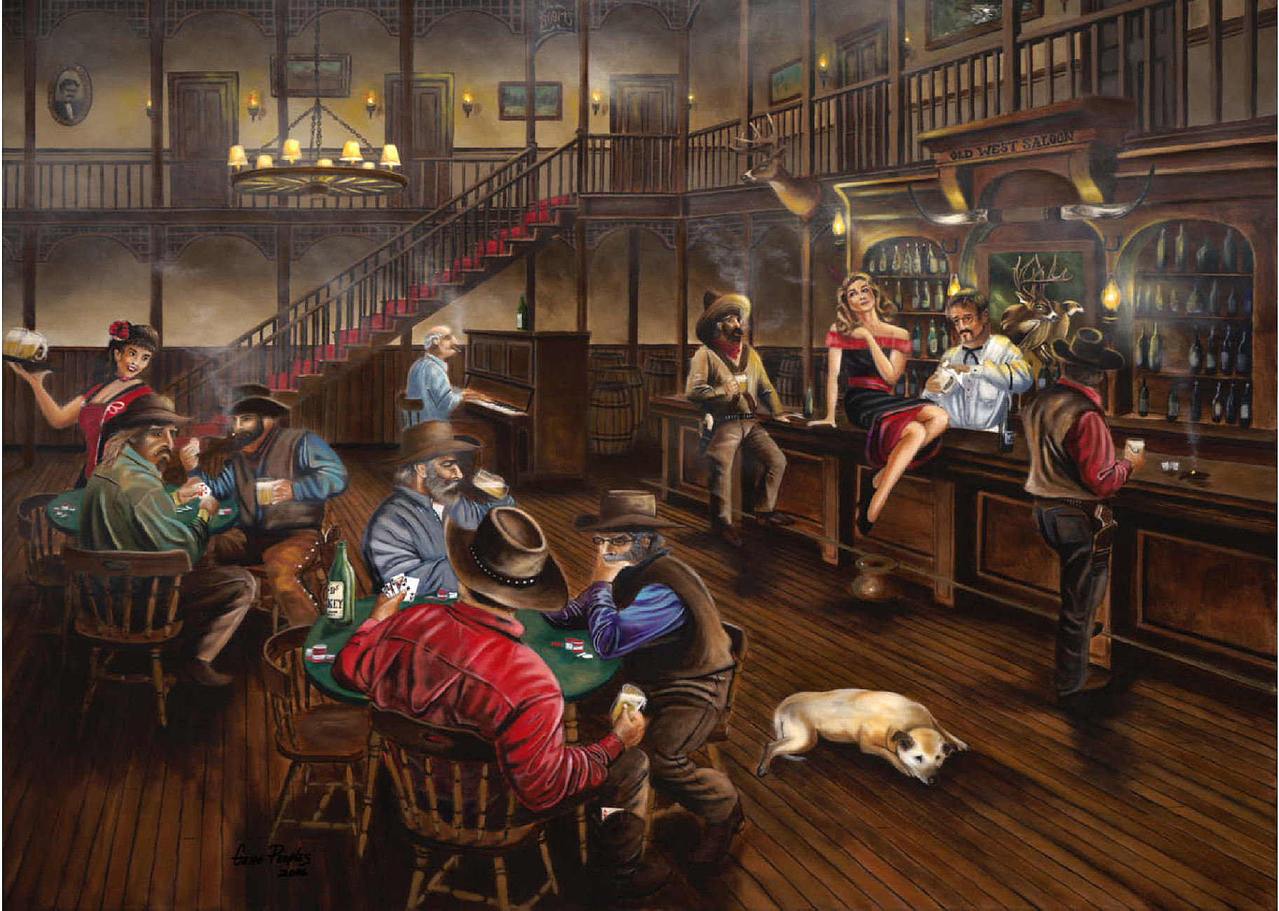 Dieses detailreiche Kunstwerk fängt eine lebhafte Szene in einem klassischen Saloon im Wilden Westen ein. Cowboys versammeln sich um Kartentische, spielen intensiv Poker und trinken gemeinsam, während ein lebhafter Barkeeper hinter einer gut gefüllten Bar Whiskey ausschenkt. Ein Pianist sorgt im Hintergrund für musikalische Untermalung, und eine Showgirl in Rot zieht mit ihrer eleganten Ausstrahlung alle Blicke auf sich. Ausgestopfte Tiere, eine Innenausstattung aus Holz, Kronleuchter und eine Treppe, die zu den Zimmern im Obergeschoss führt, tragen zur authentischen Westernatmosphäre bei. Die entspannte Präsenz eines schlafenden Hundes verleiht der ansonsten geschäftigen Umgebung voller Kameradschaft und Unfug einen Hauch von Ruhe.
