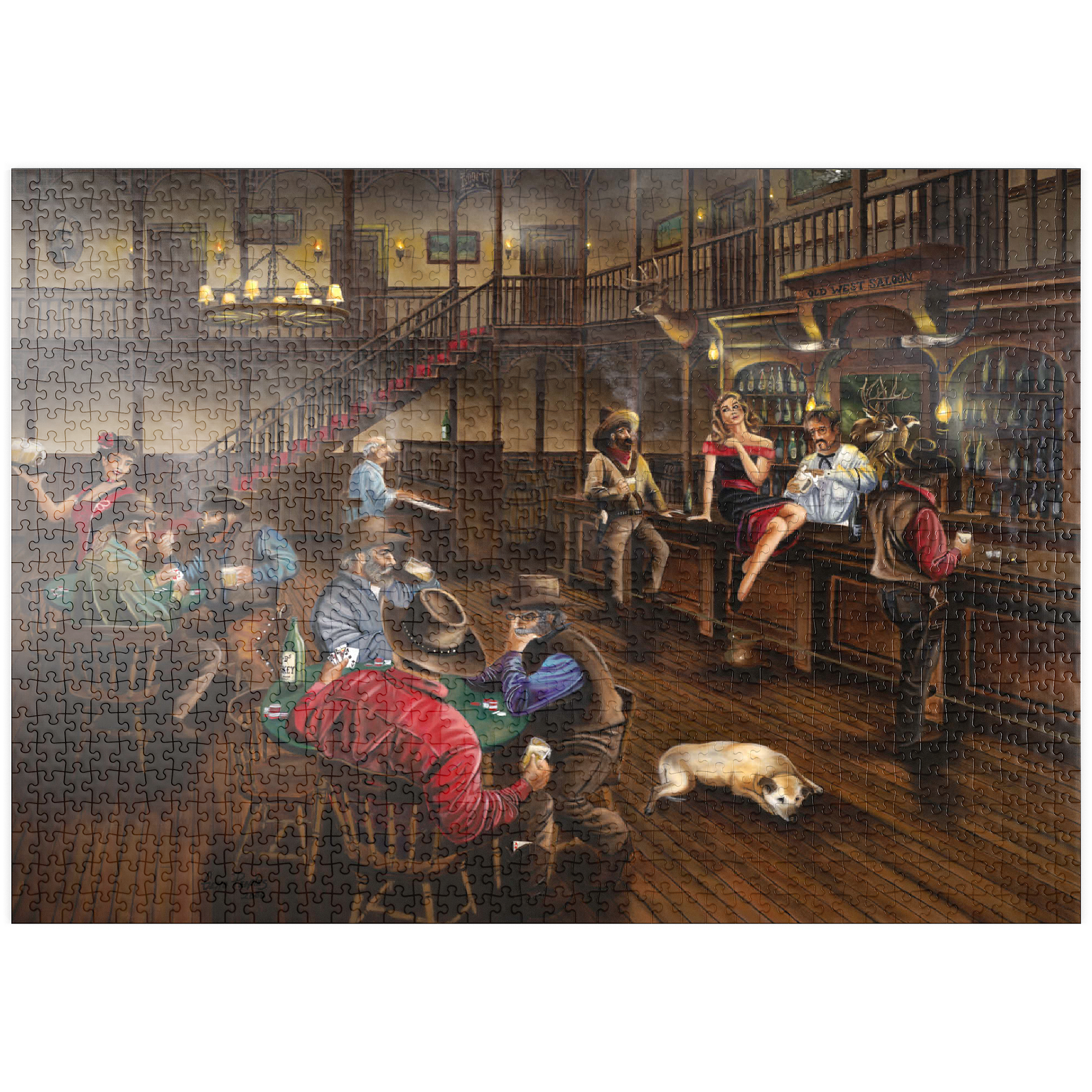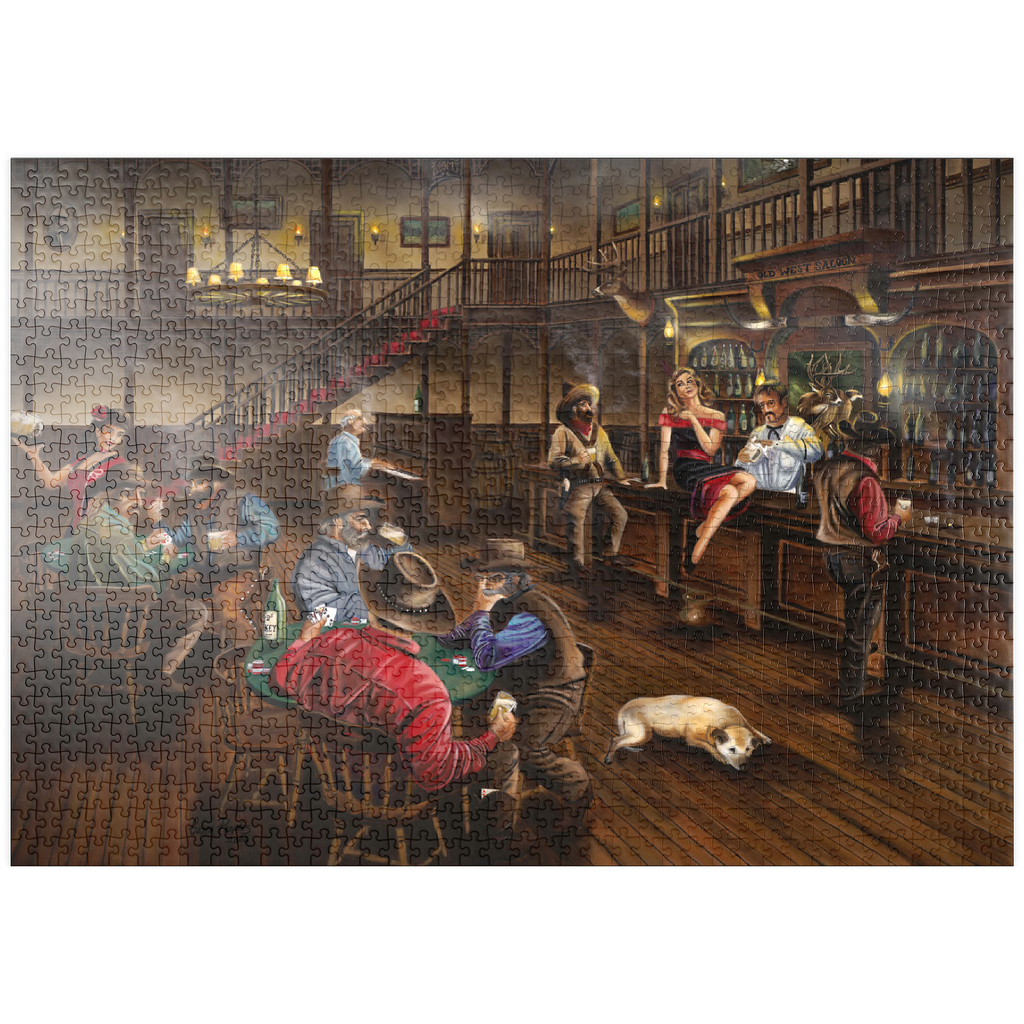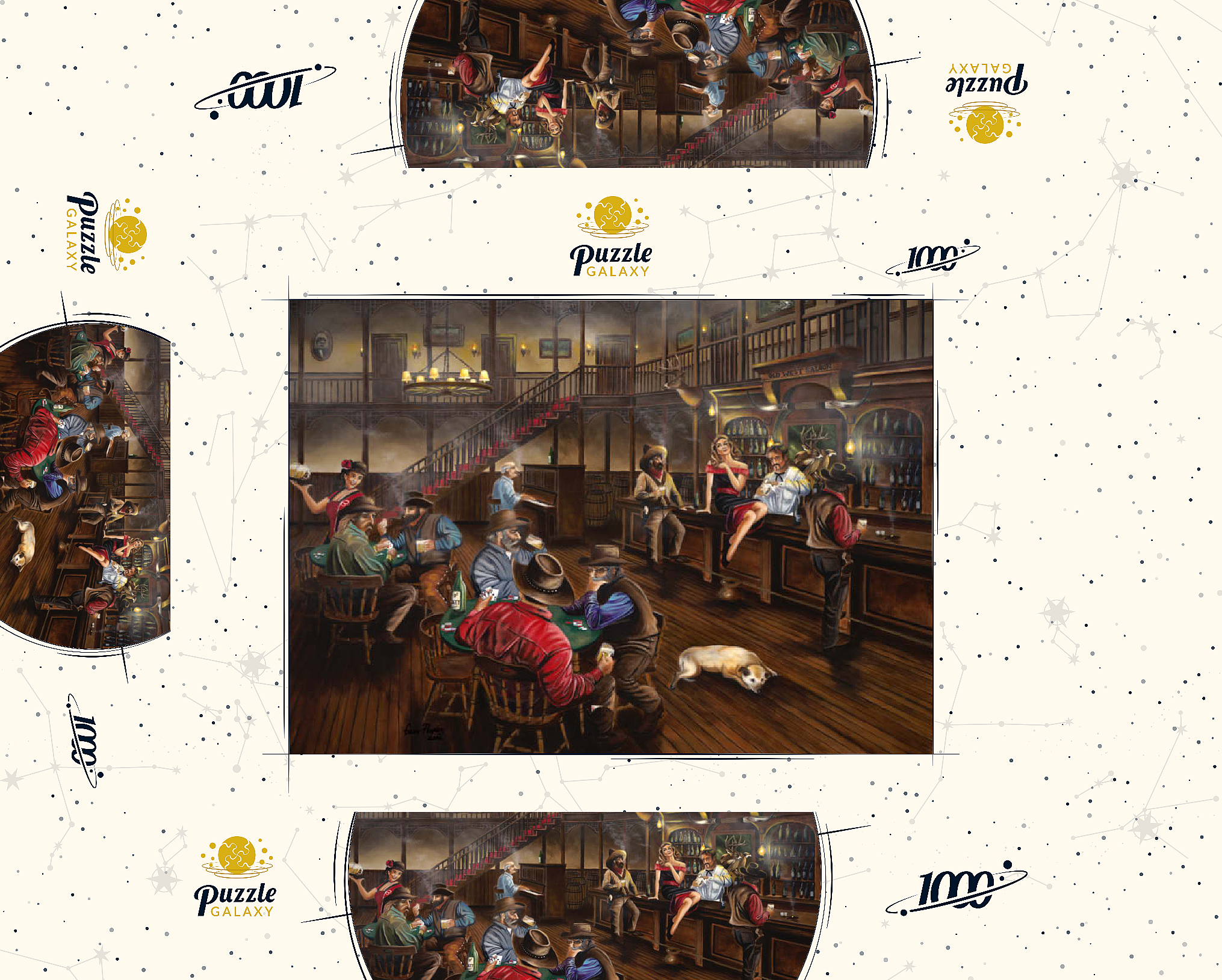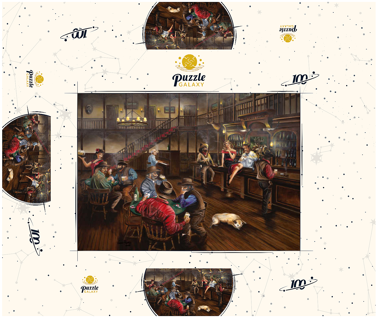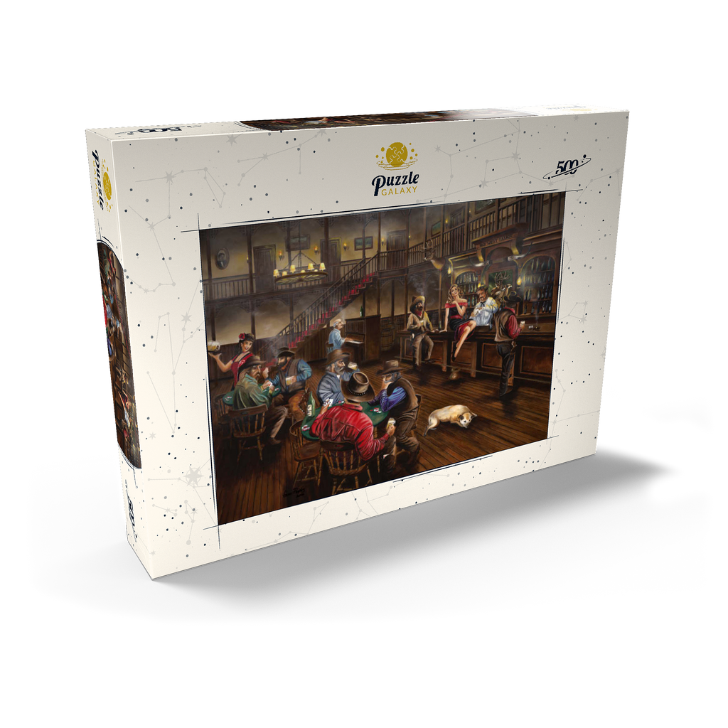 Dieses detailreiche Kunstwerk fängt eine lebhafte Szene in einem klassischen Saloon im Wilden Westen ein. Cowboys versammeln sich um Kartentische, spielen intensiv Poker und trinken gemeinsam, während ein lebhafter Barkeeper hinter einer gut gefüllten Bar Whiskey ausschenkt. Ein Pianist sorgt im Hintergrund für musikalische Untermalung, und eine Showgirl in Rot zieht mit ihrer eleganten Ausstrahlung alle Blicke auf sich. Ausgestopfte Tiere, eine Innenausstattung aus Holz, Kronleuchter und eine Treppe, die zu den Zimmern im Obergeschoss führt, tragen zur authentischen Westernatmosphäre bei. Die entspannte Präsenz eines schlafenden Hundes verleiht der ansonsten geschäftigen Umgebung voller Kameradschaft und Unfug einen Hauch von Ruhe.