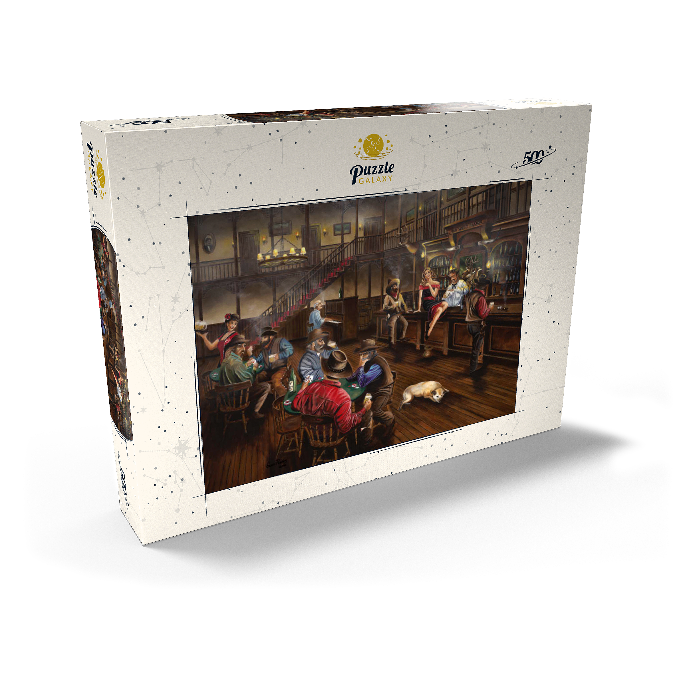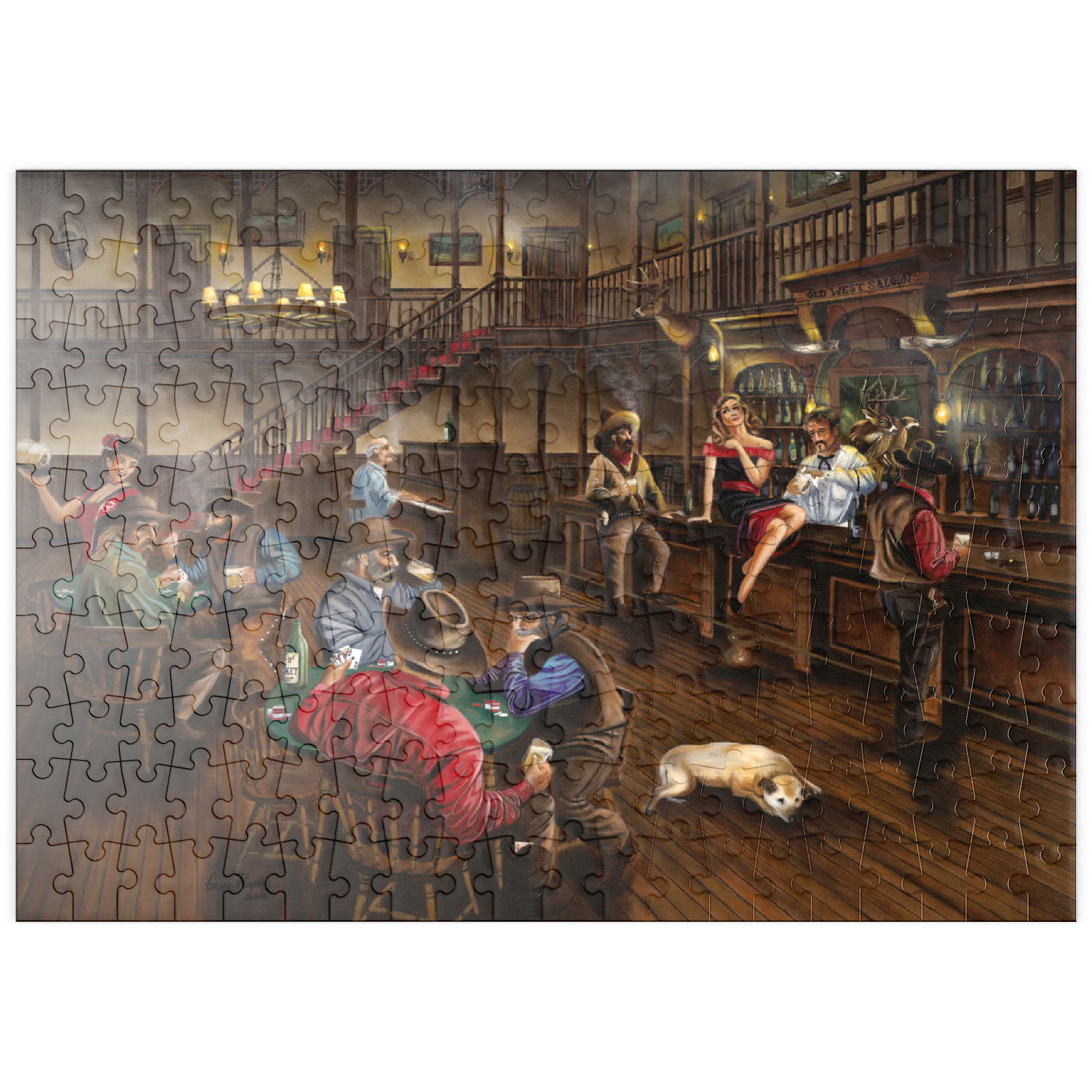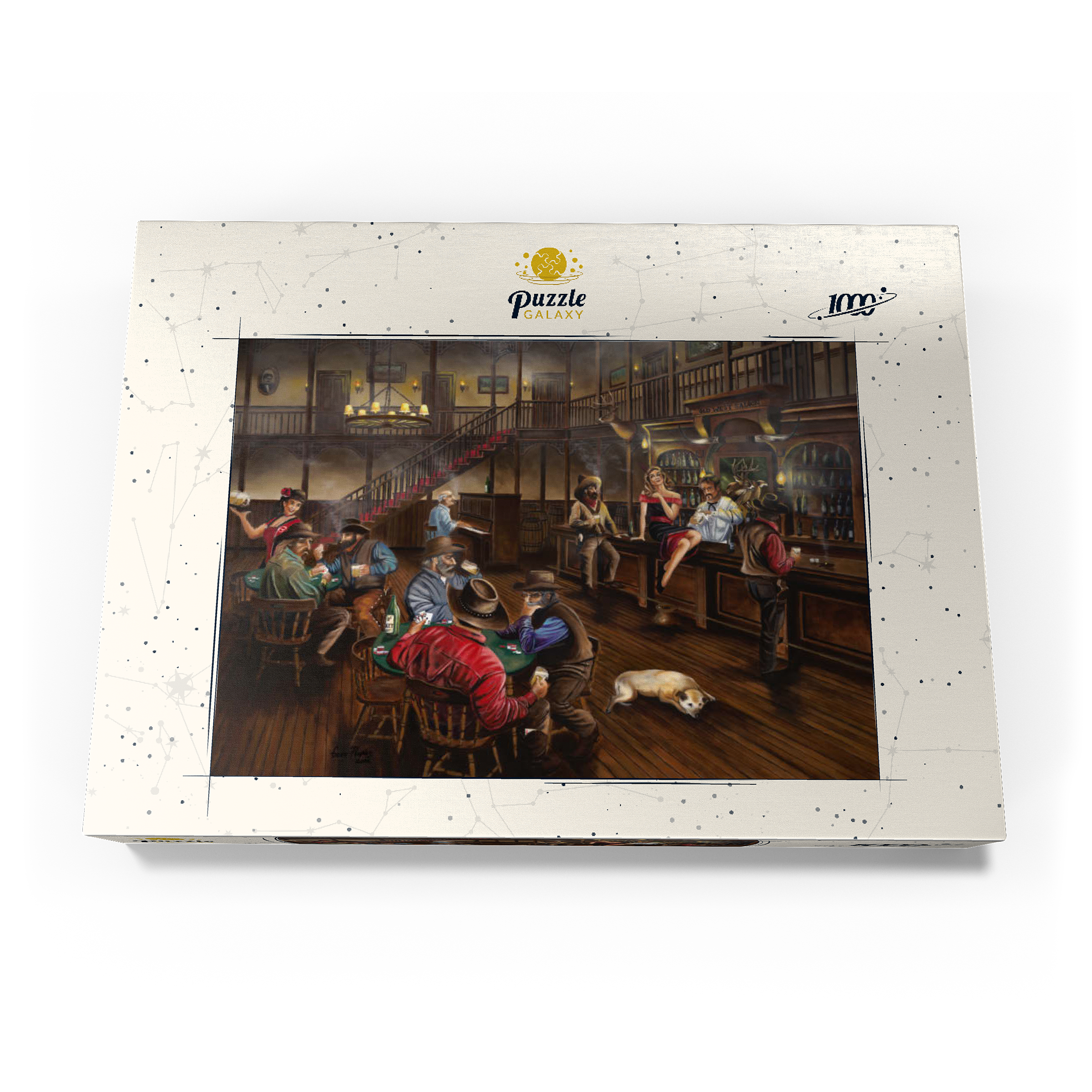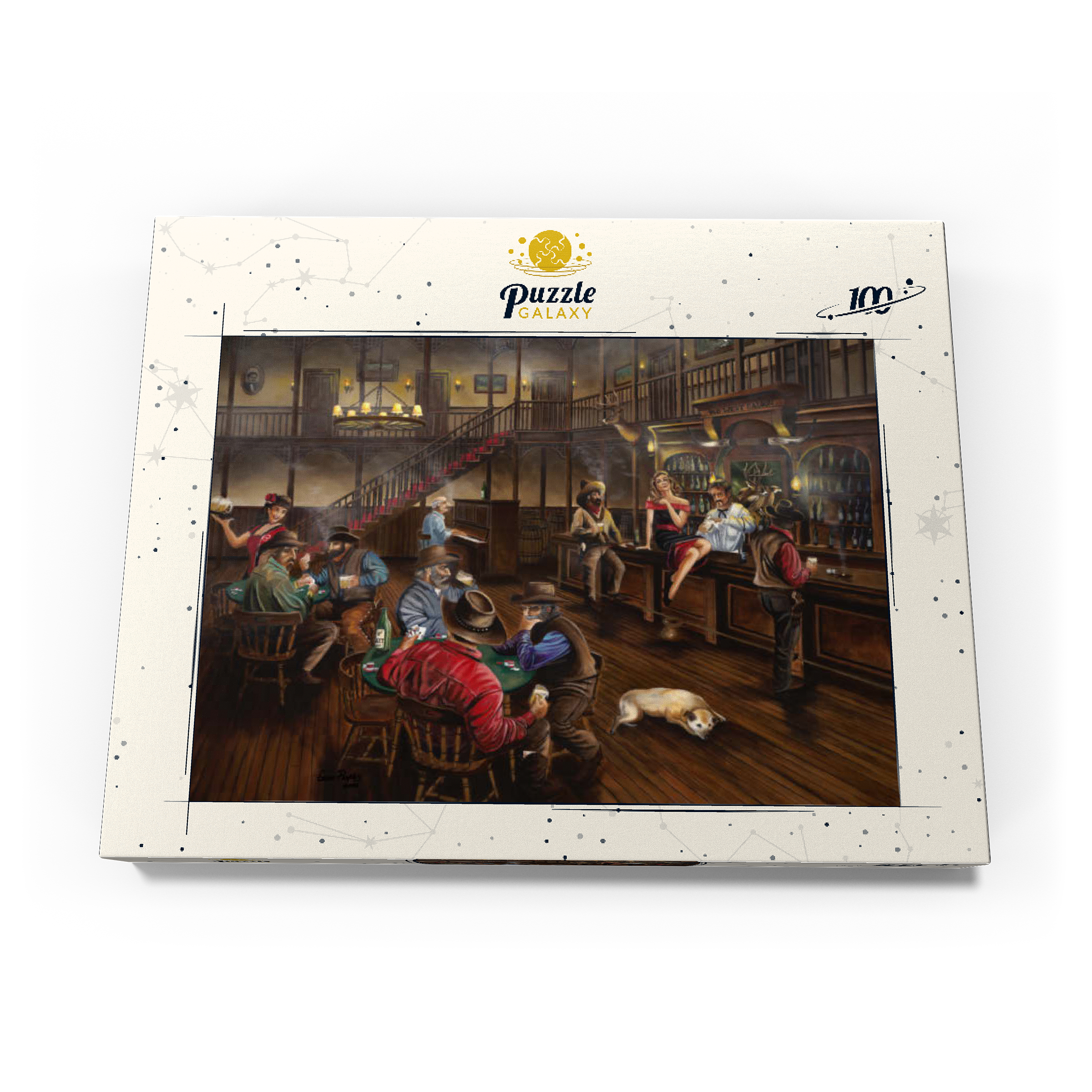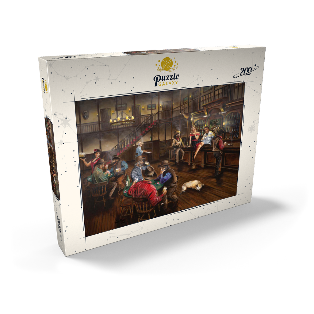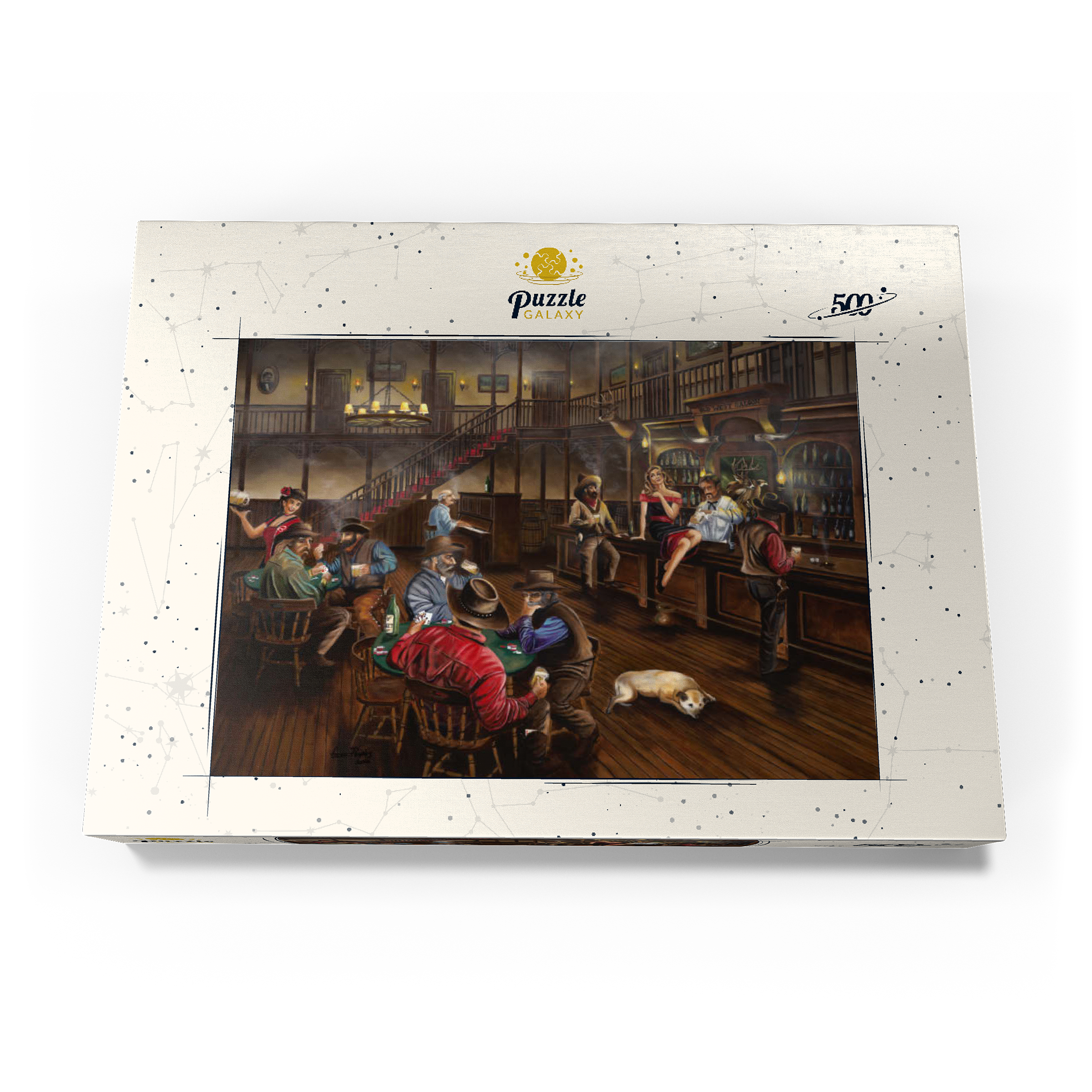 Dieses detailreiche Kunstwerk fängt eine lebhafte Szene in einem klassischen Saloon im Wilden Westen ein. Cowboys versammeln sich um Kartentische, spielen intensiv Poker und trinken gemeinsam, während ein lebhafter Barkeeper hinter einer gut gefüllten Bar Whiskey ausschenkt. Ein Pianist sorgt im Hintergrund für musikalische Untermalung, und eine Showgirl in Rot zieht mit ihrer eleganten Ausstrahlung alle Blicke auf sich. Ausgestopfte Tiere, eine Innenausstattung aus Holz, Kronleuchter und eine Treppe, die zu den Zimmern im Obergeschoss führt, tragen zur authentischen Westernatmosphäre bei. Die entspannte Präsenz eines schlafenden Hundes verleiht der ansonsten geschäftigen Umgebung voller Kameradschaft und Unfug einen Hauch von Ruhe.