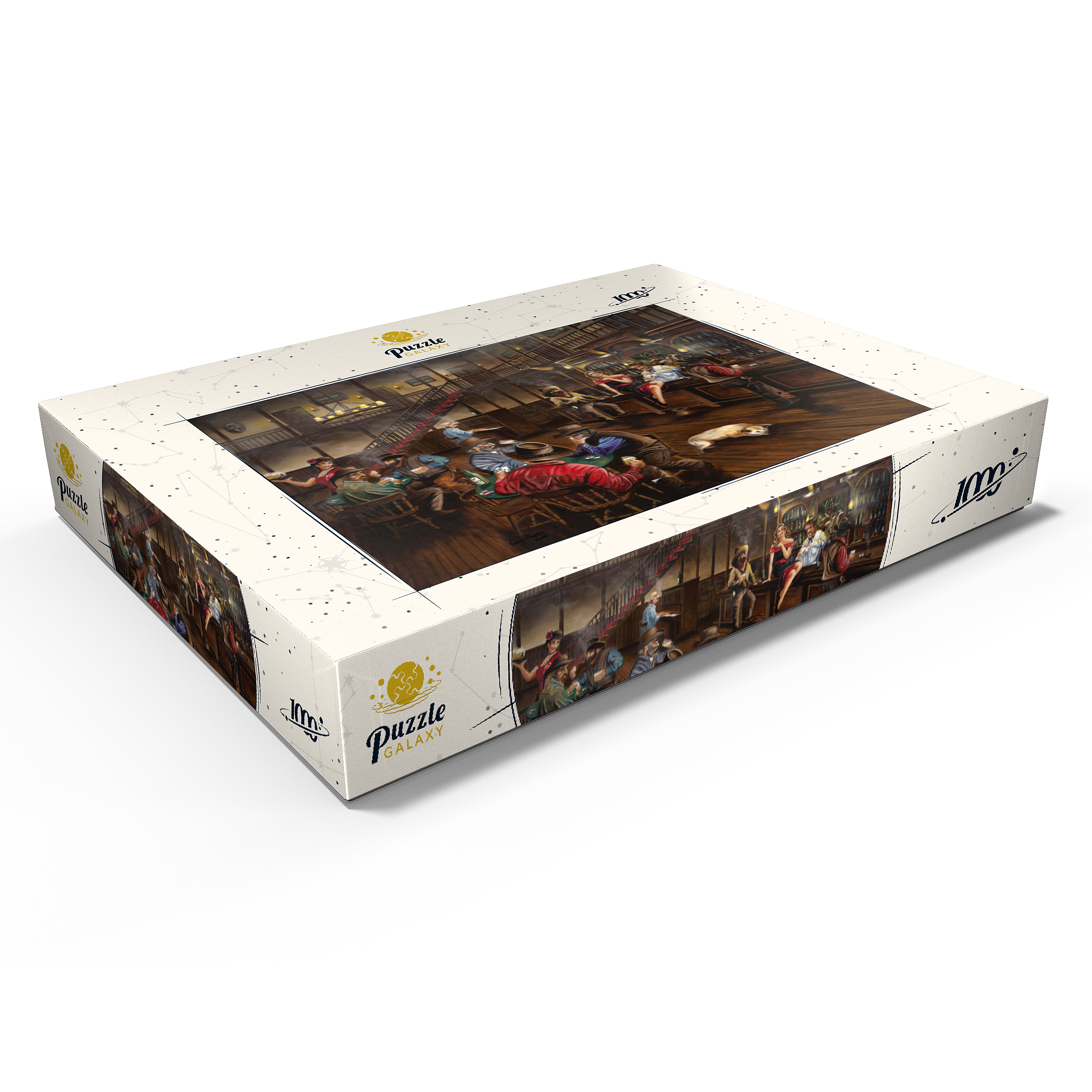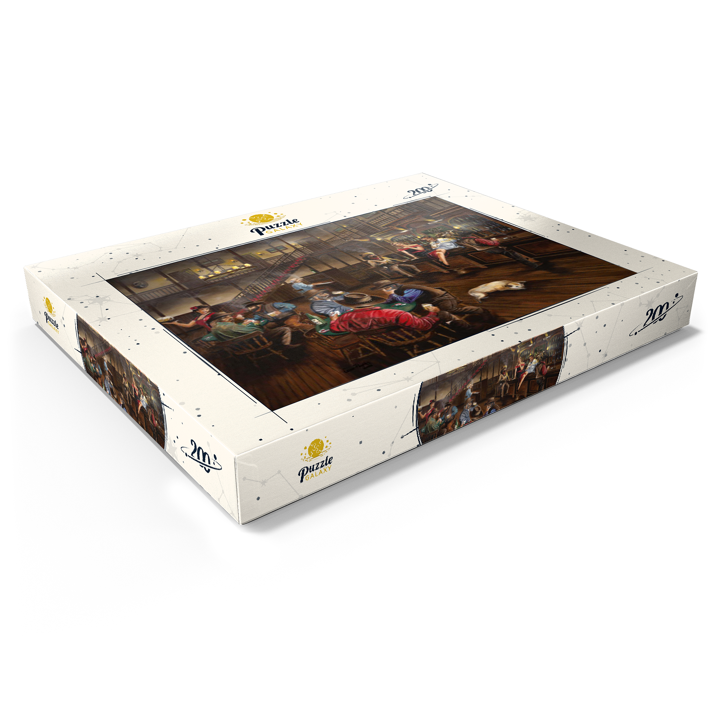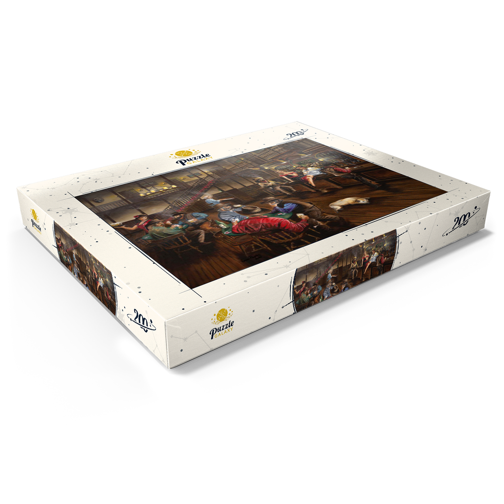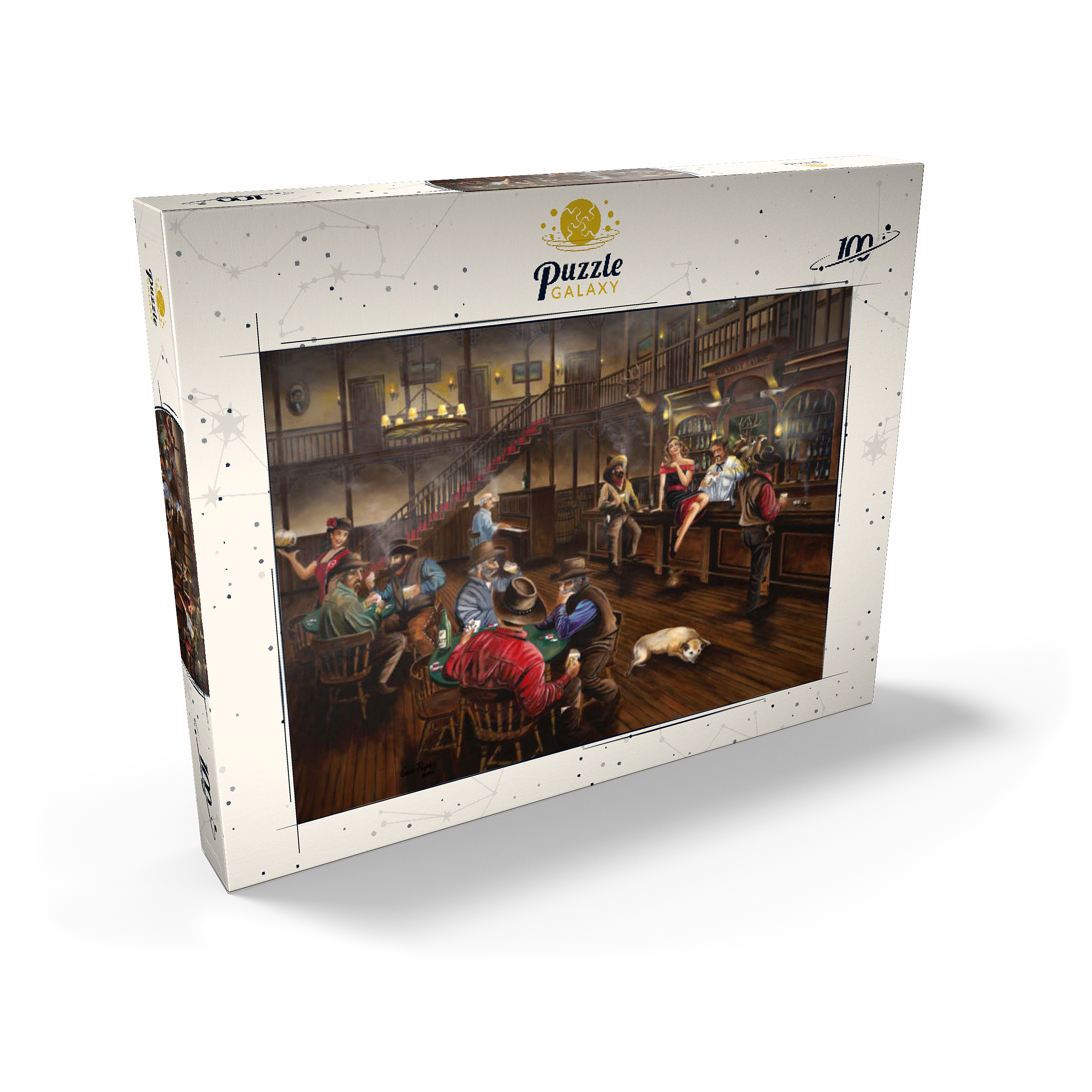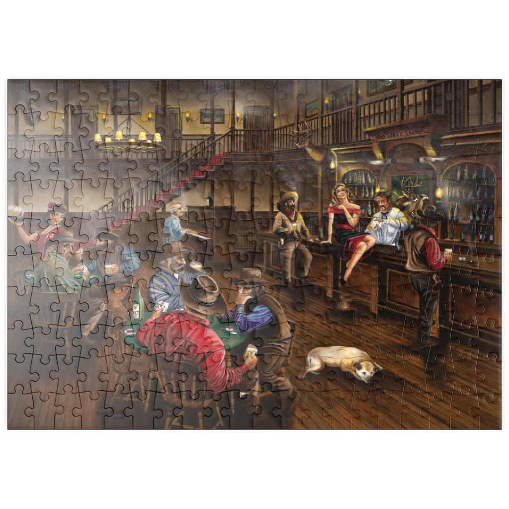 Dieses detailreiche Kunstwerk fängt eine lebhafte Szene in einem klassischen Saloon im Wilden Westen ein. Cowboys versammeln sich um Kartentische, spielen intensiv Poker und trinken gemeinsam, während ein lebhafter Barkeeper hinter einer gut gefüllten Bar Whiskey ausschenkt. Ein Pianist sorgt im Hintergrund für musikalische Untermalung, und eine Showgirl in Rot zieht mit ihrer eleganten Ausstrahlung alle Blicke auf sich. Ausgestopfte Tiere, eine Innenausstattung aus Holz, Kronleuchter und eine Treppe, die zu den Zimmern im Obergeschoss führt, tragen zur authentischen Westernatmosphäre bei. Die entspannte Präsenz eines schlafenden Hundes verleiht der ansonsten geschäftigen Umgebung voller Kameradschaft und Unfug einen Hauch von Ruhe.