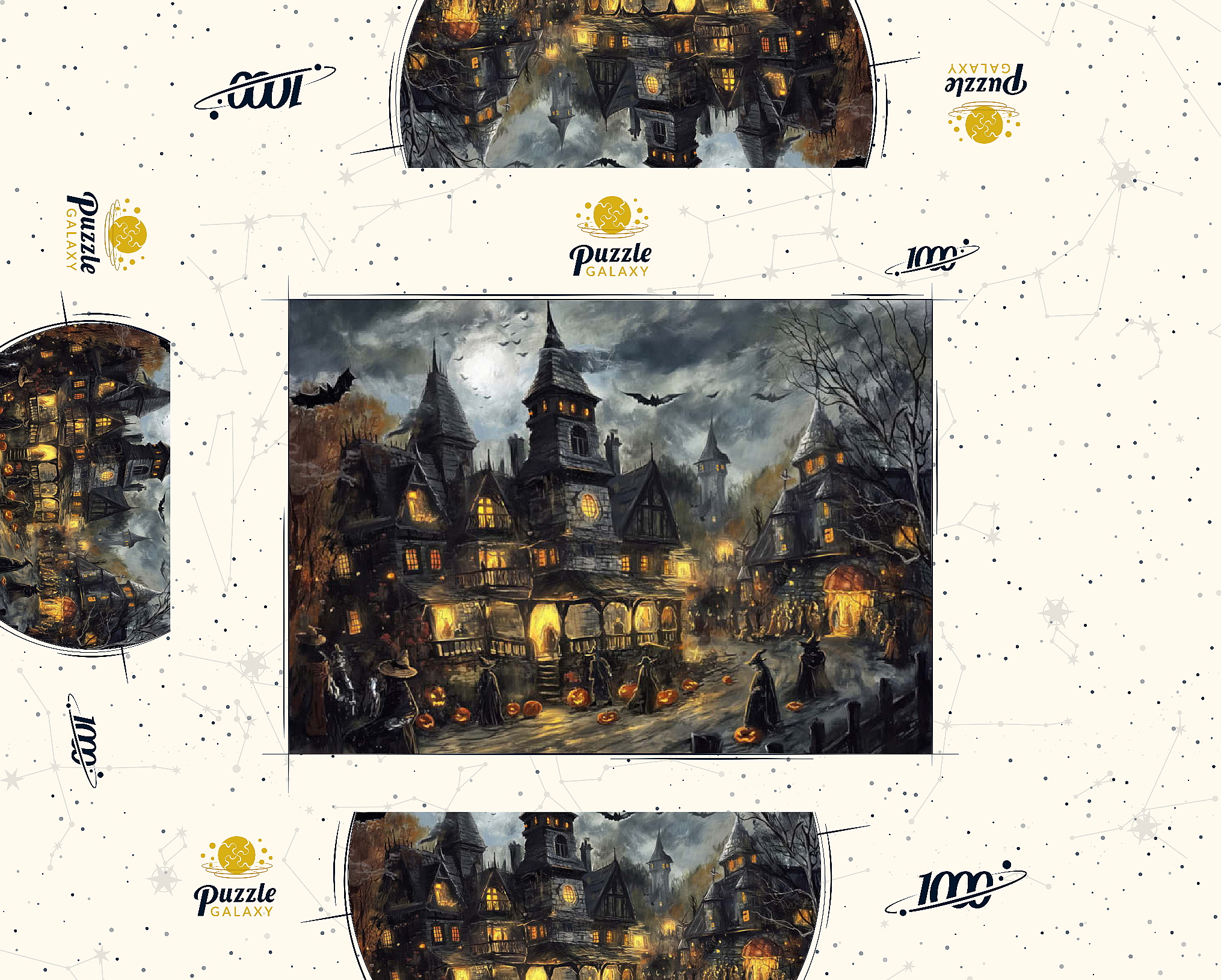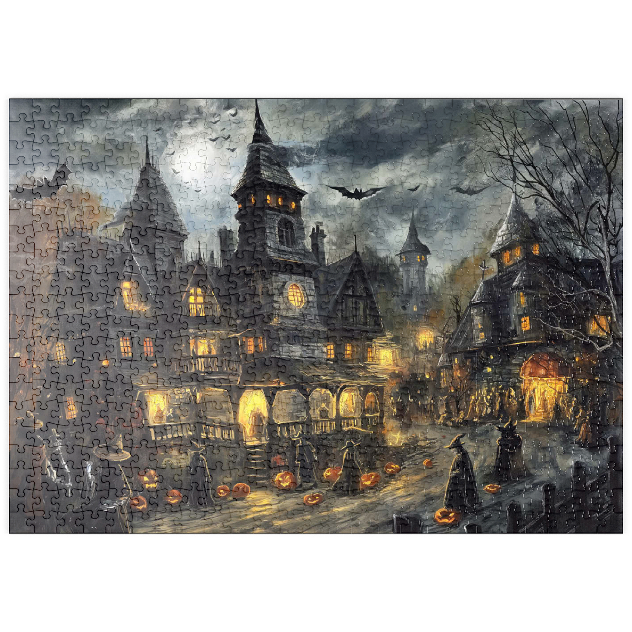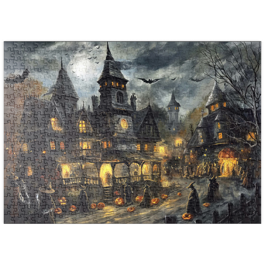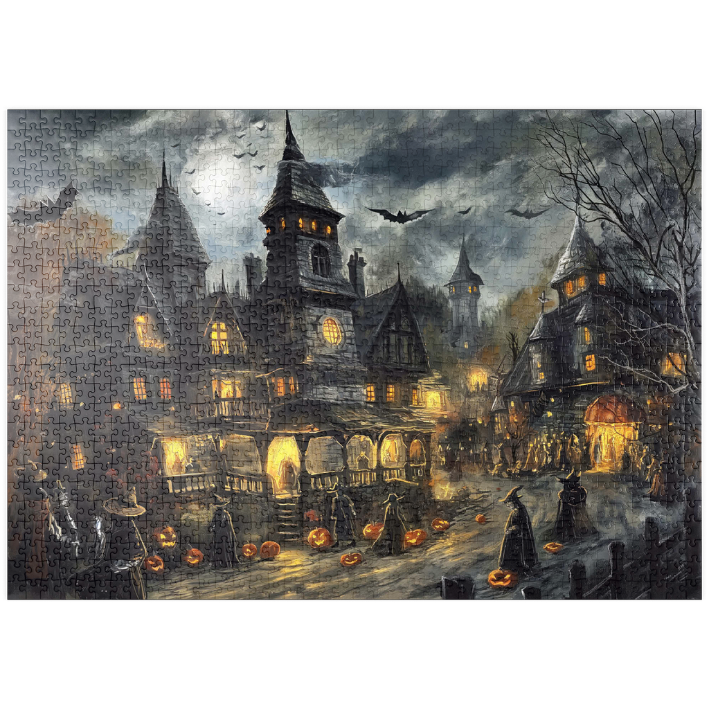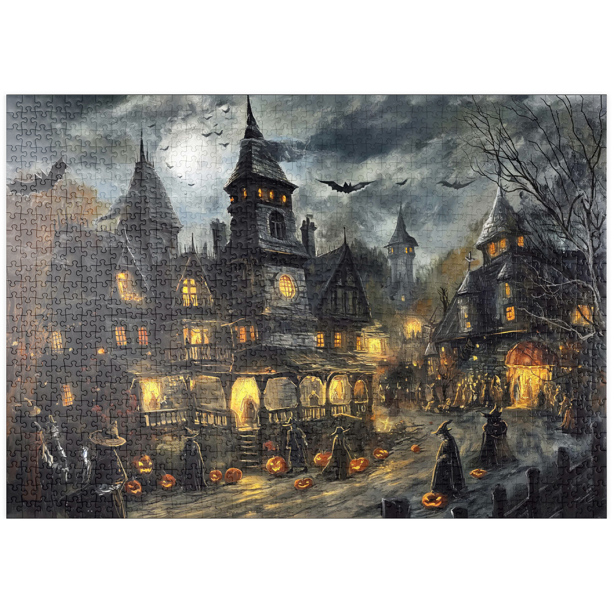 Diese schaurige Szene zeigt ein Spukdorf im Schein des Vollmonds. Gotische Häuser mit spitzen Dächern und leuchtenden Fenstern geben den Ton für eine geheimnisvolle Halloween-Nacht an. Die Straßen sind mit geschnitzten Irrlichtern gesäumt, und dunkle Gestalten in Hexenkostümen tragen zur gespenstischen Atmosphäre bei. Fliegende Fledermäuse, kahle Bäume und ein bedeckter Himmel verstärken die unheimliche Atmosphäre und machen diese Darstellung zu einem fesselnden Bild mit gruseligem Herbstcharme.