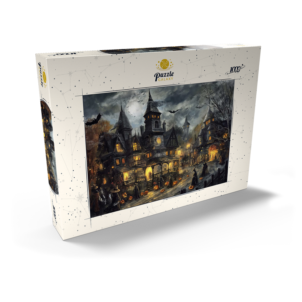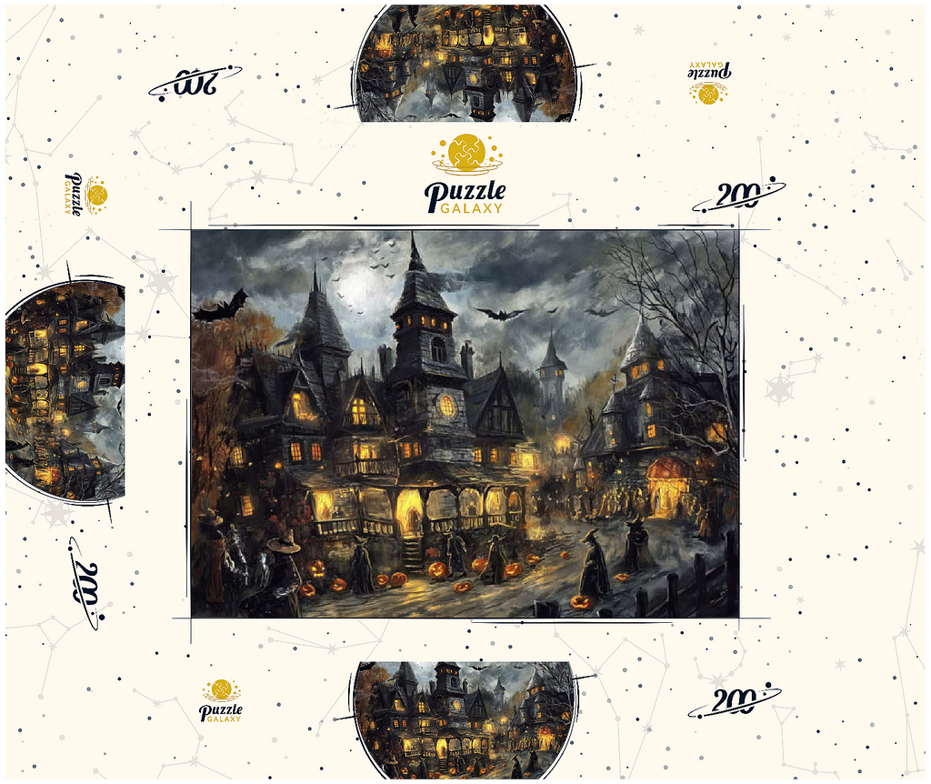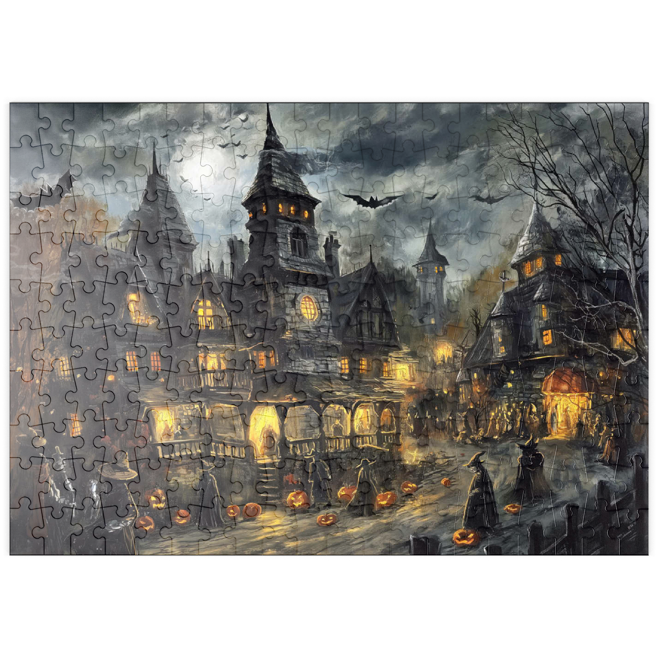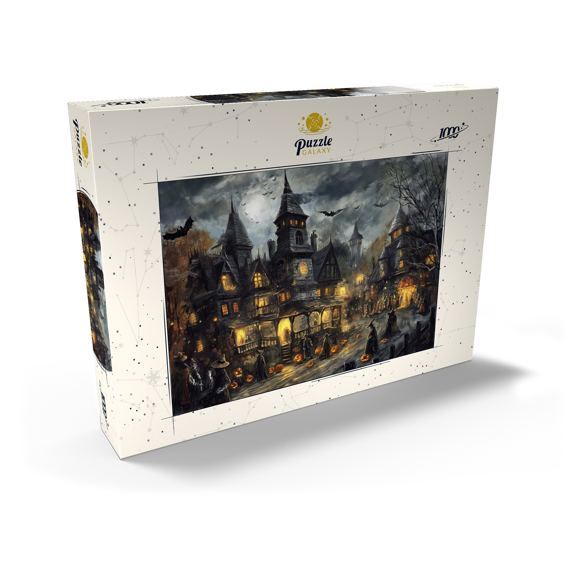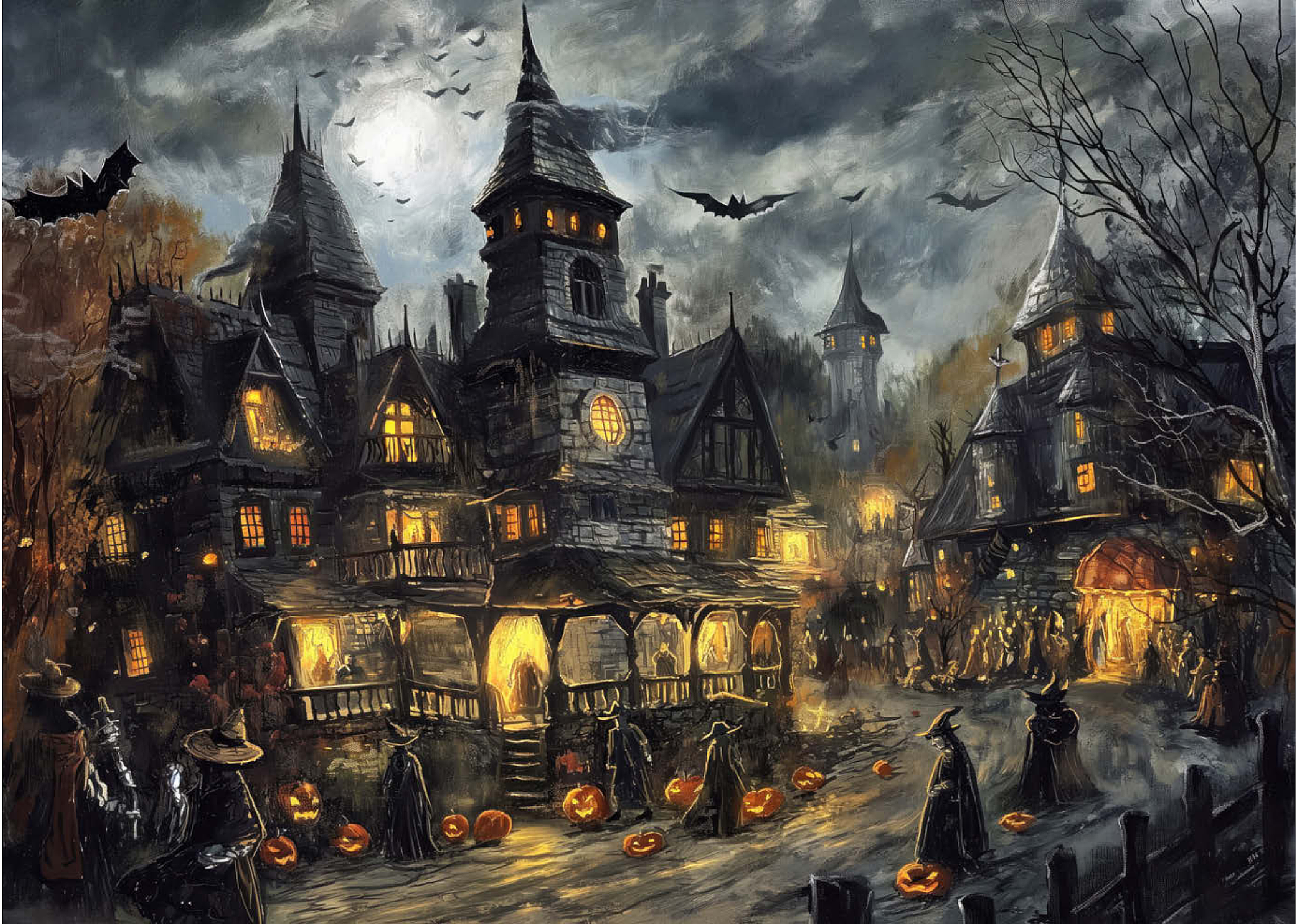Diese schaurige Szene zeigt ein Spukdorf im Schein des Vollmonds. Gotische Häuser mit spitzen Dächern und leuchtenden Fenstern geben den Ton für eine geheimnisvolle Halloween-Nacht an. Die Straßen sind mit geschnitzten Irrlichtern gesäumt, und dunkle Gestalten in Hexenkostümen tragen zur gespenstischen Atmosphäre bei. Fliegende Fledermäuse, kahle Bäume und ein bedeckter Himmel verstärken die unheimliche Atmosphäre und machen diese Darstellung zu einem fesselnden Bild mit gruseligem Herbstcharme.