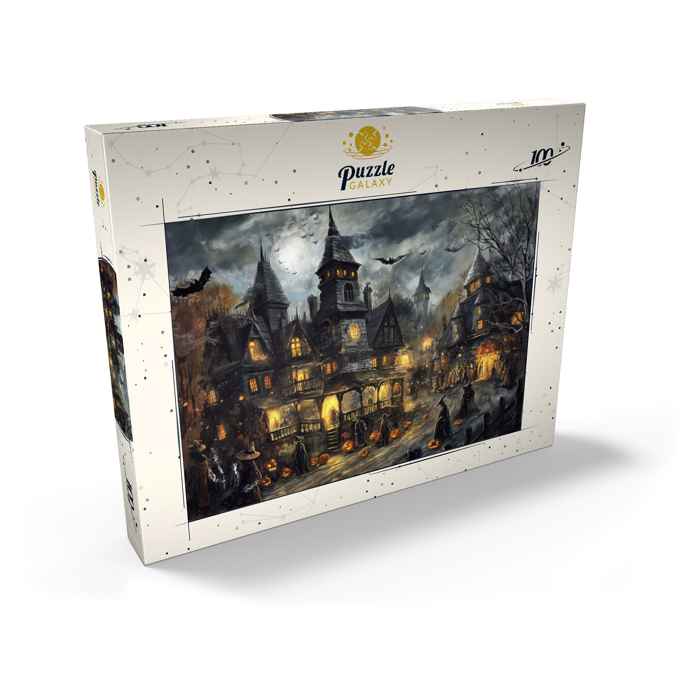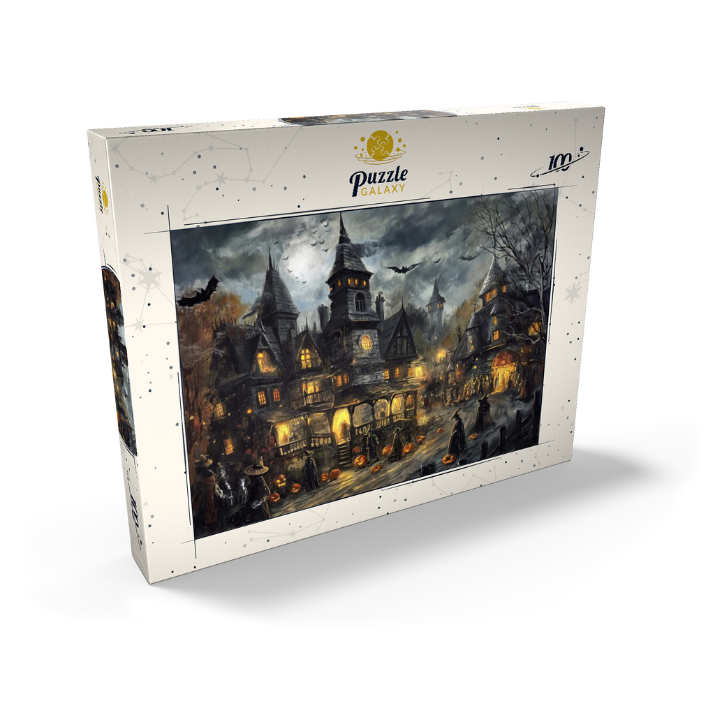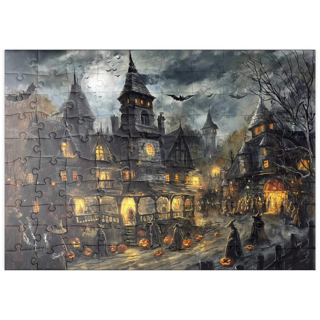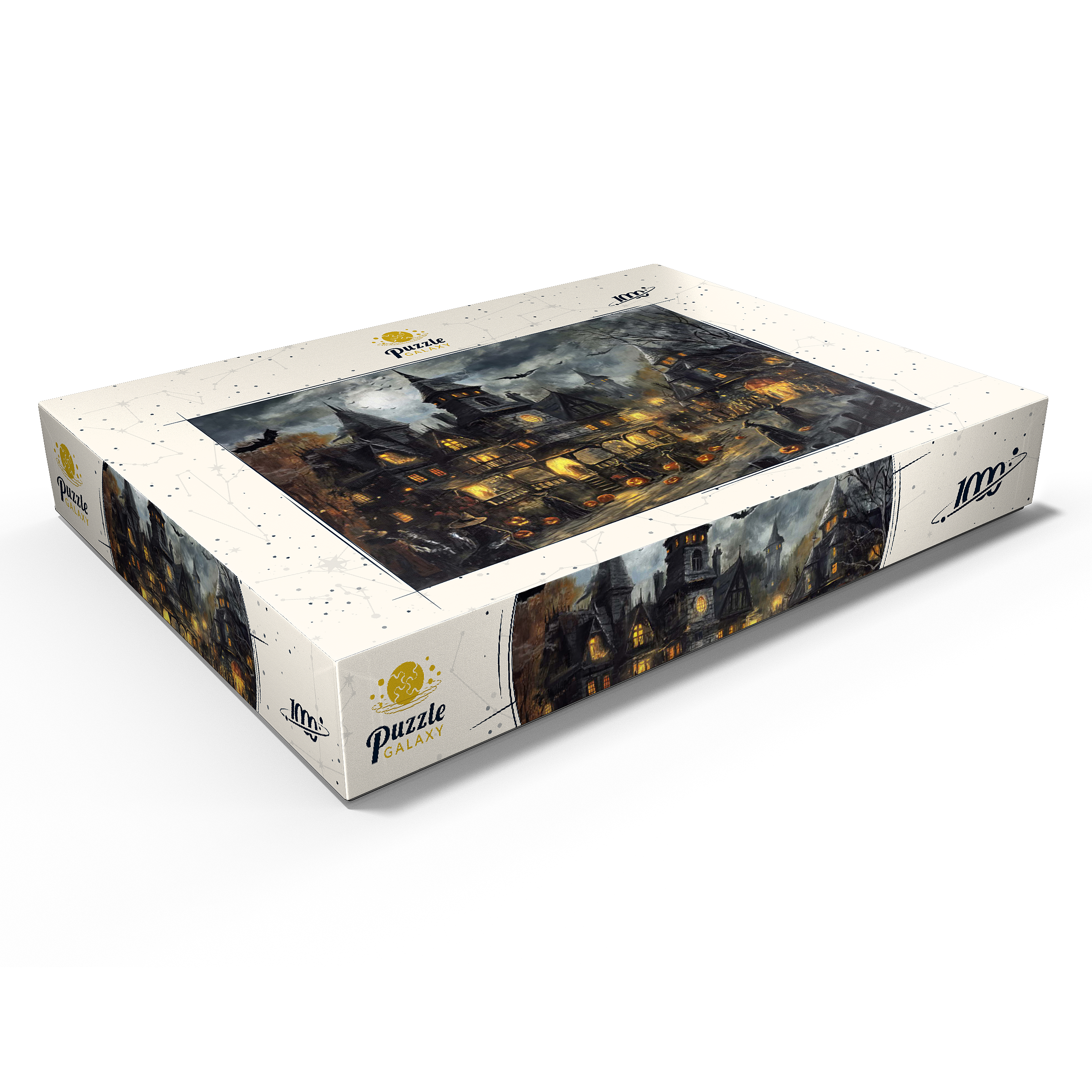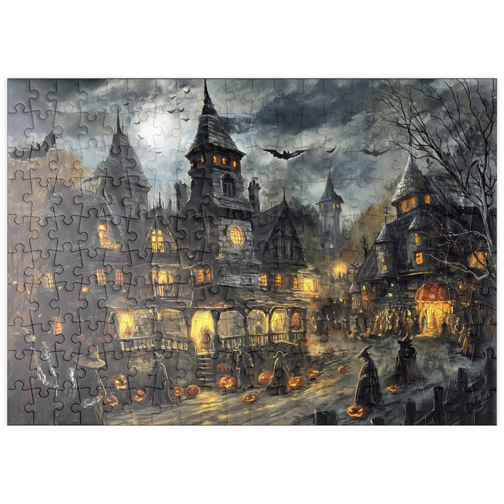 Diese schaurige Szene zeigt ein Spukdorf im Schein des Vollmonds. Gotische Häuser mit spitzen Dächern und leuchtenden Fenstern geben den Ton für eine geheimnisvolle Halloween-Nacht an. Die Straßen sind mit geschnitzten Irrlichtern gesäumt, und dunkle Gestalten in Hexenkostümen tragen zur gespenstischen Atmosphäre bei. Fliegende Fledermäuse, kahle Bäume und ein bedeckter Himmel verstärken die unheimliche Atmosphäre und machen diese Darstellung zu einem fesselnden Bild mit gruseligem Herbstcharme.