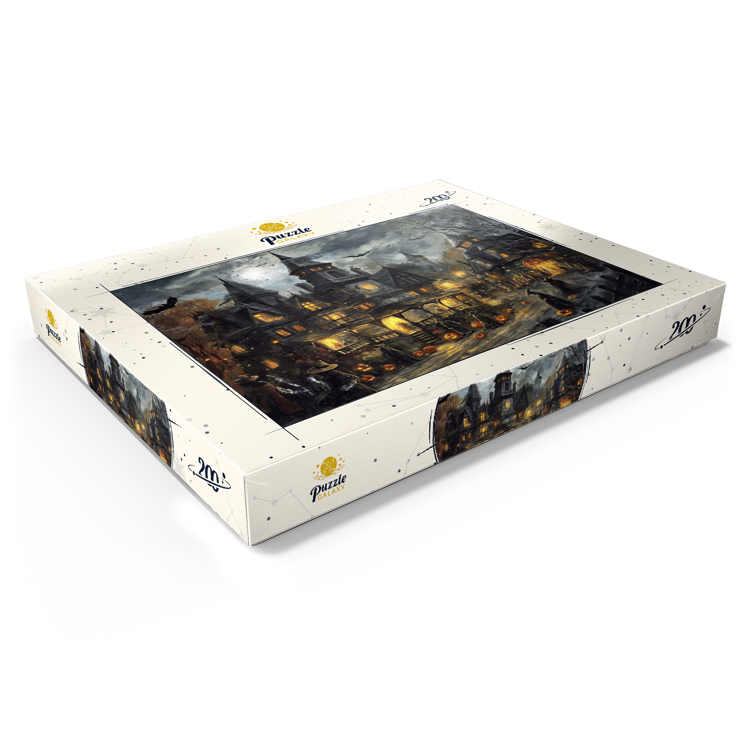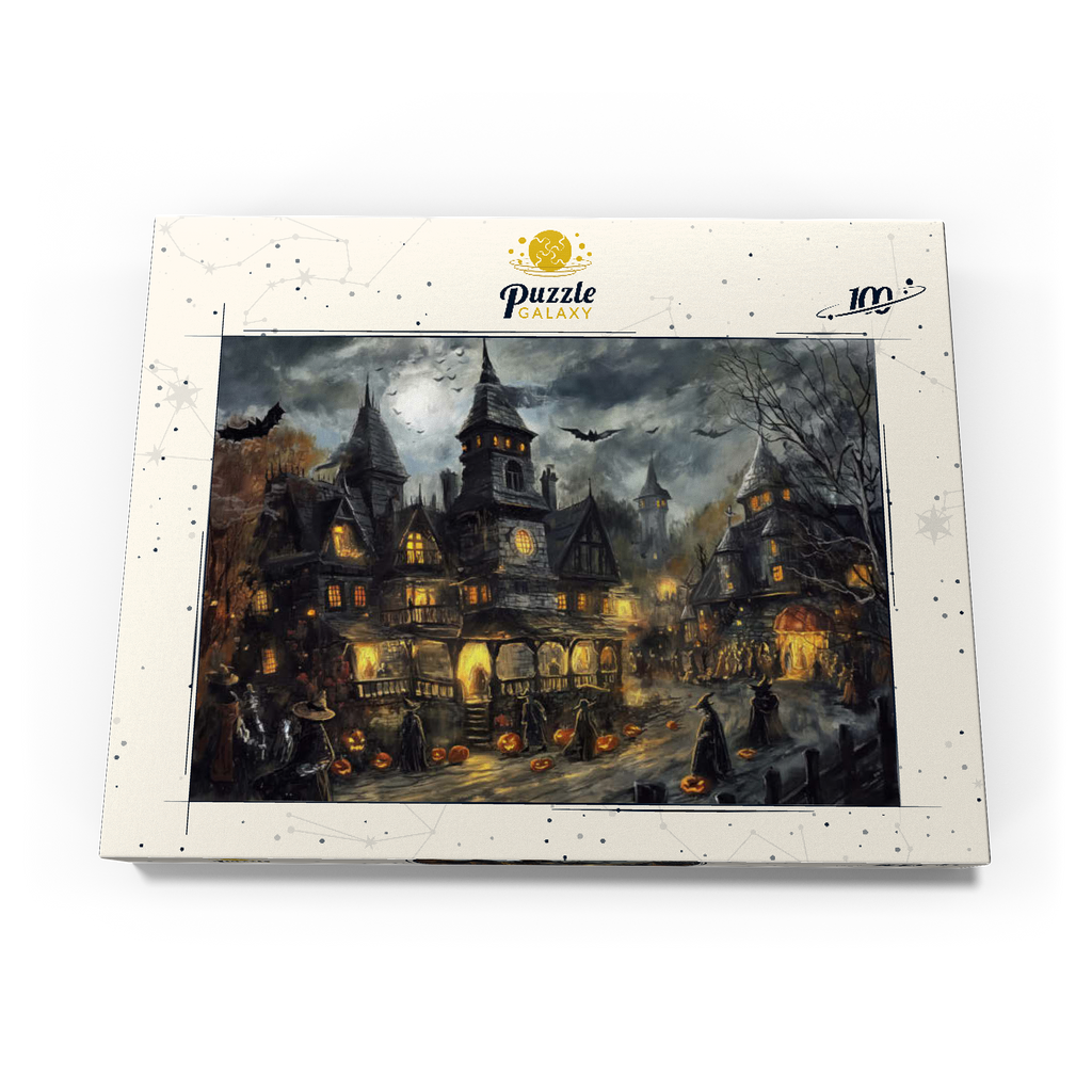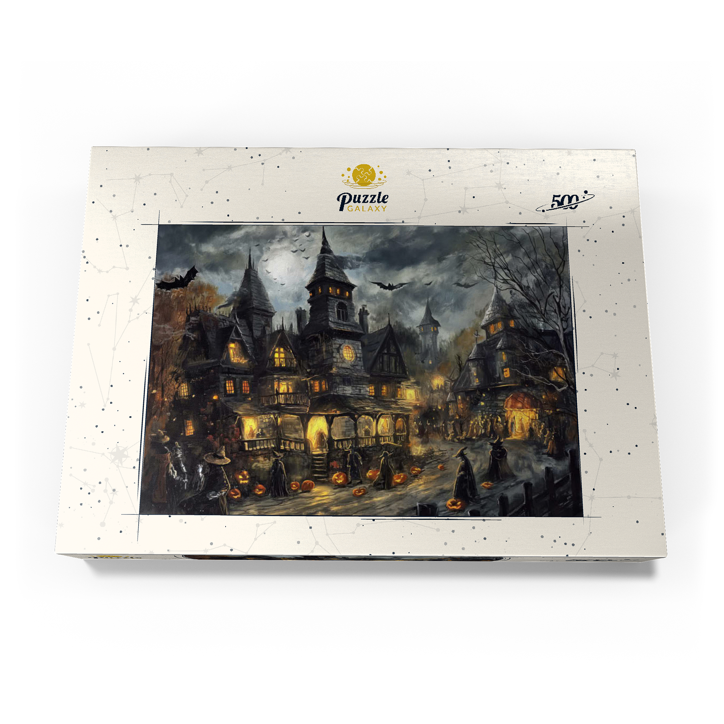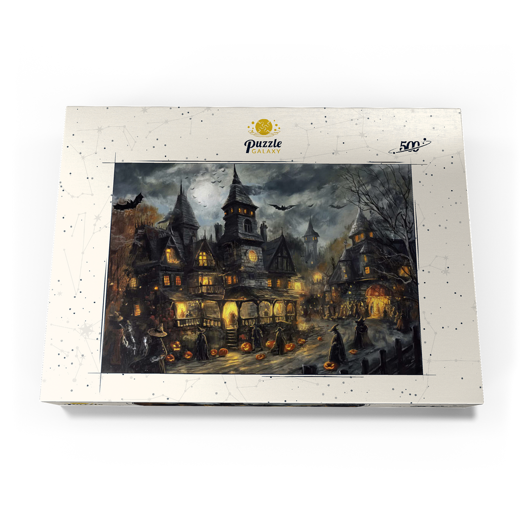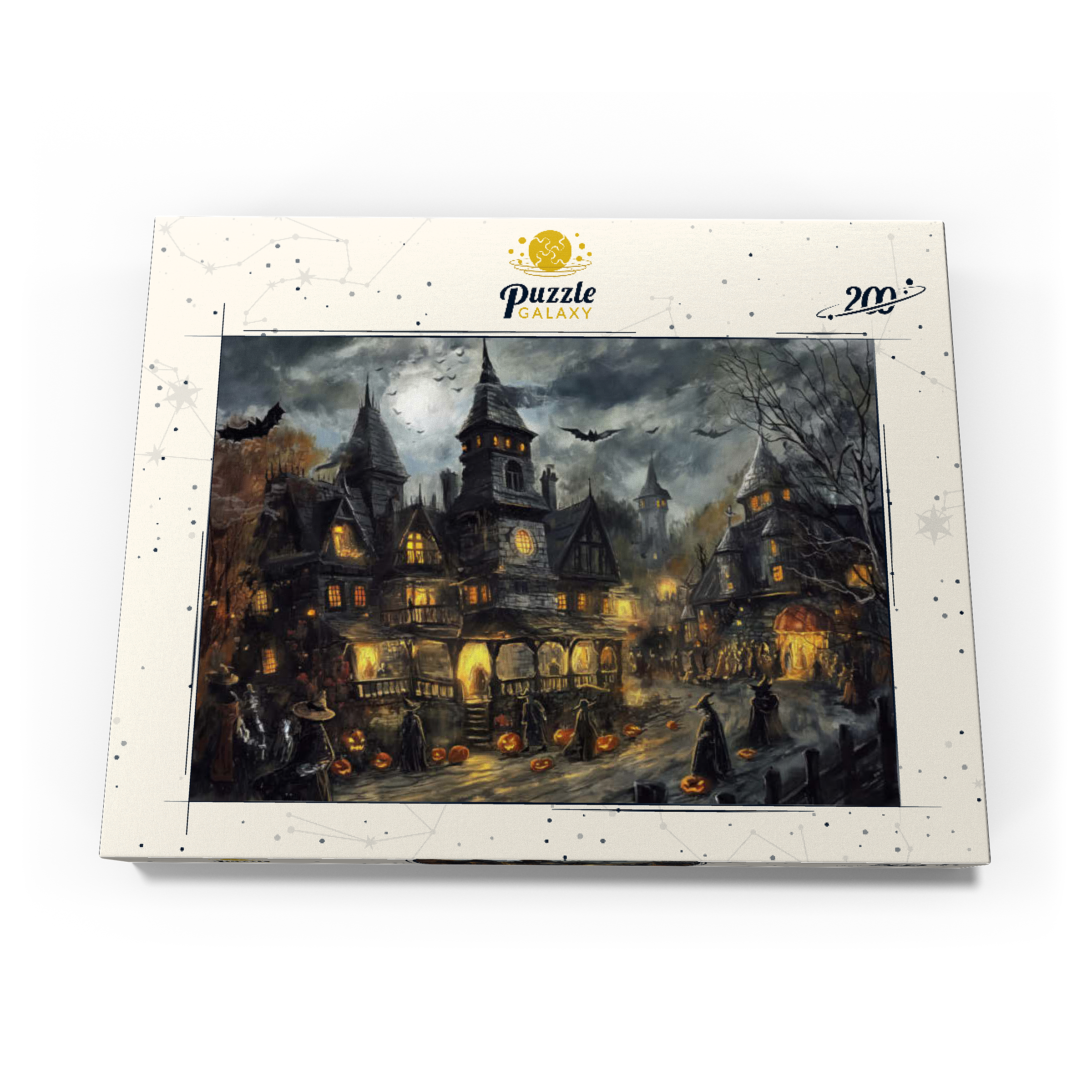 Diese schaurige Szene zeigt ein Spukdorf im Schein des Vollmonds. Gotische Häuser mit spitzen Dächern und leuchtenden Fenstern geben den Ton für eine geheimnisvolle Halloween-Nacht an. Die Straßen sind mit geschnitzten Irrlichtern gesäumt, und dunkle Gestalten in Hexenkostümen tragen zur gespenstischen Atmosphäre bei. Fliegende Fledermäuse, kahle Bäume und ein bedeckter Himmel verstärken die unheimliche Atmosphäre und machen diese Darstellung zu einem fesselnden Bild mit gruseligem Herbstcharme.