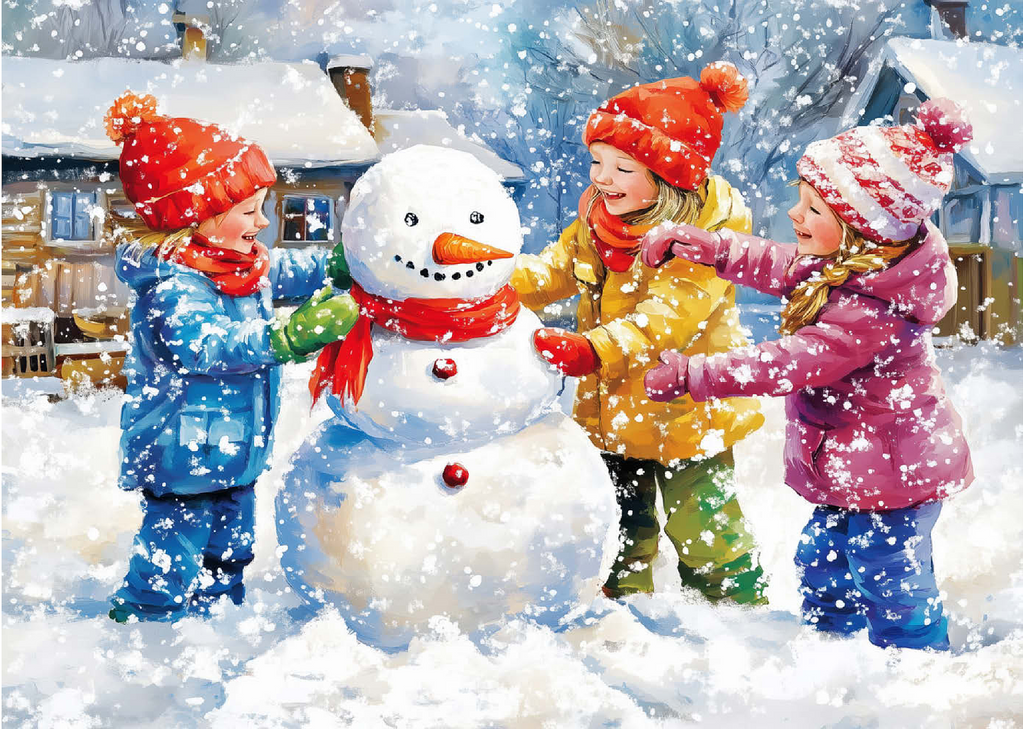 Diese entzückende Winterszene zeigt drei fröhliche Kinder, die in einem verschneiten Hinterhof einem Schneemann den letzten Schliff geben. Die Kinder sind in helle Winterkleidung gekleidet und strahlen trotz des kühlen Wetters ein warmes Lächeln aus. Schneeflocken fallen sanft und bedecken die gemütlichen Holzhäuser und Bäume im Hintergrund. Der rote Schal und die Karottennase des Schneemanns sorgen für einen leuchtenden Farbakzent und fangen den festlichen Geist und die Freude am winterlichen Spaß perfekt ein.