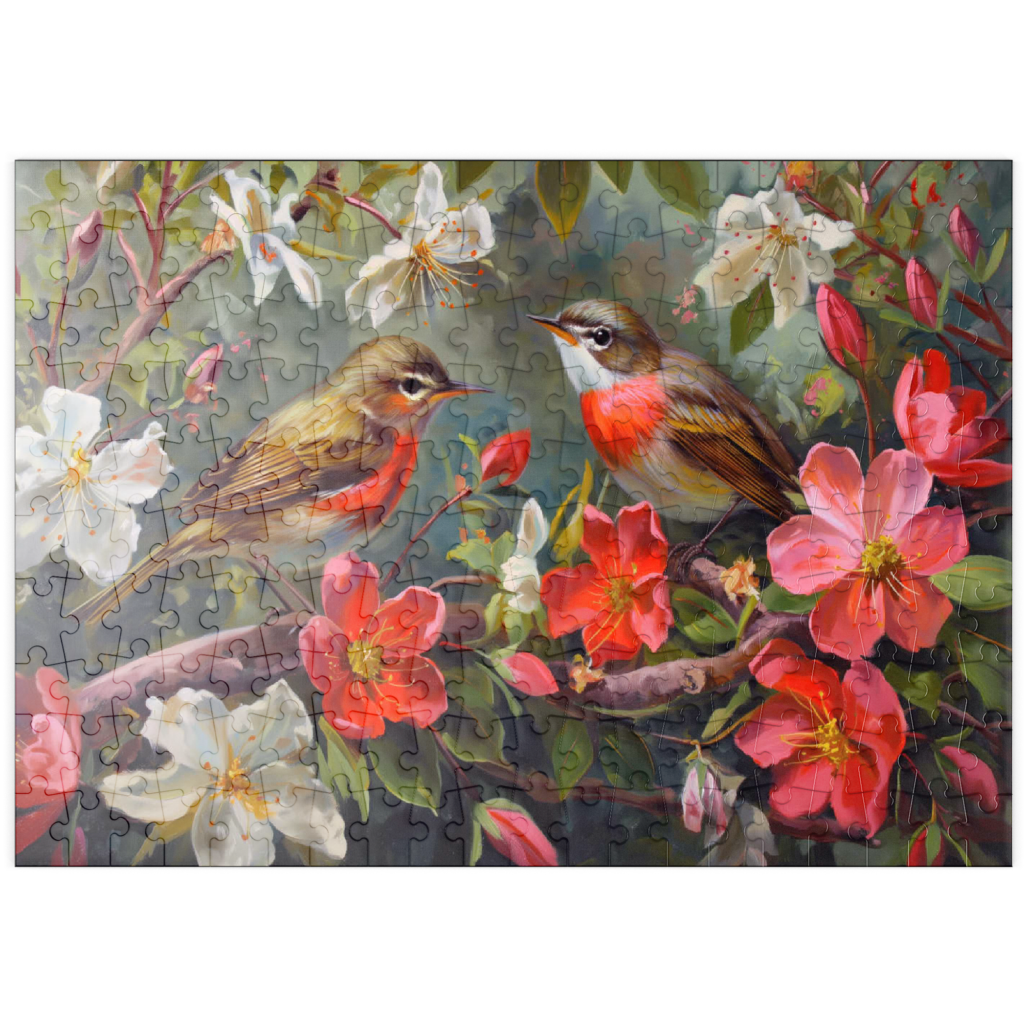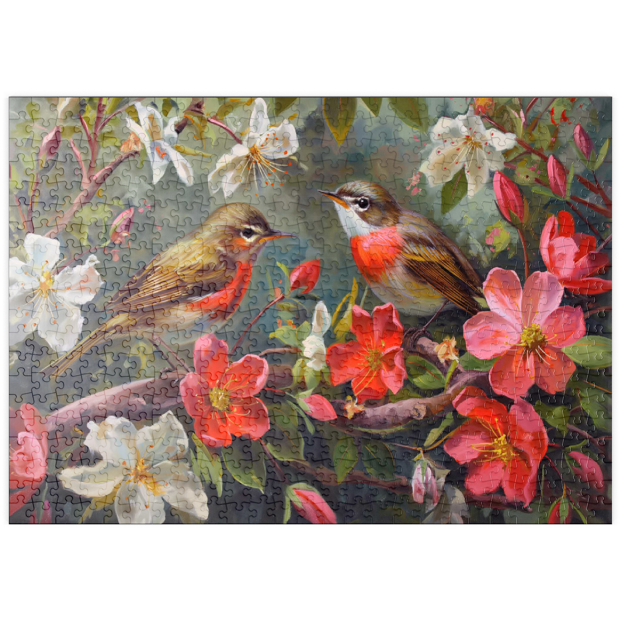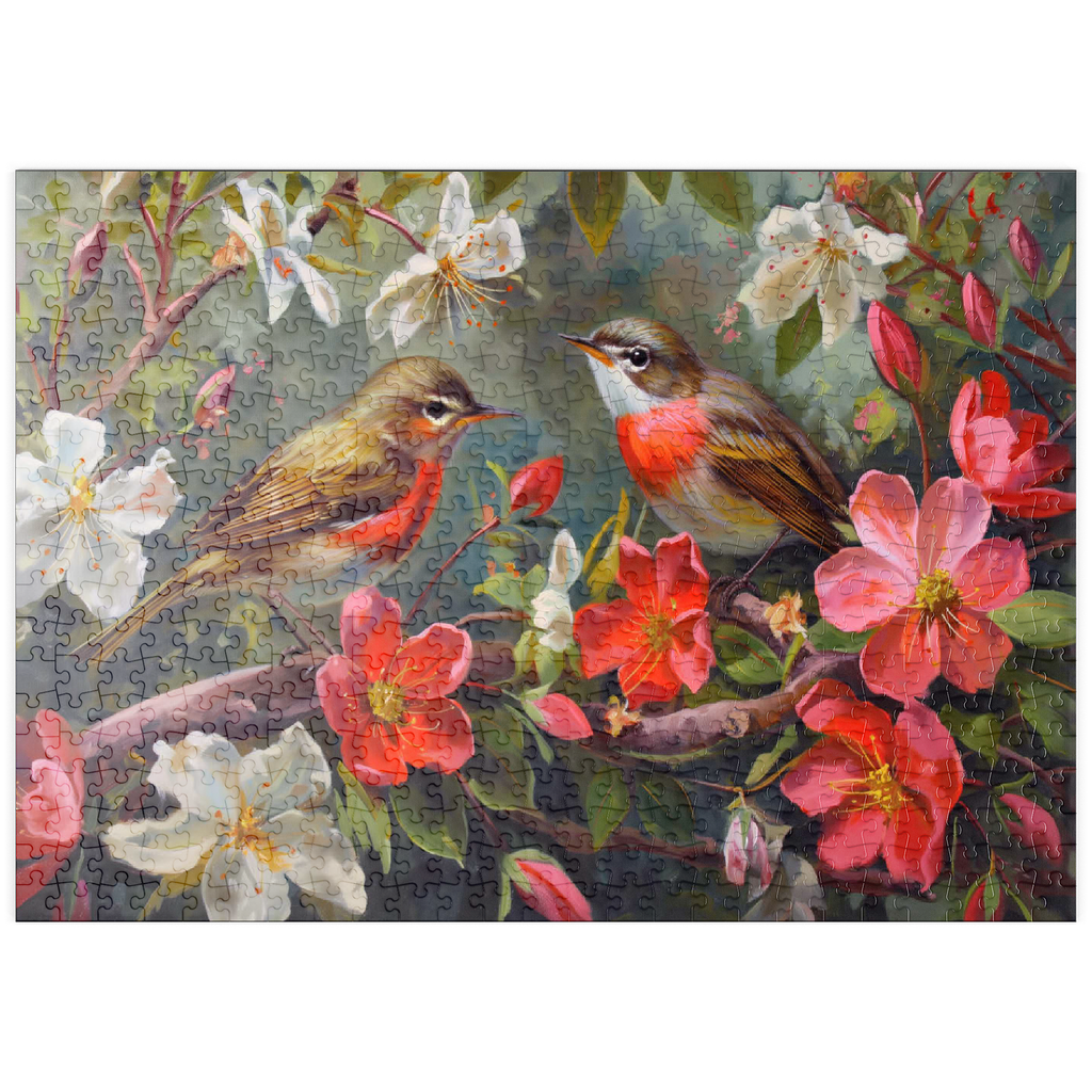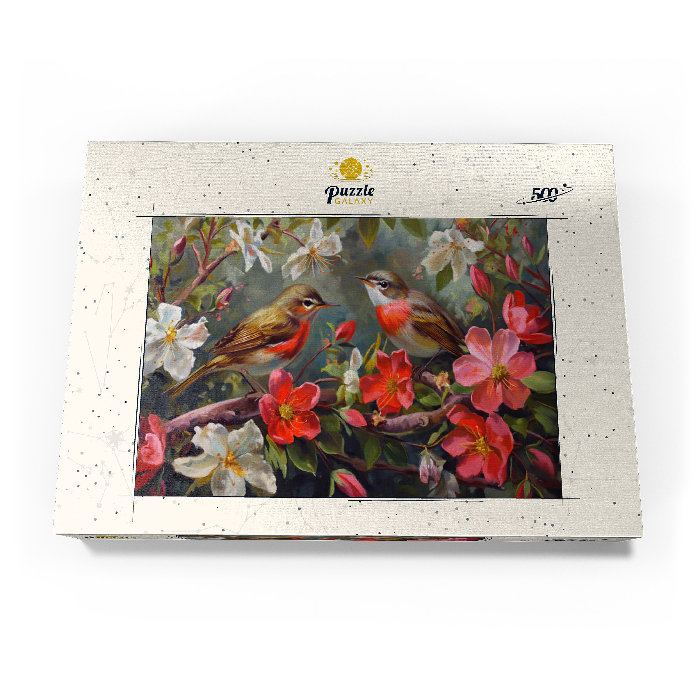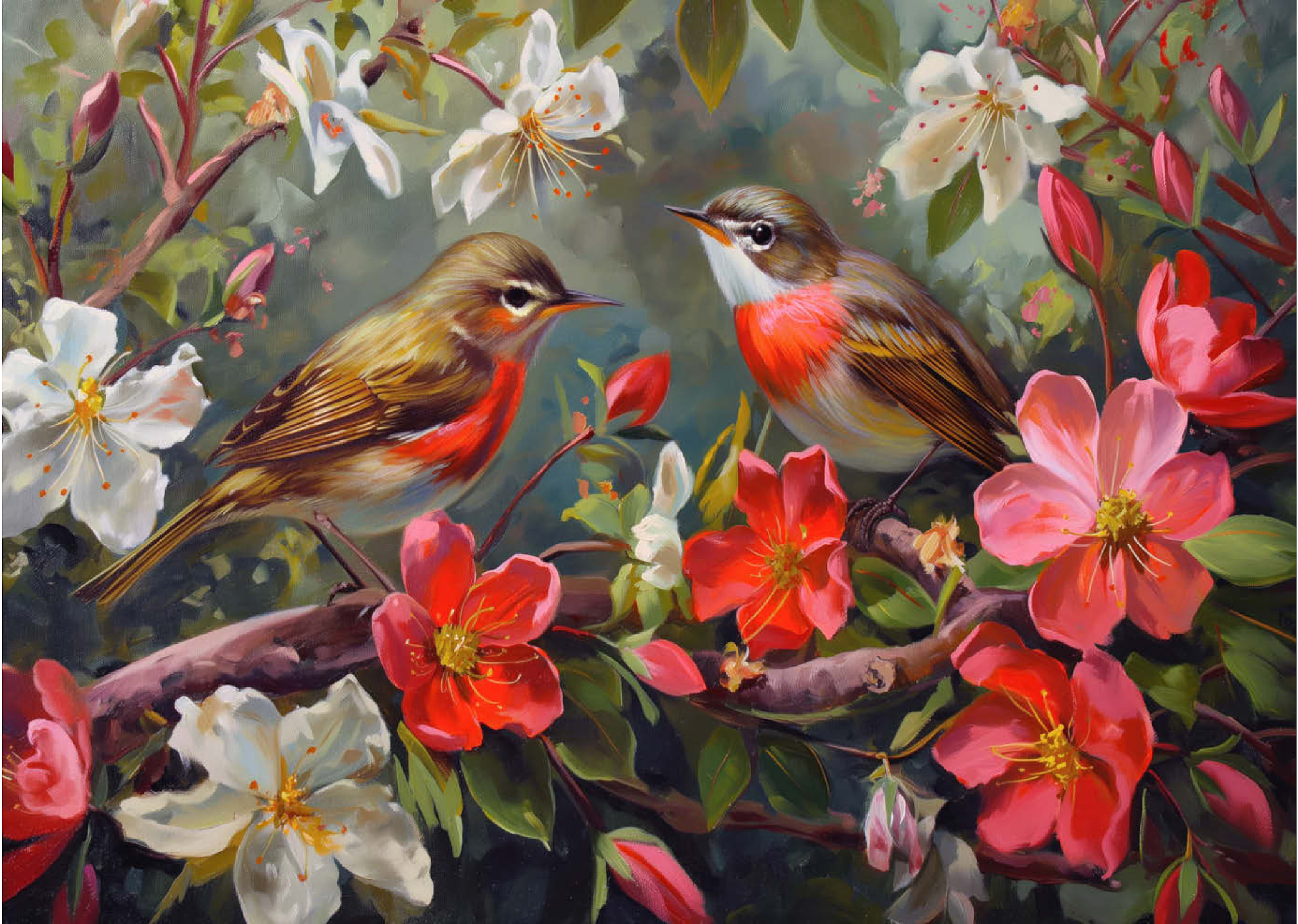 Dieses bezaubernde Kunstwerk zeigt zwei Rotkehlvögel, die anmutig inmitten leuchtender Frühlingsblumen sitzen. Die filigranen Details ihres Gefieders ergänzen das leuchtende Rot und die zarten weißen Blüten und schaffen eine harmonische Mischung aus Farbe und Struktur. Die zarten Blütenblätter und das üppige grüne Laub unterstreichen die heitere Atmosphäre eines blühenden Frühlingsgartens. Eine bezaubernde Darstellung der Eleganz der Natur und der Erneuerung des Lebens.