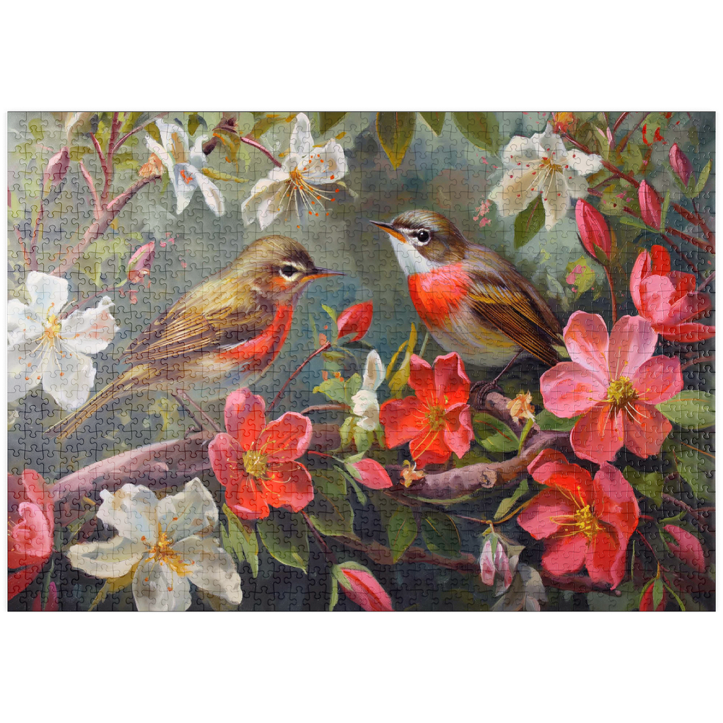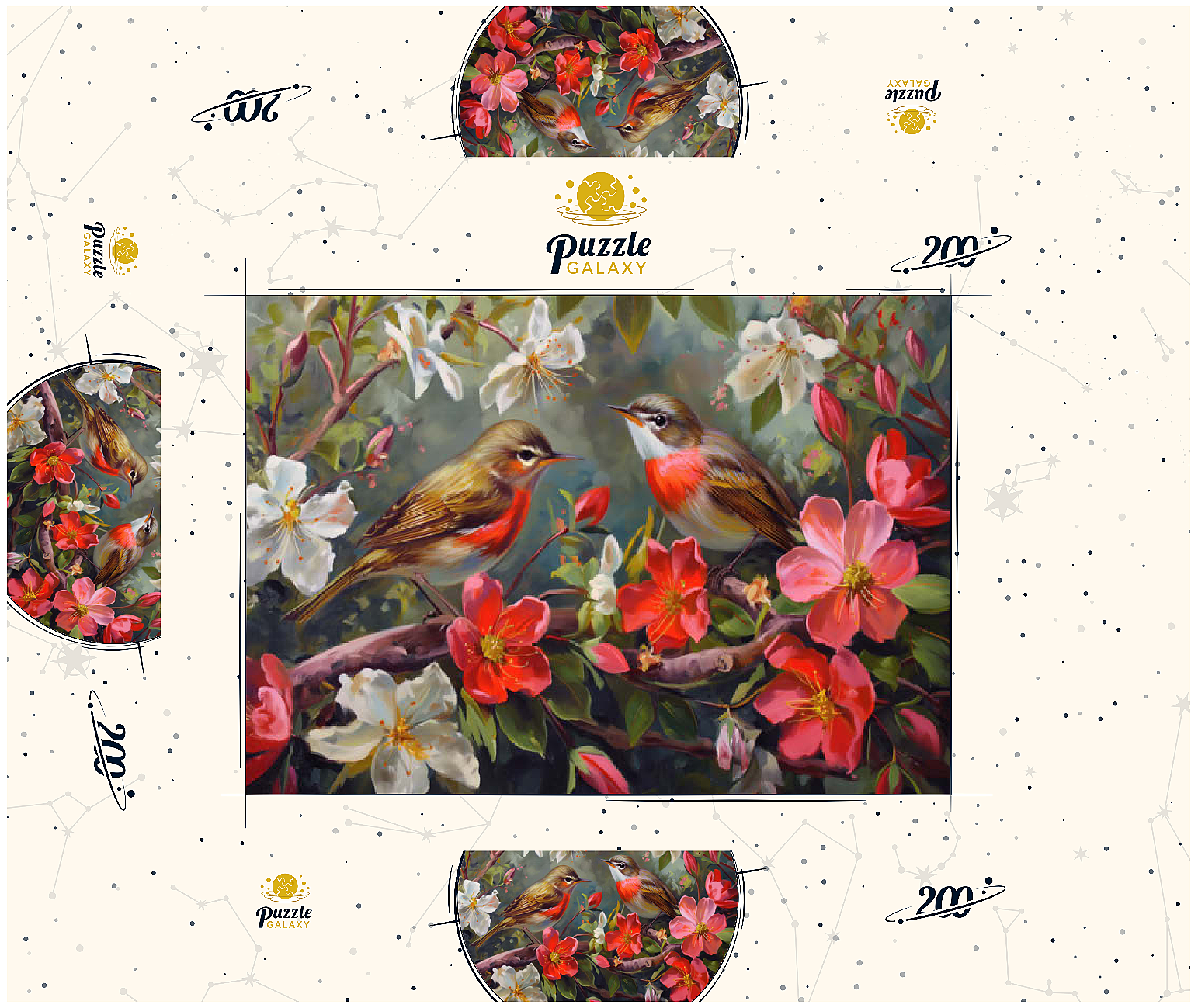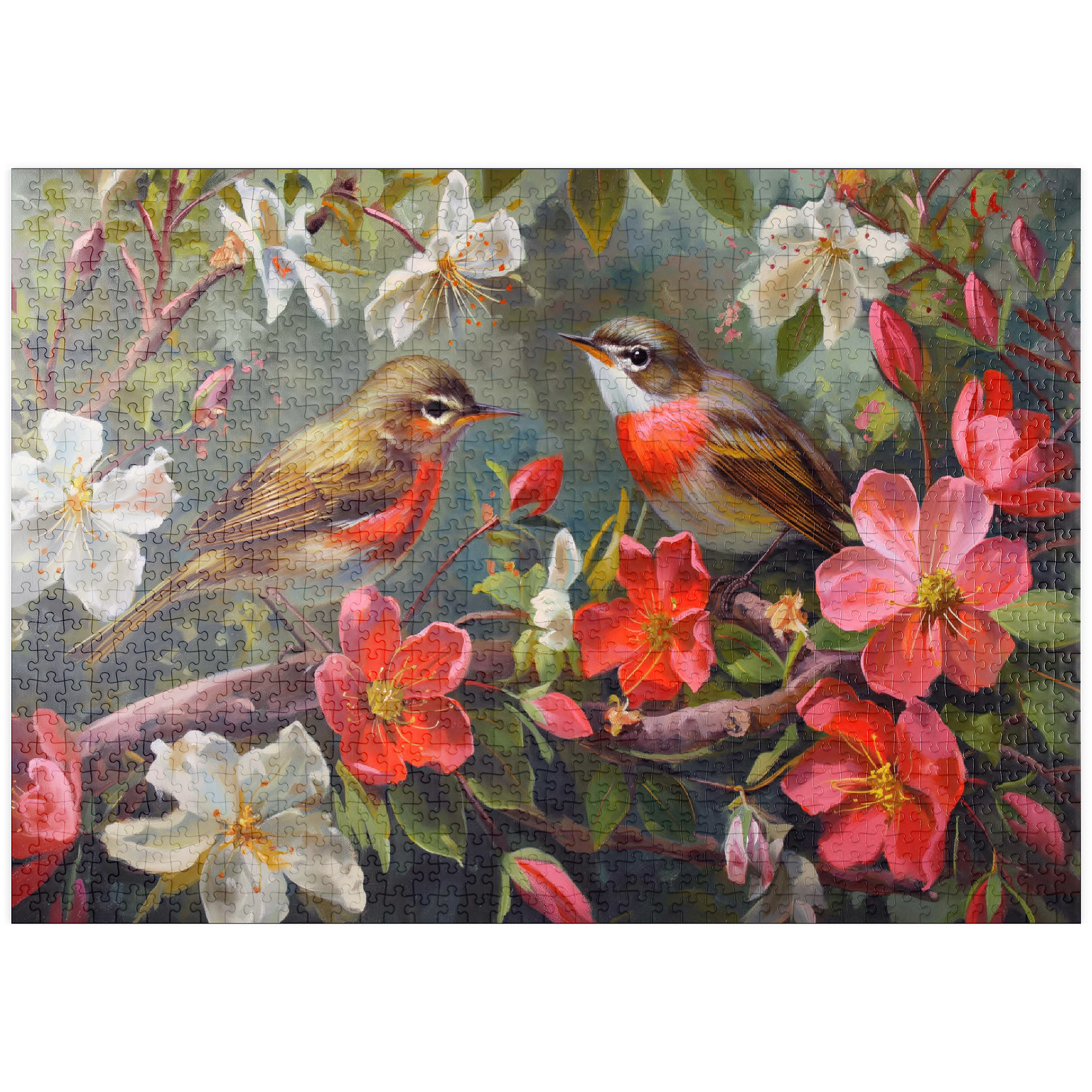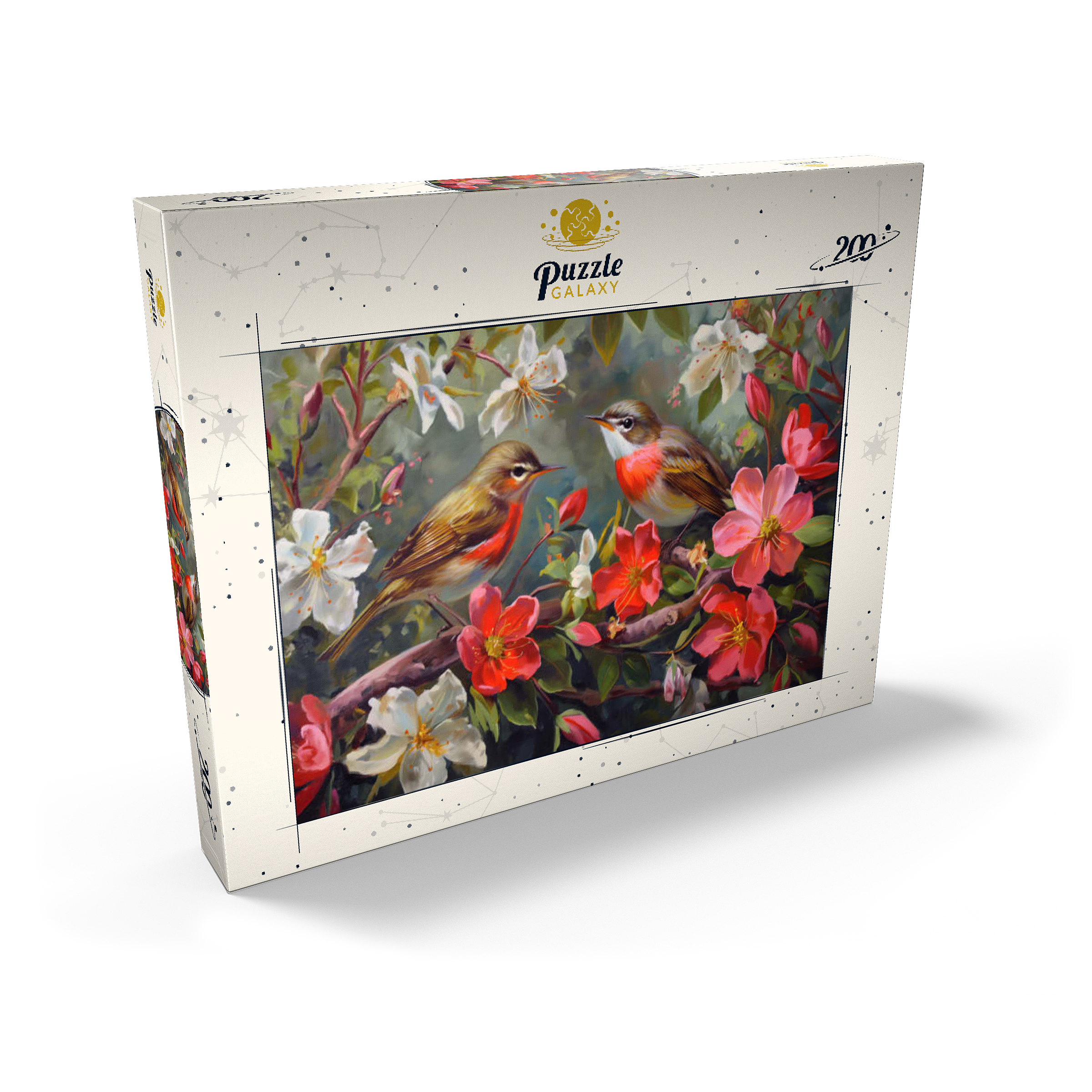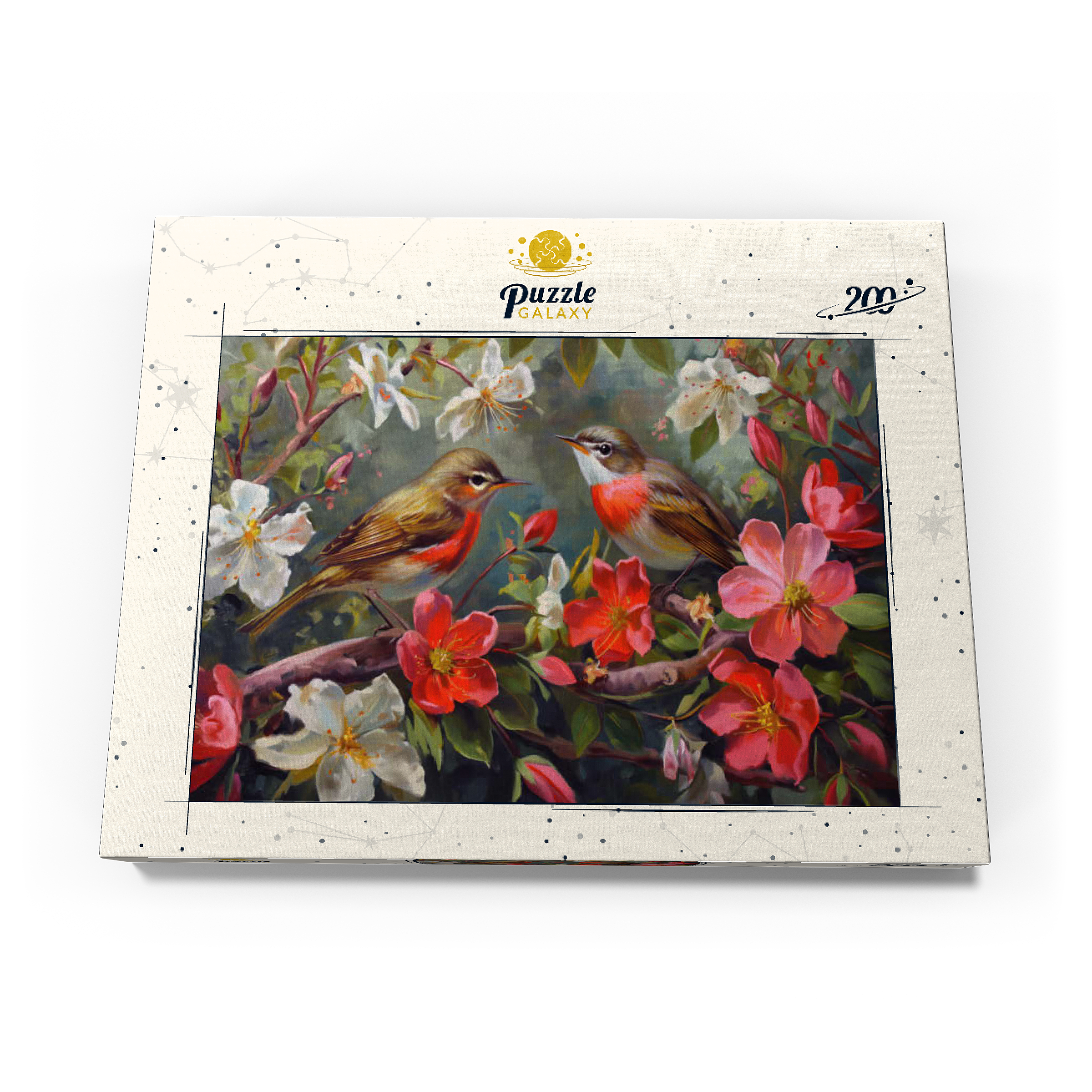 Dieses bezaubernde Kunstwerk zeigt zwei Rotkehlvögel, die anmutig inmitten leuchtender Frühlingsblumen sitzen. Die filigranen Details ihres Gefieders ergänzen das leuchtende Rot und die zarten weißen Blüten und schaffen eine harmonische Mischung aus Farbe und Struktur. Die zarten Blütenblätter und das üppige grüne Laub unterstreichen die heitere Atmosphäre eines blühenden Frühlingsgartens. Eine bezaubernde Darstellung der Eleganz der Natur und der Erneuerung des Lebens.