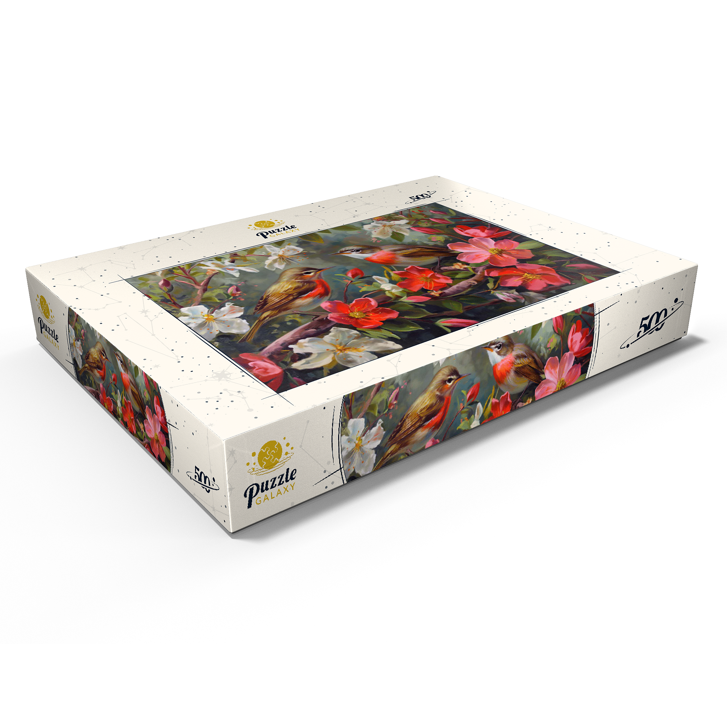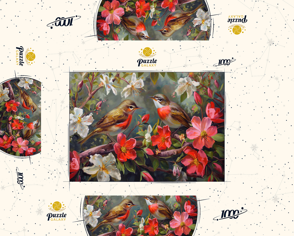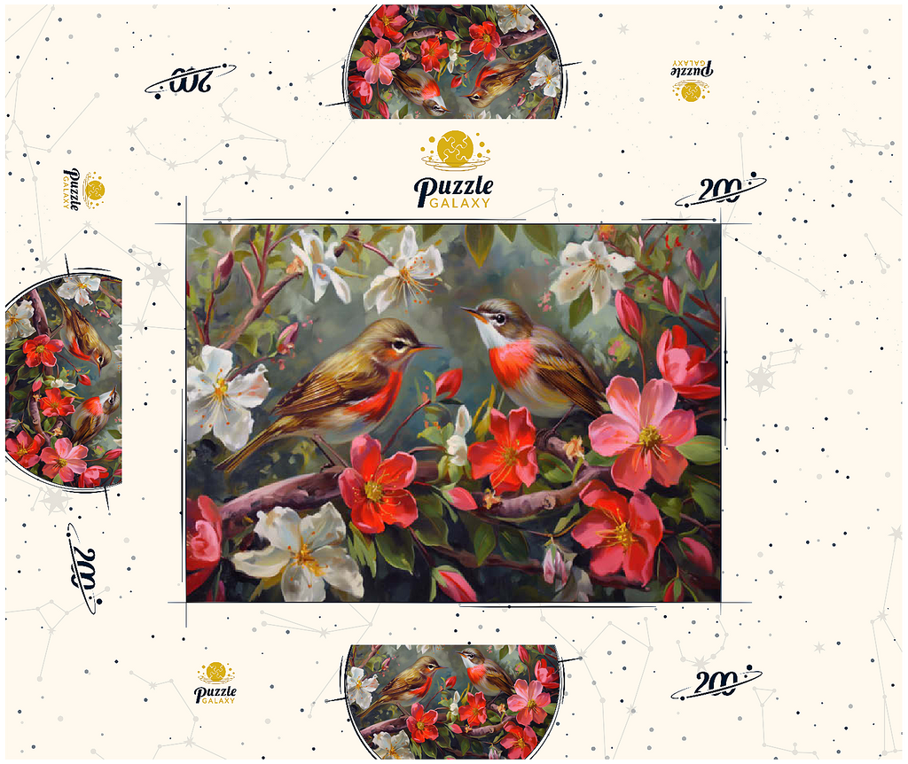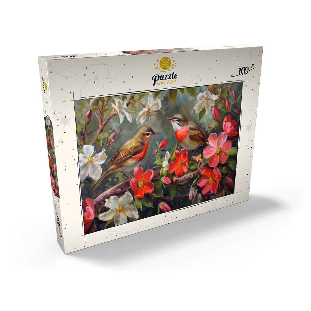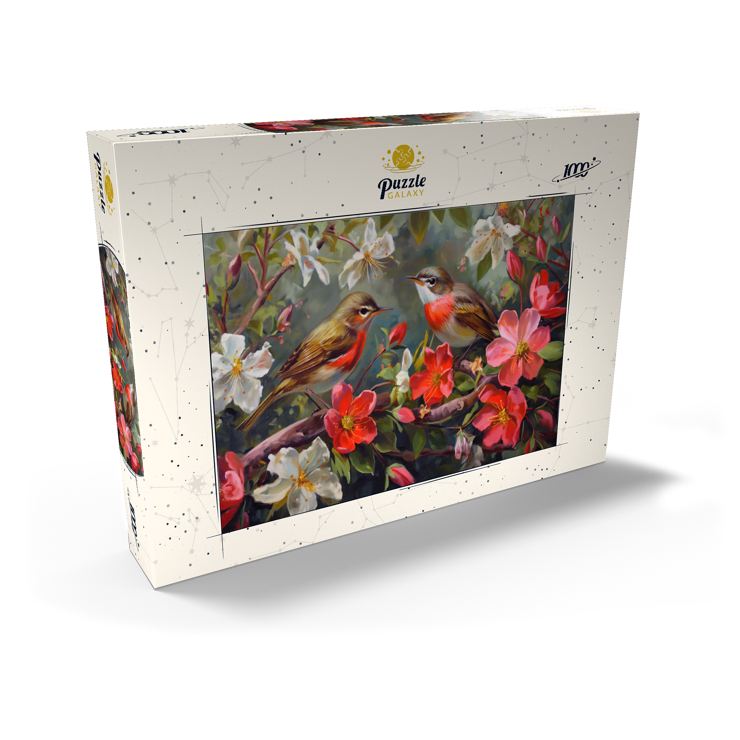 Dieses bezaubernde Kunstwerk zeigt zwei Rotkehlvögel, die anmutig inmitten leuchtender Frühlingsblumen sitzen. Die filigranen Details ihres Gefieders ergänzen das leuchtende Rot und die zarten weißen Blüten und schaffen eine harmonische Mischung aus Farbe und Struktur. Die zarten Blütenblätter und das üppige grüne Laub unterstreichen die heitere Atmosphäre eines blühenden Frühlingsgartens. Eine bezaubernde Darstellung der Eleganz der Natur und der Erneuerung des Lebens.
