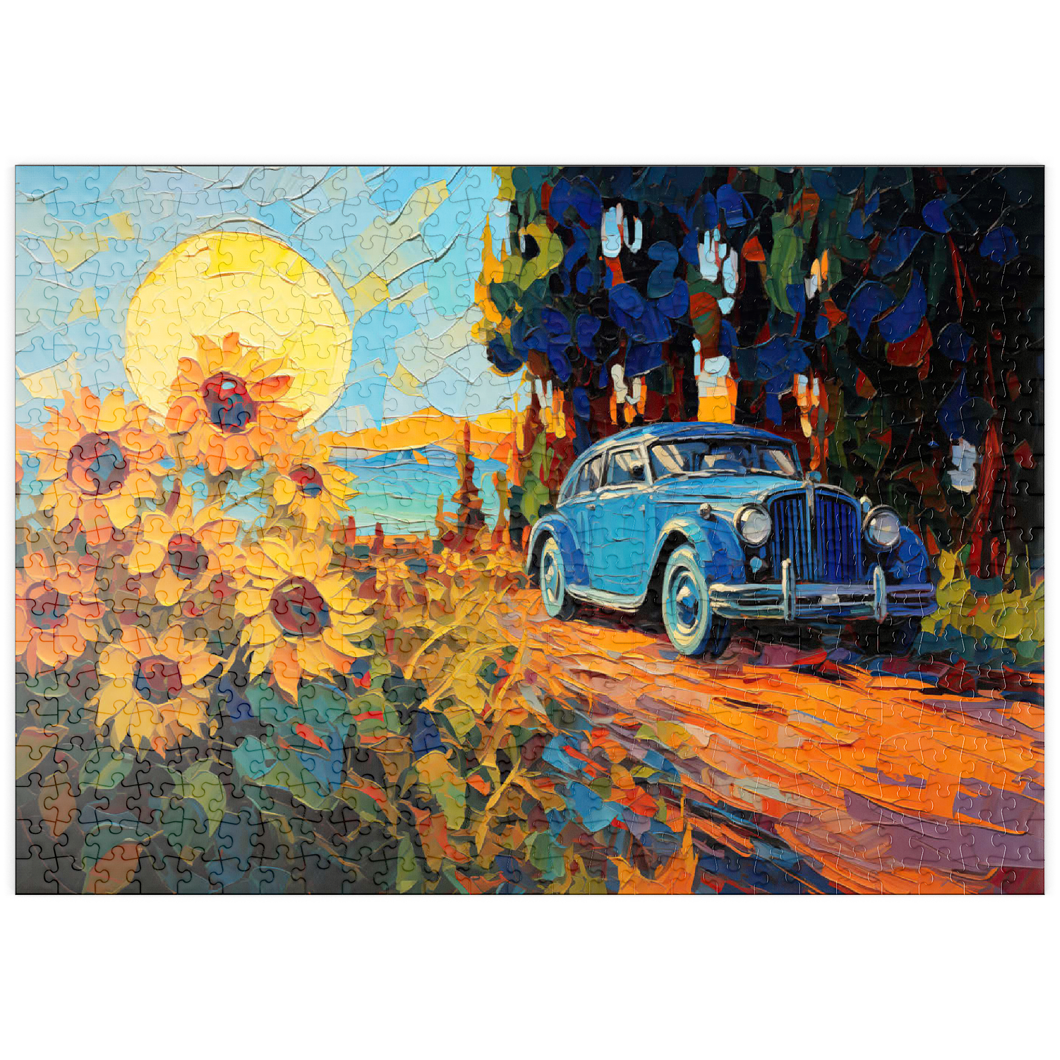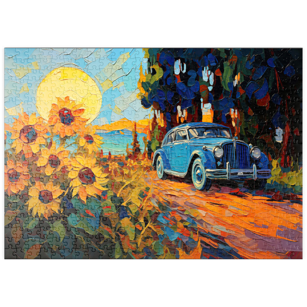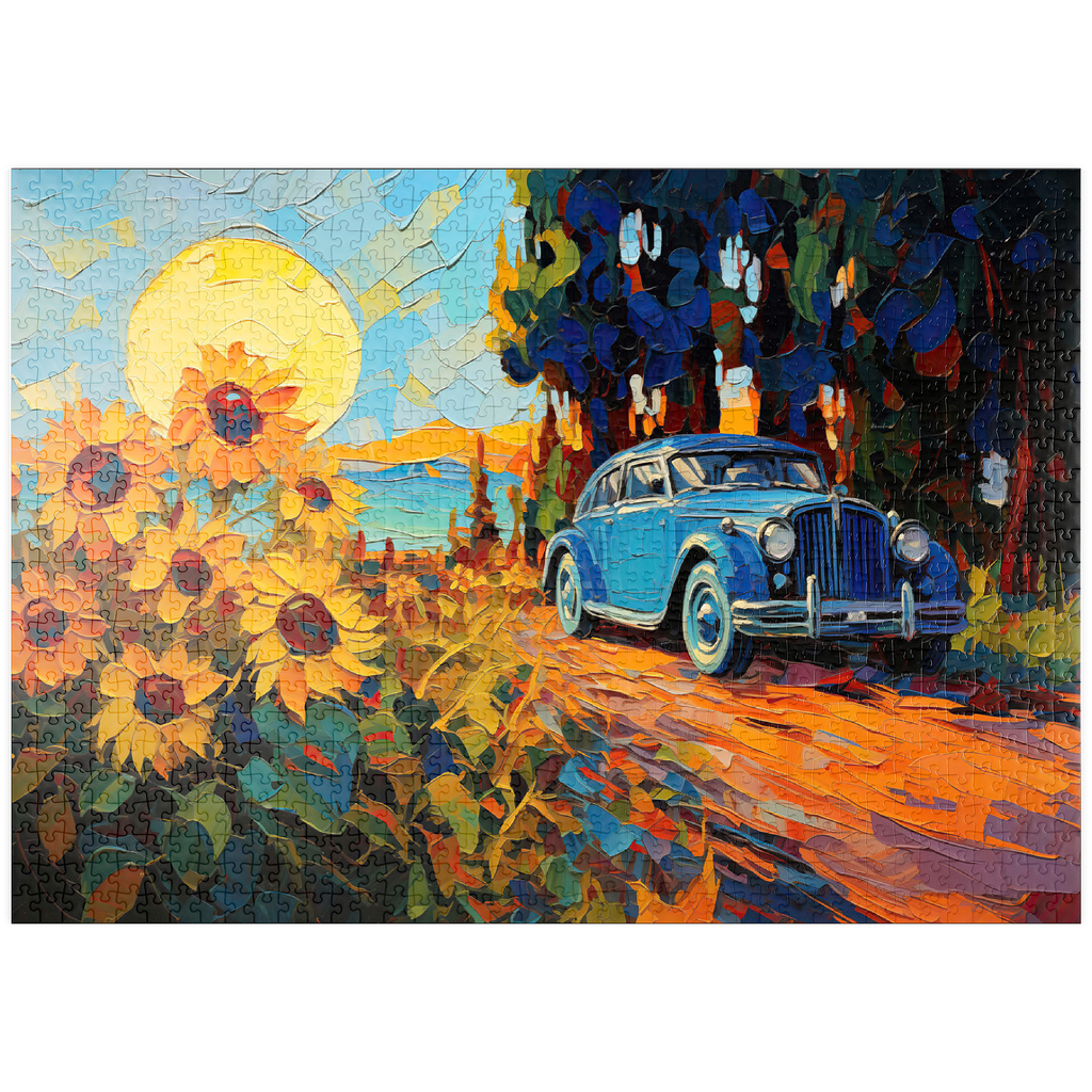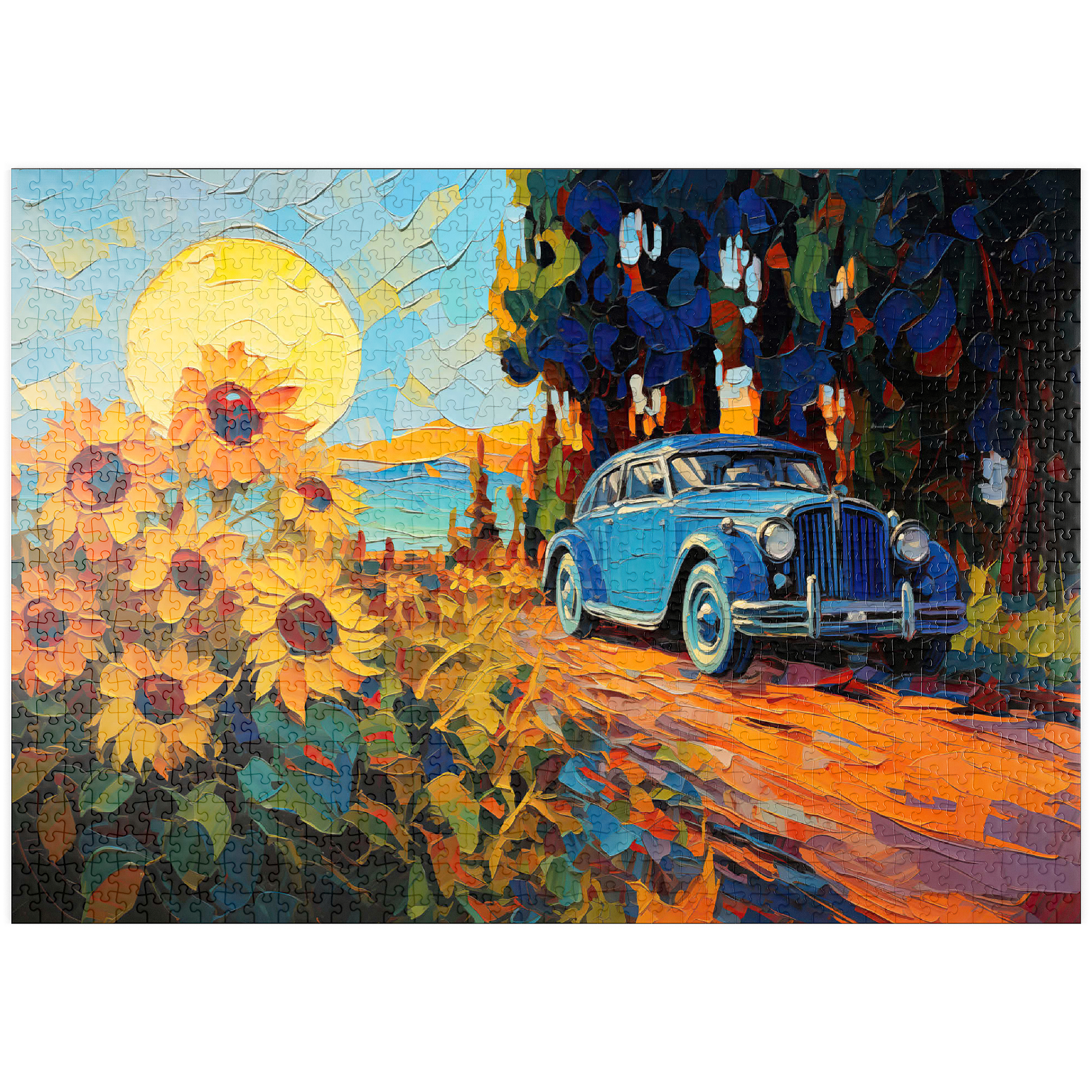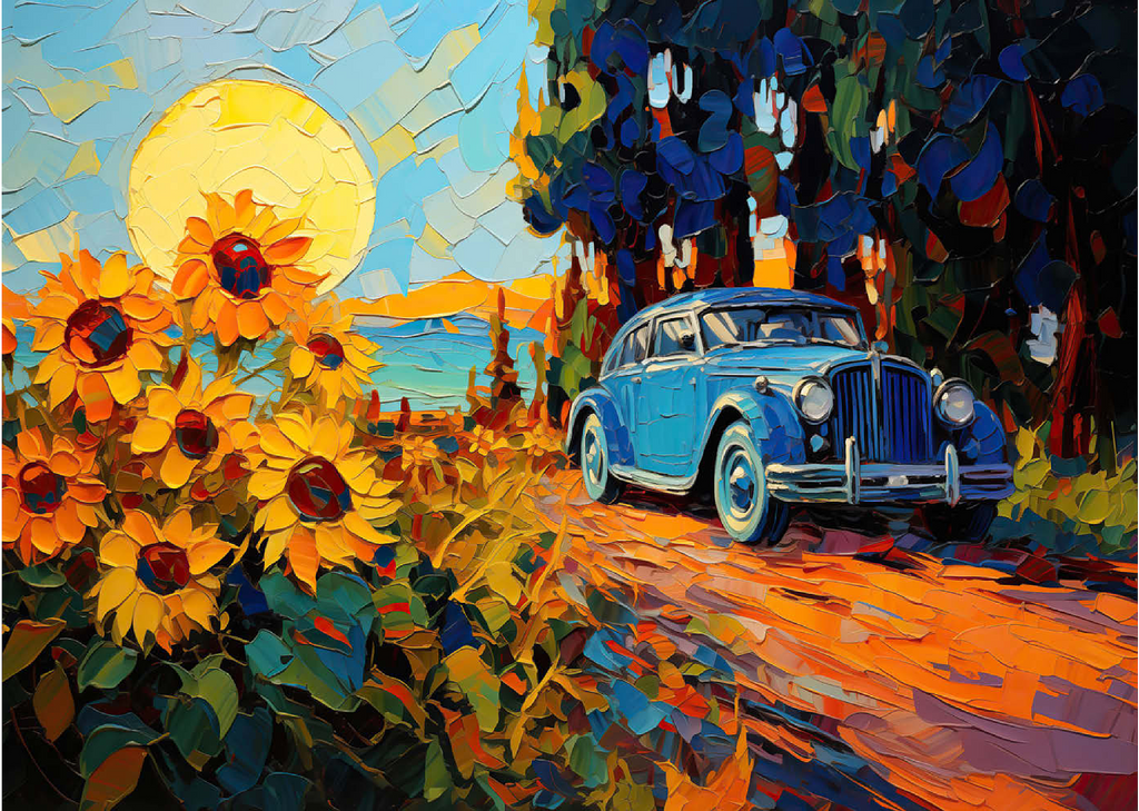 Dieses lebhafte Ölgemälde zeigt ein blaues Oldtimer-Auto, das einen von leuchtenden Sonnenblumen gesäumten Feldweg entlangfährt. Die strukturierten Pinselstriche verleihen der Szene Tiefe und Wärme, während ein goldener Sonnenuntergang die Landschaft in einer Symphonie aus gelben, orangen und blauen Farbtönen erhellt. Der nostalgische Charme des Oldtimers in Kombination mit der zeitlosen Schönheit der Sonnenblumen schafft eine fesselnde und fröhliche Komposition, die Erinnerungen an heitere Reisen aufs Land weckt.