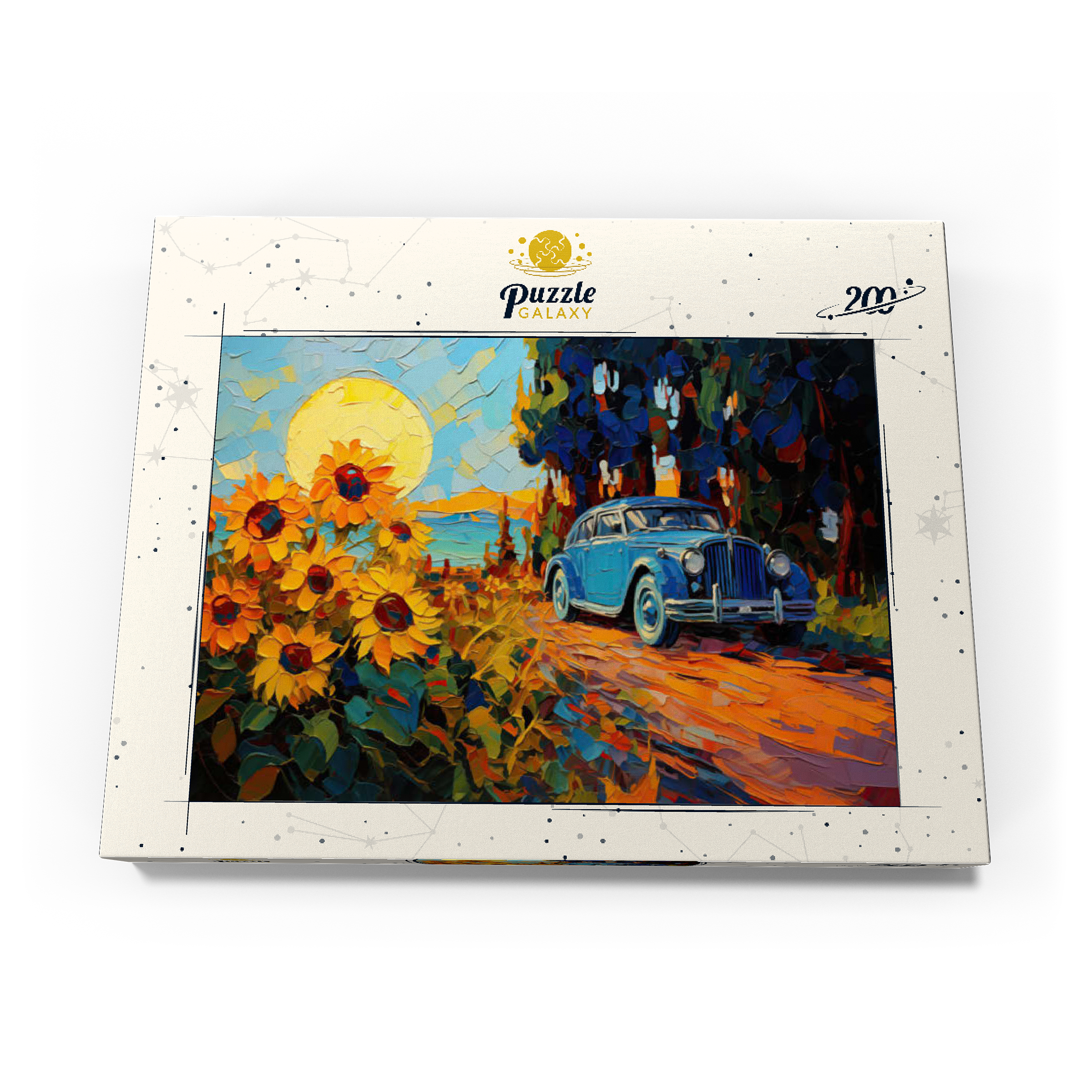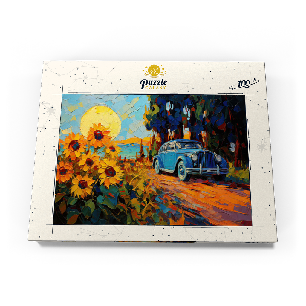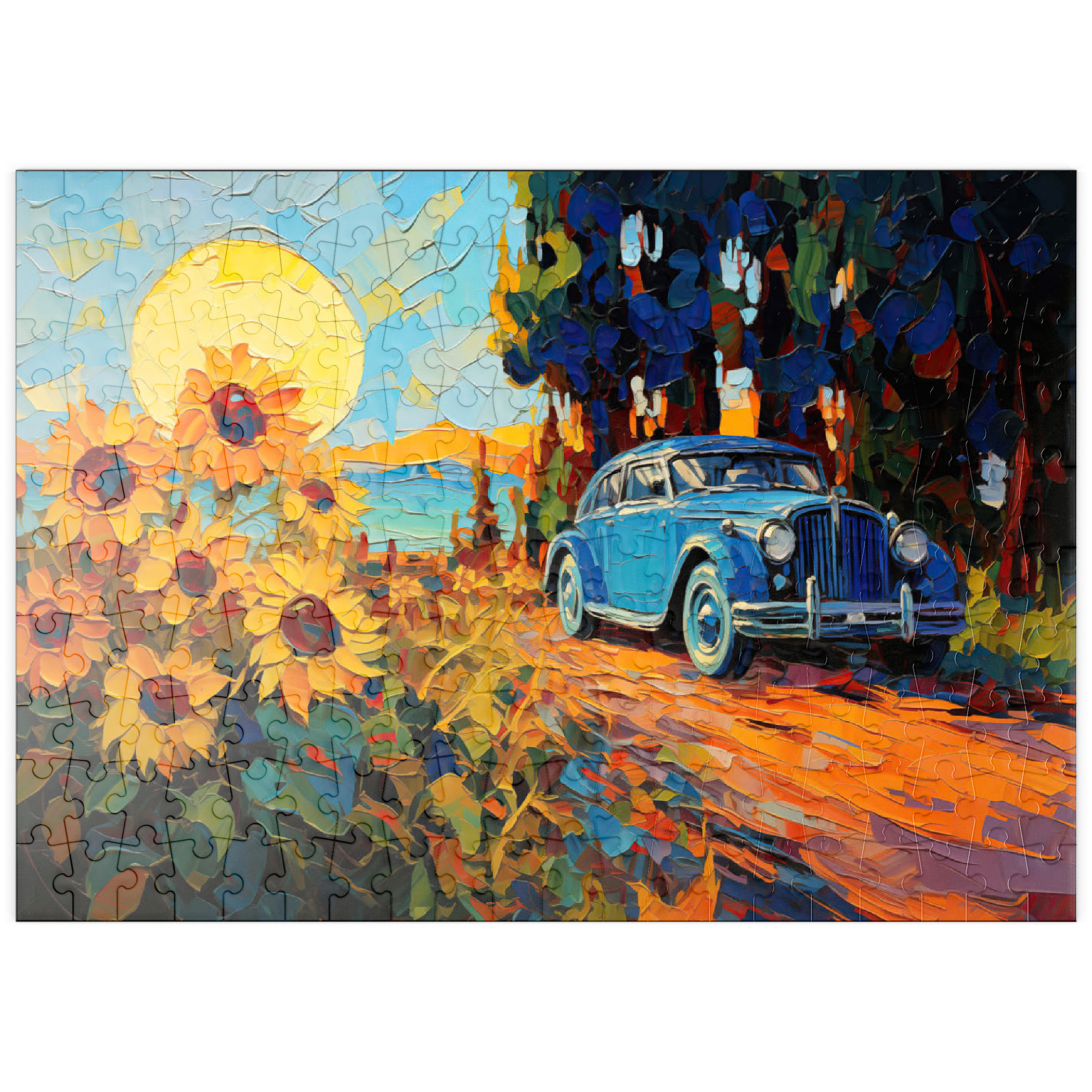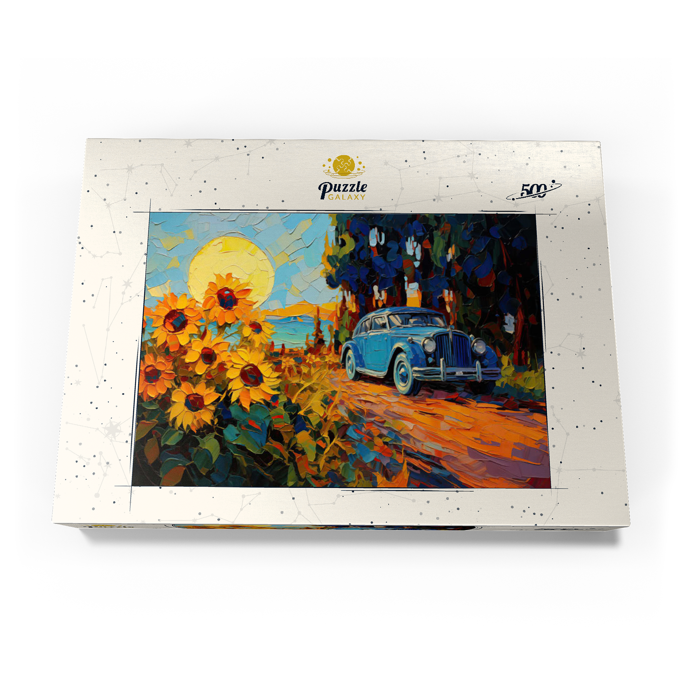 Dieses lebhafte Ölgemälde zeigt ein blaues Oldtimer-Auto, das einen von leuchtenden Sonnenblumen gesäumten Feldweg entlangfährt. Die strukturierten Pinselstriche verleihen der Szene Tiefe und Wärme, während ein goldener Sonnenuntergang die Landschaft in einer Symphonie aus gelben, orangen und blauen Farbtönen erhellt. Der nostalgische Charme des Oldtimers in Kombination mit der zeitlosen Schönheit der Sonnenblumen schafft eine fesselnde und fröhliche Komposition, die Erinnerungen an heitere Reisen aufs Land weckt.