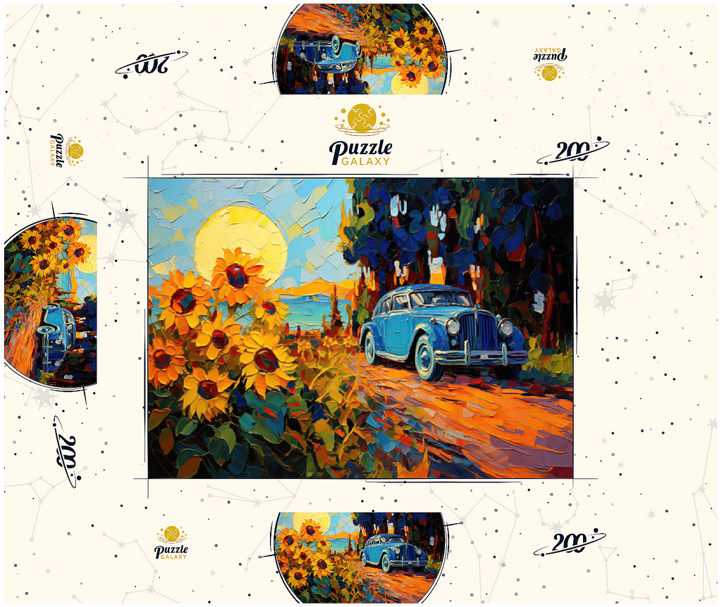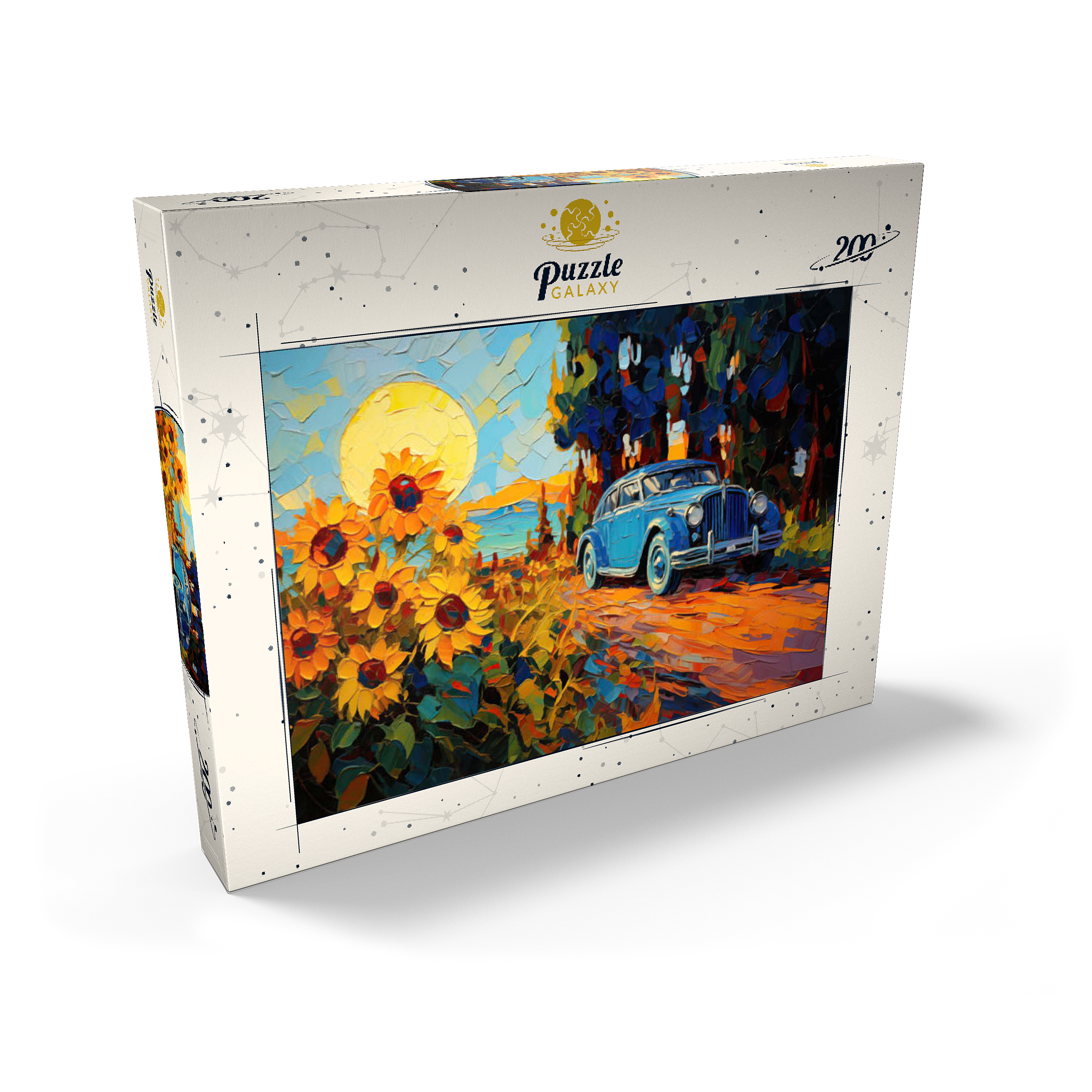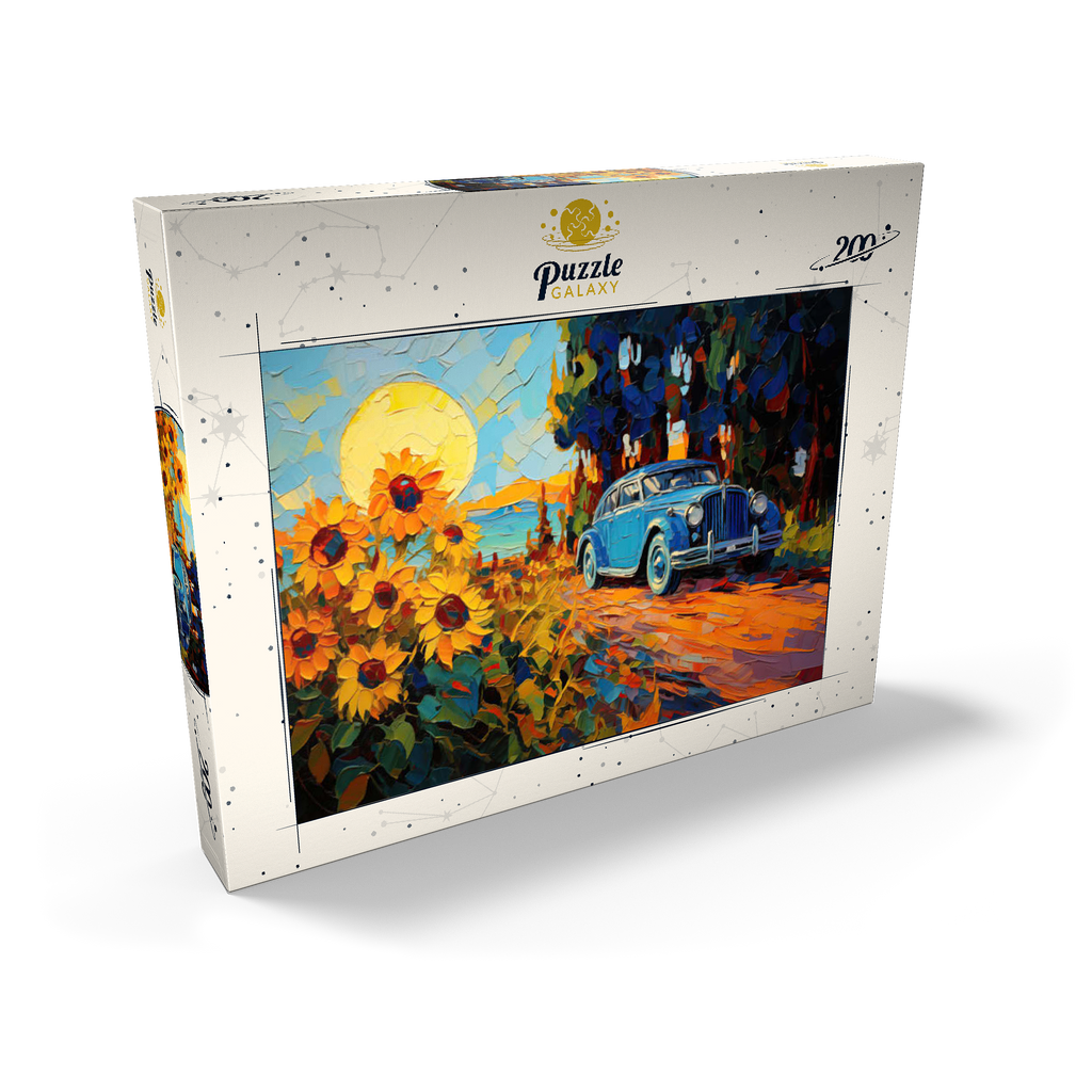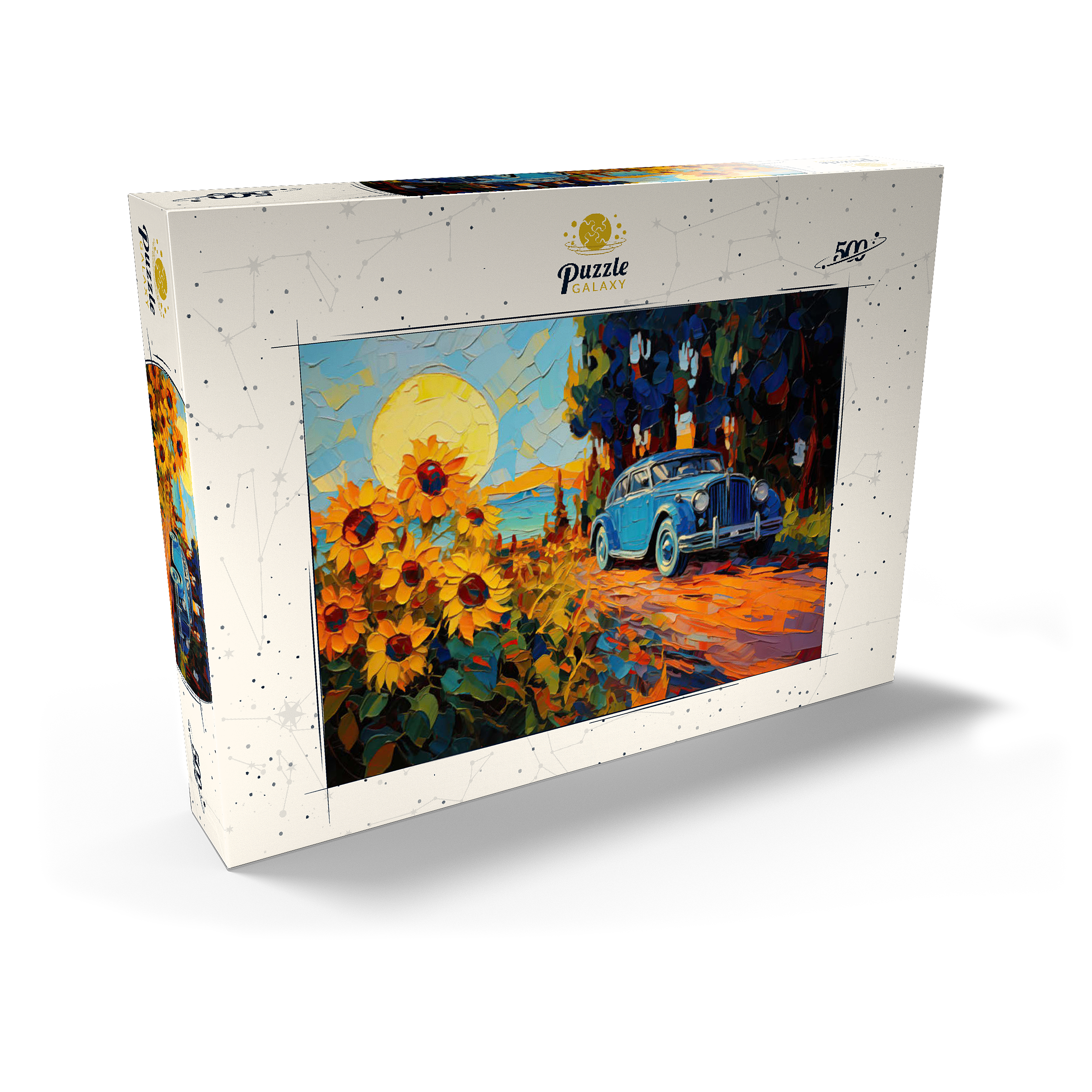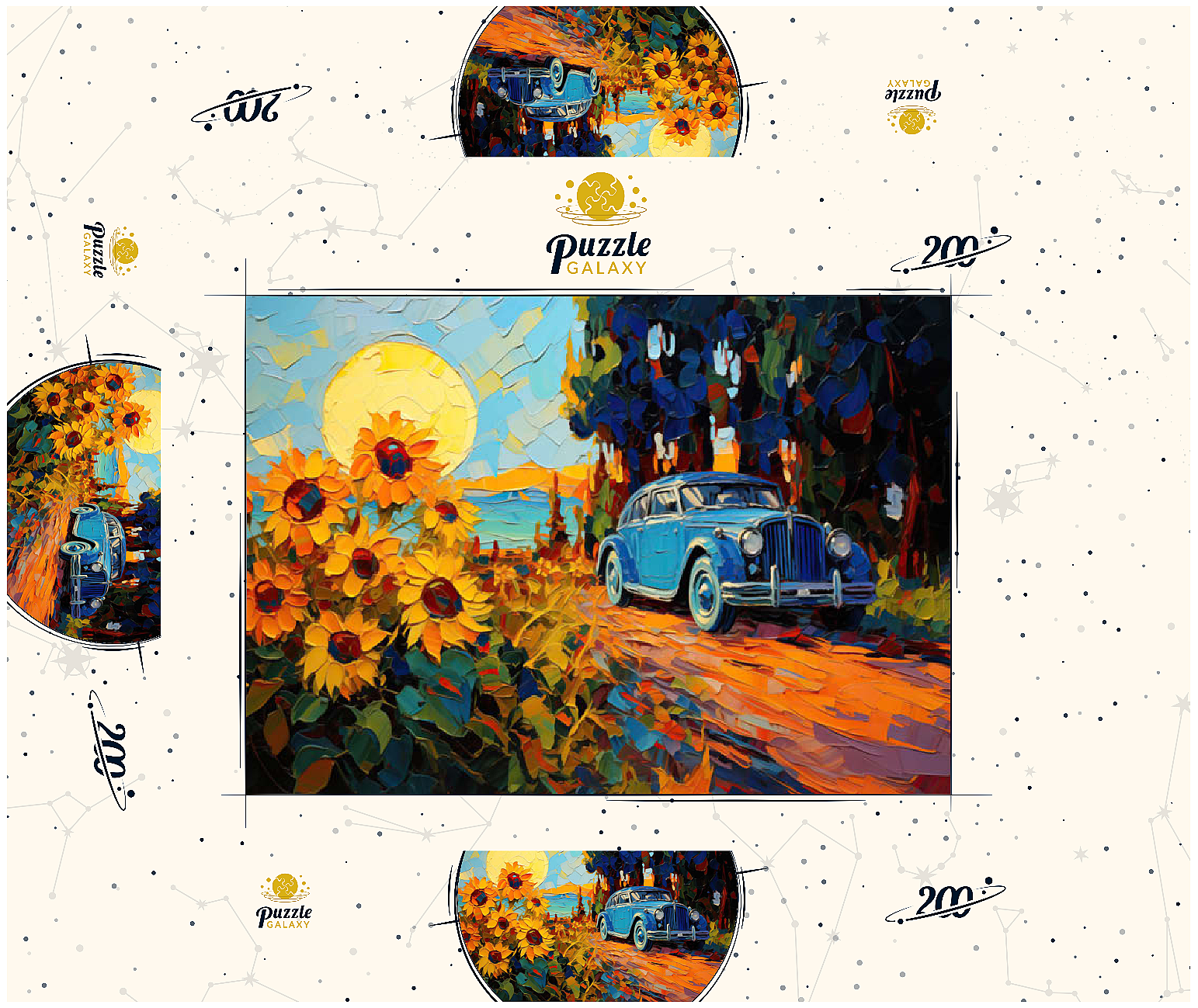 Dieses lebhafte Ölgemälde zeigt ein blaues Oldtimer-Auto, das einen von leuchtenden Sonnenblumen gesäumten Feldweg entlangfährt. Die strukturierten Pinselstriche verleihen der Szene Tiefe und Wärme, während ein goldener Sonnenuntergang die Landschaft in einer Symphonie aus gelben, orangen und blauen Farbtönen erhellt. Der nostalgische Charme des Oldtimers in Kombination mit der zeitlosen Schönheit der Sonnenblumen schafft eine fesselnde und fröhliche Komposition, die Erinnerungen an heitere Reisen aufs Land weckt.
