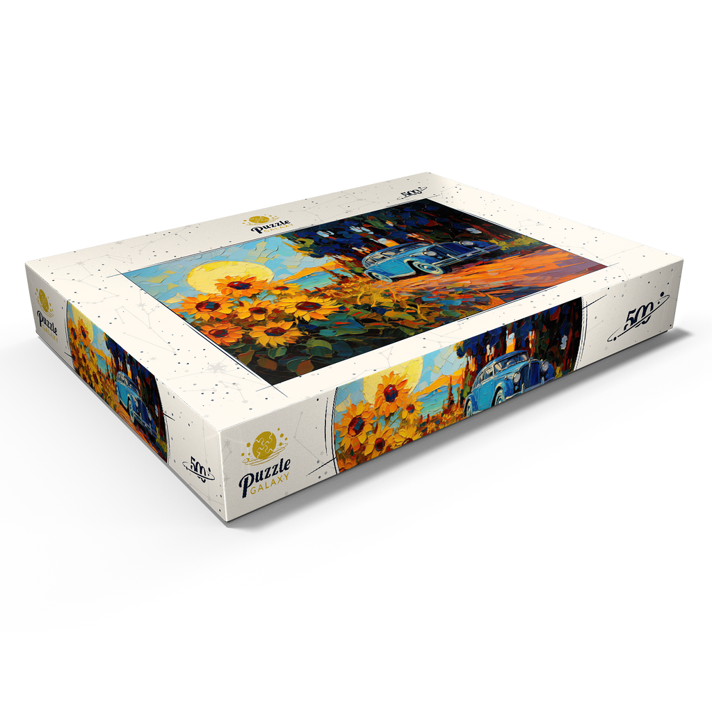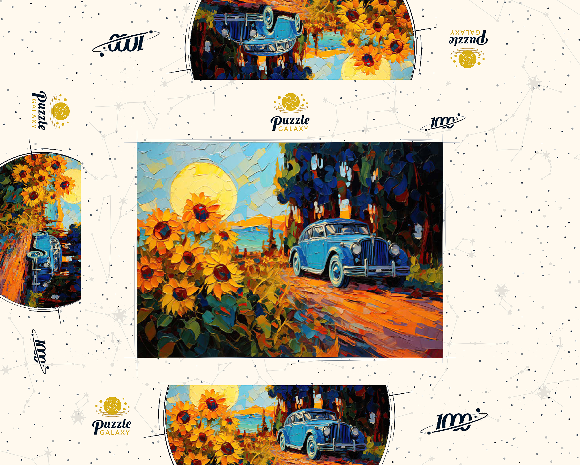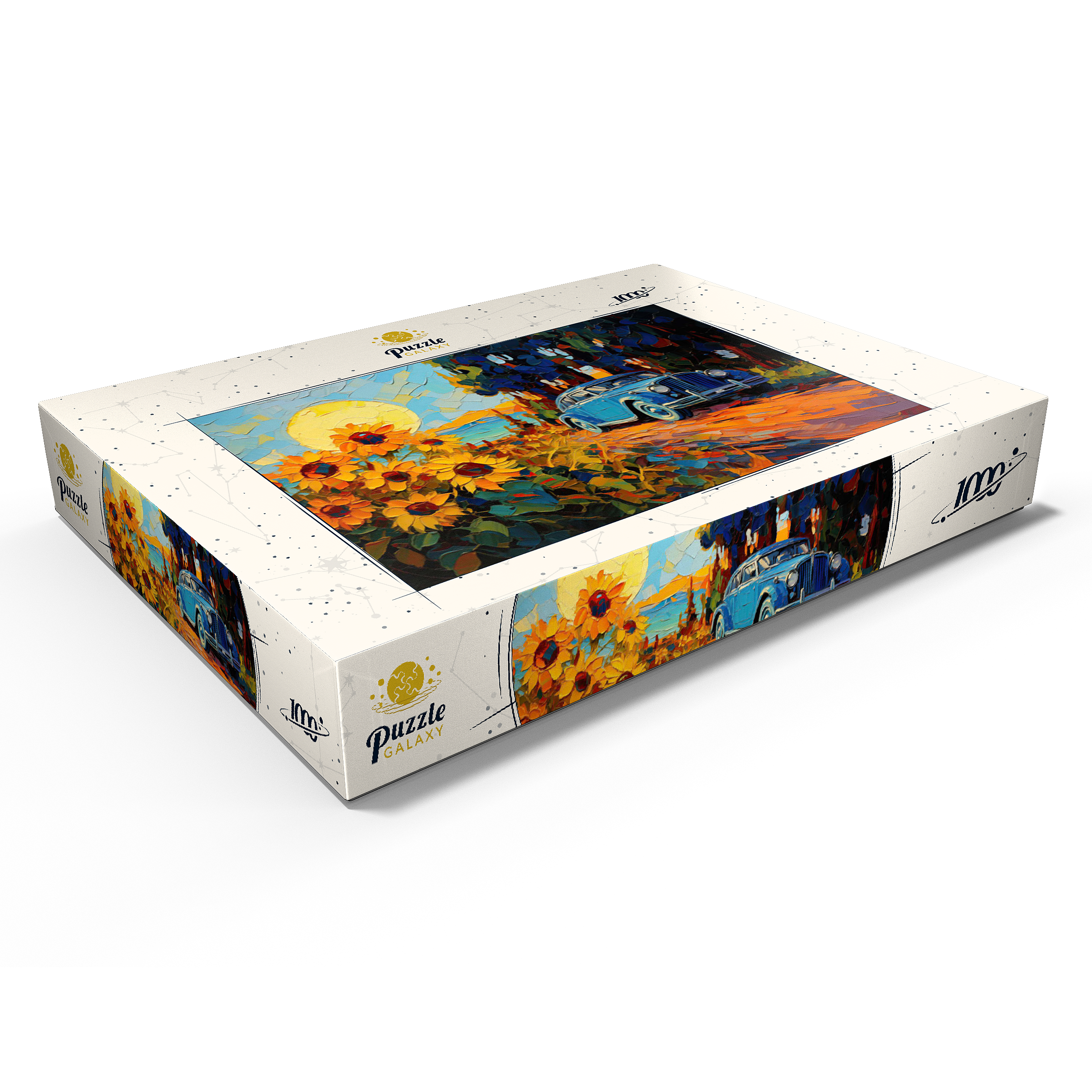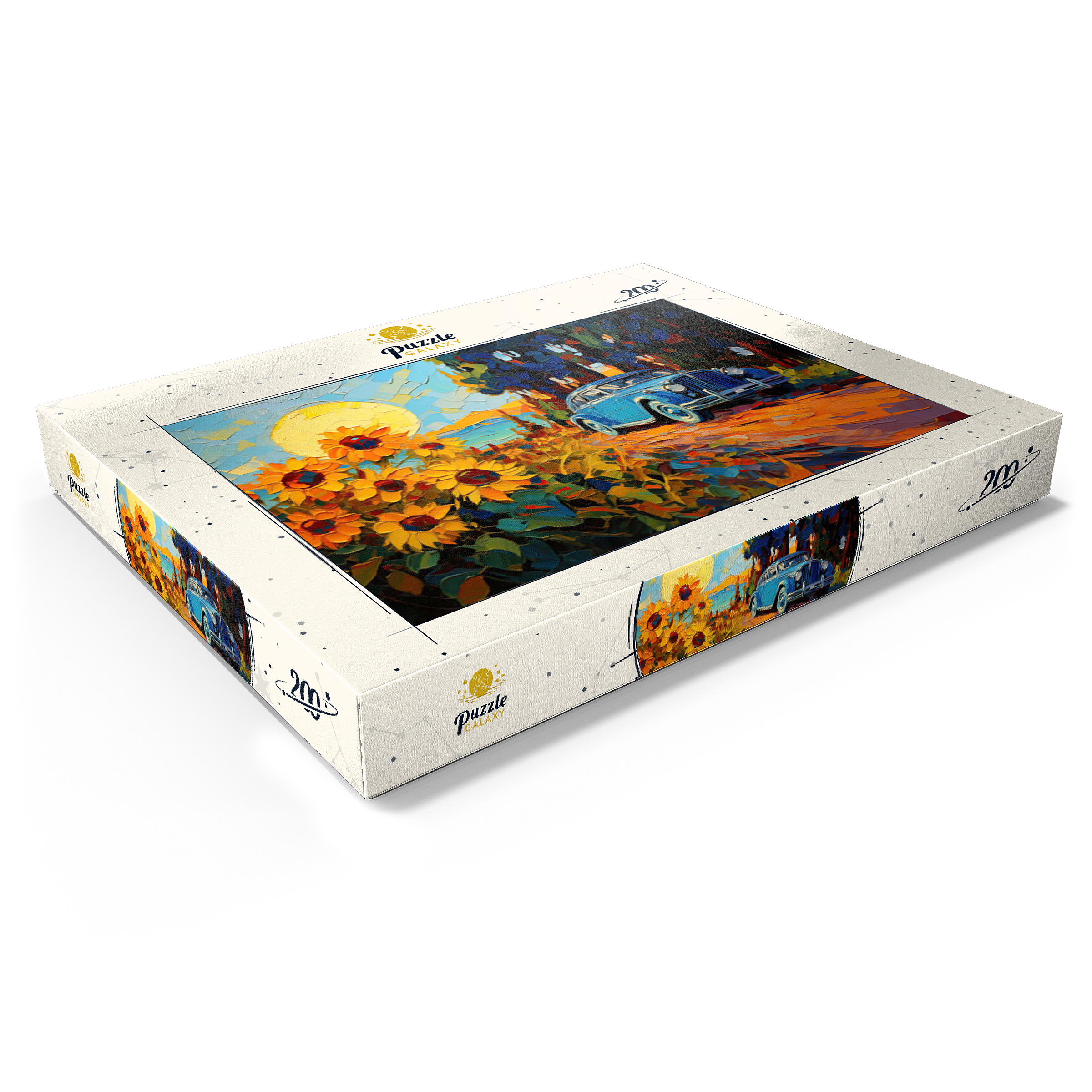 Dieses lebhafte Ölgemälde zeigt ein blaues Oldtimer-Auto, das einen von leuchtenden Sonnenblumen gesäumten Feldweg entlangfährt. Die strukturierten Pinselstriche verleihen der Szene Tiefe und Wärme, während ein goldener Sonnenuntergang die Landschaft in einer Symphonie aus gelben, orangen und blauen Farbtönen erhellt. Der nostalgische Charme des Oldtimers in Kombination mit der zeitlosen Schönheit der Sonnenblumen schafft eine fesselnde und fröhliche Komposition, die Erinnerungen an heitere Reisen aufs Land weckt.
