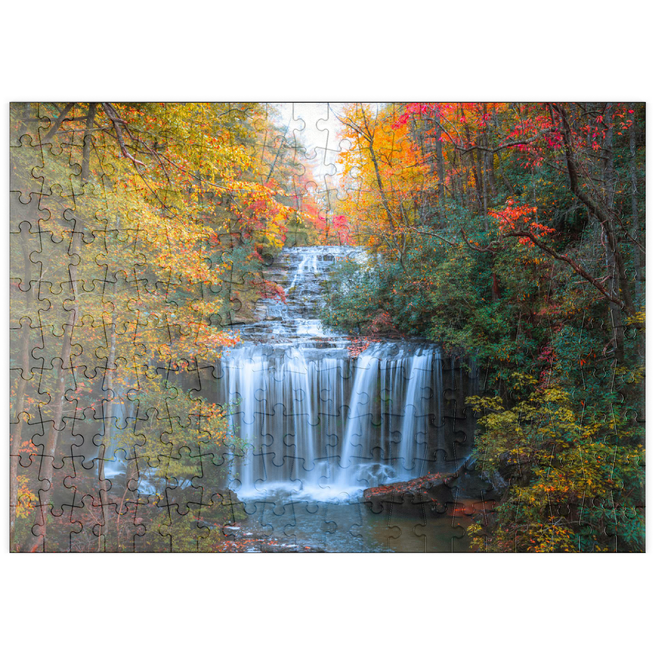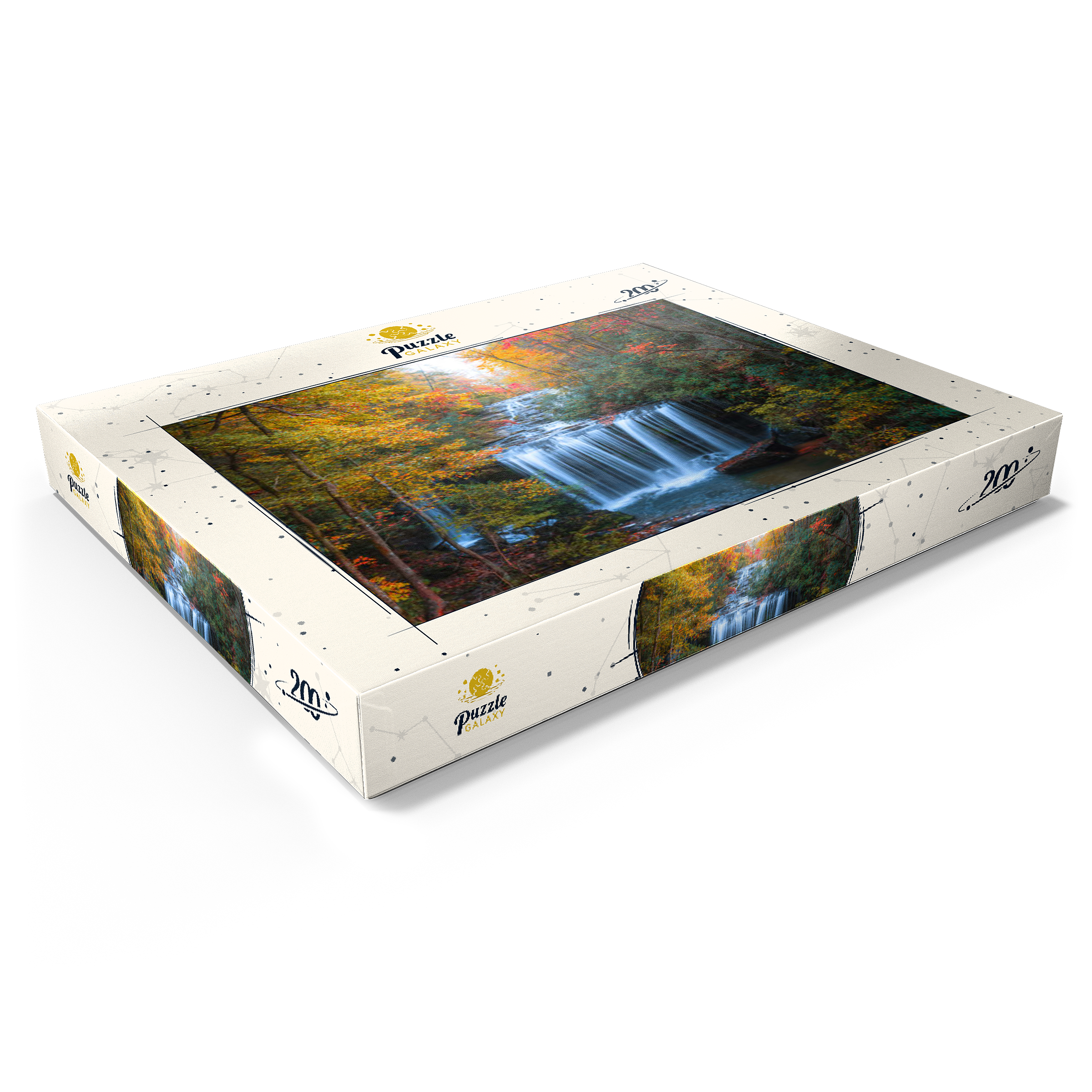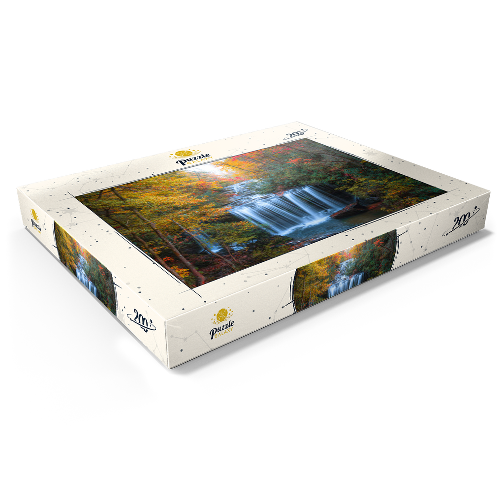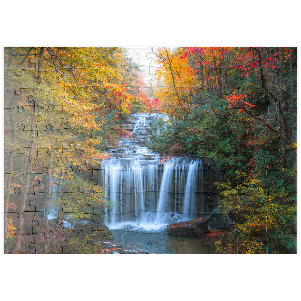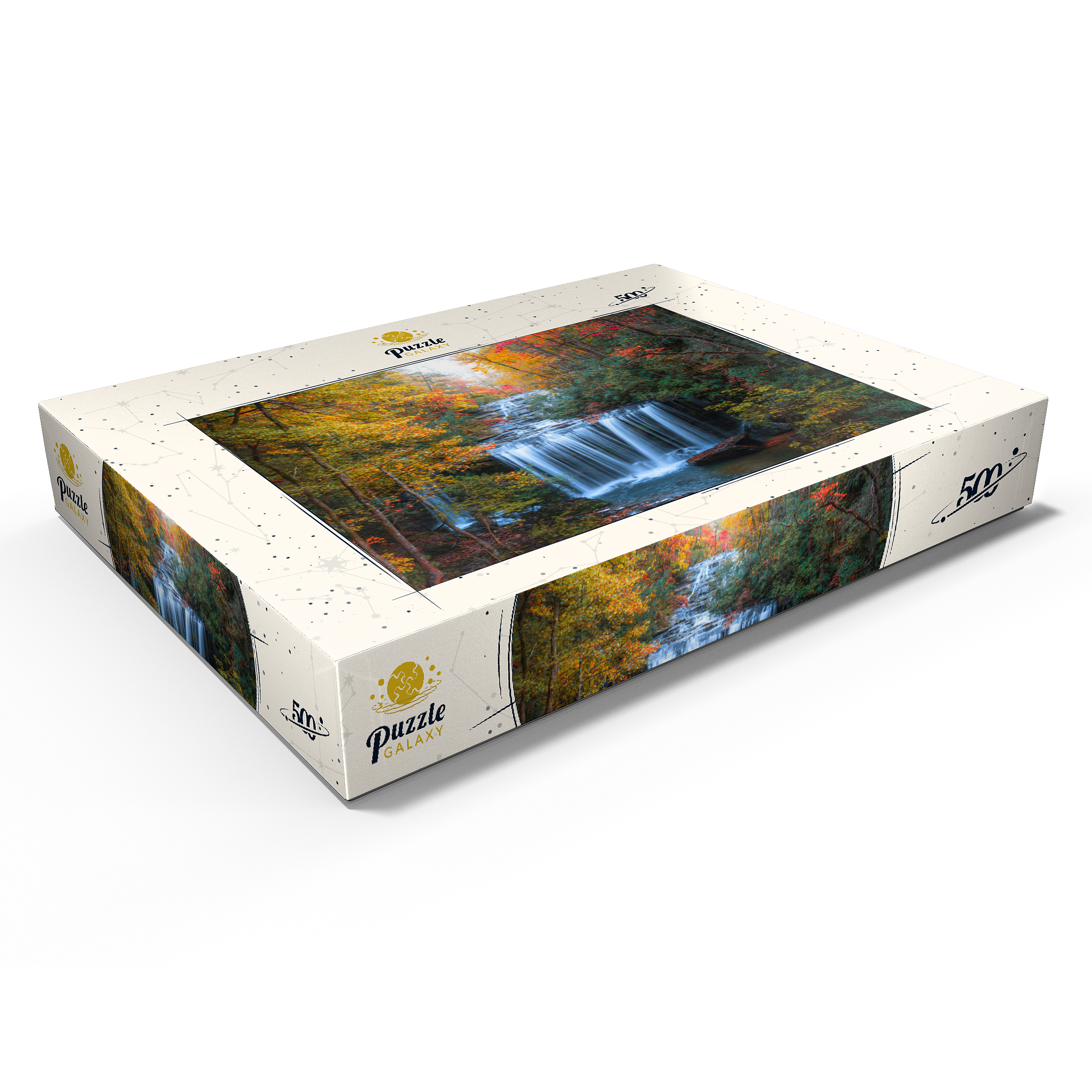 Diese atemberaubende Szene zeigt einen herabstürzenden Wasserfall inmitten eines in Herbstfarben leuchtenden Waldes. Die leuchtenden Rot-, Orange- und Gelbtöne des Laubes bilden einen auffallenden Kontrast zu dem ruhigen, weißen Wasserlauf. Umgeben von üppigem Grün und beleuchtet von sanftem natürlichem Licht, verkörpert diese malerische Szenerie die ruhige Schönheit der Natur während der Herbstzeit.