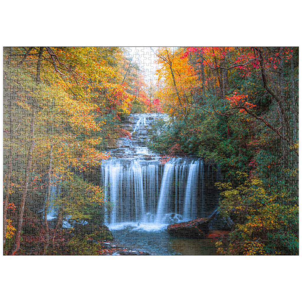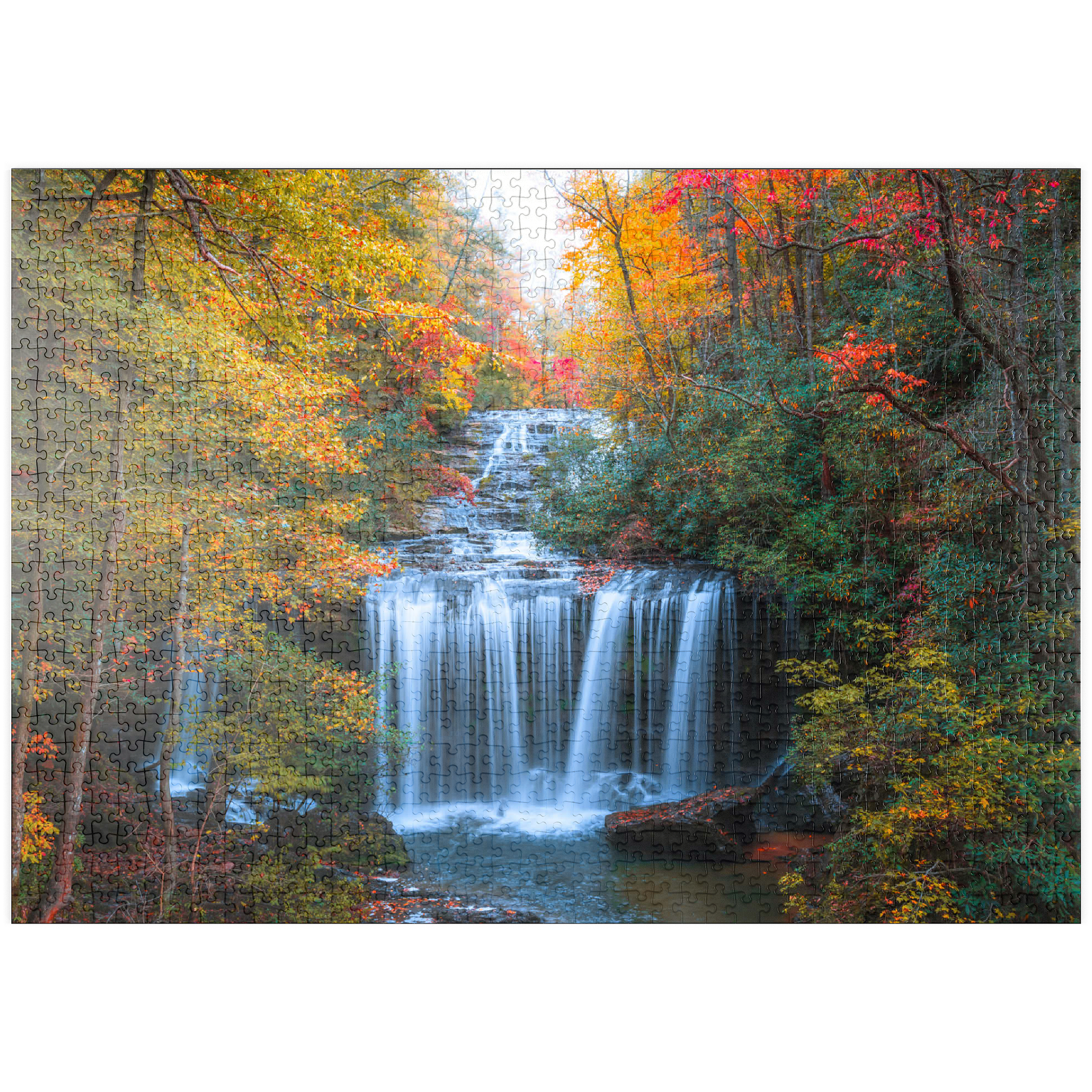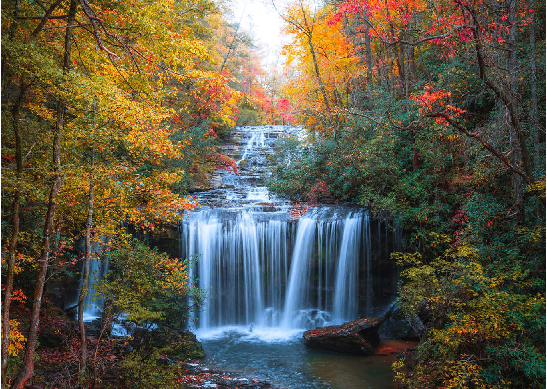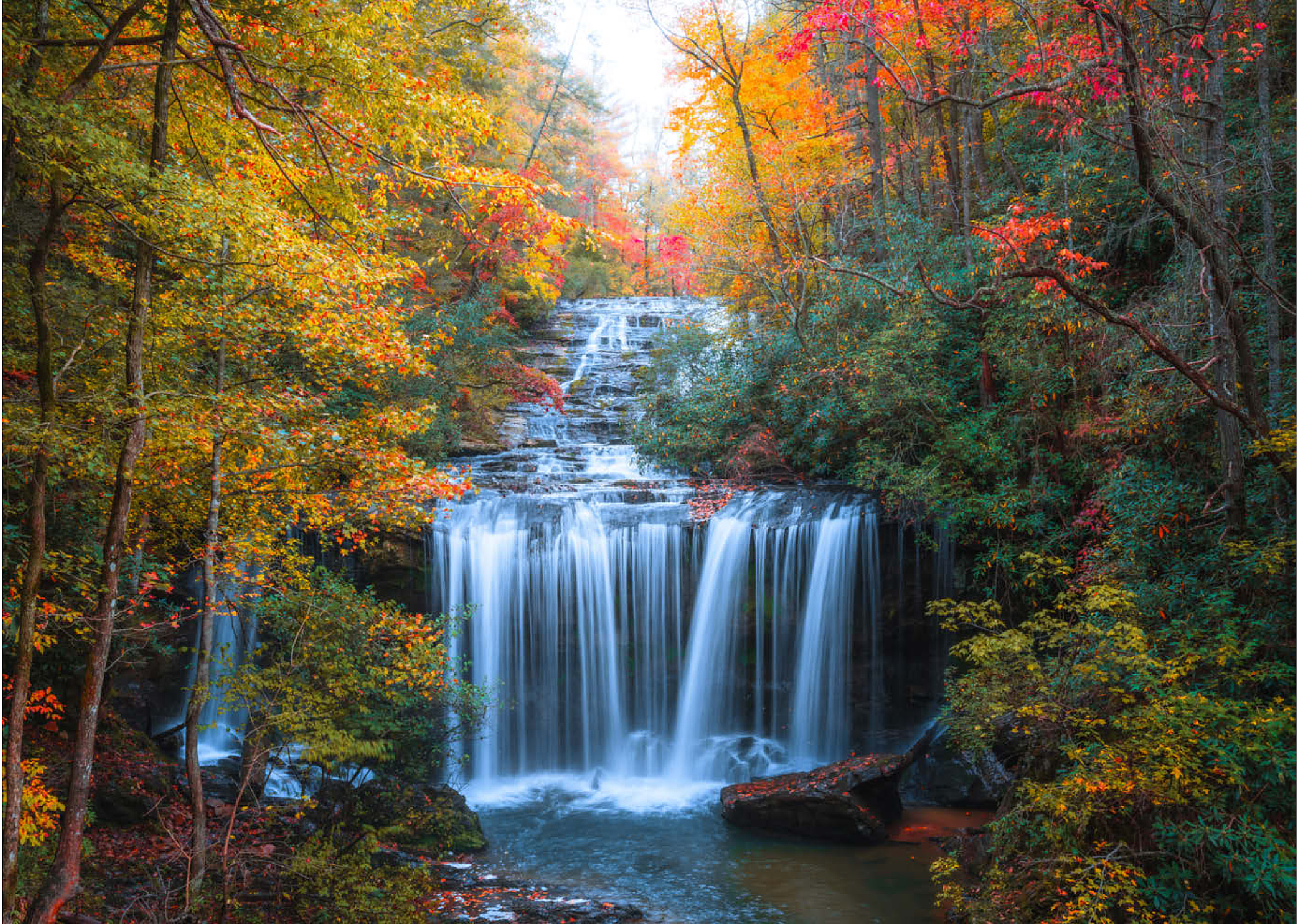 Diese atemberaubende Szene zeigt einen herabstürzenden Wasserfall inmitten eines in Herbstfarben leuchtenden Waldes. Die leuchtenden Rot-, Orange- und Gelbtöne des Laubes bilden einen auffallenden Kontrast zu dem ruhigen, weißen Wasserlauf. Umgeben von üppigem Grün und beleuchtet von sanftem natürlichem Licht, verkörpert diese malerische Szenerie die ruhige Schönheit der Natur während der Herbstzeit.