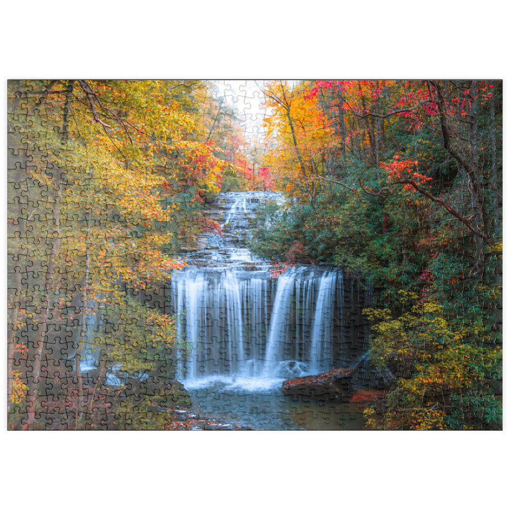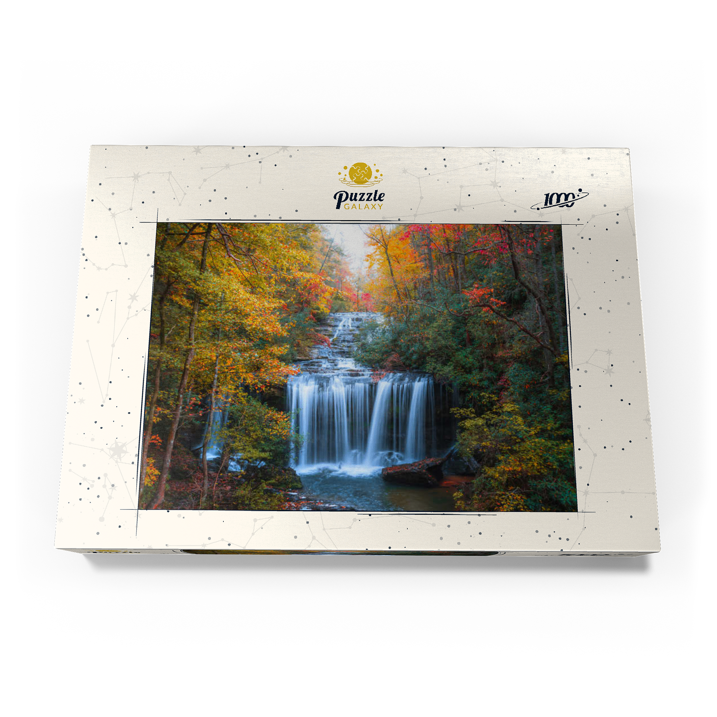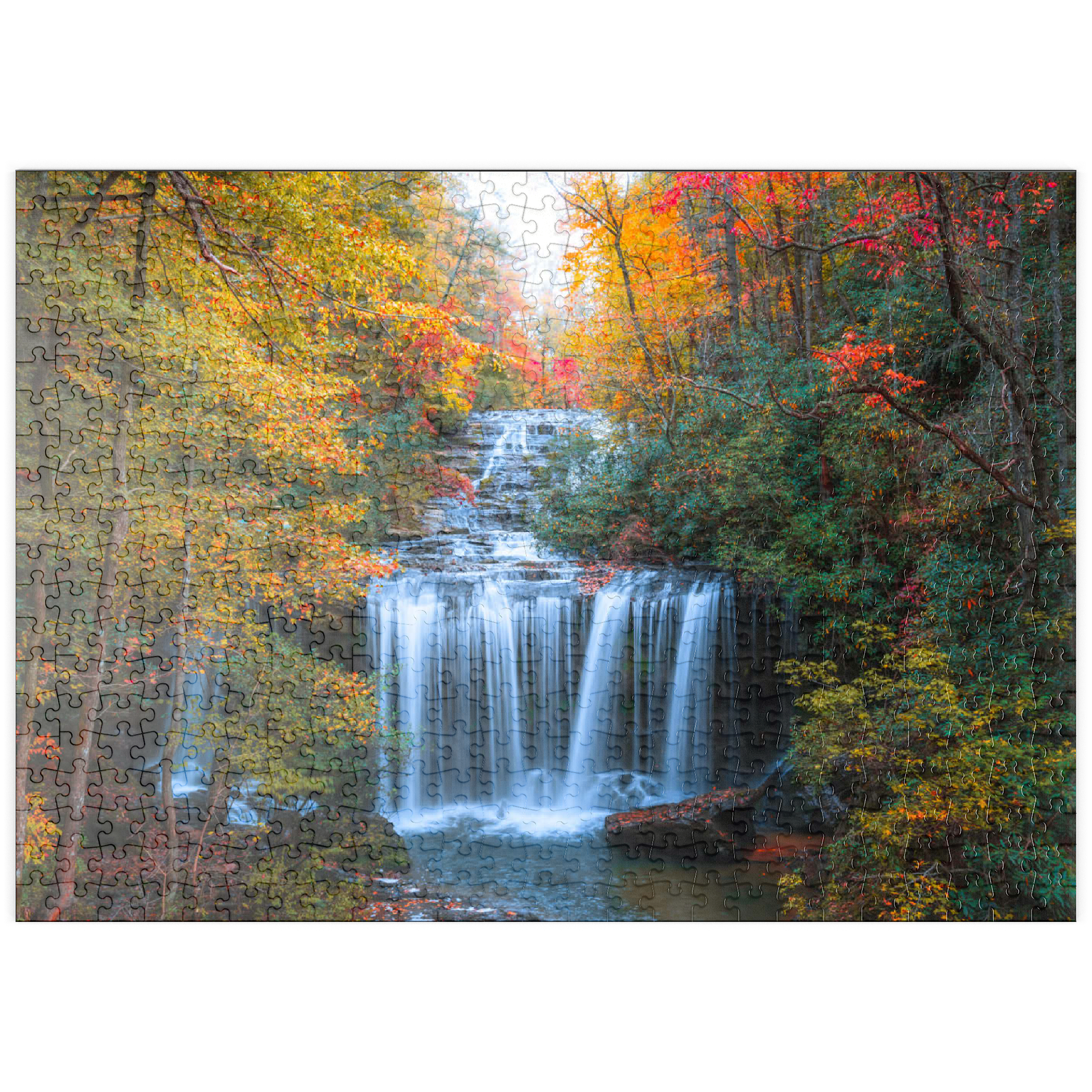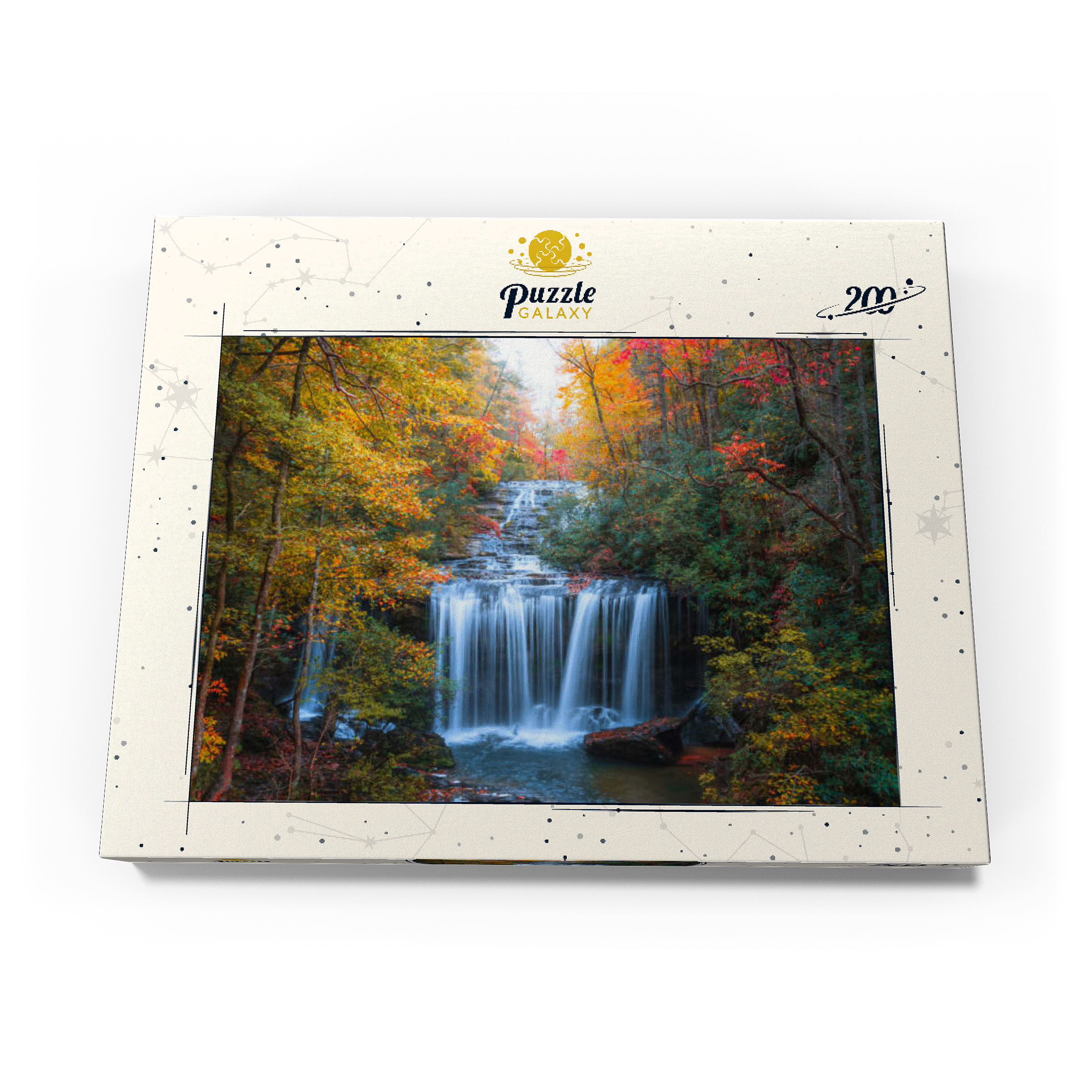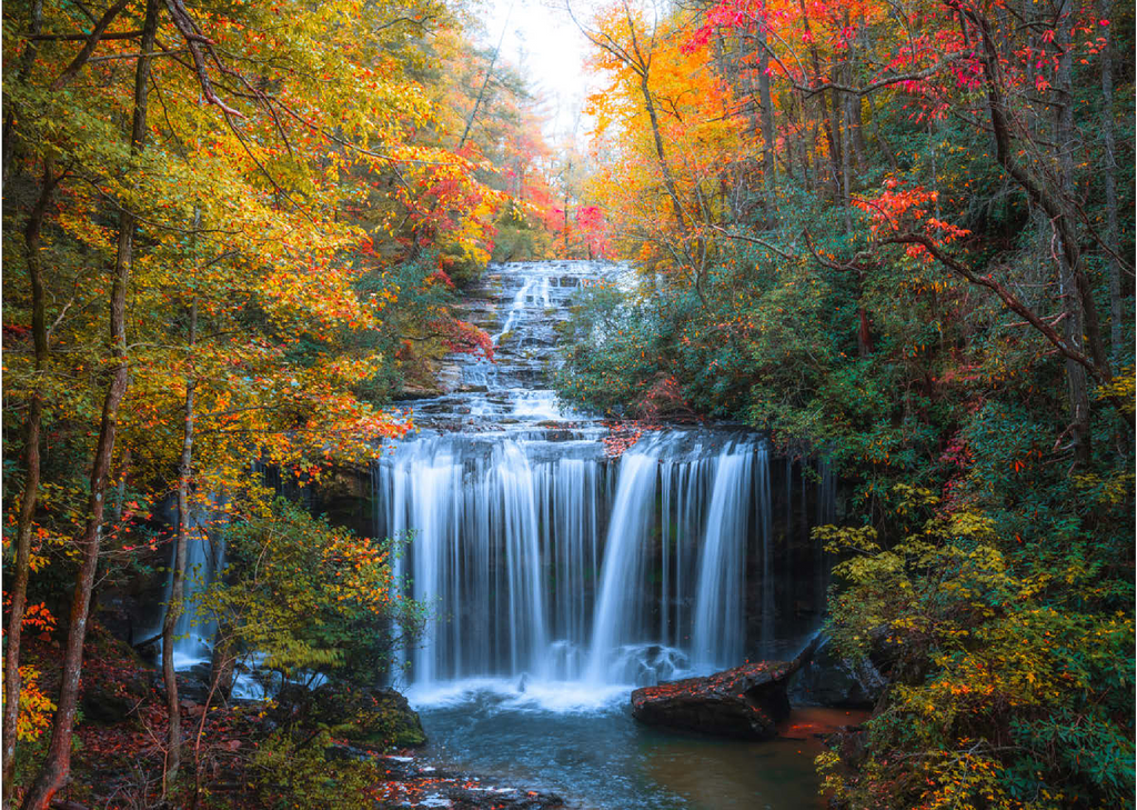Diese atemberaubende Szene zeigt einen herabstürzenden Wasserfall inmitten eines in Herbstfarben leuchtenden Waldes. Die leuchtenden Rot-, Orange- und Gelbtöne des Laubes bilden einen auffallenden Kontrast zu dem ruhigen, weißen Wasserlauf. Umgeben von üppigem Grün und beleuchtet von sanftem natürlichem Licht, verkörpert diese malerische Szenerie die ruhige Schönheit der Natur während der Herbstzeit.