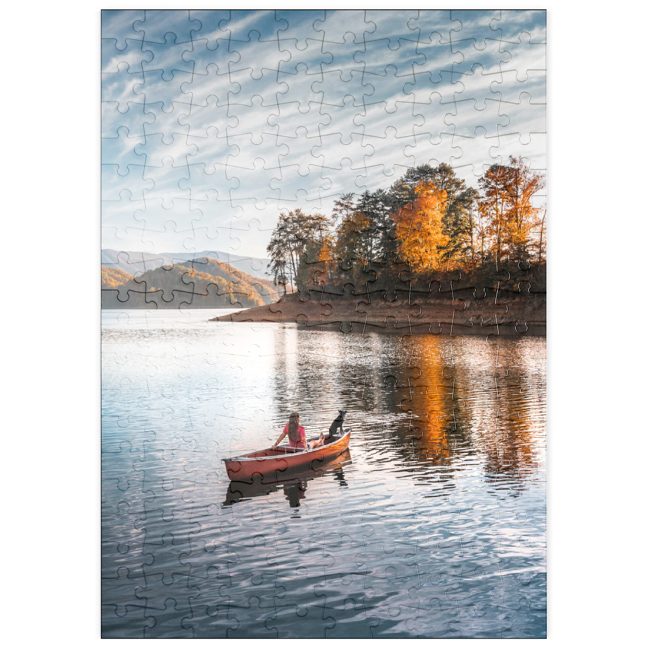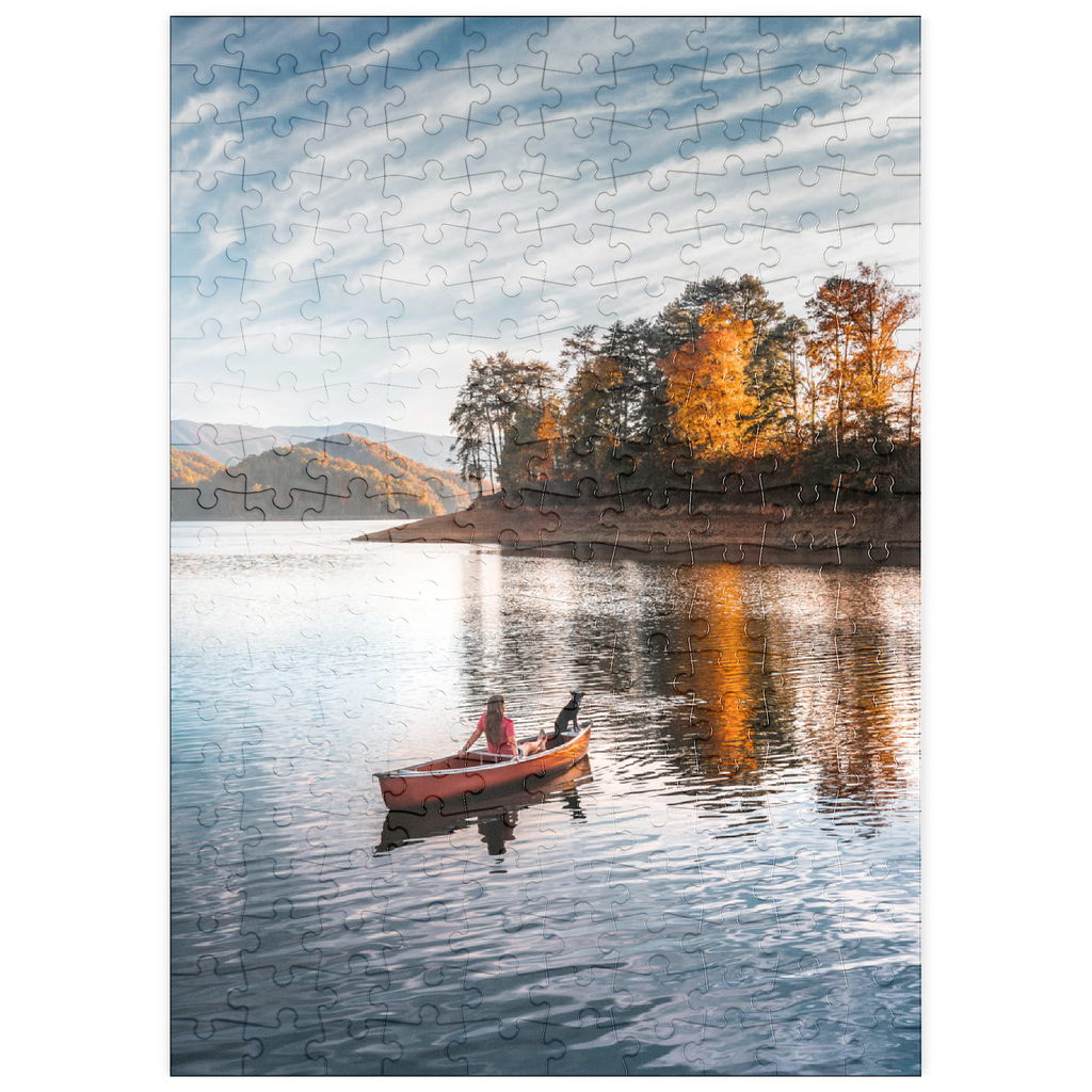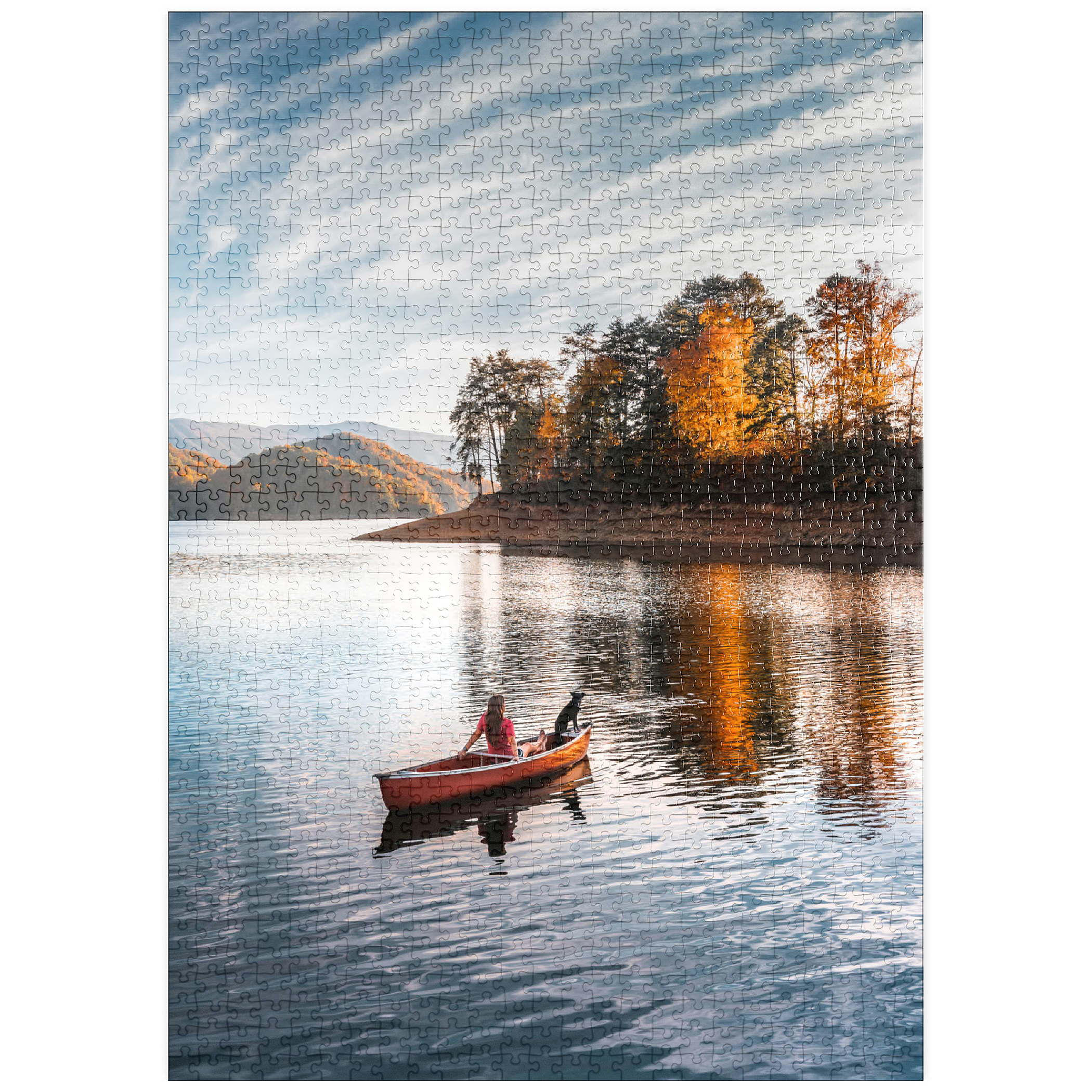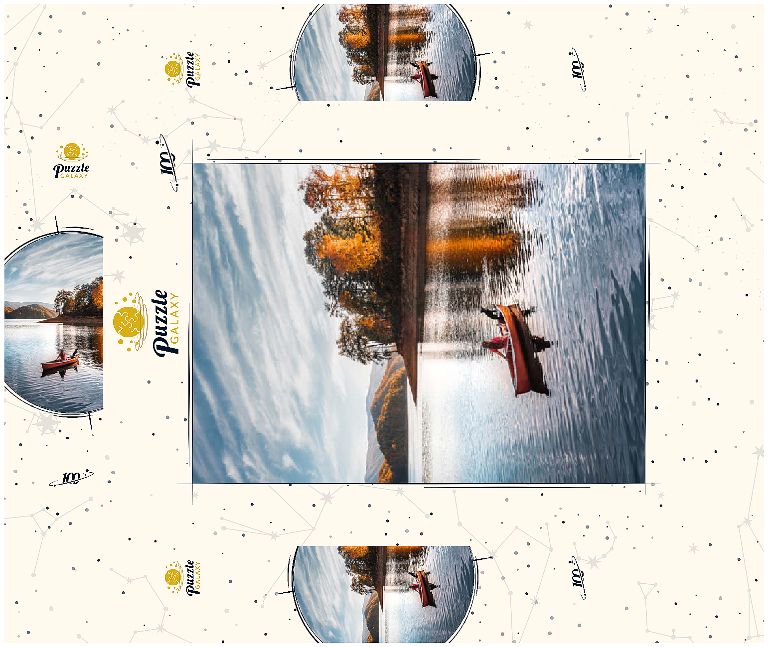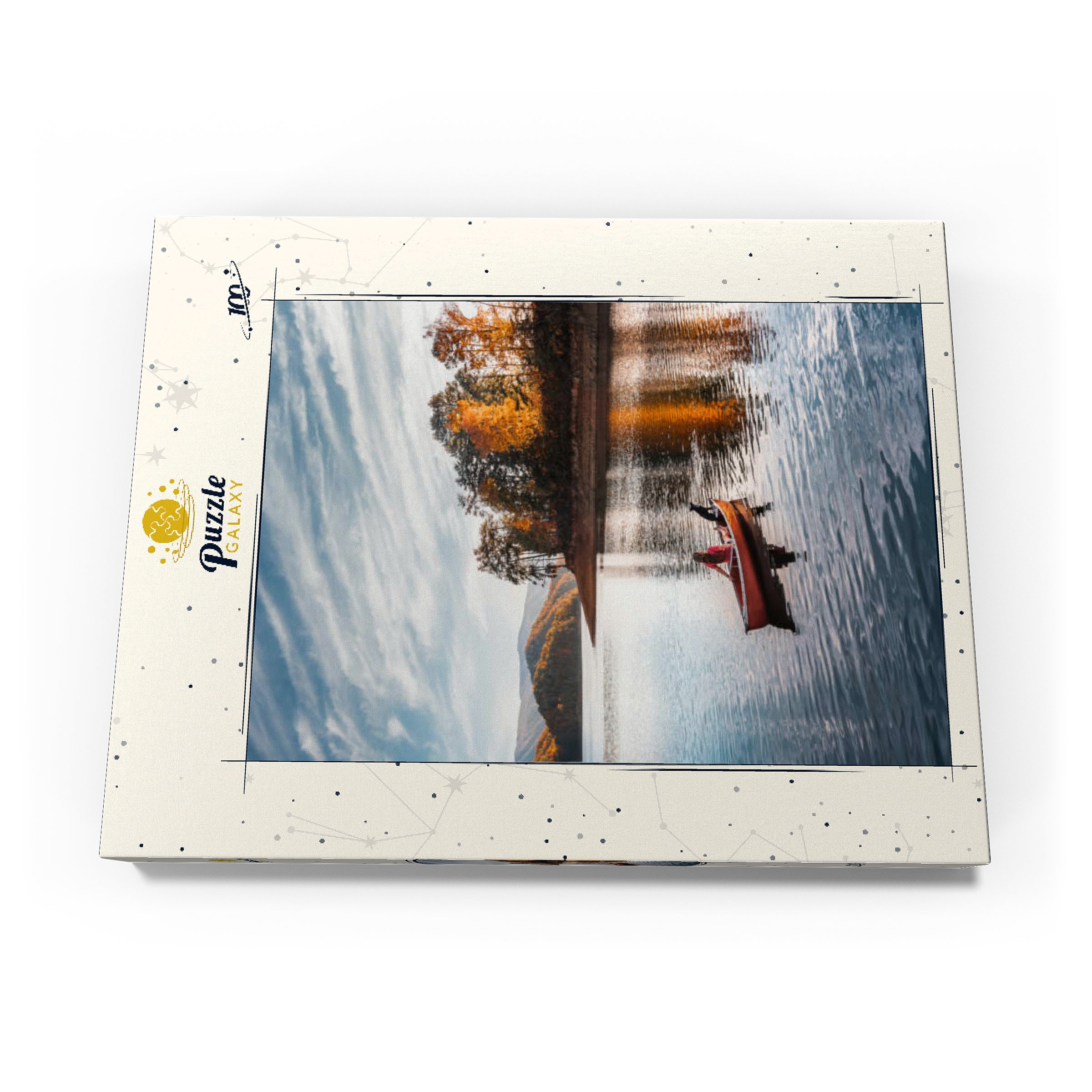 Diese heitere Szene zeigt ein einsames Kanu, das über einen ruhigen See gleitet, umgeben von den leuchtenden Farben des Herbstes. Eine Person und ihr Hund genießen die friedliche Umgebung, während sich die warmen Farben des orangefarbenen und gelben Laubes auf dem Wasser spiegeln. Der klare blaue Himmel und das sanfte Plätschern des Wassers unterstreichen die ruhige Atmosphäre und schaffen einen perfekten Moment der Harmonie mit der Natur.