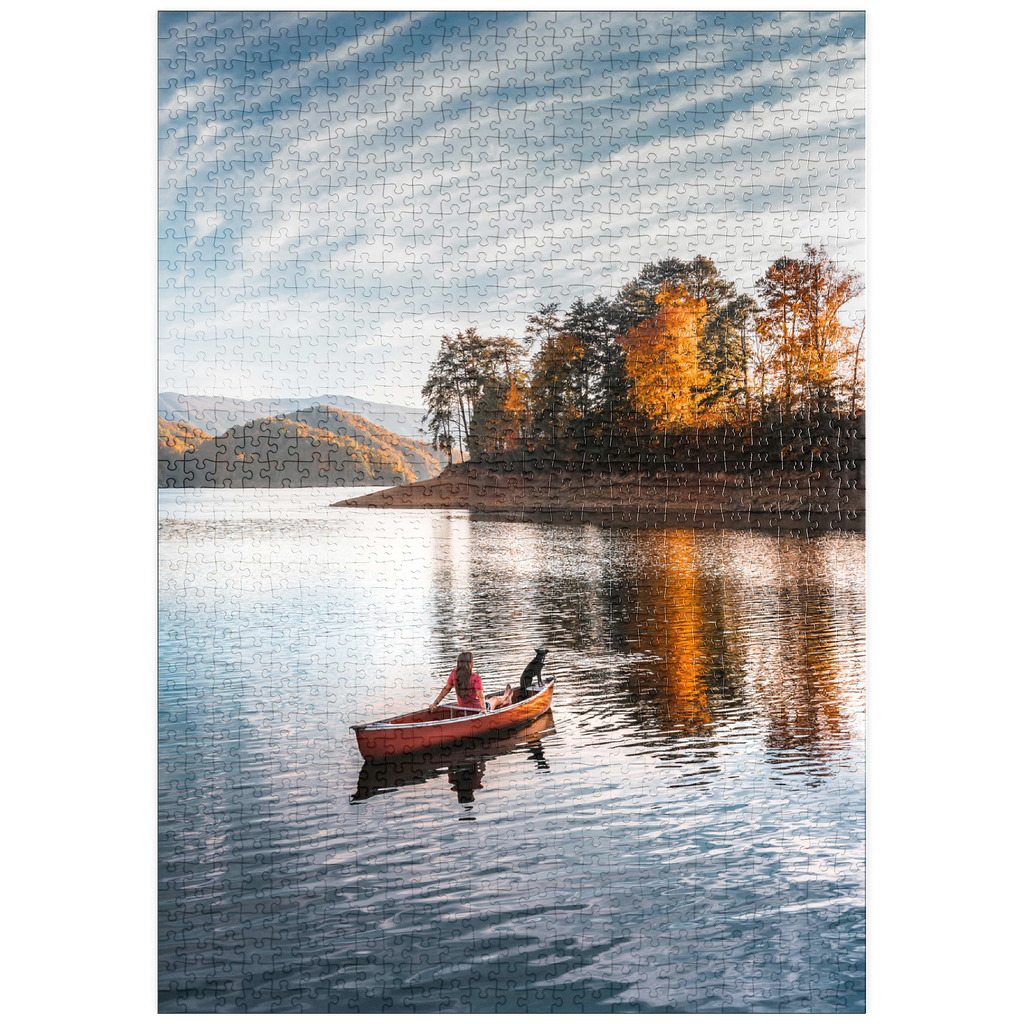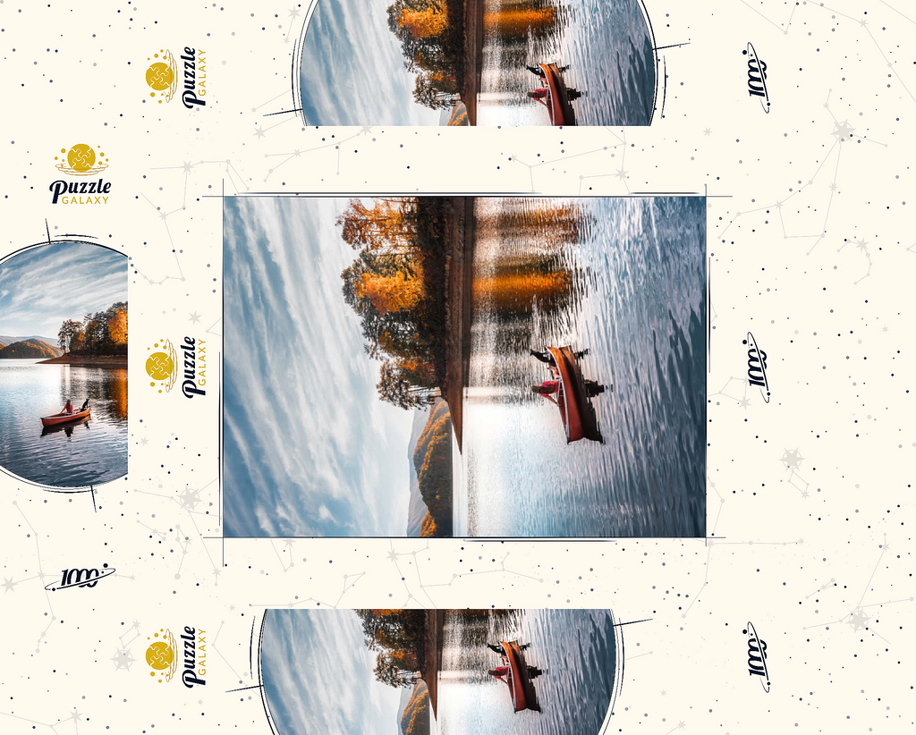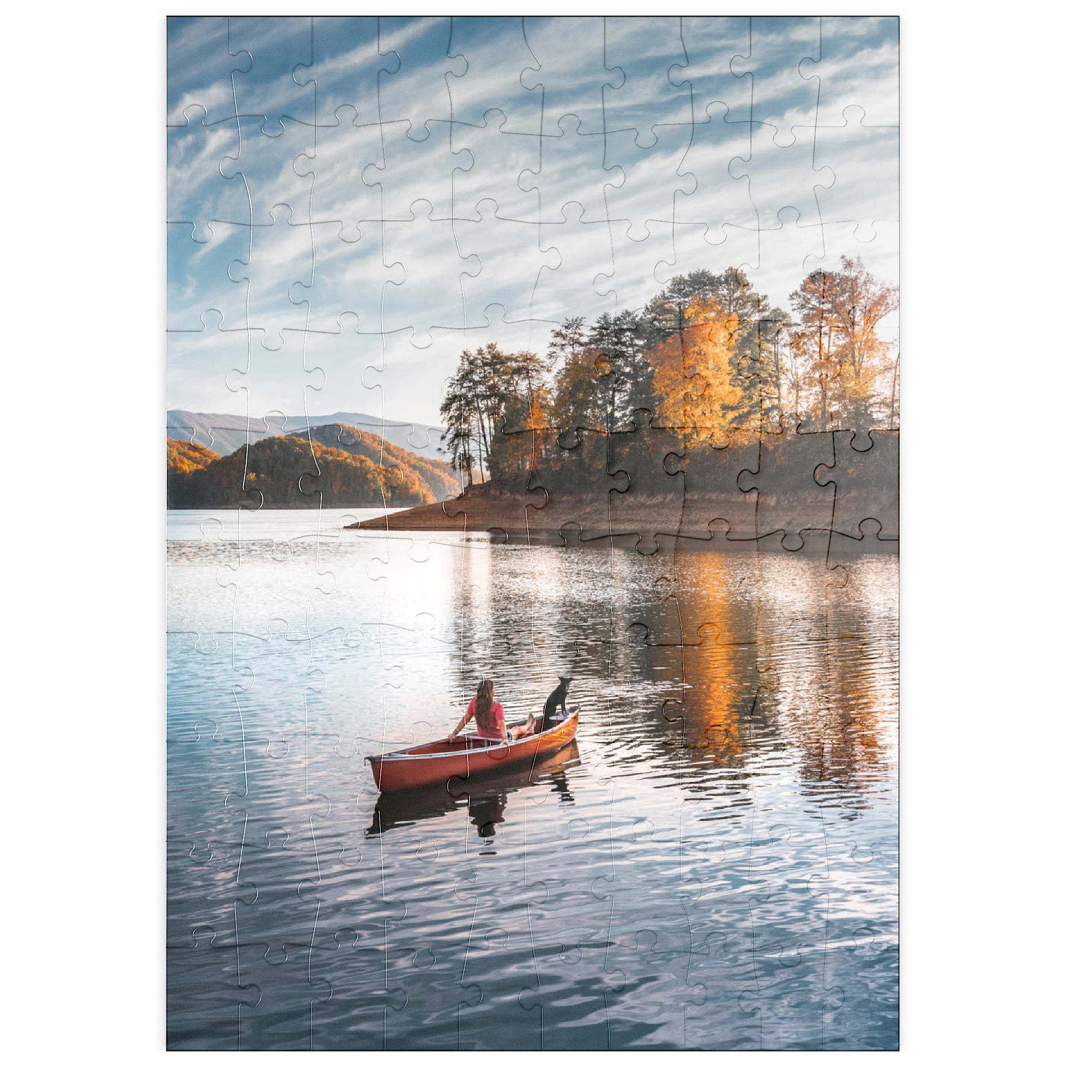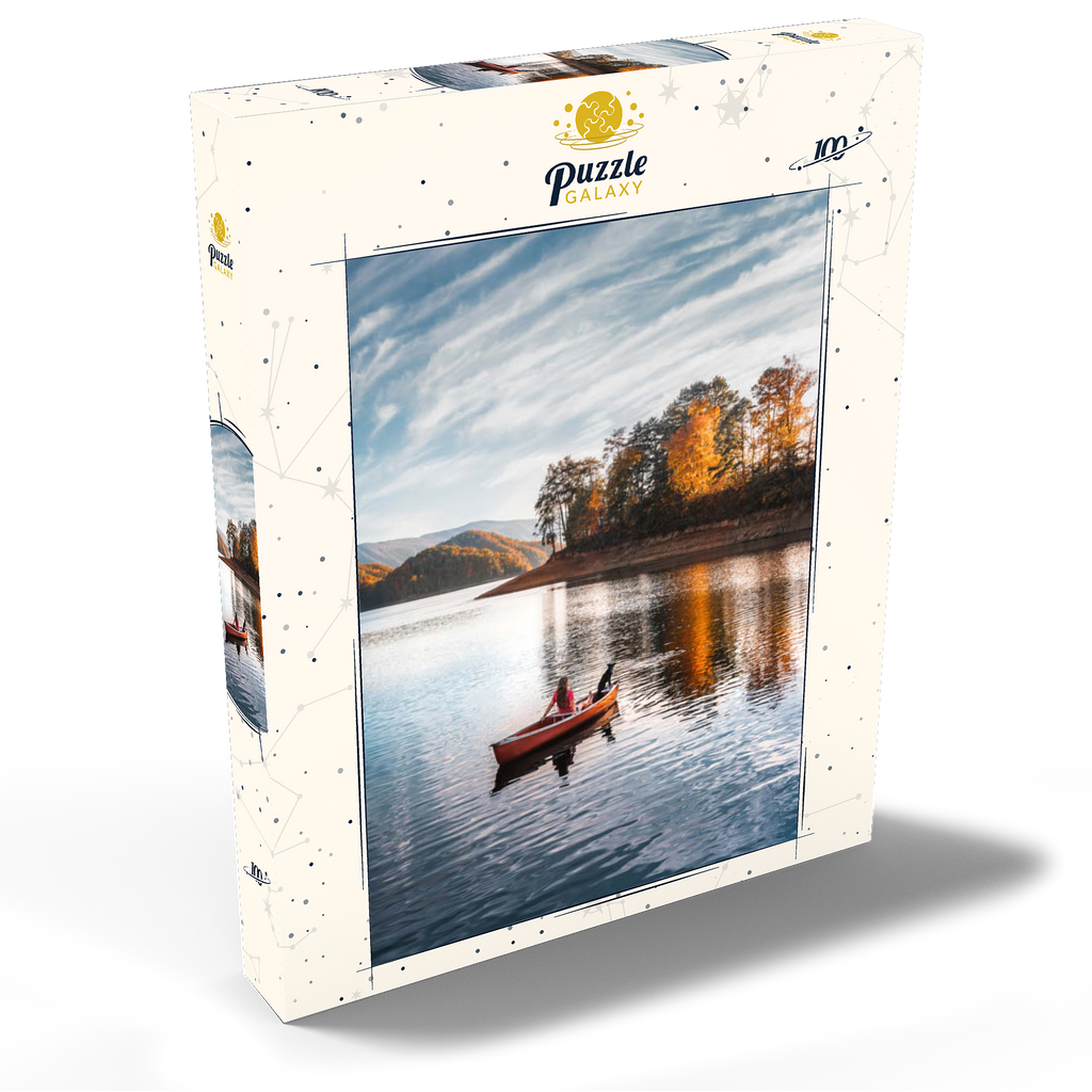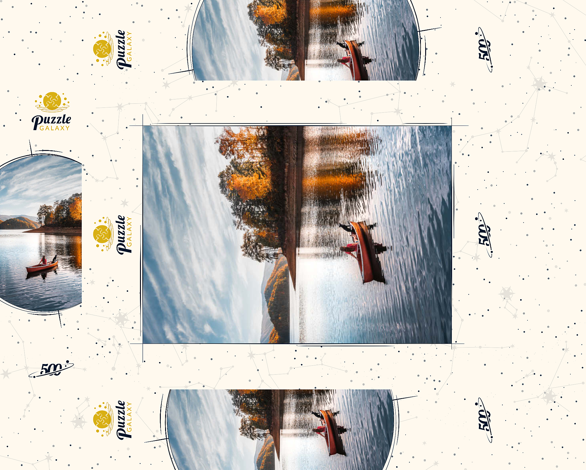 Diese heitere Szene zeigt ein einsames Kanu, das über einen ruhigen See gleitet, umgeben von den leuchtenden Farben des Herbstes. Eine Person und ihr Hund genießen die friedliche Umgebung, während sich die warmen Farben des orangefarbenen und gelben Laubes auf dem Wasser spiegeln. Der klare blaue Himmel und das sanfte Plätschern des Wassers unterstreichen die ruhige Atmosphäre und schaffen einen perfekten Moment der Harmonie mit der Natur.