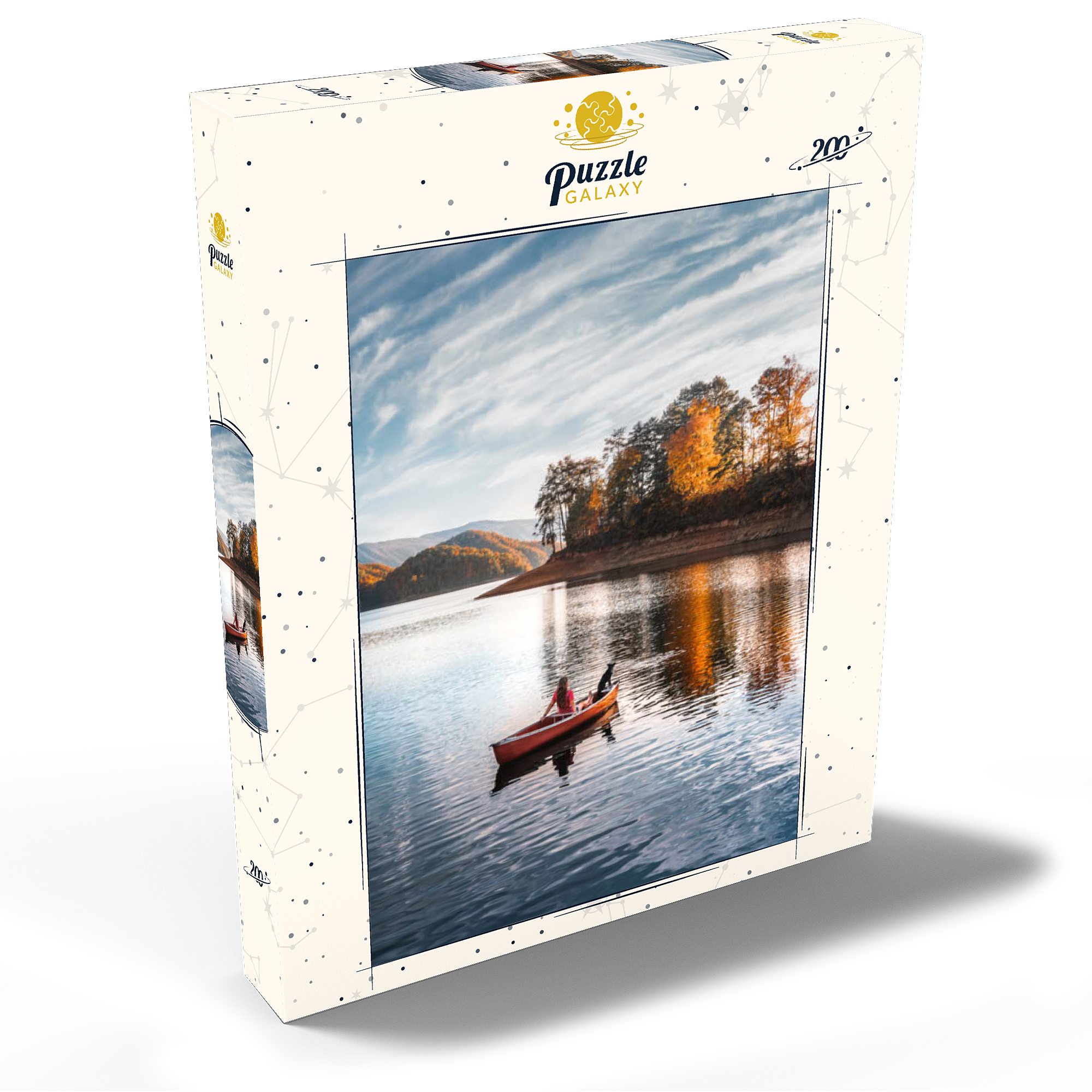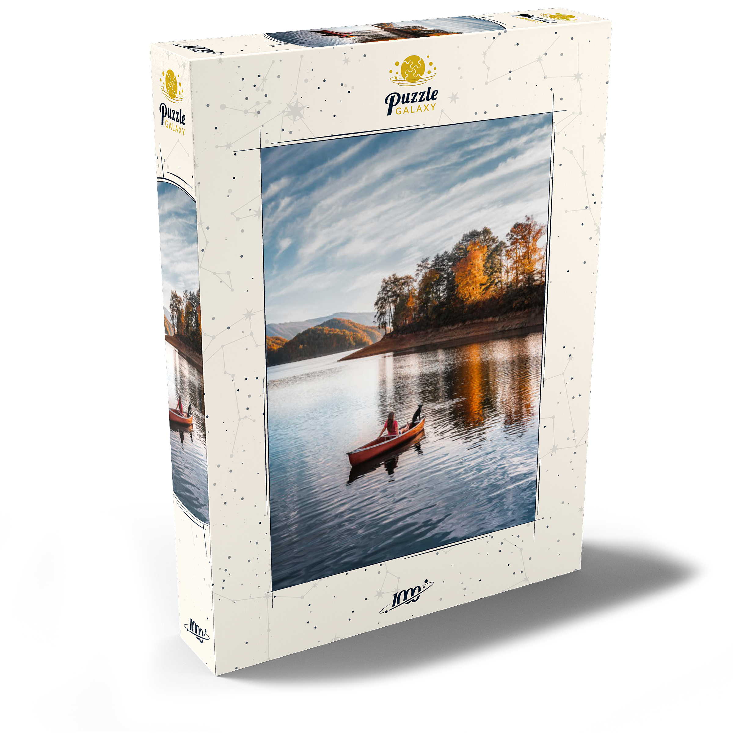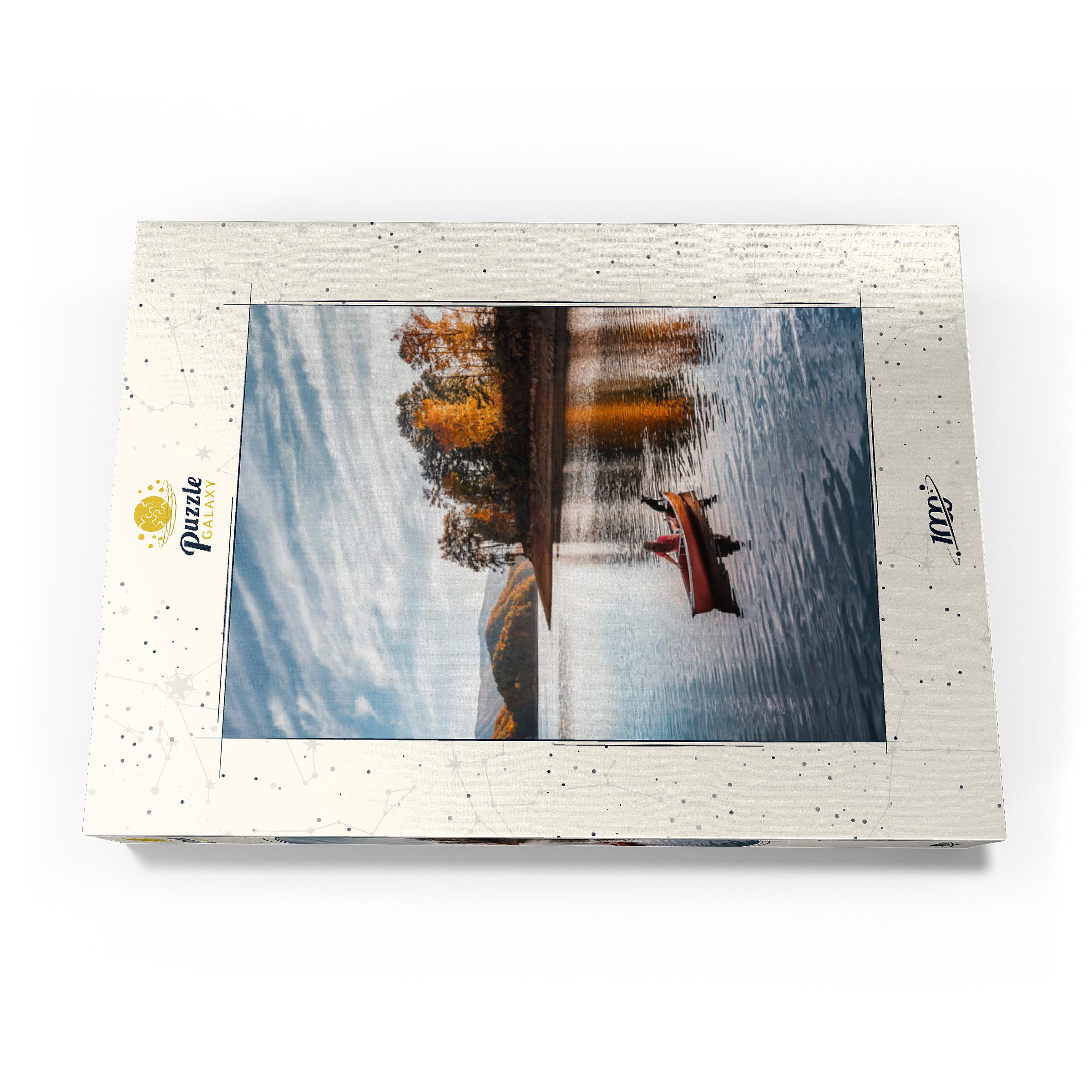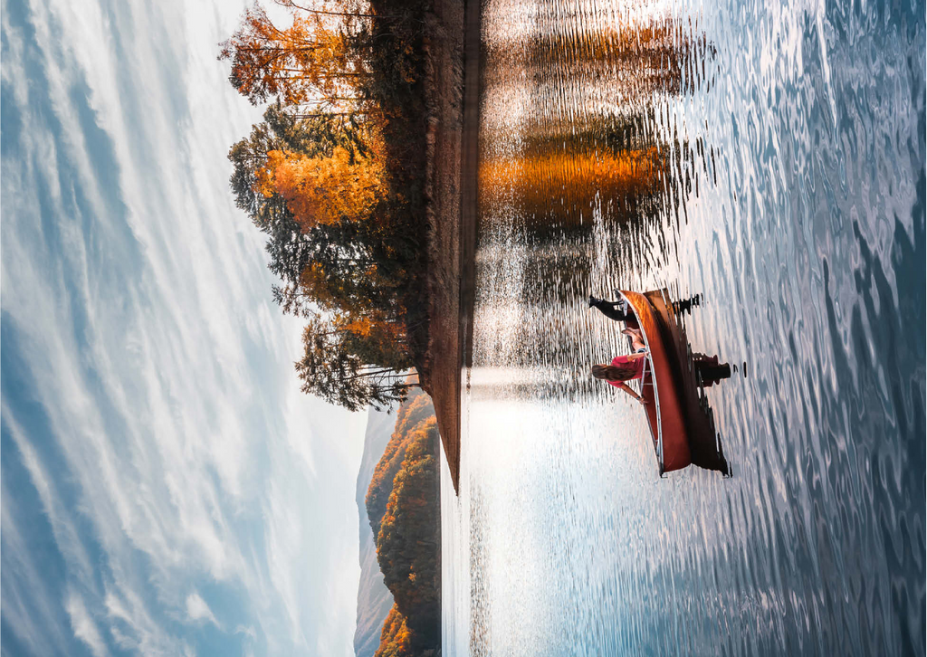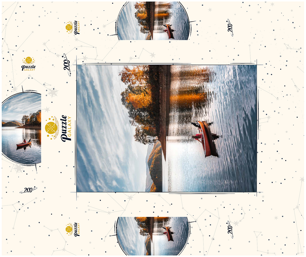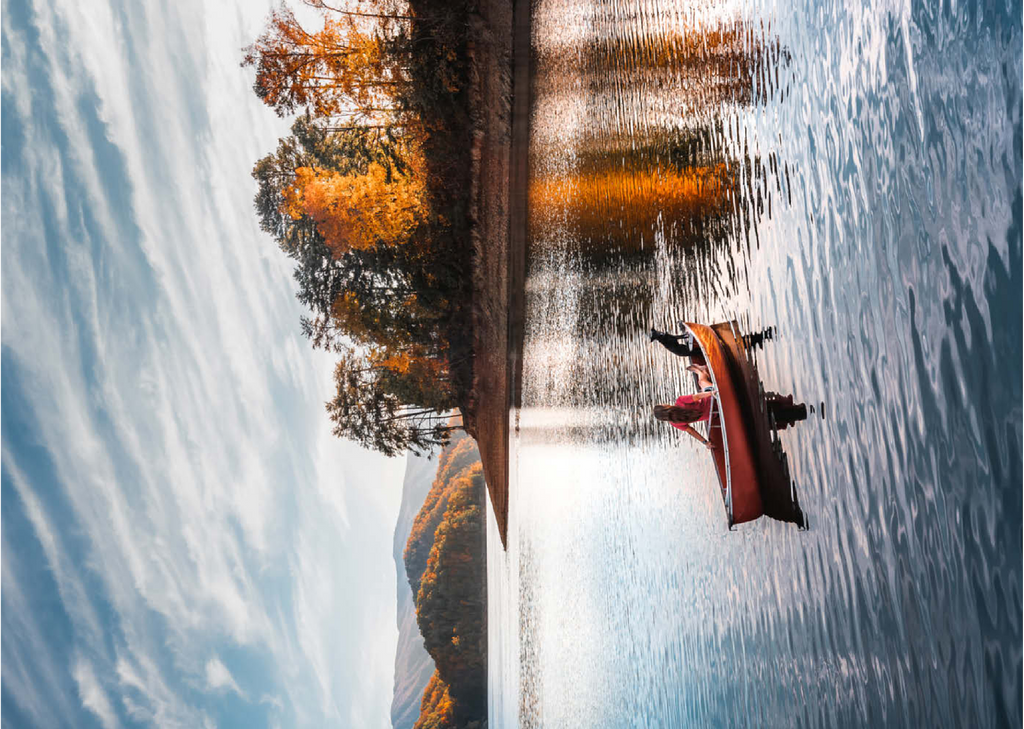 Diese heitere Szene zeigt ein einsames Kanu, das über einen ruhigen See gleitet, umgeben von den leuchtenden Farben des Herbstes. Eine Person und ihr Hund genießen die friedliche Umgebung, während sich die warmen Farben des orangefarbenen und gelben Laubes auf dem Wasser spiegeln. Der klare blaue Himmel und das sanfte Plätschern des Wassers unterstreichen die ruhige Atmosphäre und schaffen einen perfekten Moment der Harmonie mit der Natur.
