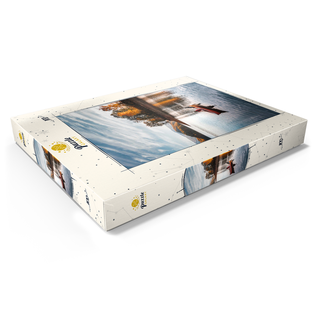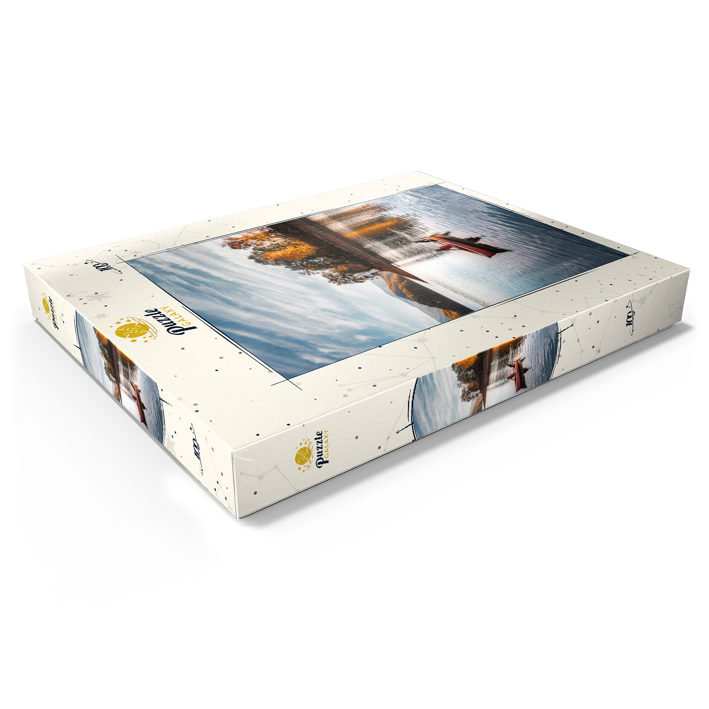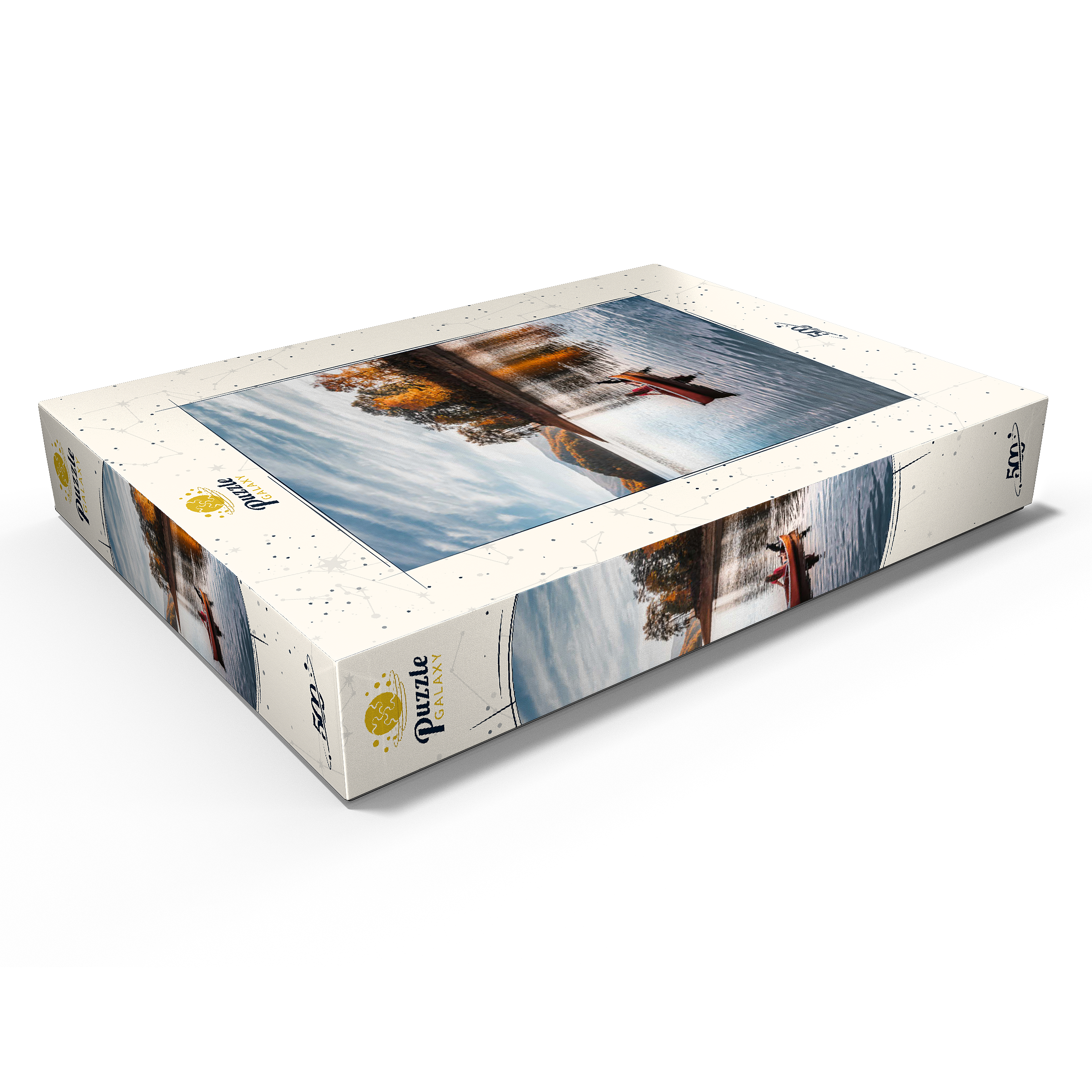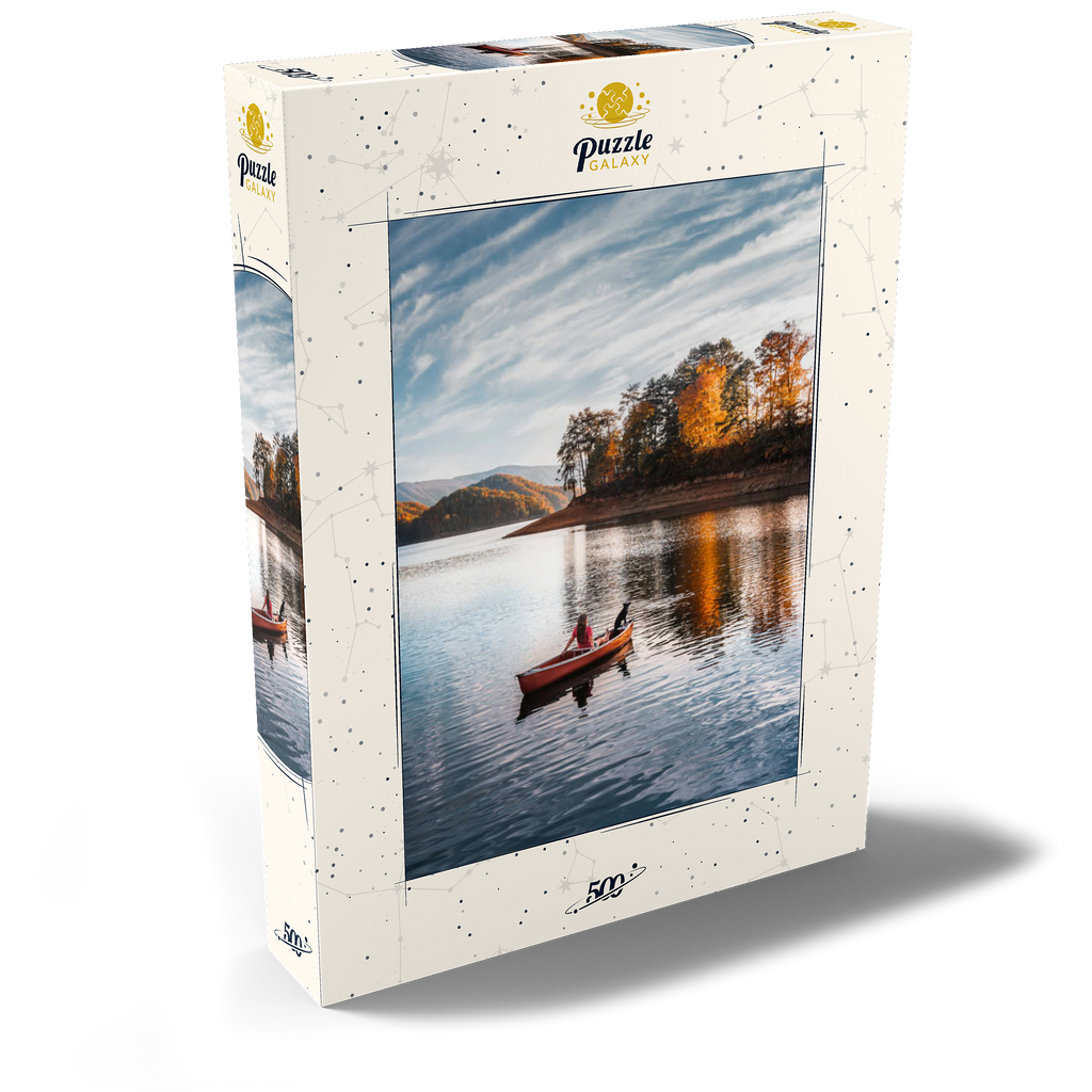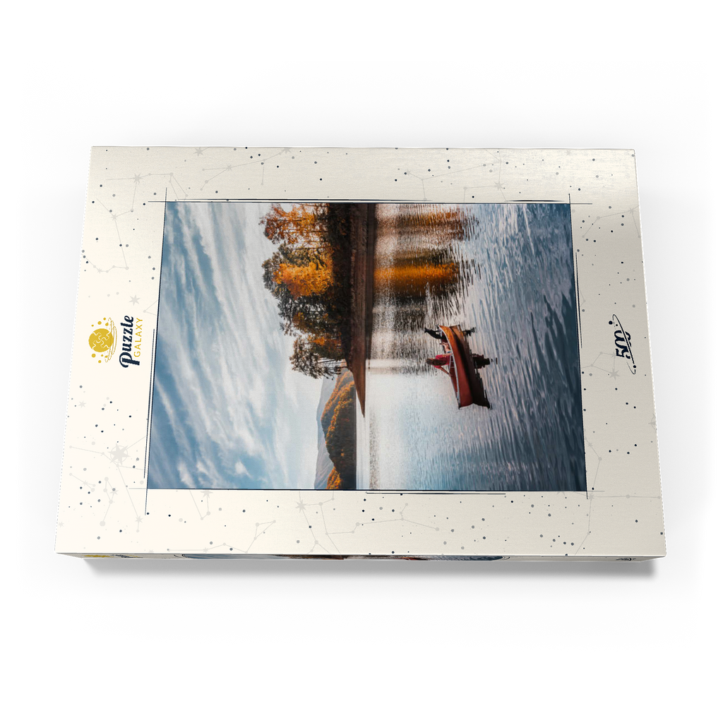 Diese heitere Szene zeigt ein einsames Kanu, das über einen ruhigen See gleitet, umgeben von den leuchtenden Farben des Herbstes. Eine Person und ihr Hund genießen die friedliche Umgebung, während sich die warmen Farben des orangefarbenen und gelben Laubes auf dem Wasser spiegeln. Der klare blaue Himmel und das sanfte Plätschern des Wassers unterstreichen die ruhige Atmosphäre und schaffen einen perfekten Moment der Harmonie mit der Natur.