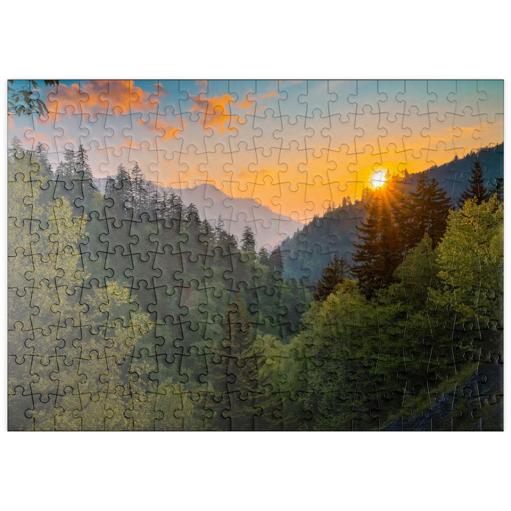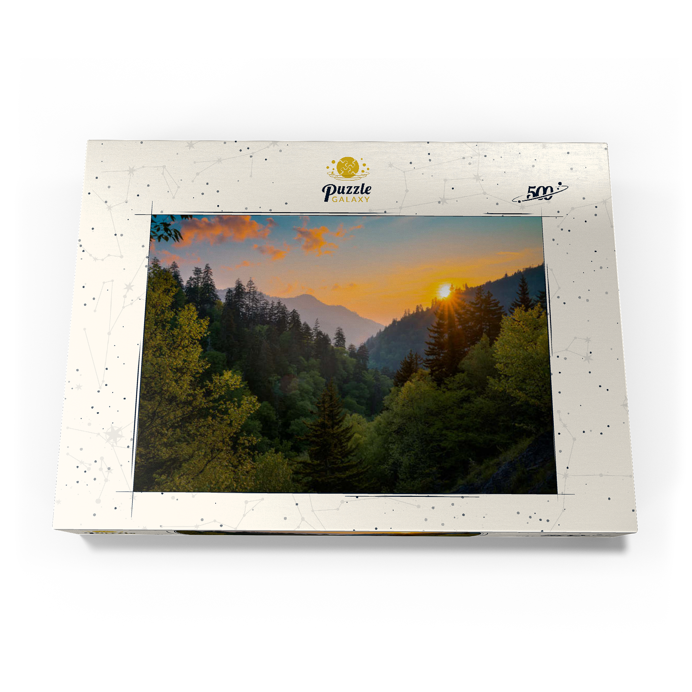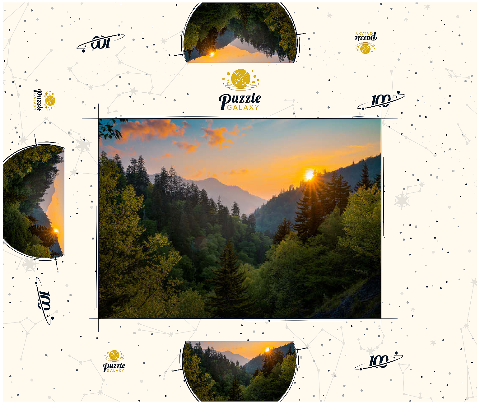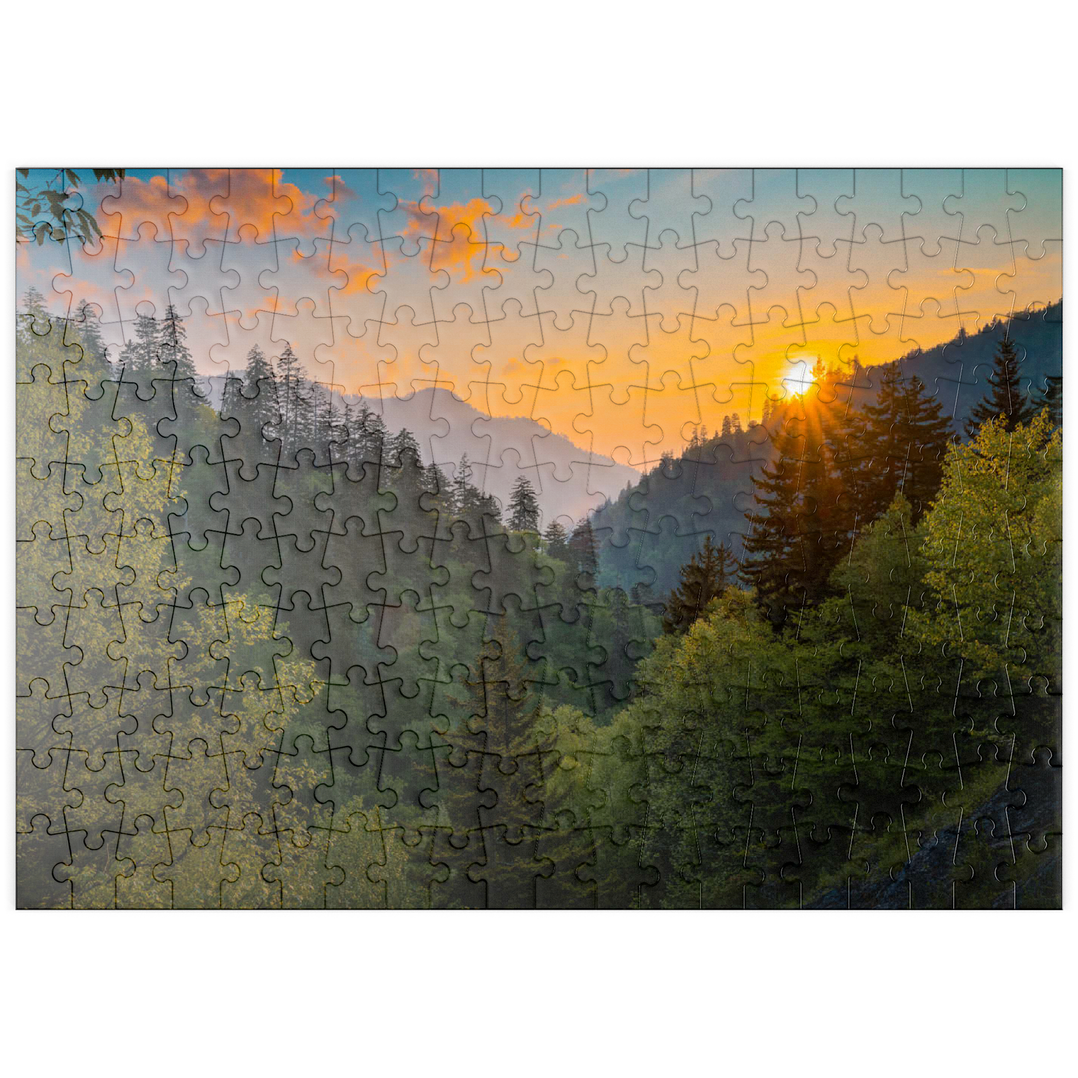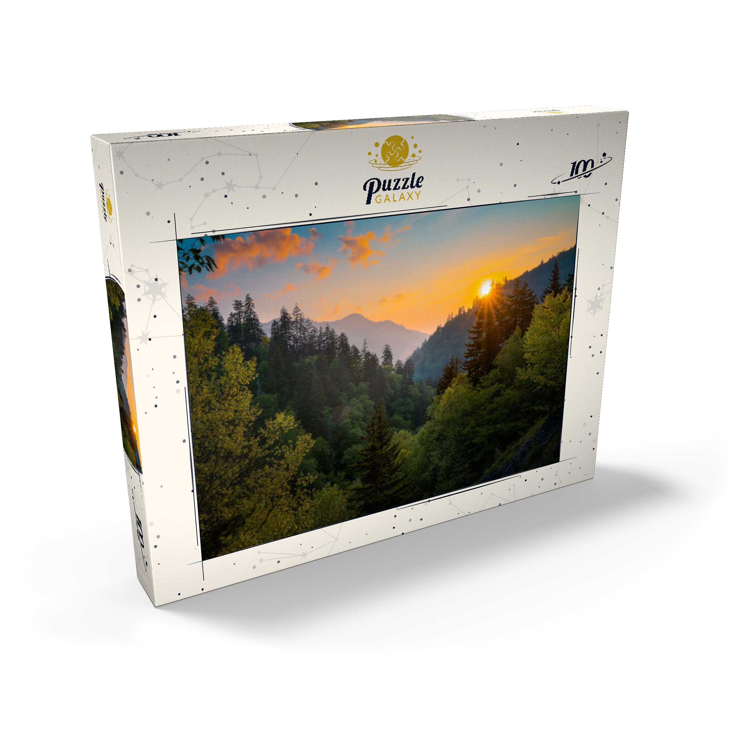 Diese atemberaubende Landschaft zeigt das warme Licht des Sonnenaufgangs, das ein üppig bewaldetes Tal mit immergrünen Bäumen beleuchtet, die sich bis zu den nebligen Berggipfeln erstrecken. Die leuchtenden Orange-, Rosa- und Goldtöne gehen nahtlos in das heitere Grün über und schaffen eine ruhige Atmosphäre. Das sanfte Sonnenlicht dringt durch die Bäume und unterstreicht die Schönheit der Natur und die friedliche Majestät eines Bergmorgens.