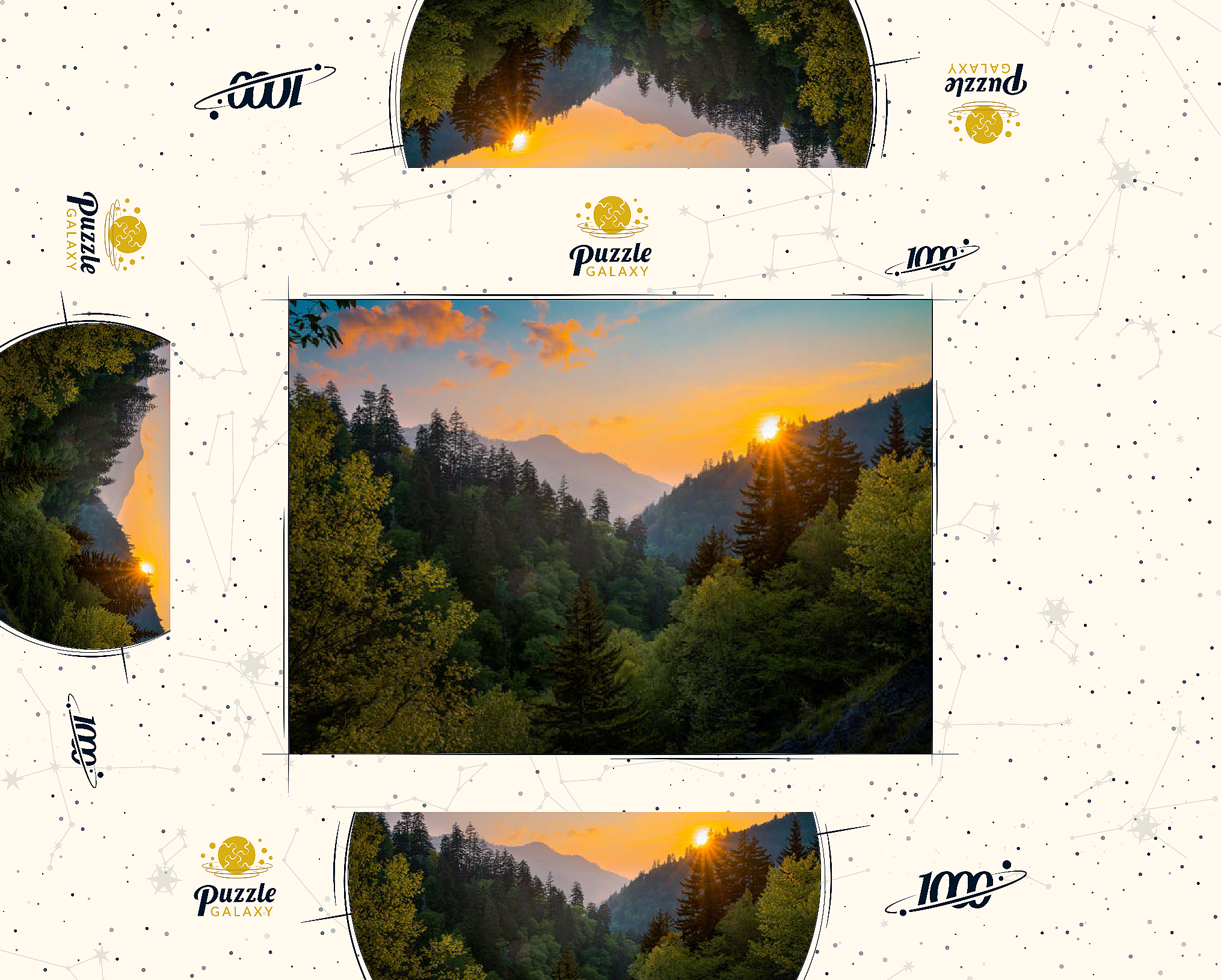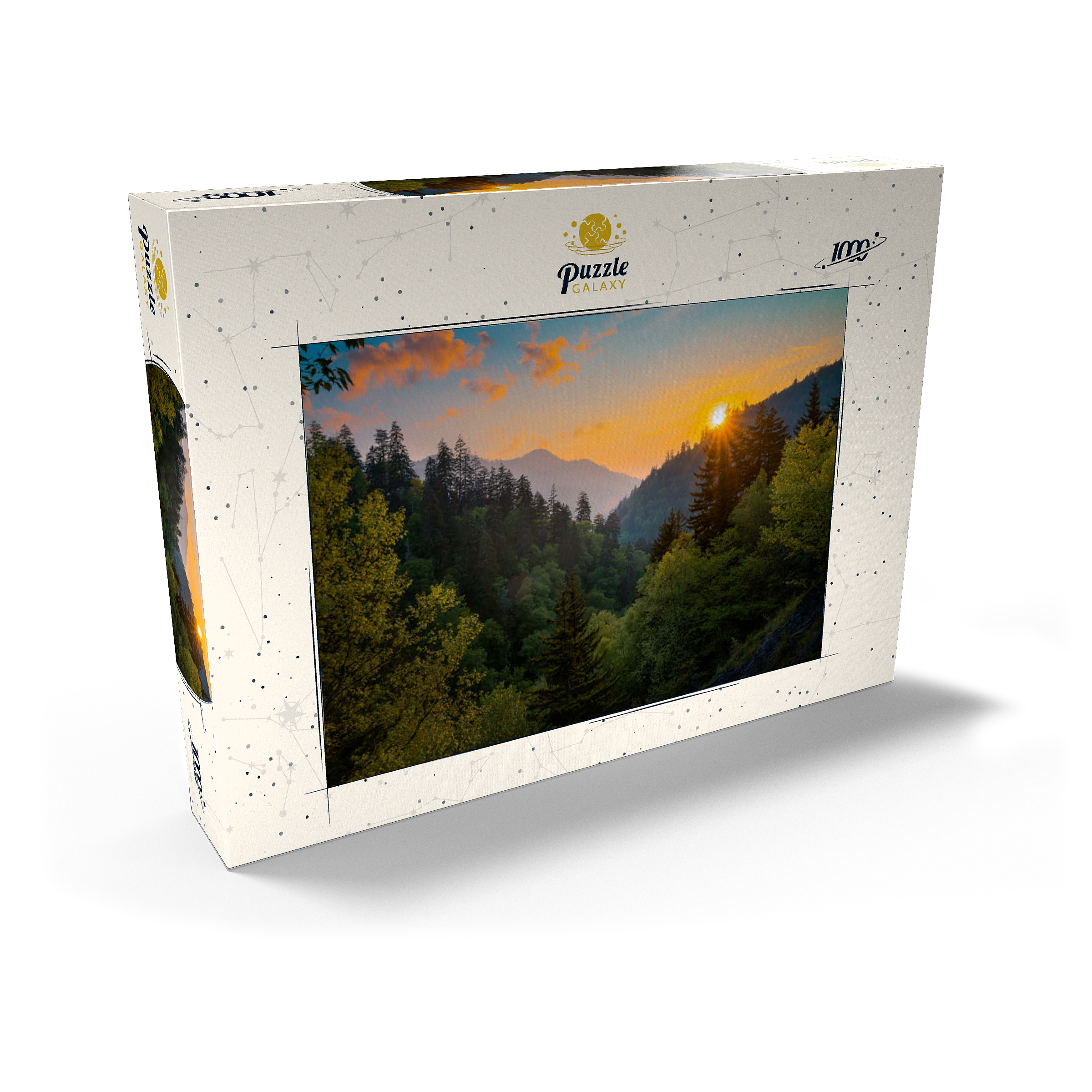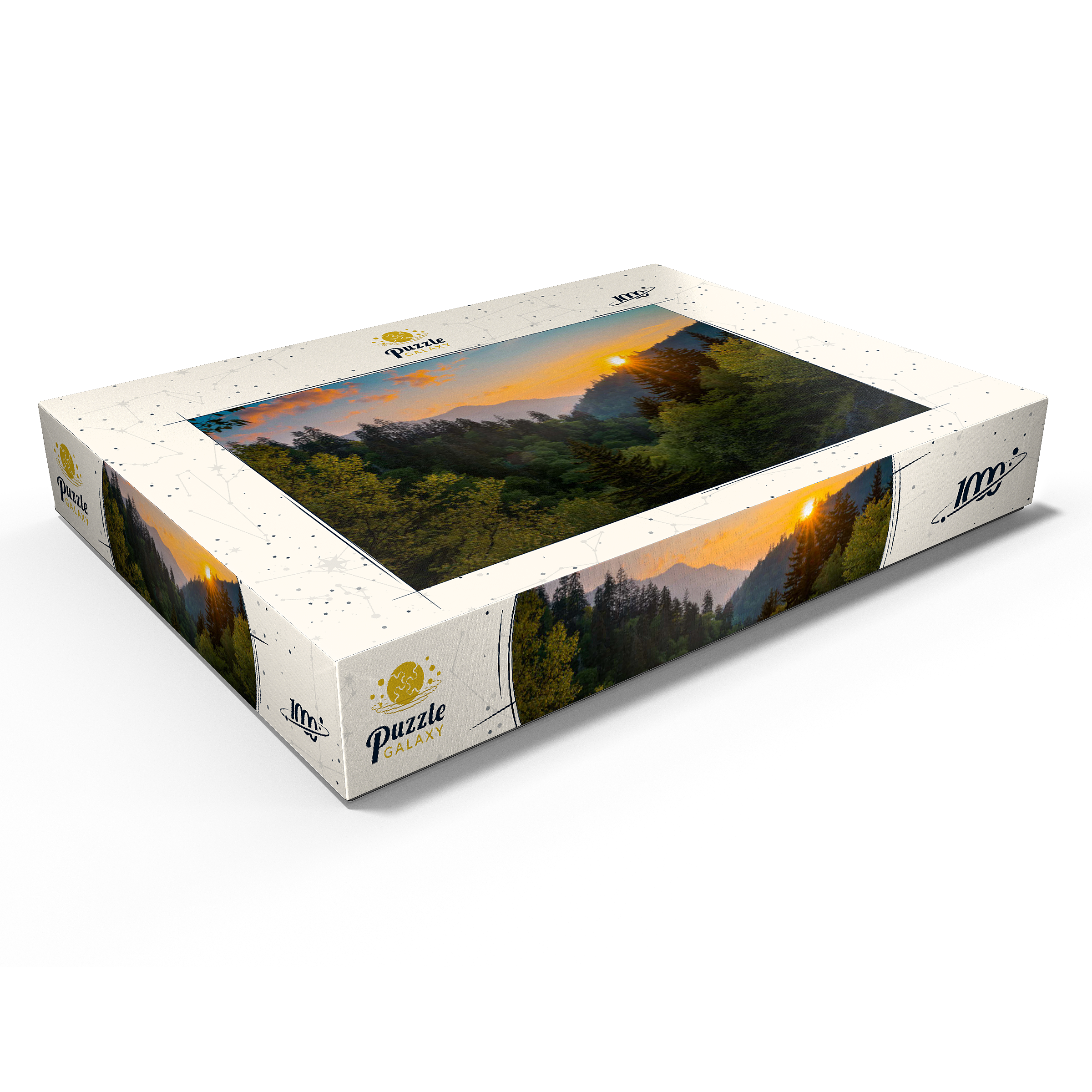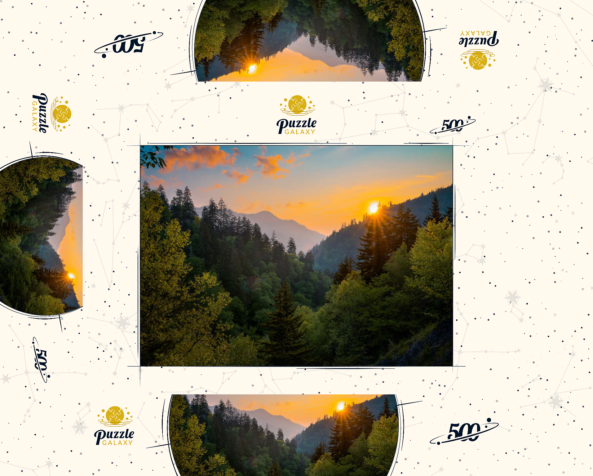 Diese atemberaubende Landschaft zeigt das warme Licht des Sonnenaufgangs, das ein üppig bewaldetes Tal mit immergrünen Bäumen beleuchtet, die sich bis zu den nebligen Berggipfeln erstrecken. Die leuchtenden Orange-, Rosa- und Goldtöne gehen nahtlos in das heitere Grün über und schaffen eine ruhige Atmosphäre. Das sanfte Sonnenlicht dringt durch die Bäume und unterstreicht die Schönheit der Natur und die friedliche Majestät eines Bergmorgens.