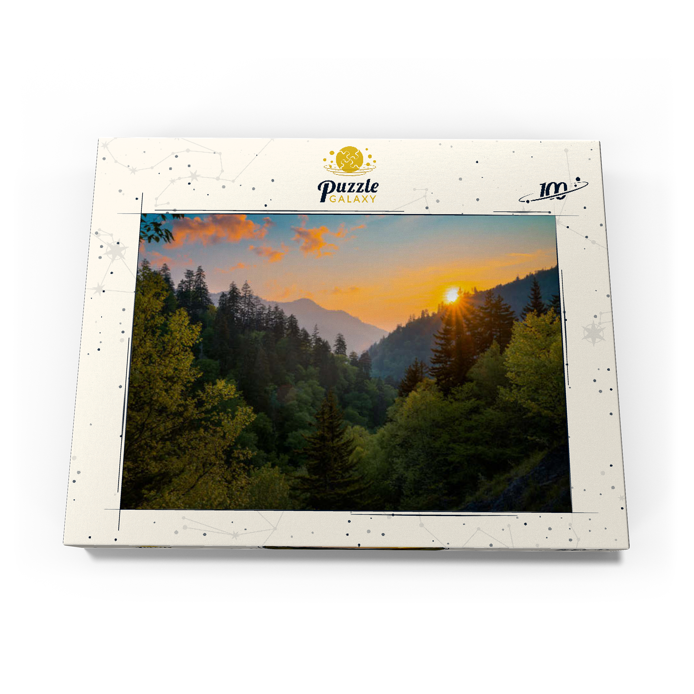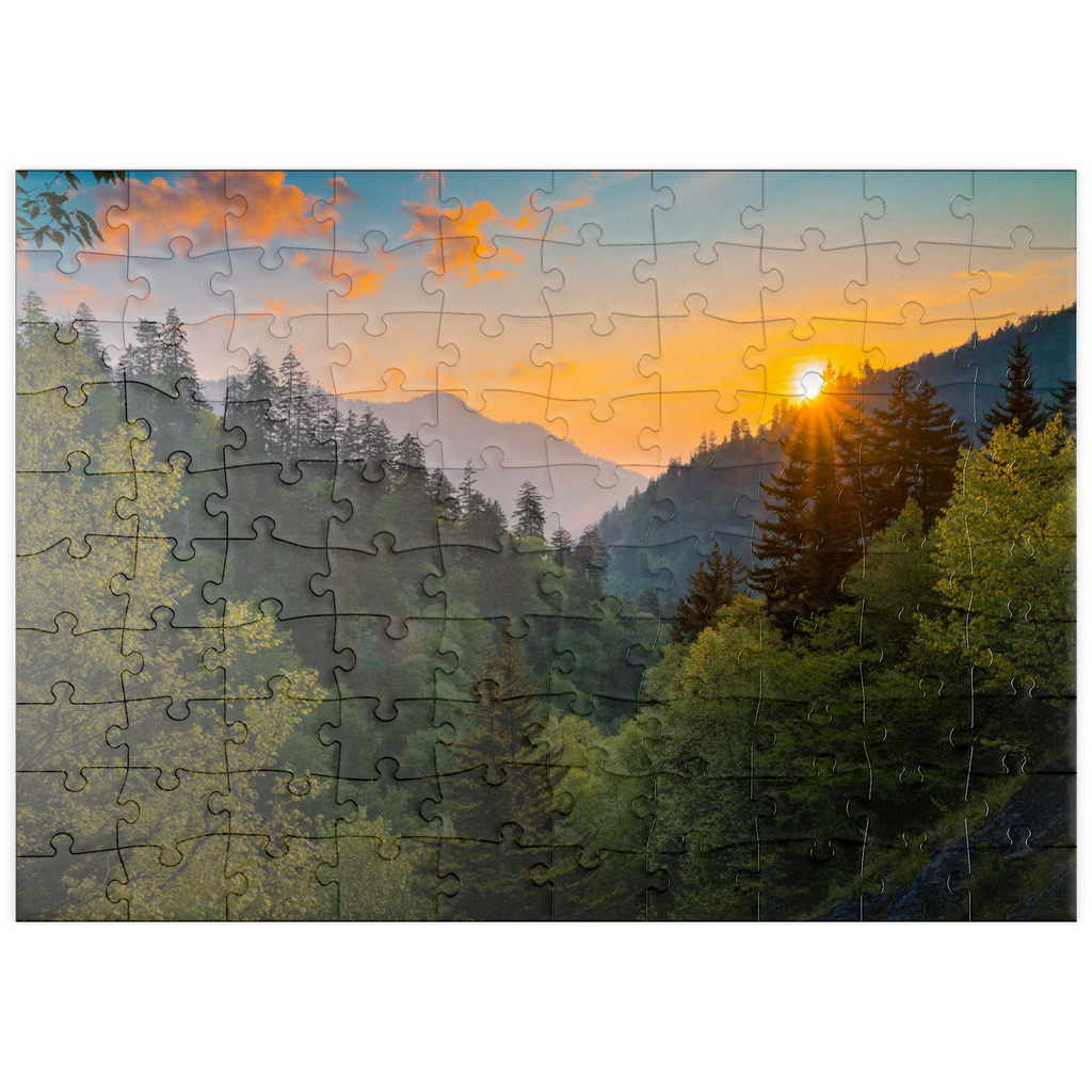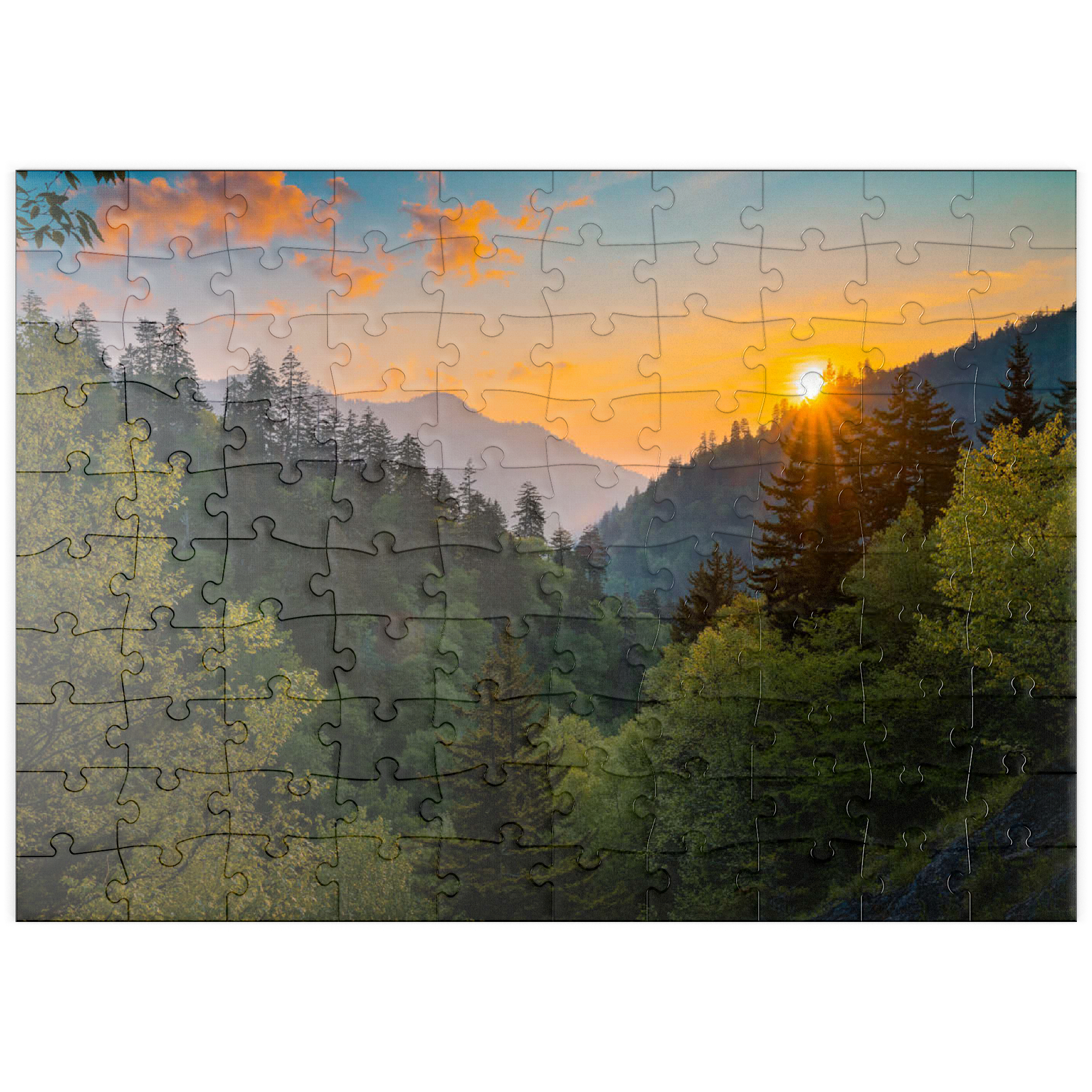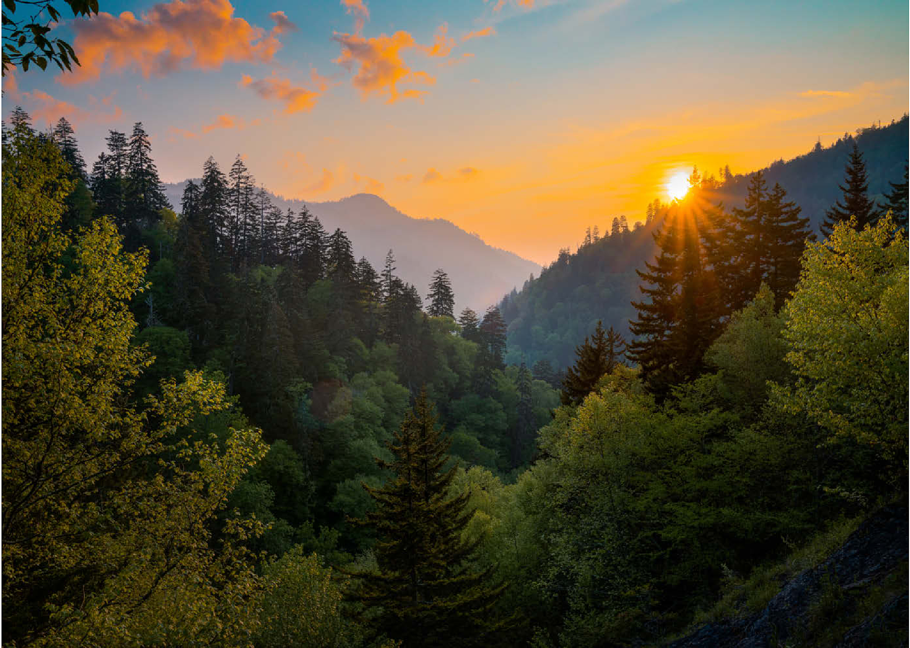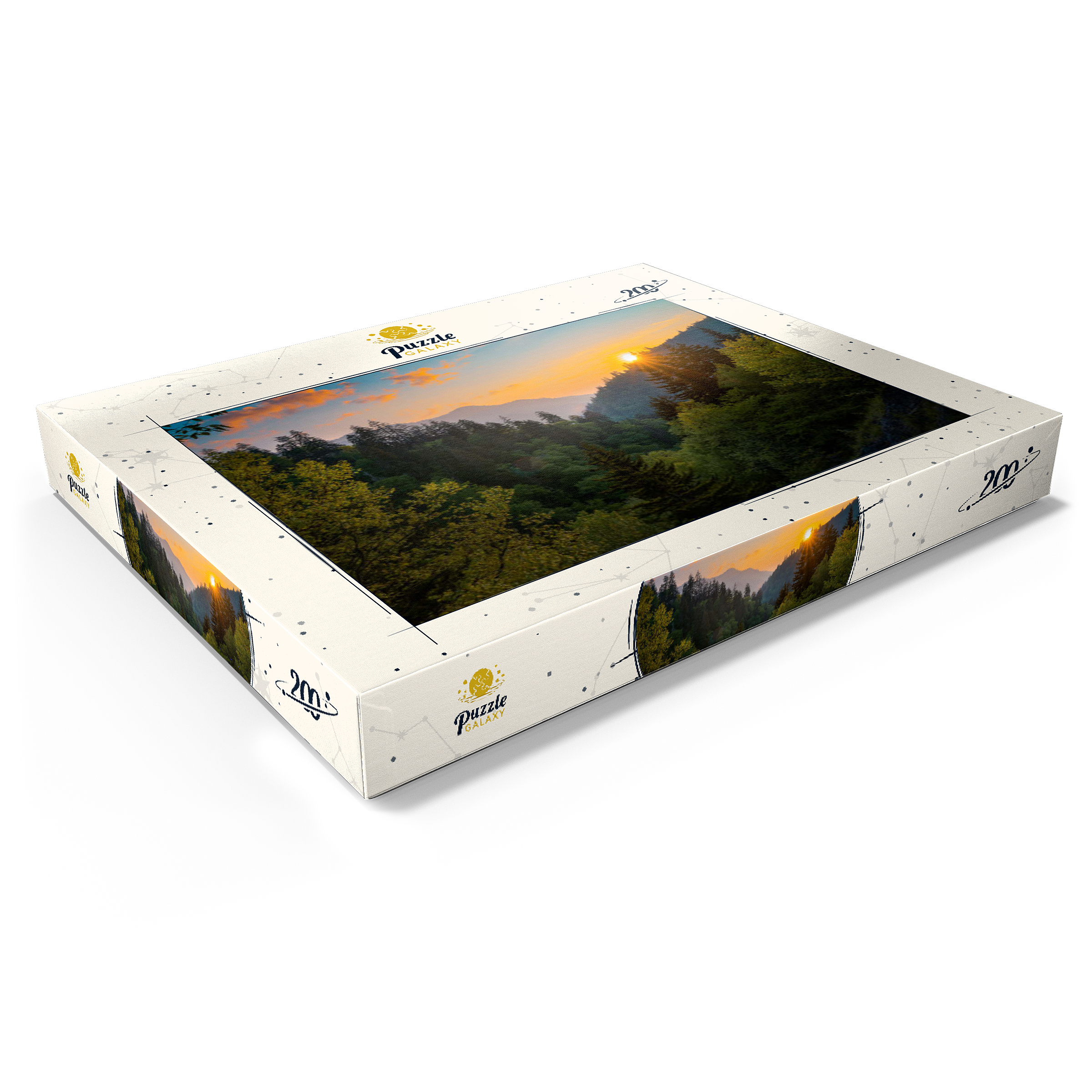 Diese atemberaubende Landschaft zeigt das warme Licht des Sonnenaufgangs, das ein üppig bewaldetes Tal mit immergrünen Bäumen beleuchtet, die sich bis zu den nebligen Berggipfeln erstrecken. Die leuchtenden Orange-, Rosa- und Goldtöne gehen nahtlos in das heitere Grün über und schaffen eine ruhige Atmosphäre. Das sanfte Sonnenlicht dringt durch die Bäume und unterstreicht die Schönheit der Natur und die friedliche Majestät eines Bergmorgens.