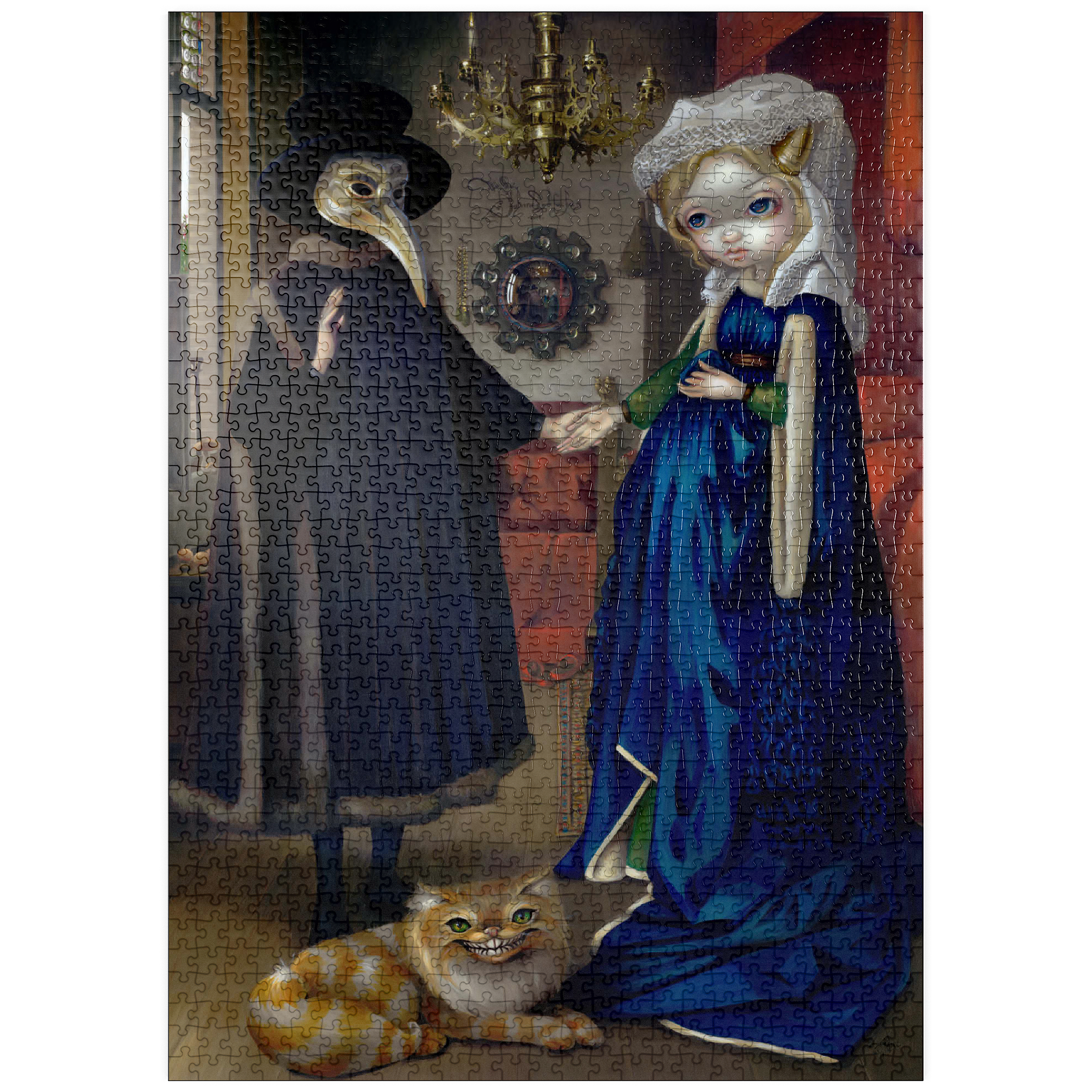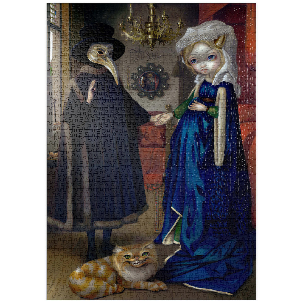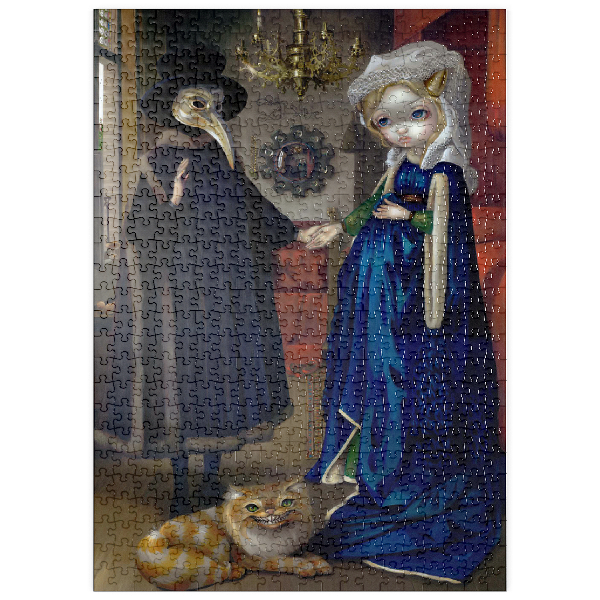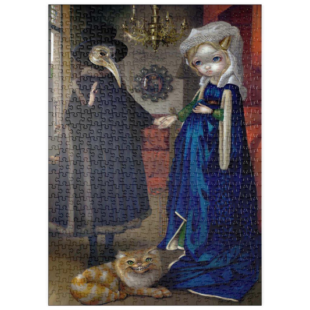 Entdecken Sie die Kunstgeschichte mit Alice in einem Van-Eyck-Porträt, dem sechsten Puzzle aus der Reihe „Alice in Other Lands“! Alice befindet sich direkt in Jan van Eycks berühmtem Gemälde „Das Arnolfini-Porträt“ aus dem Jahr 1434 und spielt die Braut an der Seite ihres „Alchemisten“-Ehemanns. Suchen Sie nach Hinweisen: Alices blaues Kleid, versteckte Pilze und die grinsende Cheshire-Katze, die den ursprünglichen Hund ersetzt. Ein einzigartiges, hochwertiges Puzzle, das Wunderland und Meisterwerke der Renaissance miteinander verbindet. Ein Muss für Fans von Kunstgeschichte und Fantasy!