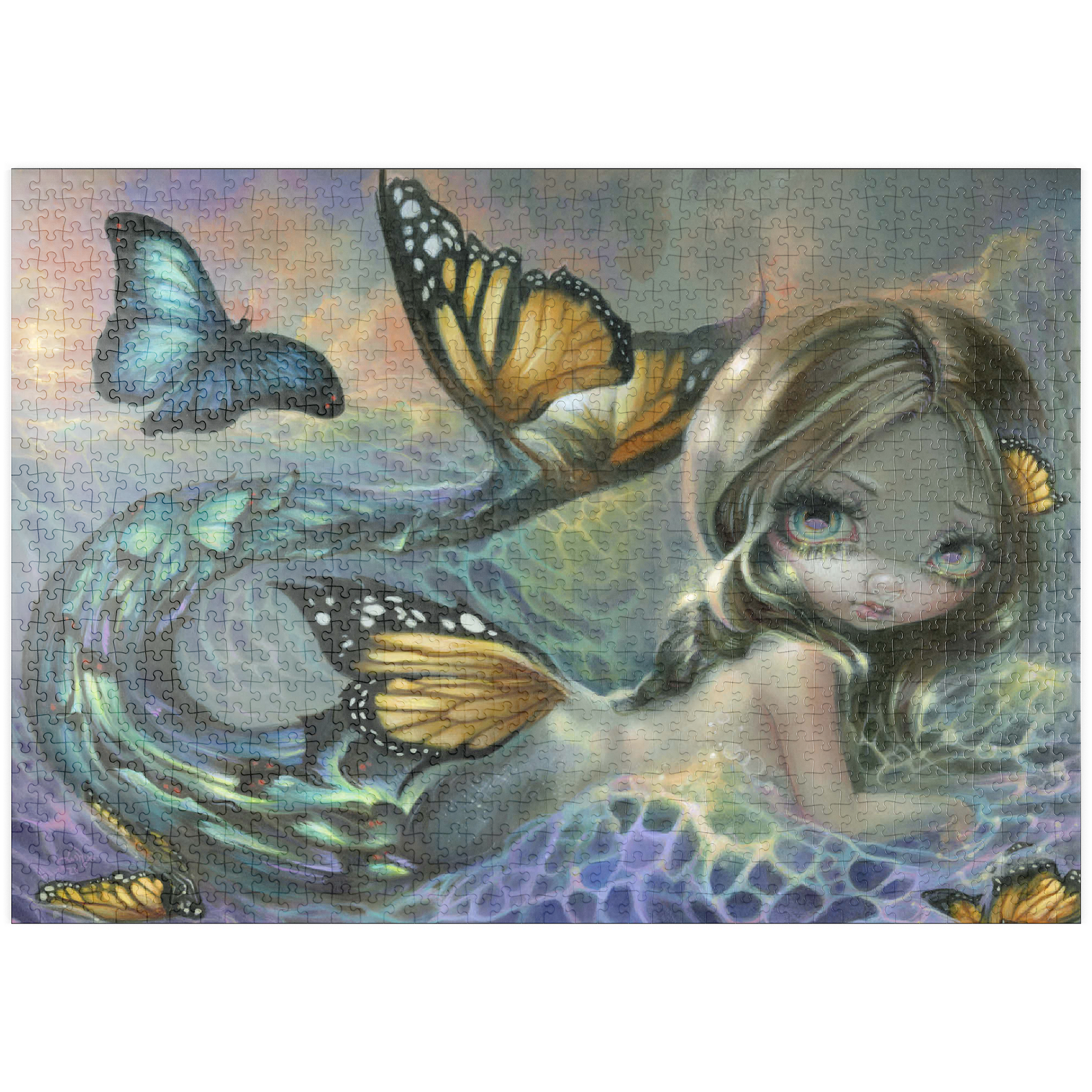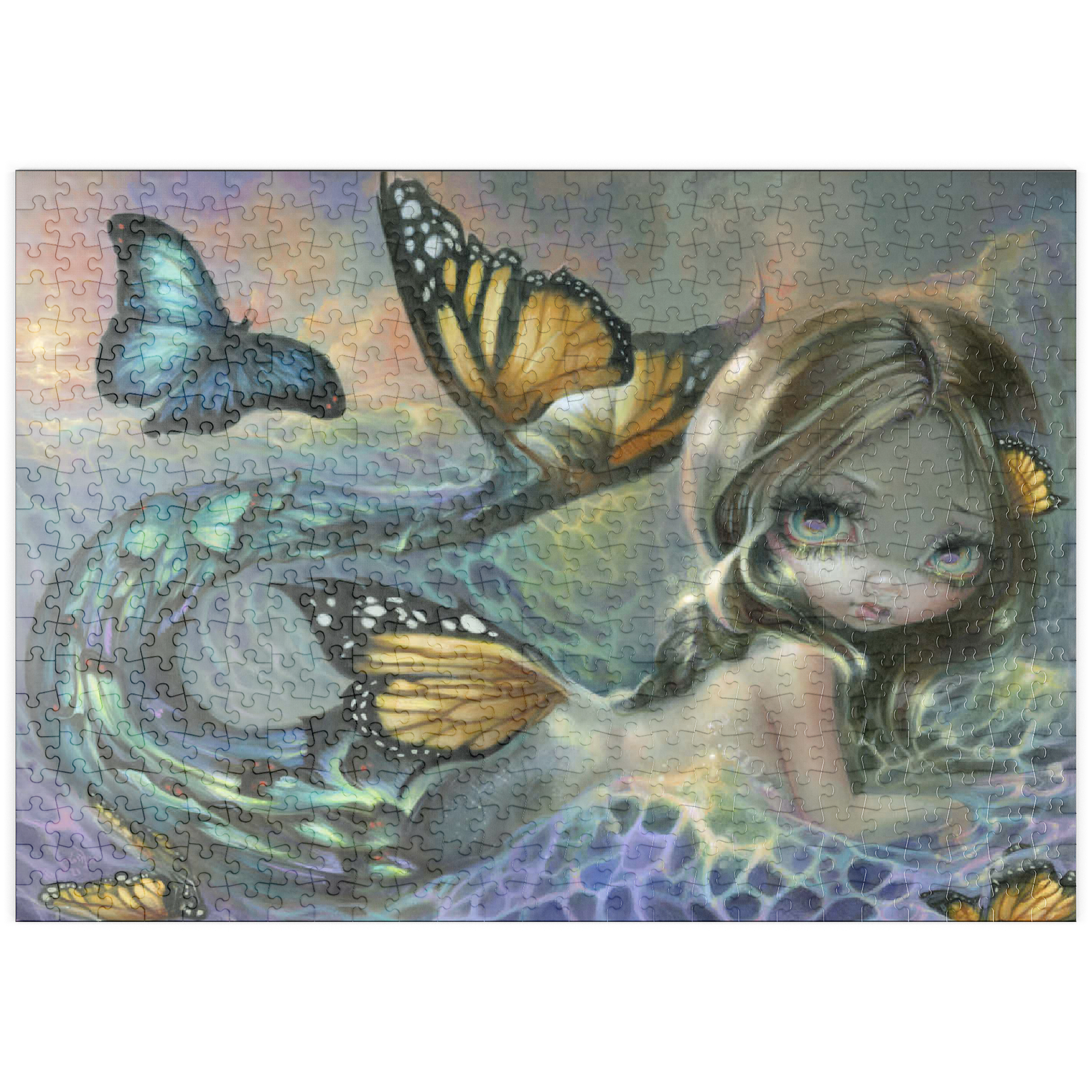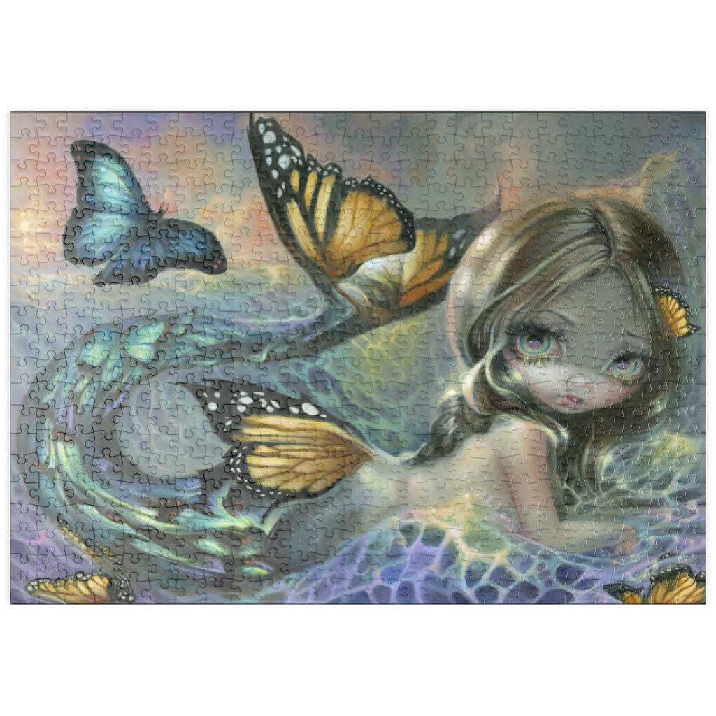 Tauchen Sie ein in das bezaubernde Puzzle „Sea Monarch“! Setzen Sie eine atemberaubende Meerjungfrau zusammen, deren Schwanz sich in lebhafte Schmetterlinge verwandelt, mit einem triumphierenden blauen Morpho vor einem Sonnenuntergang. Entdecken Sie einen Hauch von Melancholie, wenn ehemalige Schmetterlinge durch die Meereswellen treiben und an die Vergänglichkeit des Lebens erinnern. Setzen Sie diese magische, zum Nachdenken anregende Szene zusammen!