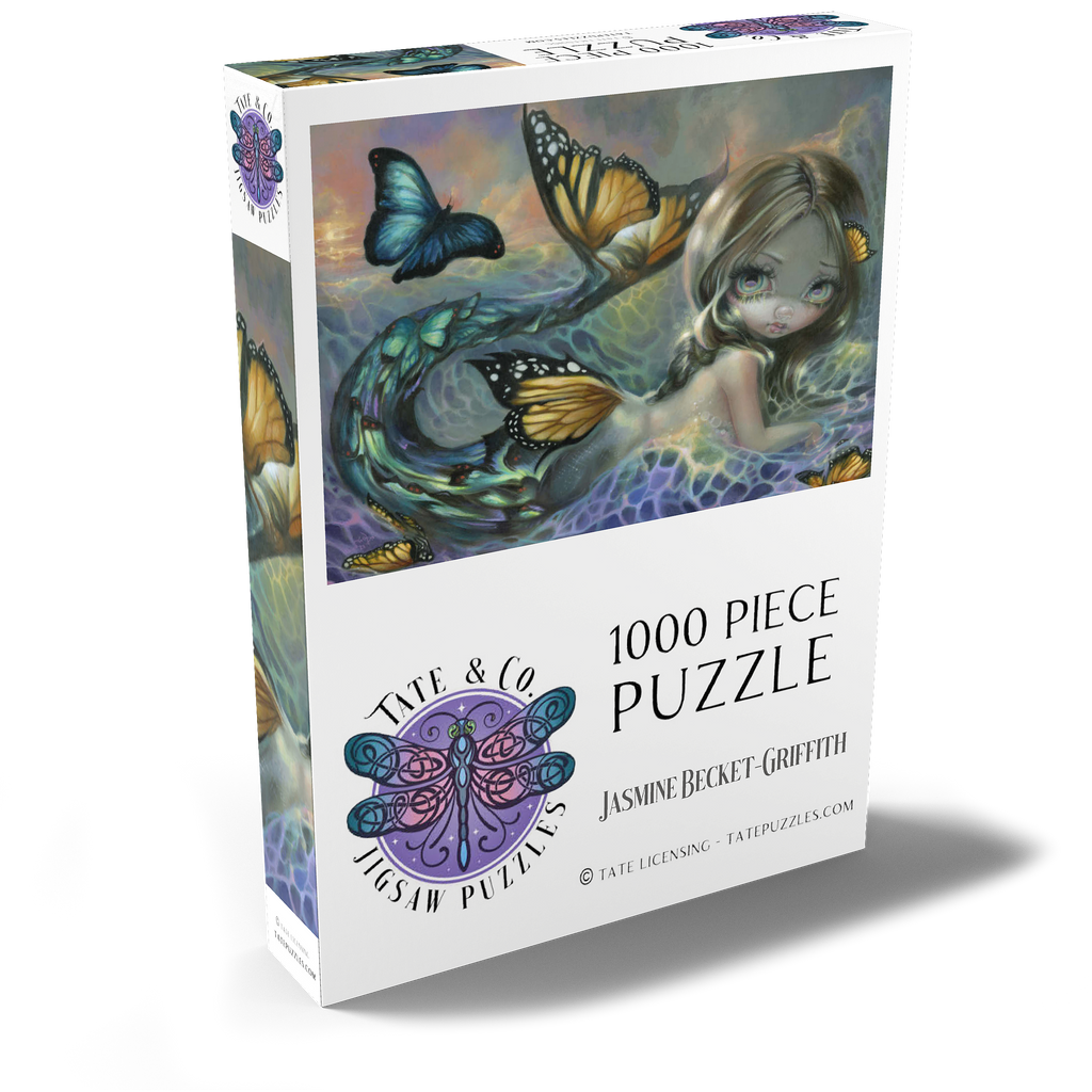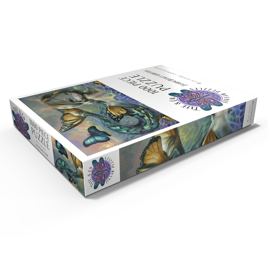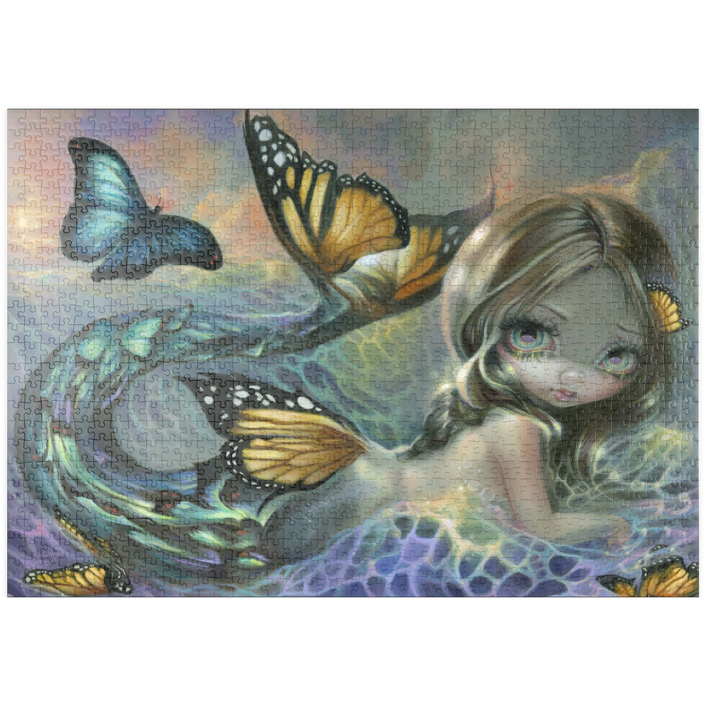 Tauchen Sie ein in das bezaubernde Puzzle „Sea Monarch“! Setzen Sie eine atemberaubende Meerjungfrau zusammen, deren Schwanz sich in lebhafte Schmetterlinge verwandelt, mit einem triumphierenden blauen Morpho vor einem Sonnenuntergang. Entdecken Sie einen Hauch von Melancholie, wenn ehemalige Schmetterlinge durch die Meereswellen treiben und an die Vergänglichkeit des Lebens erinnern. Setzen Sie diese magische, zum Nachdenken anregende Szene zusammen!
