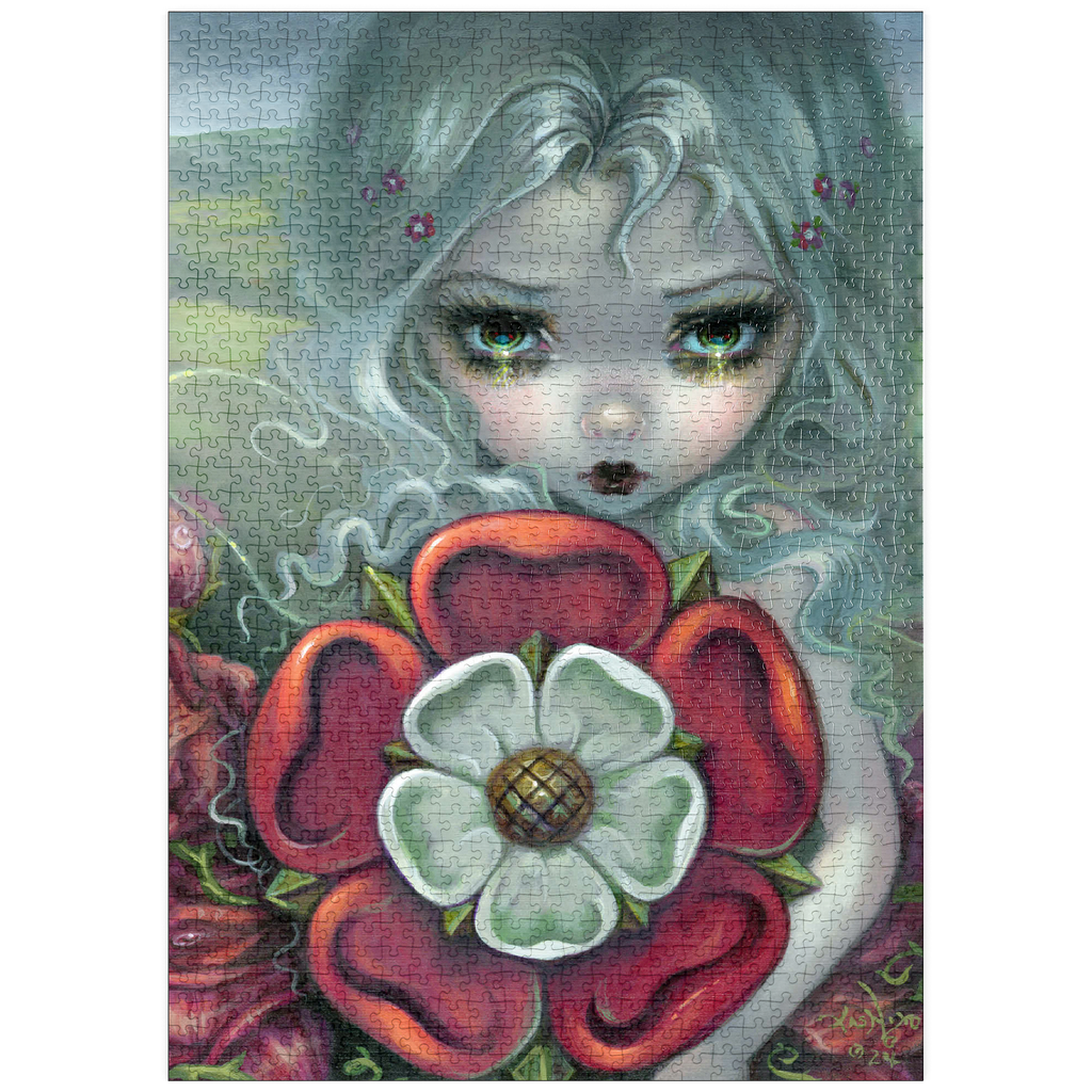 Setzen Sie das Tudor Rose Fairy Puzzle zusammen, ein exquisites Design, das für den Fairy Day in Glastonbury gemalt wurde! Dieses wunderschöne Kunstwerk zeigt eine Fee, die die ikonische Tudor-Rose vor dem Hintergrund grüner englischer Felder wiegt. Ein magisches, hochwertiges Puzzle für Liebhaber von Feenkunst und britischer Geschichte.