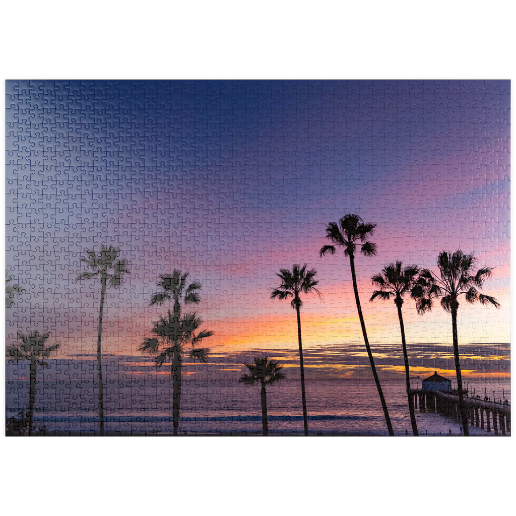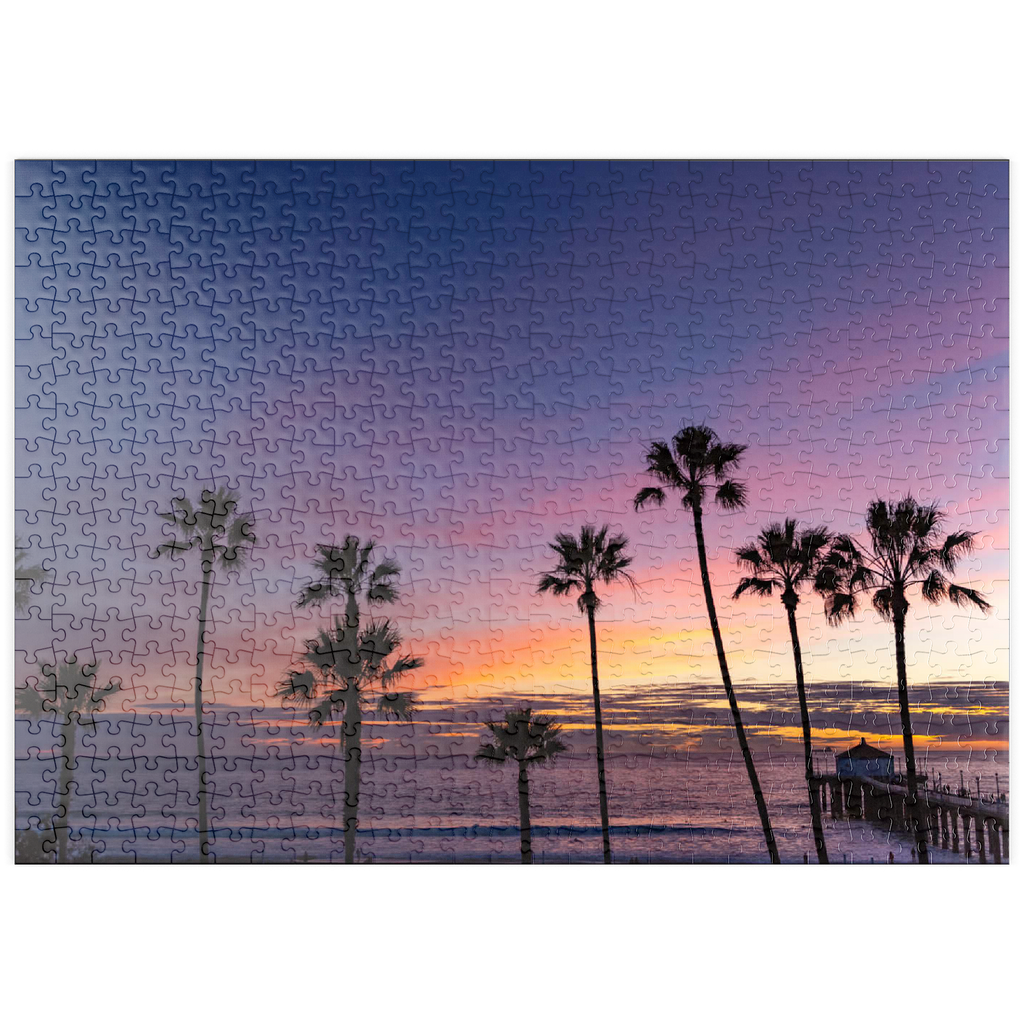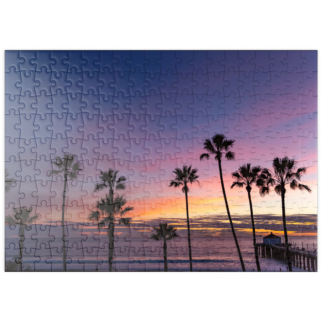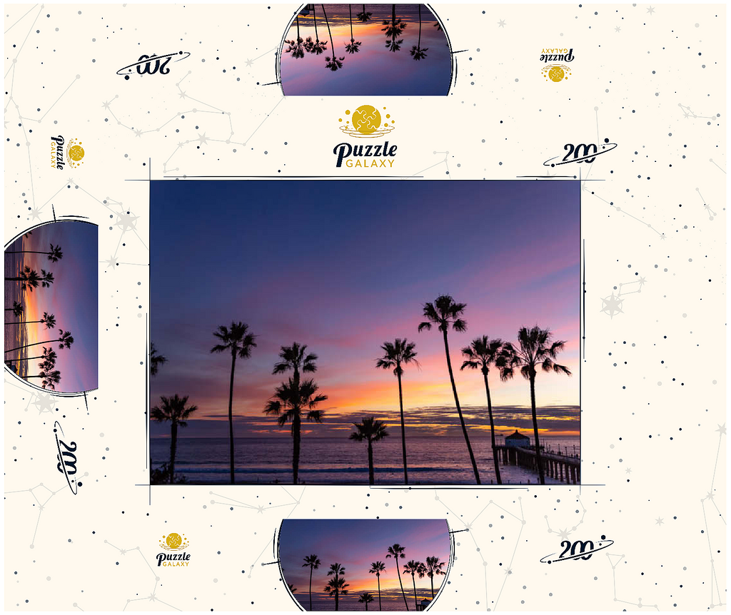 Dieser atemberaubende Blick fängt den Manhattan Beach Pier in Südkalifornien ein, umrahmt von hohen, ikonischen Palmen, die sich vor einem leuchtenden Sonnenuntergangshimmel abzeichnen. Die tiefen Violett- und sanften Orangetöne erstrecken sich über den Horizont und spiegeln den ruhigen Übergang vom Tag zur Nacht entlang des Pazifischen Ozeans wider. Während die Wellen sanft an den Strand rollen, ragt der historische Pier ins Wasser hinein, dessen Pavillon am Ende in der Abenddämmerung sanft beleuchtet ist. Dieses malerische Bild erinnert an die klassische Atmosphäre der südkalifornischen Küste – perfekt für Strandliebhaber, Sonnenuntergangsjäger und alle, die sich von der zeitlosen Schönheit der Strände von Los Angeles angezogen fühlen. Die von Palmen gesäumte Silhouette verleiht dieser faszinierenden Abendszene einen tropischen Charme.
