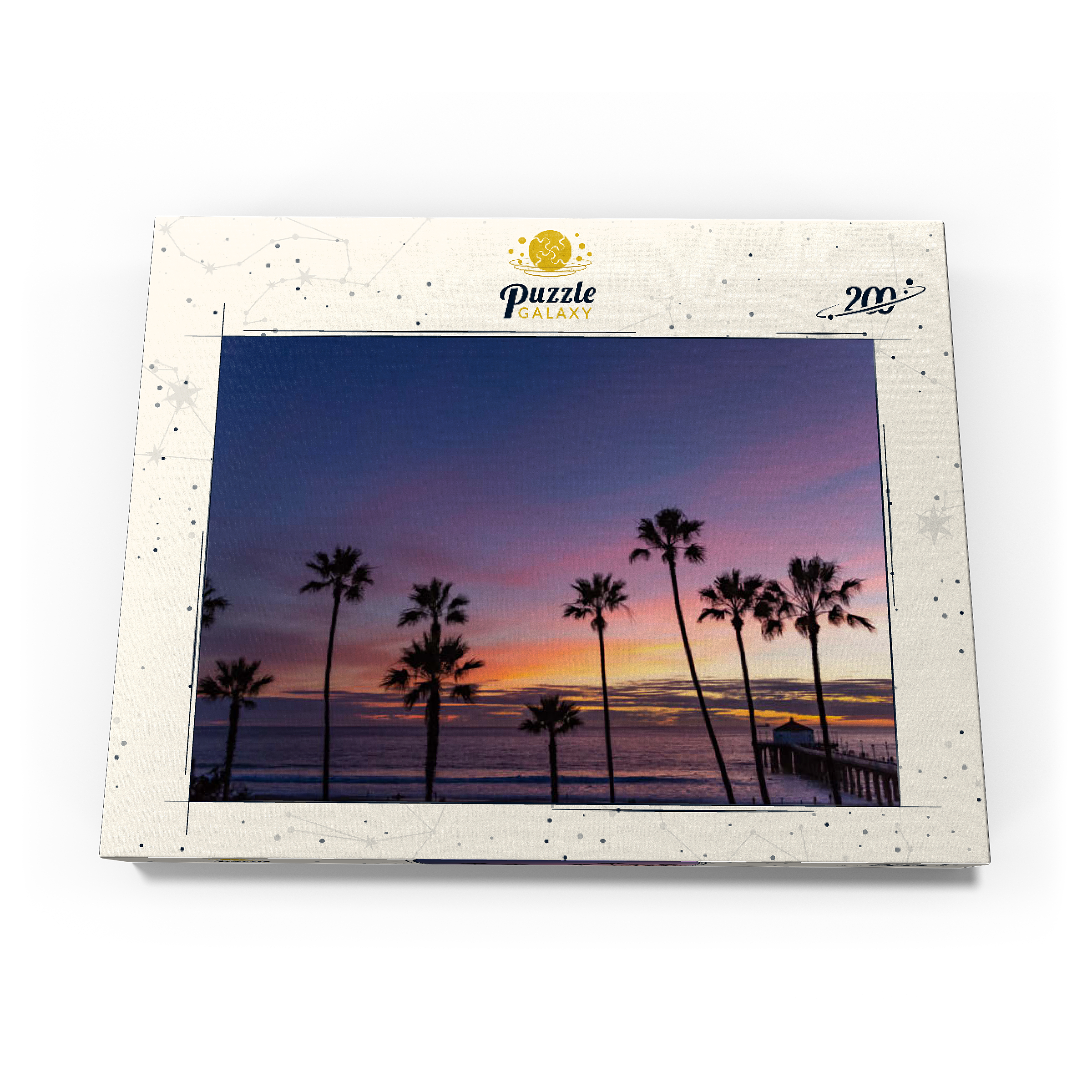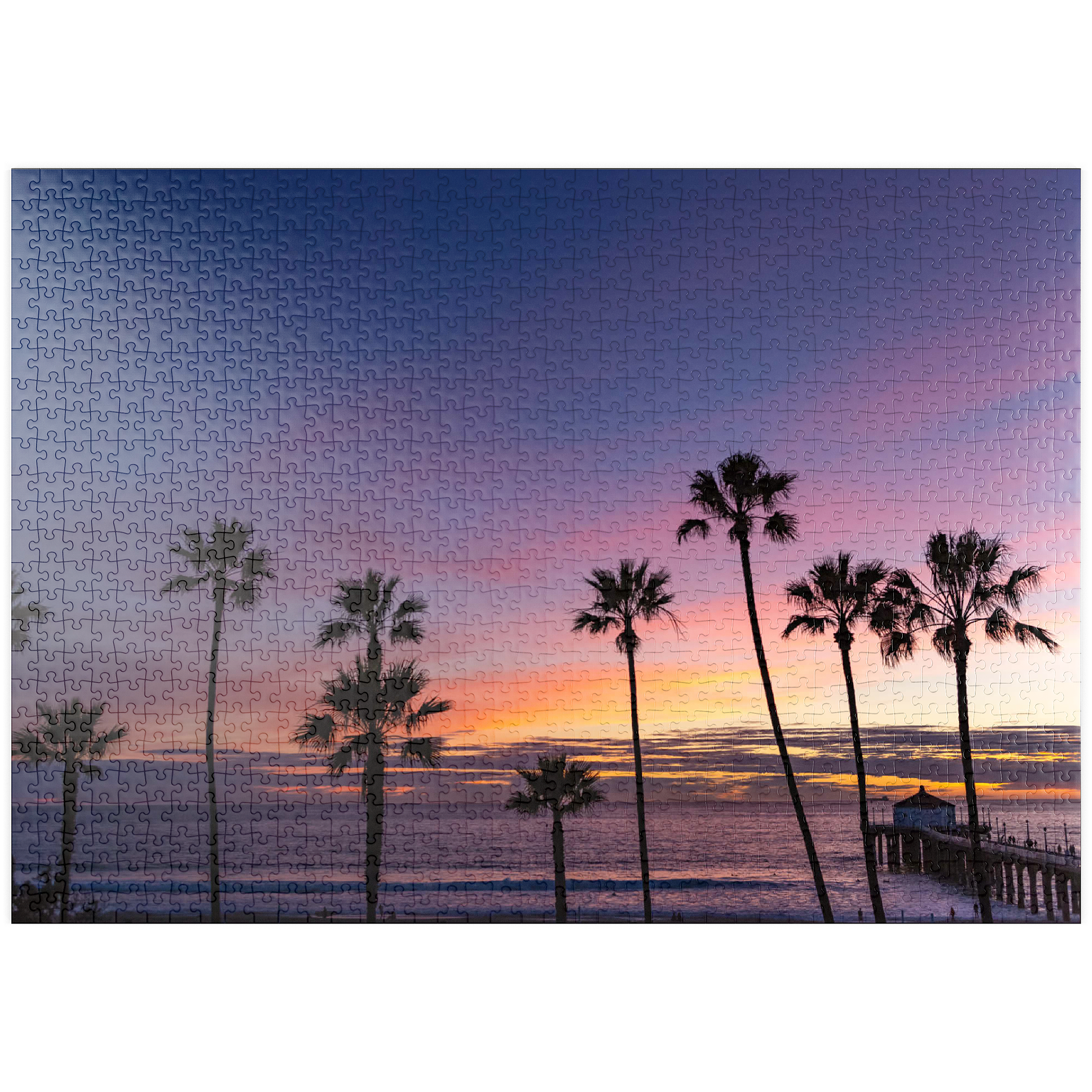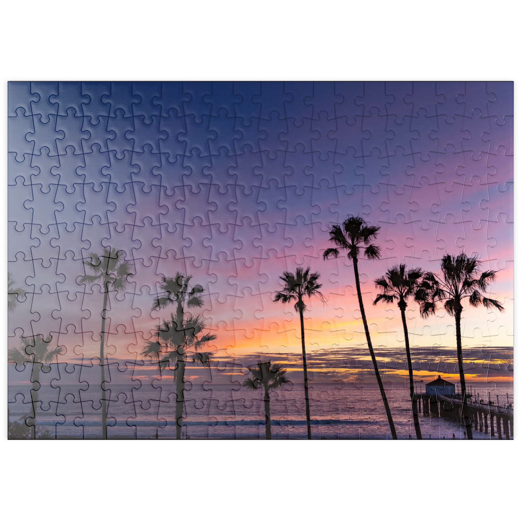 Dieser atemberaubende Blick fängt den Manhattan Beach Pier in Südkalifornien ein, umrahmt von hohen, ikonischen Palmen, die sich vor einem leuchtenden Sonnenuntergangshimmel abzeichnen. Die tiefen Violett- und sanften Orangetöne erstrecken sich über den Horizont und spiegeln den ruhigen Übergang vom Tag zur Nacht entlang des Pazifischen Ozeans wider. Während die Wellen sanft an den Strand rollen, ragt der historische Pier ins Wasser hinein, dessen Pavillon am Ende in der Abenddämmerung sanft beleuchtet ist. Dieses malerische Bild erinnert an die klassische Atmosphäre der südkalifornischen Küste – perfekt für Strandliebhaber, Sonnenuntergangsjäger und alle, die sich von der zeitlosen Schönheit der Strände von Los Angeles angezogen fühlen. Die von Palmen gesäumte Silhouette verleiht dieser faszinierenden Abendszene einen tropischen Charme.