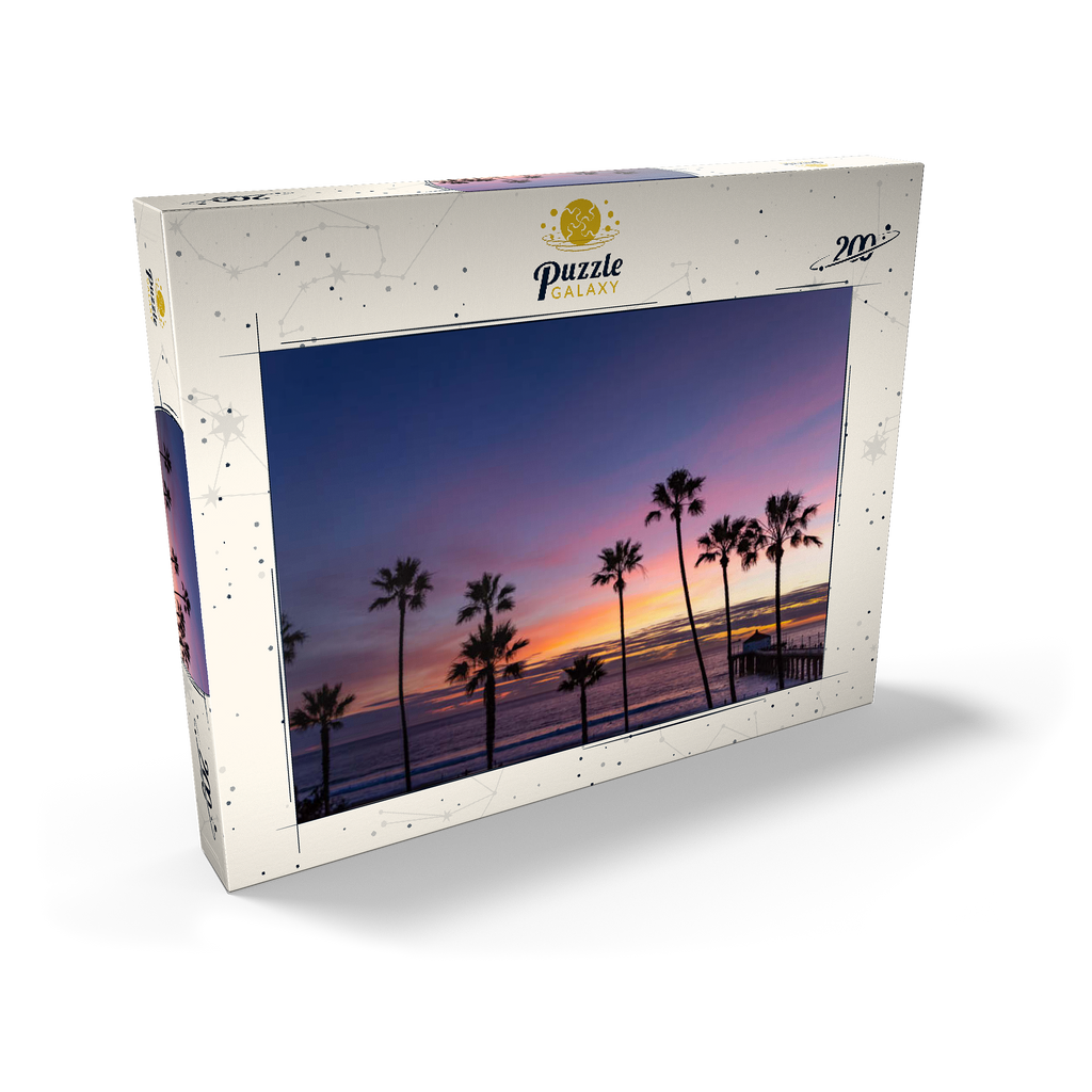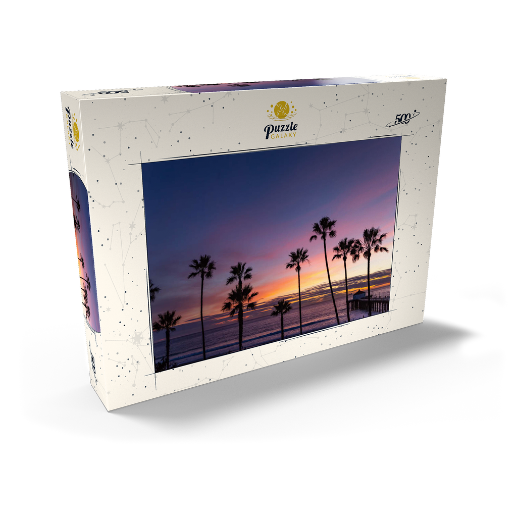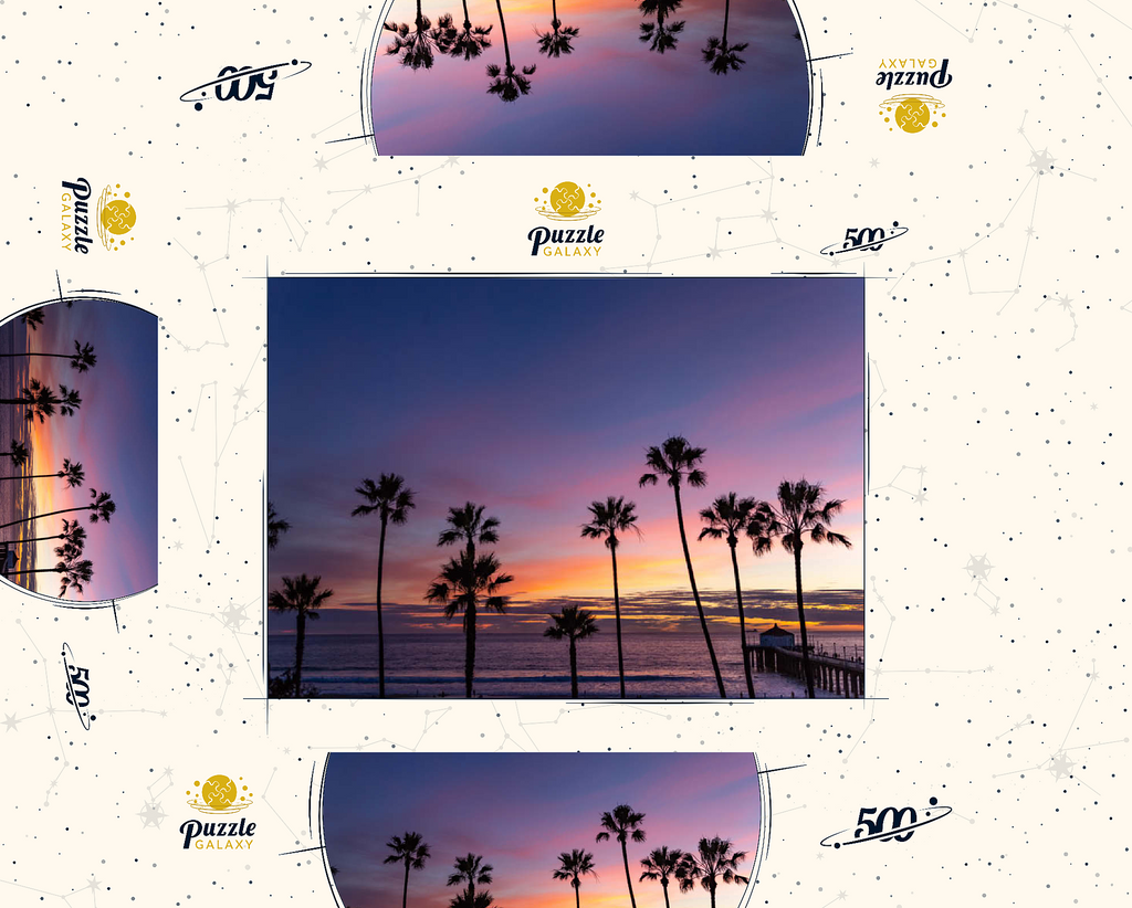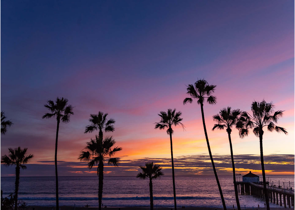 Manhattan Beach Pier bei Sonnenuntergang mit Palmen-Silhouetten