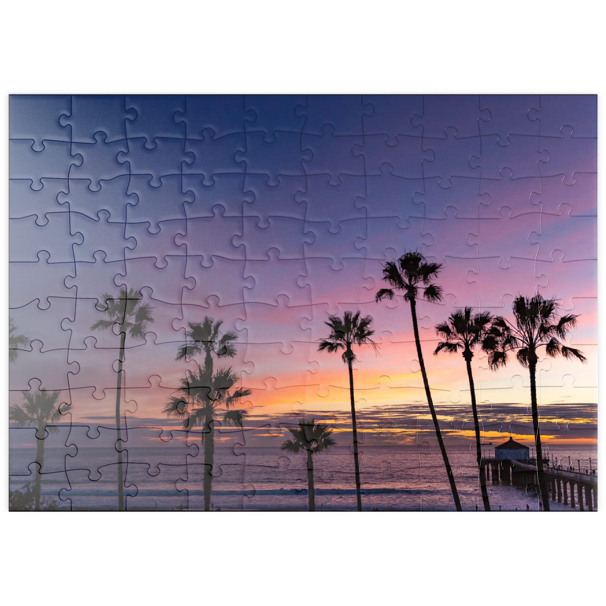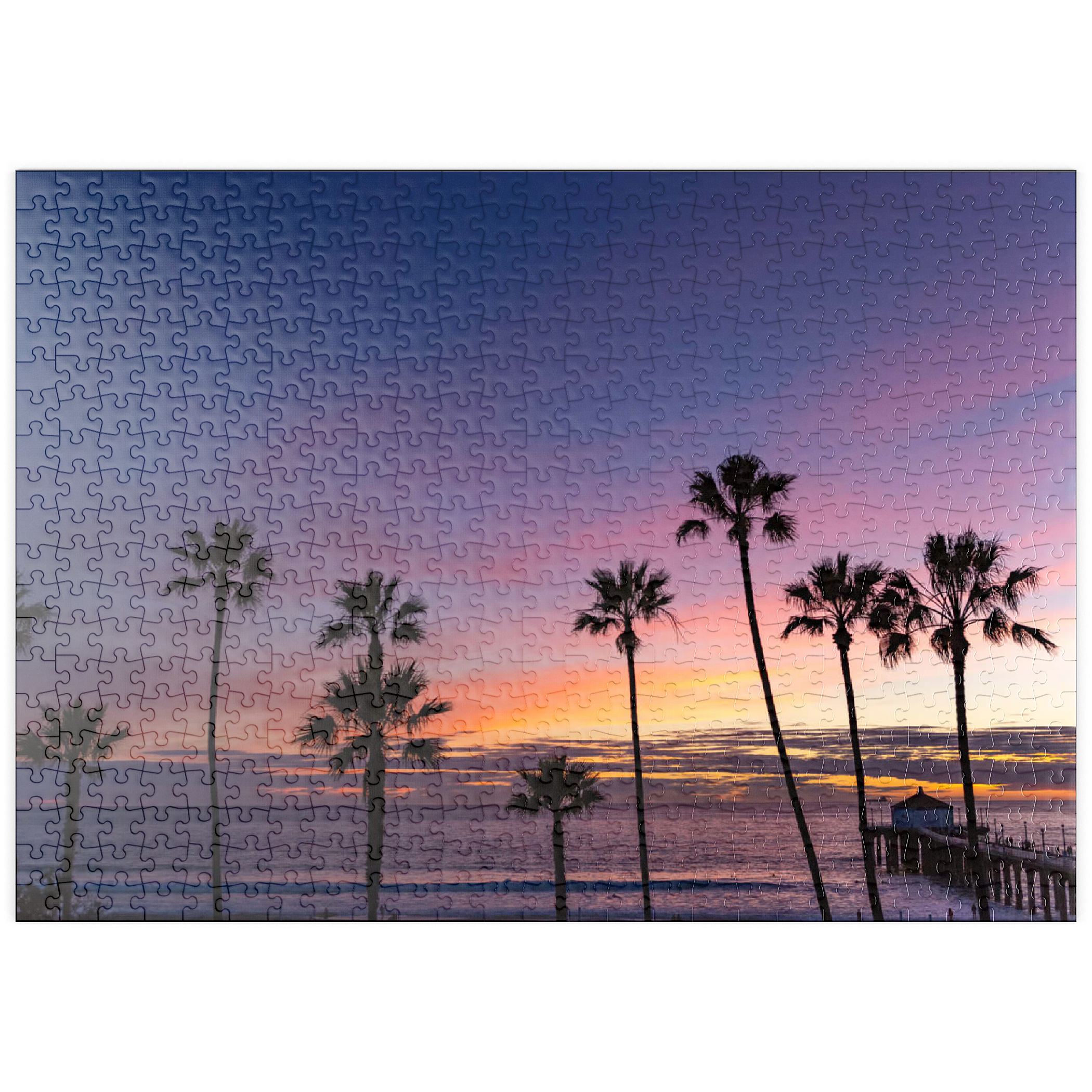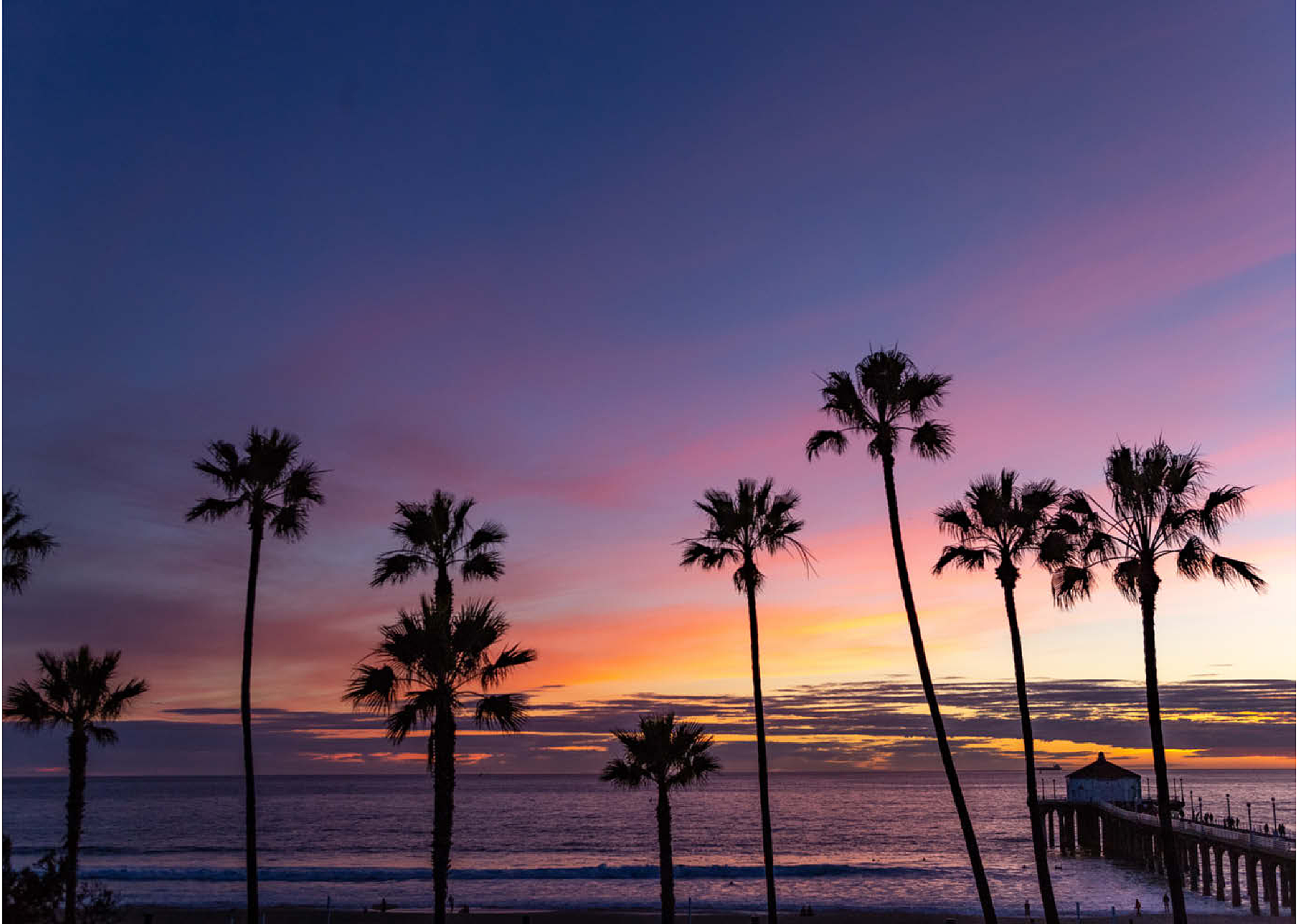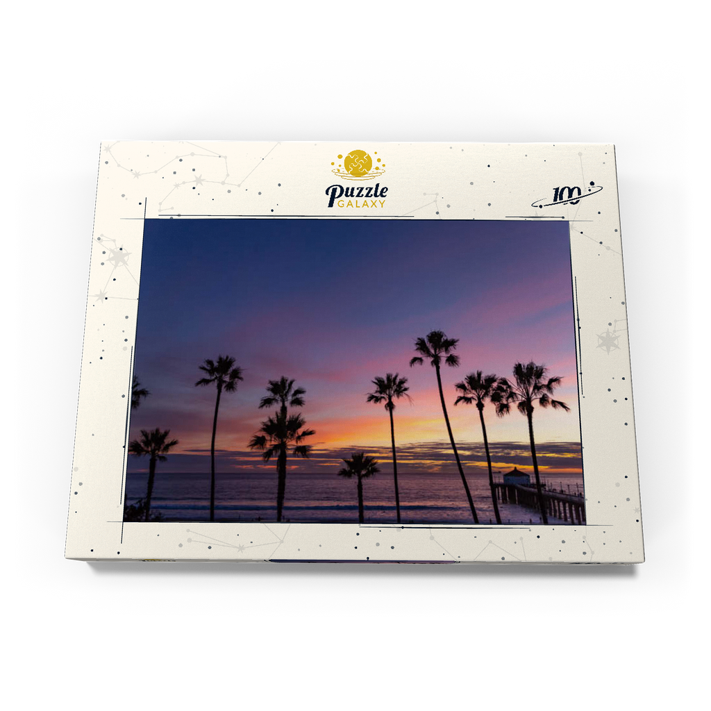 Manhattan Beach Pier bei Sonnenuntergang mit Palmen-Silhouetten