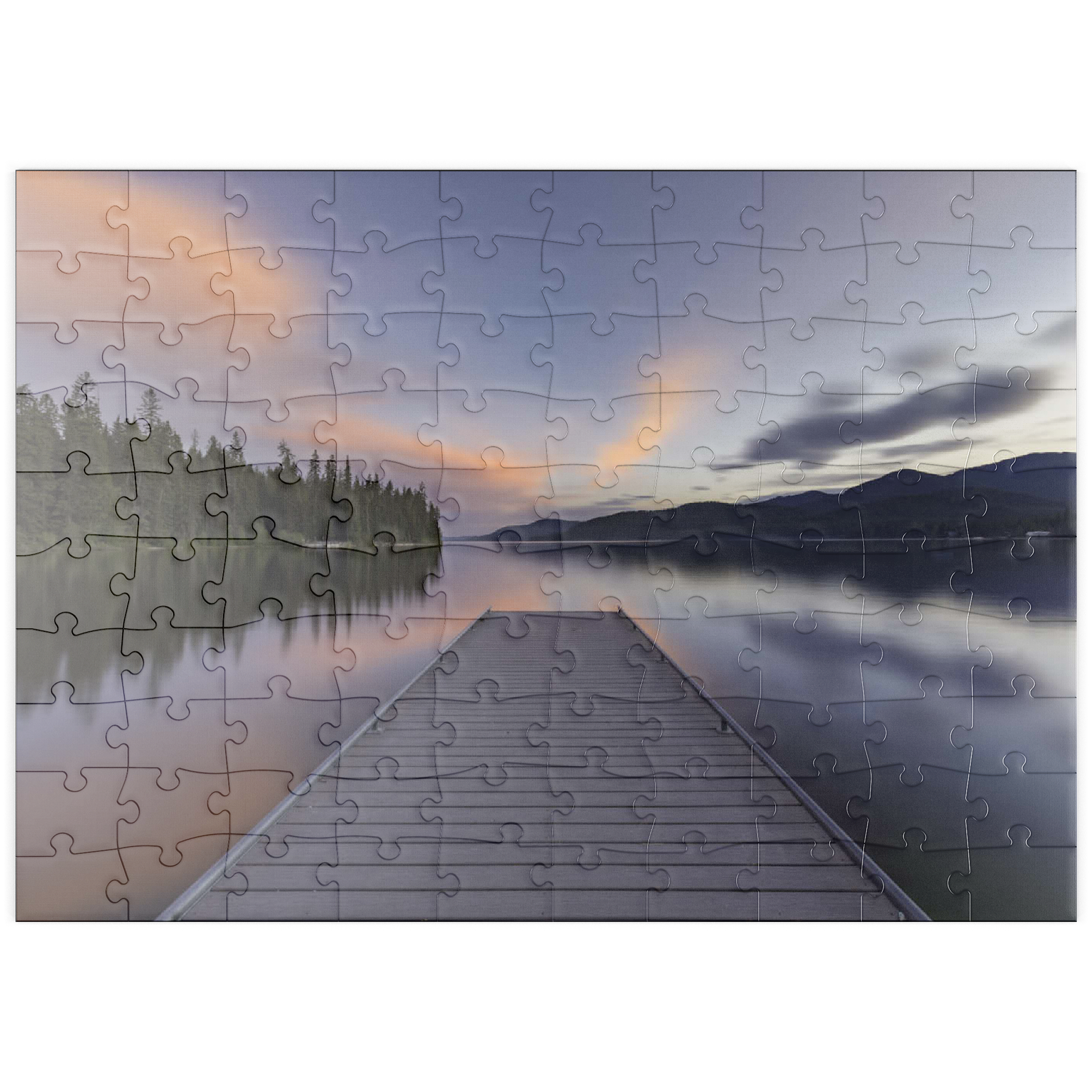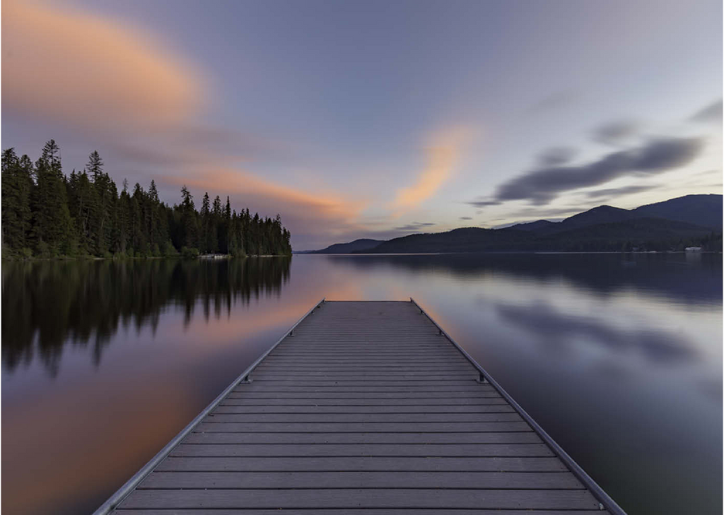 Dieses ruhige Bild zeigt einen friedlichen Steg, der sich in das ruhige Wasser eines unberührten Sees in Montana erstreckt, umgeben von dichten Kiefernwäldern und weit entfernten sanften Bergen. Die Szene wurde in der Abenddämmerung aufgenommen und ist in sanfte Pastelltöne von Rosa, Lavendel und Blau getaucht, die sich perfekt auf der glasartigen Oberfläche des Sees widerspiegeln. Der Langzeitbelichtungseffekt verstärkt die traumhafte Atmosphäre und lässt das Wasser im schwindenden Abendlicht seidig glatt erscheinen. Die Stille der Landschaft vermittelt ein tiefes Gefühl der Ruhe und Verbundenheit mit der Natur. Dieses Bild ist ideal für Liebhaber von Ausflügen in die Wildnis, der Ruhe am See und malerischen Waldausblicken und fängt die Essenz der natürlichen Schönheit und unberührten Landschaften Montanas ein.