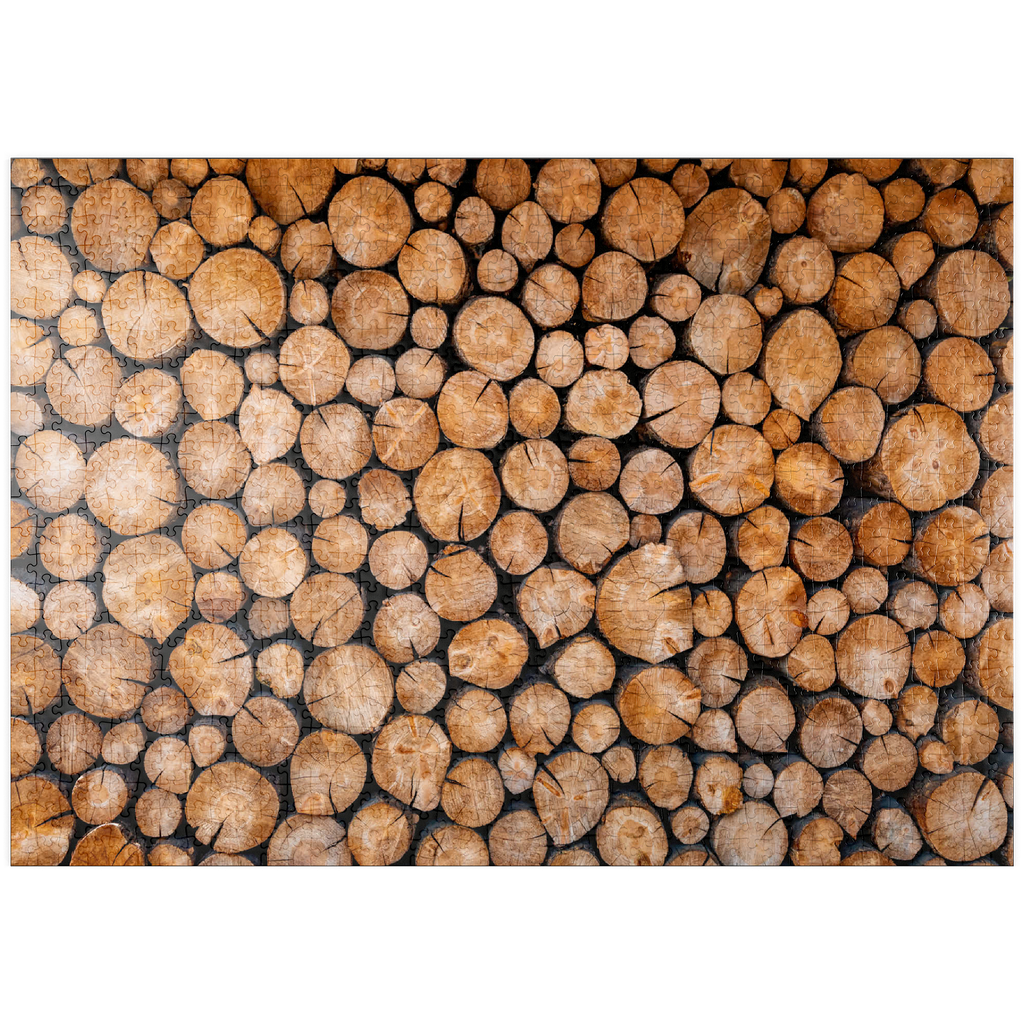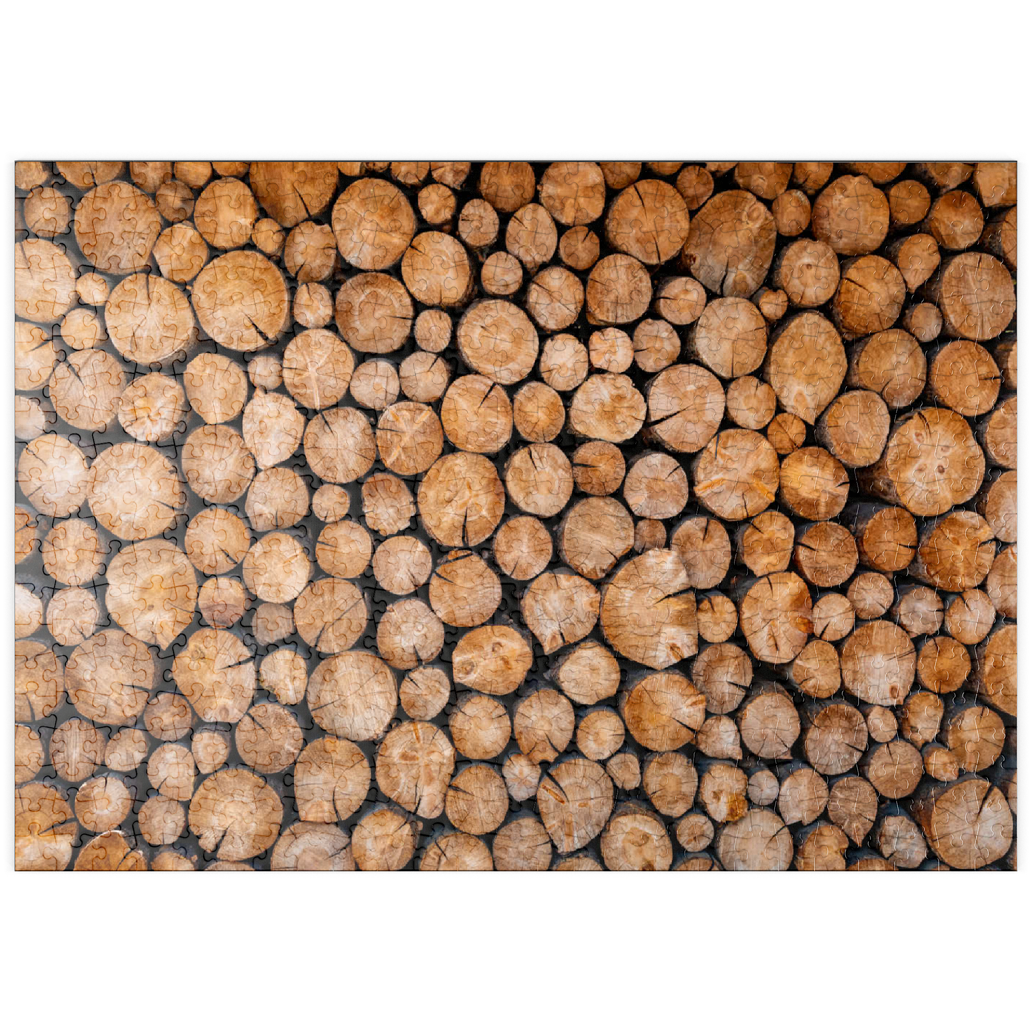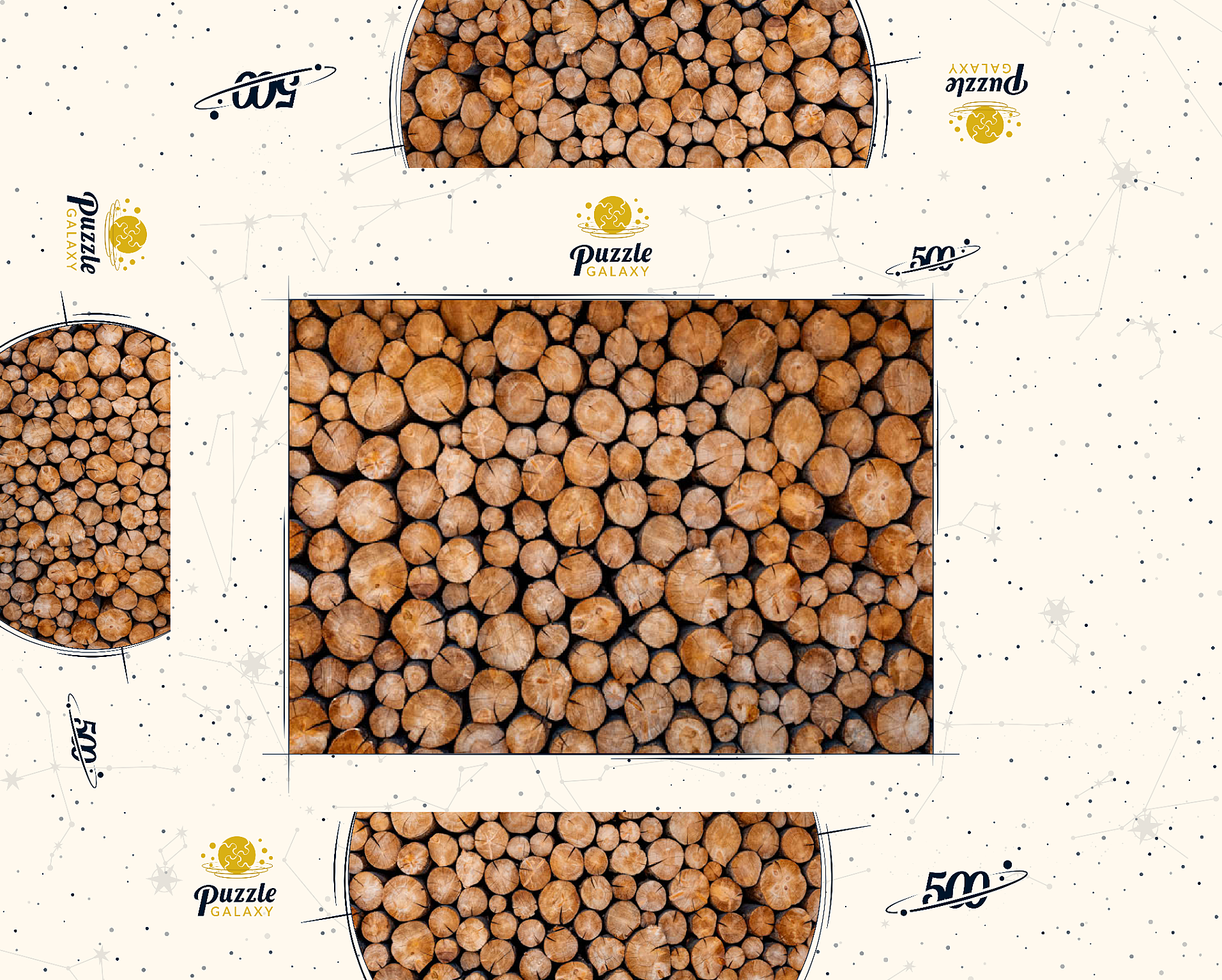 Dieses Bild zeigt einen dicht gestapelten Haufen geschnittener Brennholzscheite, die die natürliche Maserung, die Jahresringe und die satten Brauntöne des Holzes zur Geltung bringen. Die unterschiedlichen Durchmesser und leichten Risse an den Enden der Scheite unterstreichen die organische Beschaffenheit und den rustikalen Charme von frisch geschnittenem Holz. Der Querschnitt hebt die natürlichen Wachstumsmuster hervor und macht das Bild zu einem auffälligen und warmtonigen Hintergrund oder Dekorationselement. Diese Komposition eignet sich perfekt für Themen wie Nachhaltigkeit, gemütliches Wohnen, Waldprodukte und Herbst- oder Wintervorbereitungen und vermittelt ein Gefühl von Wärme, Handwerkskunst und Verbundenheit mit der Natur. Ideal für Inspirationen zur Inneneinrichtung, Camping- oder Kaminbilder oder Produktpräsentationen im Bereich Holzbearbeitung.