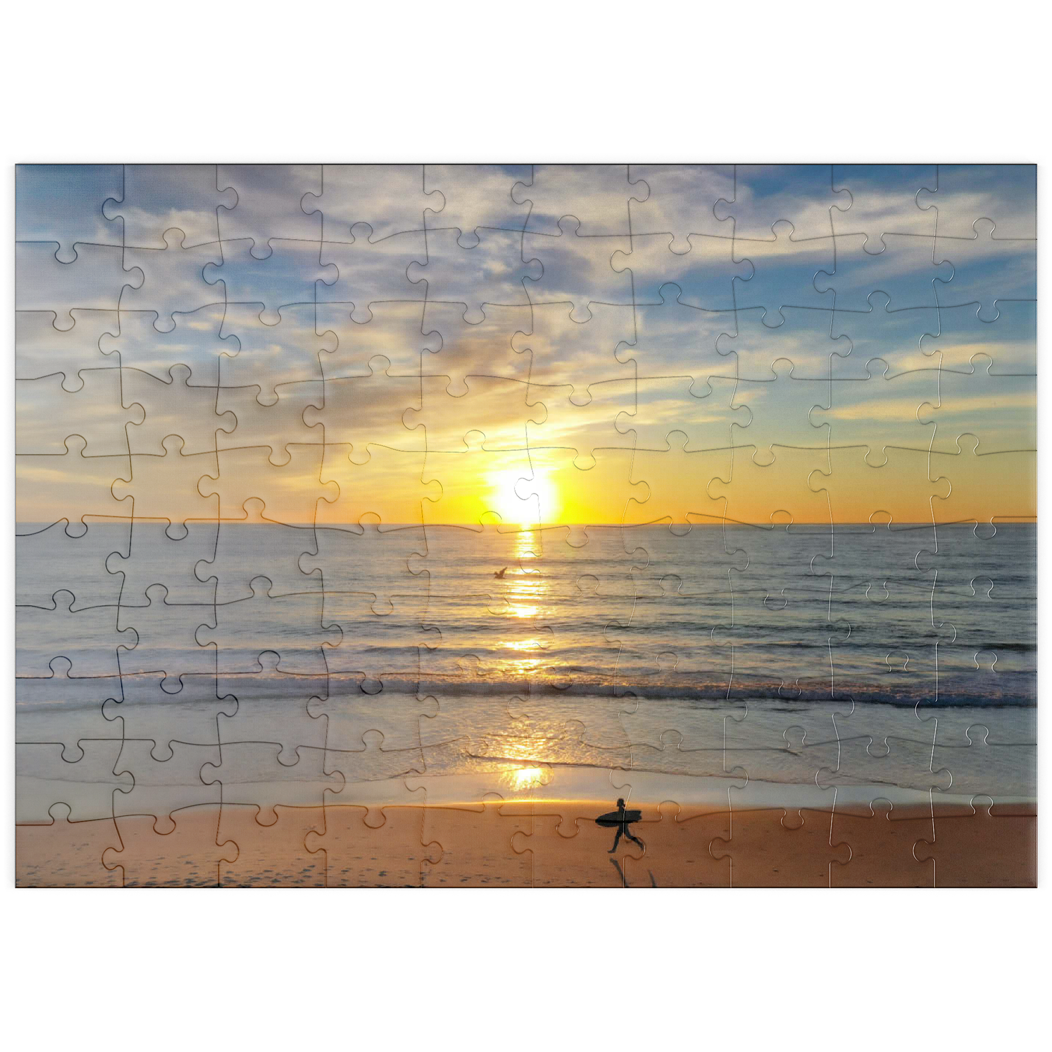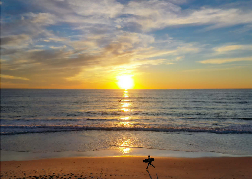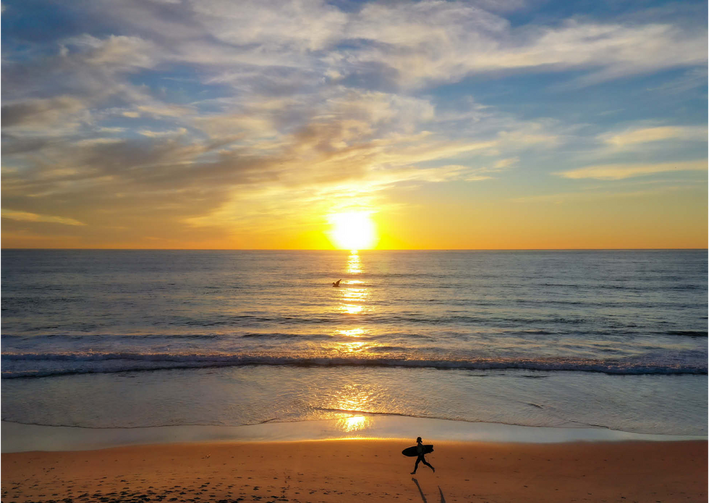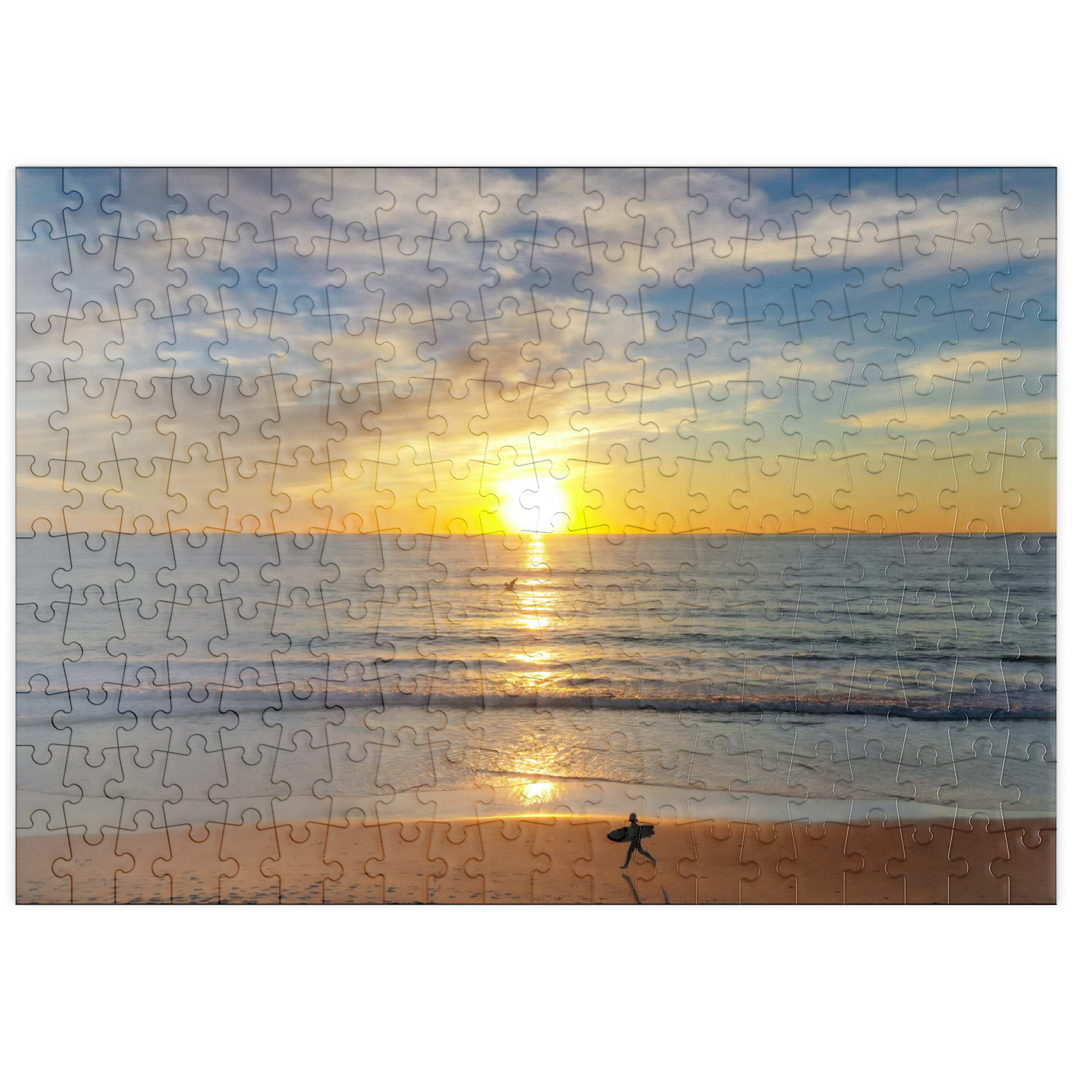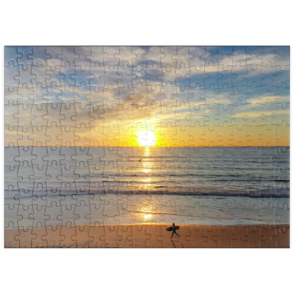 Ein einsamer Surfer läuft bei einem strahlenden Sonnenuntergang an einem goldenen Strand in Kalifornien entlang und wirft einen langen Schatten auf den nassen Sand. Der Himmel leuchtet in leuchtenden Orange-, Gelb- und Blautönen, während die Sonne hinter dem Horizont versinkt und sich in den ruhigen Wellen des Pazifischen Ozeans spiegelt. Diese ruhige Küstenlandschaft fängt den Geist der Surfkultur der Westküste, die Freiheit und die Schönheit der Natur ein. Die sanften Wellen und die klare Horizontlinie vermitteln ein Gefühl der Ruhe und Vorfreude auf die nächste Welle. Dieses Bild verkörpert perfekt den typischen kalifornischen Lebensstil und eignet sich ideal für die Werbung für Stranddestinationen, Surfbekleidung oder Wohnaccessoires mit Meeresmotiven.