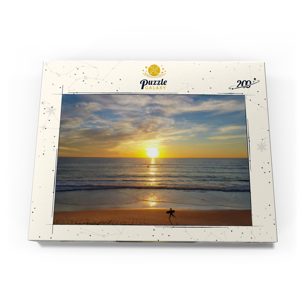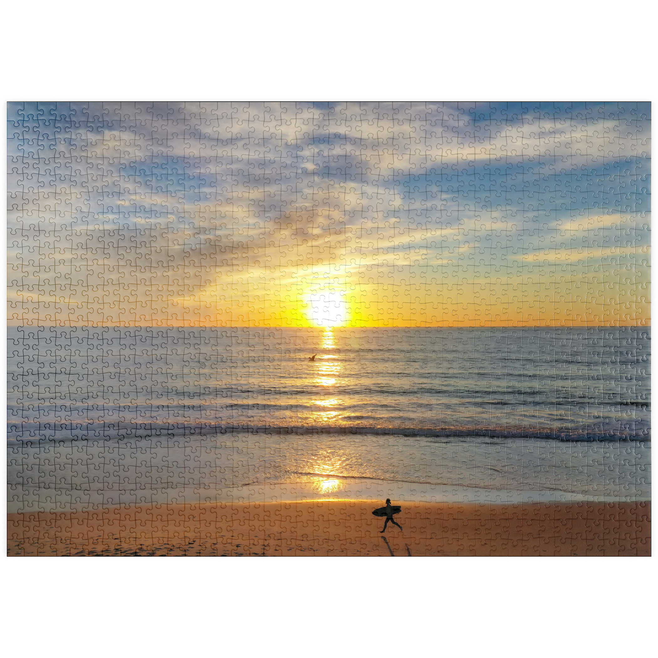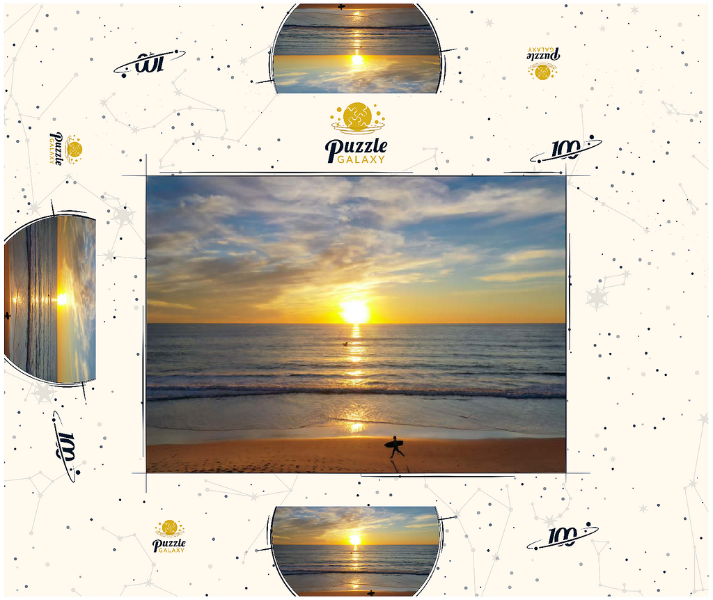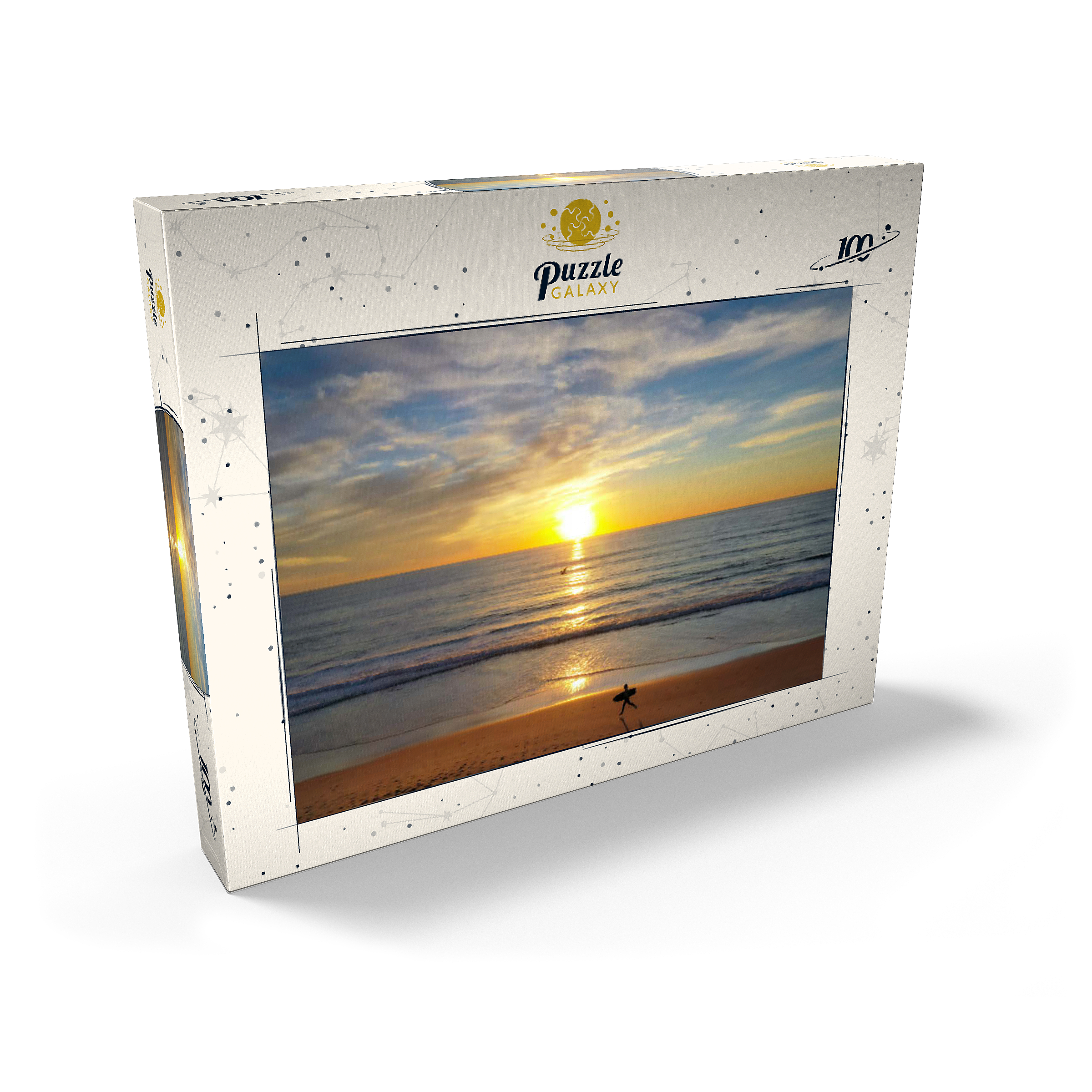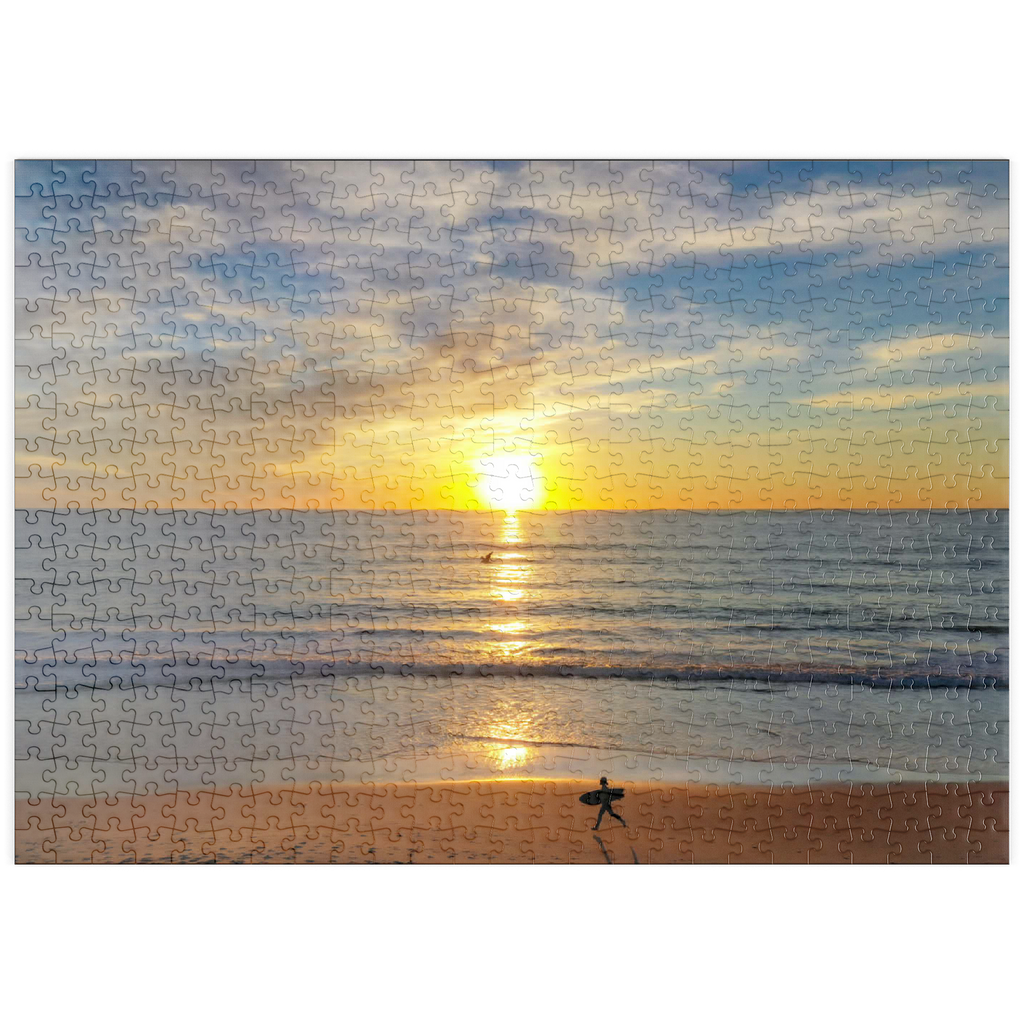 Ein einsamer Surfer läuft bei einem strahlenden Sonnenuntergang an einem goldenen Strand in Kalifornien entlang und wirft einen langen Schatten auf den nassen Sand. Der Himmel leuchtet in leuchtenden Orange-, Gelb- und Blautönen, während die Sonne hinter dem Horizont versinkt und sich in den ruhigen Wellen des Pazifischen Ozeans spiegelt. Diese ruhige Küstenlandschaft fängt den Geist der Surfkultur der Westküste, die Freiheit und die Schönheit der Natur ein. Die sanften Wellen und die klare Horizontlinie vermitteln ein Gefühl der Ruhe und Vorfreude auf die nächste Welle. Dieses Bild verkörpert perfekt den typischen kalifornischen Lebensstil und eignet sich ideal für die Werbung für Stranddestinationen, Surfbekleidung oder Wohnaccessoires mit Meeresmotiven.
