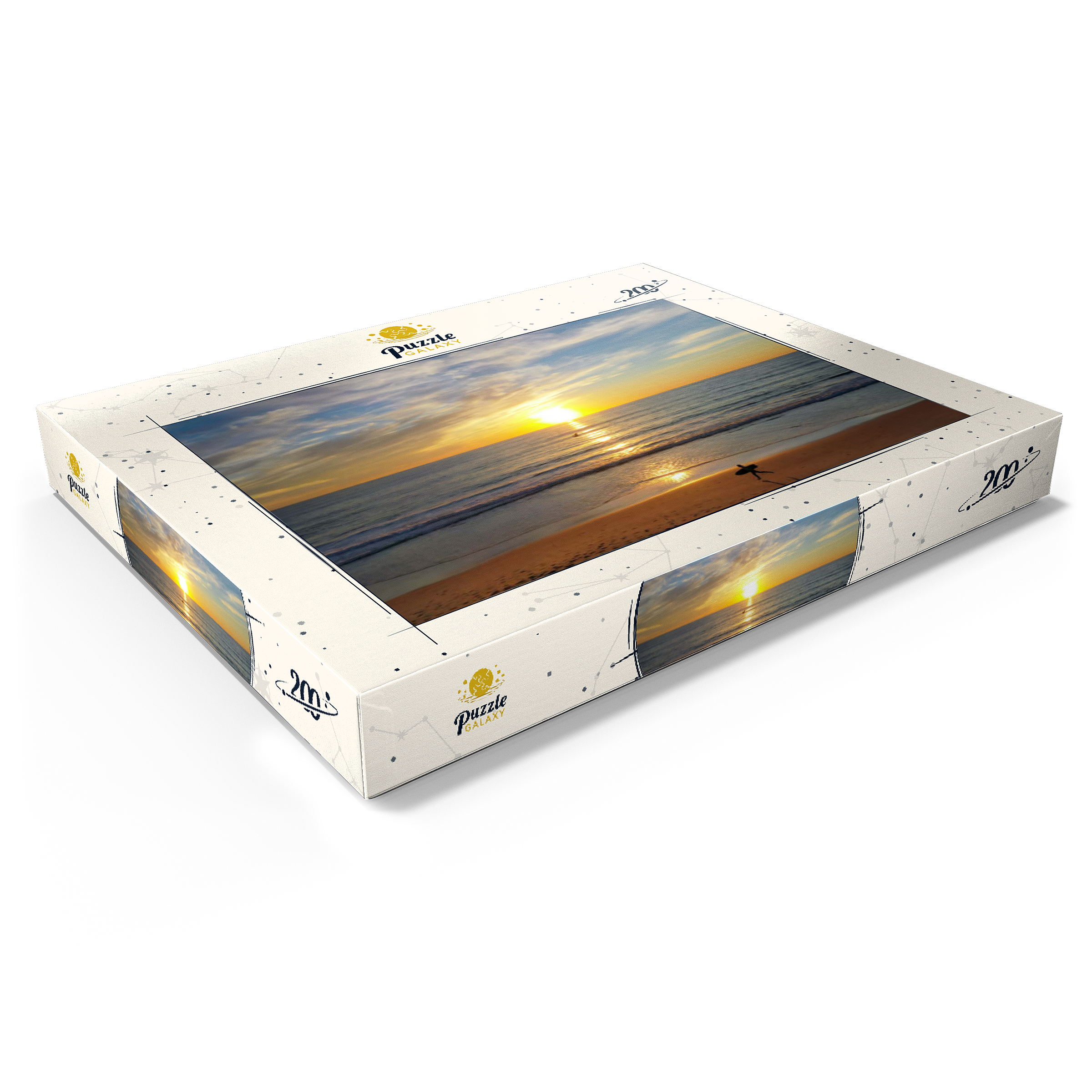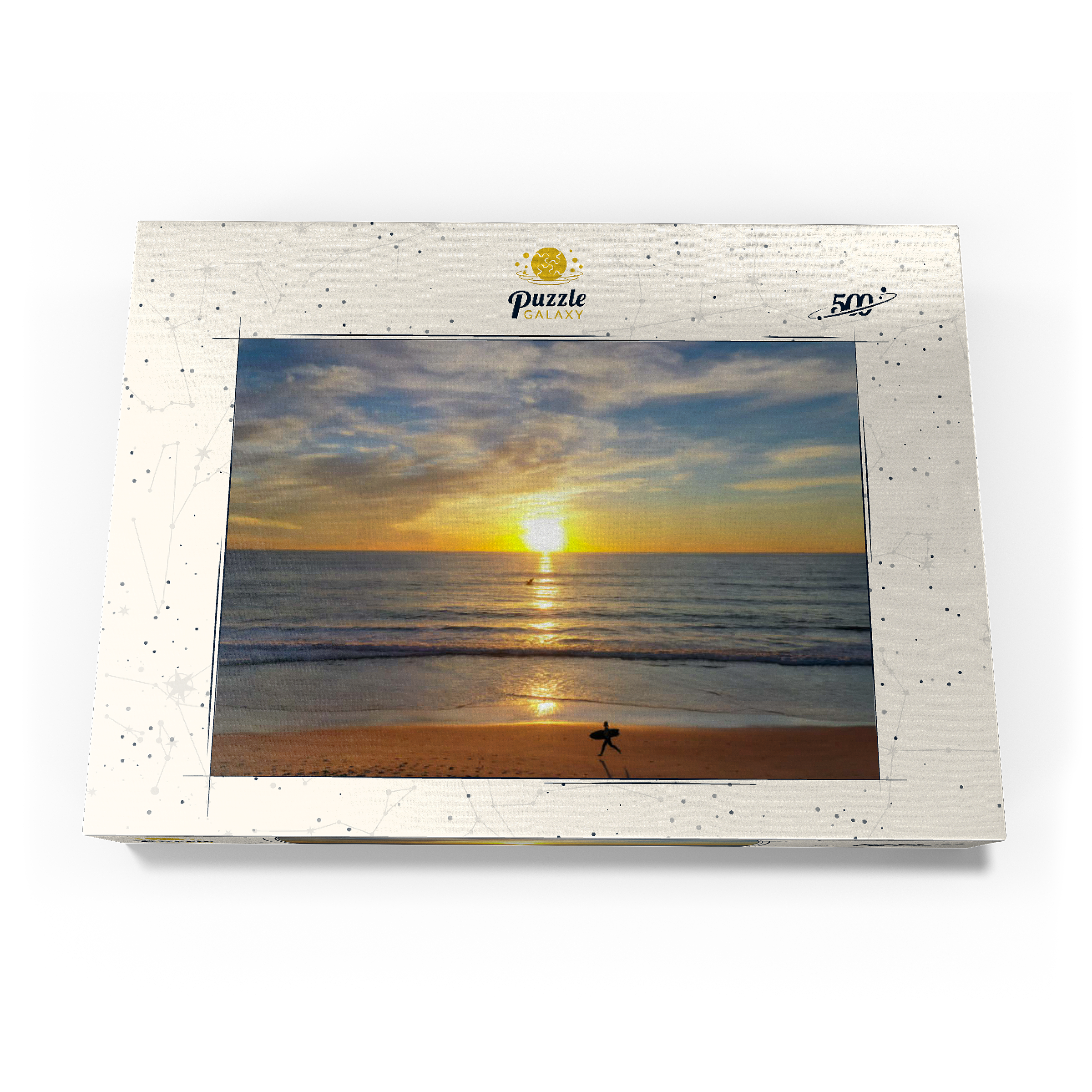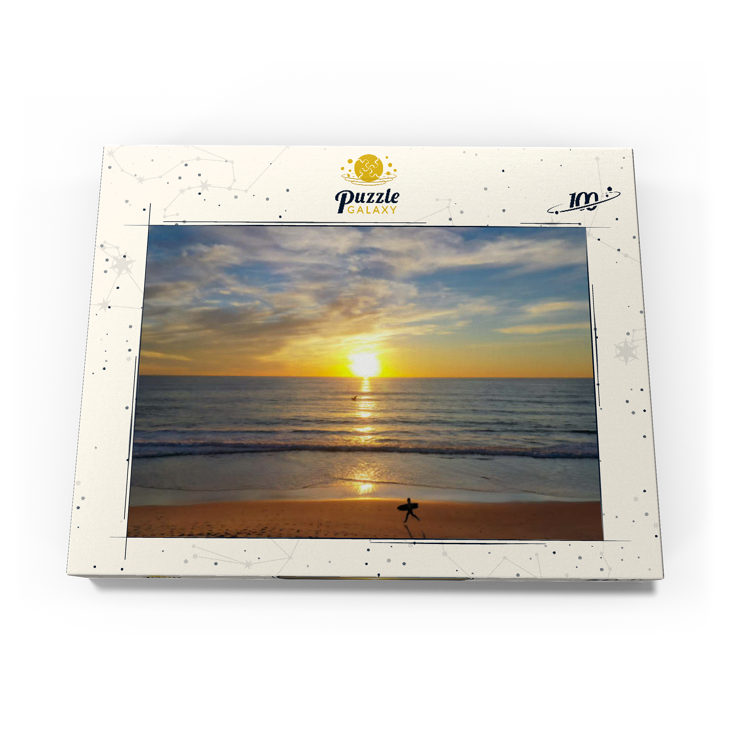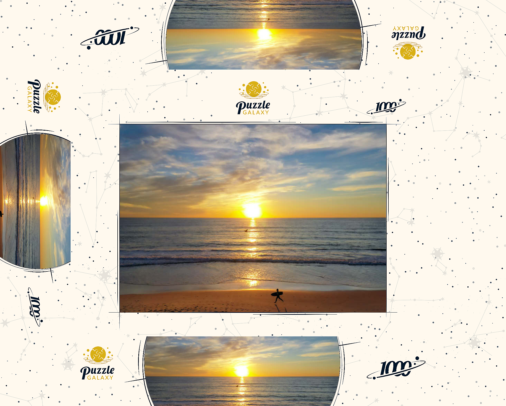 Ein einsamer Surfer läuft bei einem strahlenden Sonnenuntergang an einem goldenen Strand in Kalifornien entlang und wirft einen langen Schatten auf den nassen Sand. Der Himmel leuchtet in leuchtenden Orange-, Gelb- und Blautönen, während die Sonne hinter dem Horizont versinkt und sich in den ruhigen Wellen des Pazifischen Ozeans spiegelt. Diese ruhige Küstenlandschaft fängt den Geist der Surfkultur der Westküste, die Freiheit und die Schönheit der Natur ein. Die sanften Wellen und die klare Horizontlinie vermitteln ein Gefühl der Ruhe und Vorfreude auf die nächste Welle. Dieses Bild verkörpert perfekt den typischen kalifornischen Lebensstil und eignet sich ideal für die Werbung für Stranddestinationen, Surfbekleidung oder Wohnaccessoires mit Meeresmotiven.