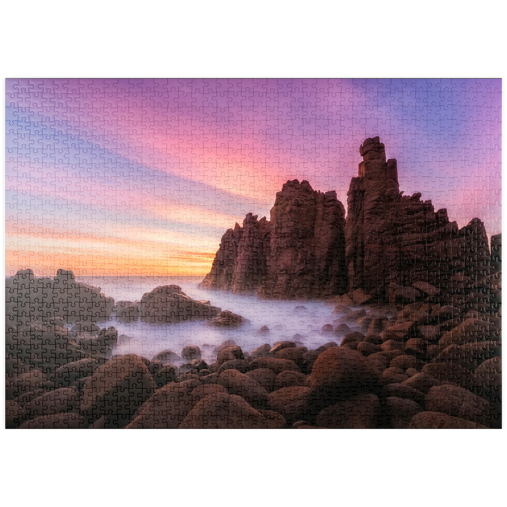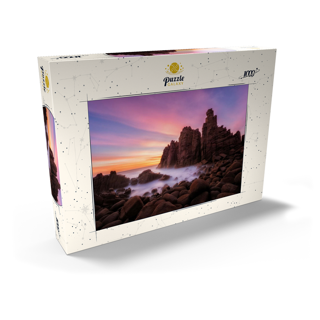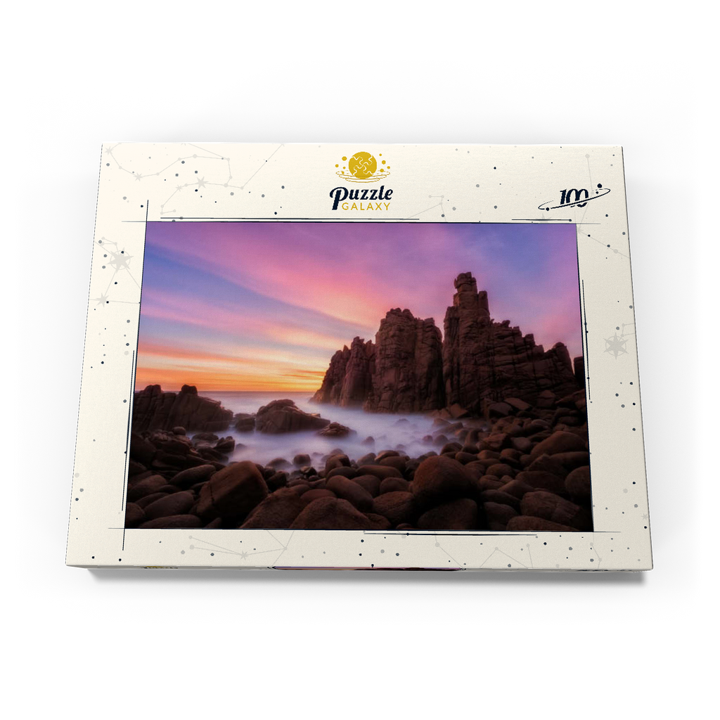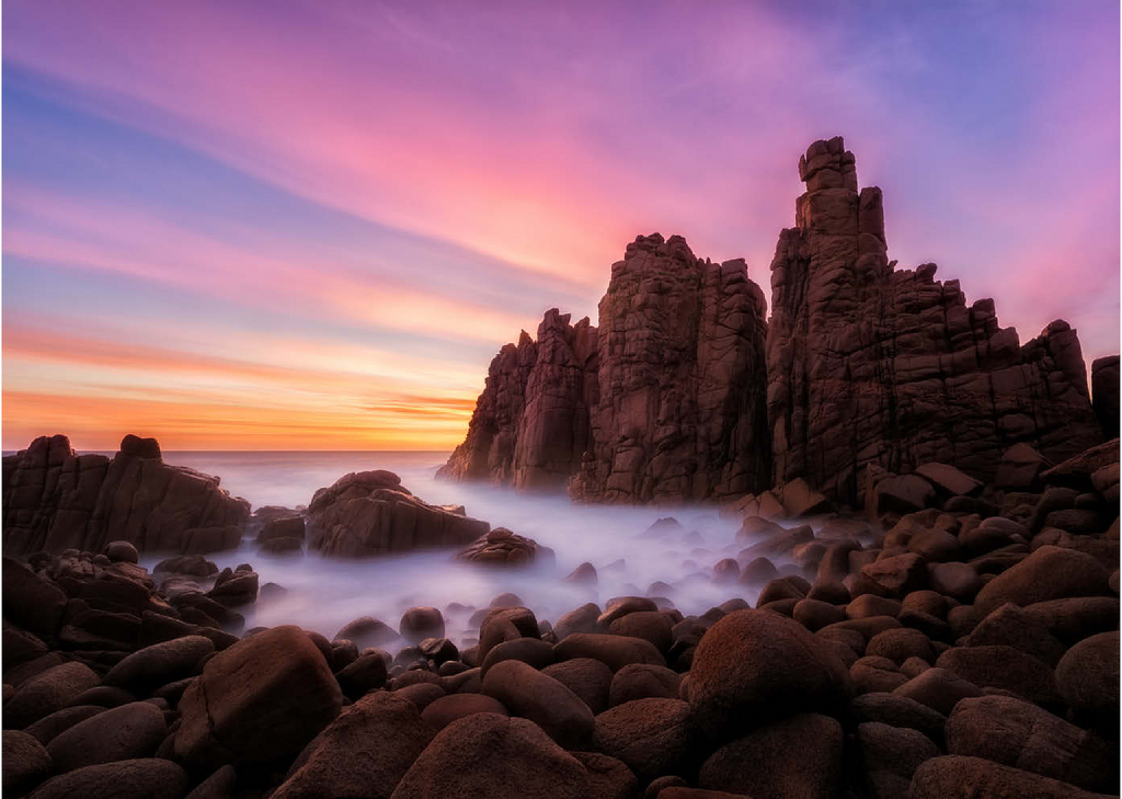 Die Pinnacles am Cape Woolamai auf Phillip Island, Australien, sind eine beeindruckende Formation aus Granitfelsen, die sich dramatisch aus der Küstenlinie erheben. Diese imposanten Felsen wurden über Millionen von Jahren durch die unerbittliche Kraft des Ozeans geformt und bieten einen faszinierenden Anblick, insbesondere bei Sonnenuntergang, wenn der Himmel in Rosa-, Violett- und Goldtönen getaucht ist. Die zerklüftete Küste in Kombination mit dem nebligen Meer, das durch Langzeitbelichtung fotografiert wurde, schafft eine surreale und ätherische Atmosphäre. Die Pinnacles am Cape Woolamai sind ein beliebtes Ziel für Fotografen und Naturliebhaber und zeugen von der unvergänglichen Kunstfertigkeit der Natur.