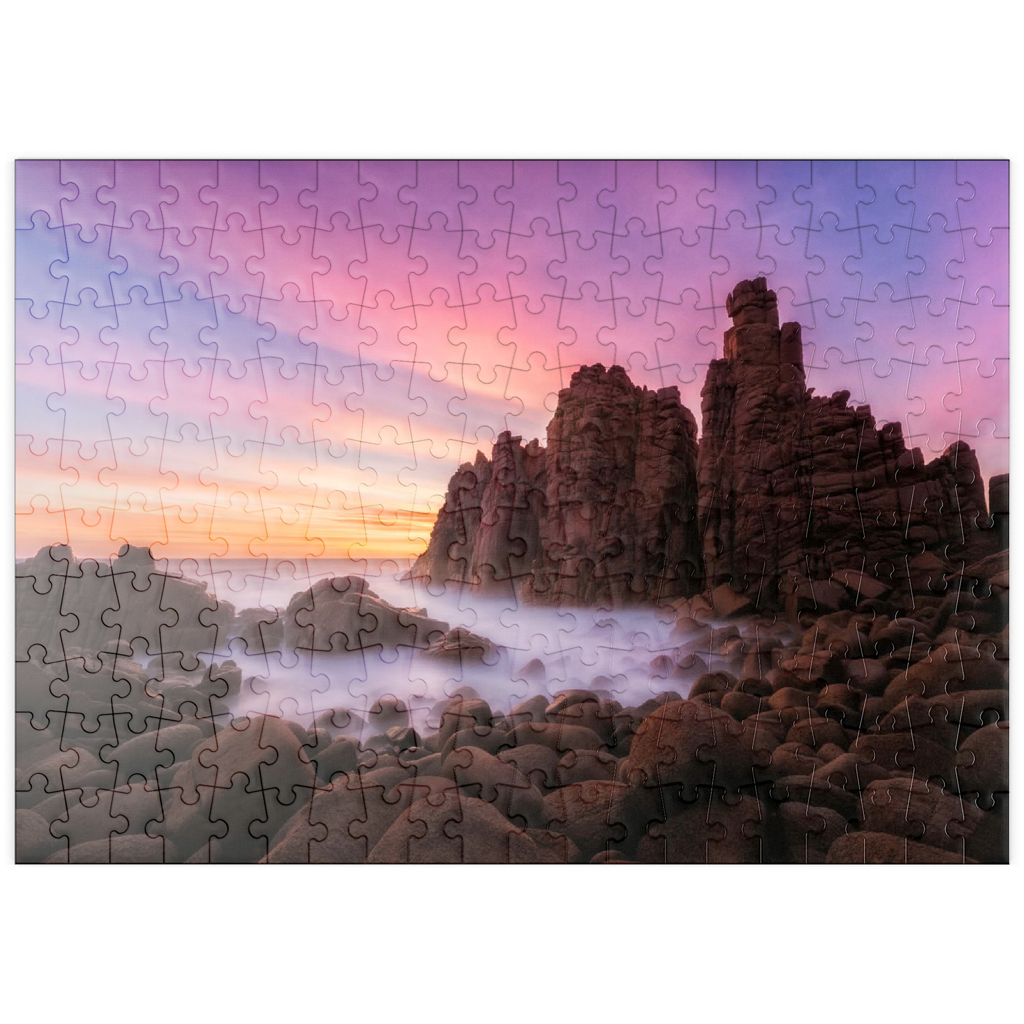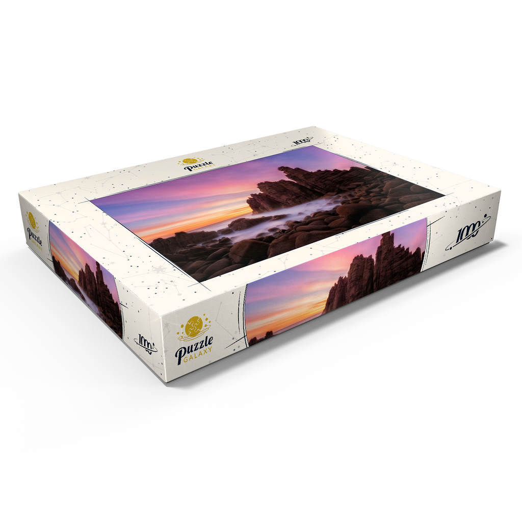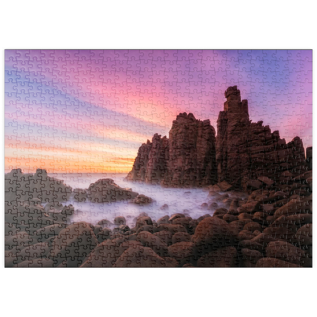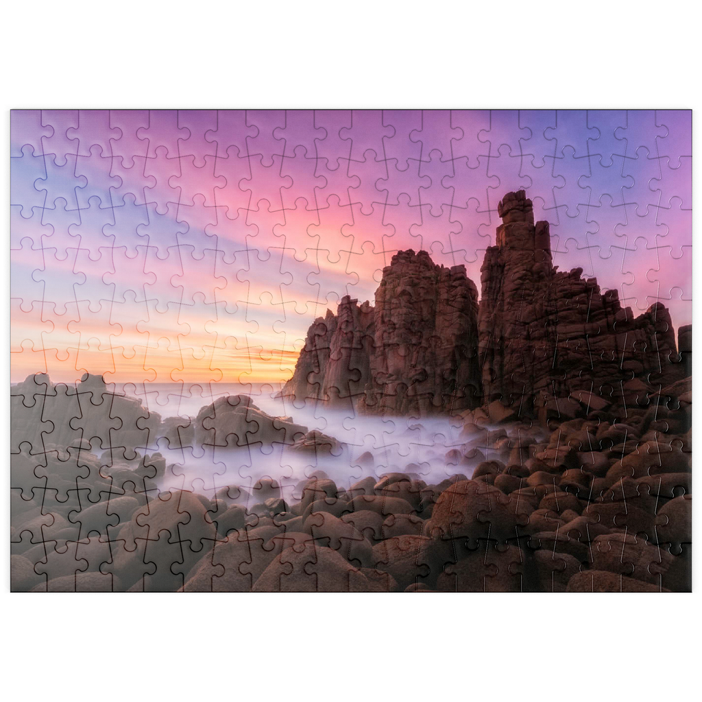 Die Pinnacles am Cape Woolamai auf Phillip Island, Australien, sind eine beeindruckende Formation aus Granitfelsen, die sich dramatisch aus der Küstenlinie erheben. Diese imposanten Felsen wurden über Millionen von Jahren durch die unerbittliche Kraft des Ozeans geformt und bieten einen faszinierenden Anblick, insbesondere bei Sonnenuntergang, wenn der Himmel in Rosa-, Violett- und Goldtönen getaucht ist. Die zerklüftete Küste in Kombination mit dem nebligen Meer, das durch Langzeitbelichtung fotografiert wurde, schafft eine surreale und ätherische Atmosphäre. Die Pinnacles am Cape Woolamai sind ein beliebtes Ziel für Fotografen und Naturliebhaber und zeugen von der unvergänglichen Kunstfertigkeit der Natur.