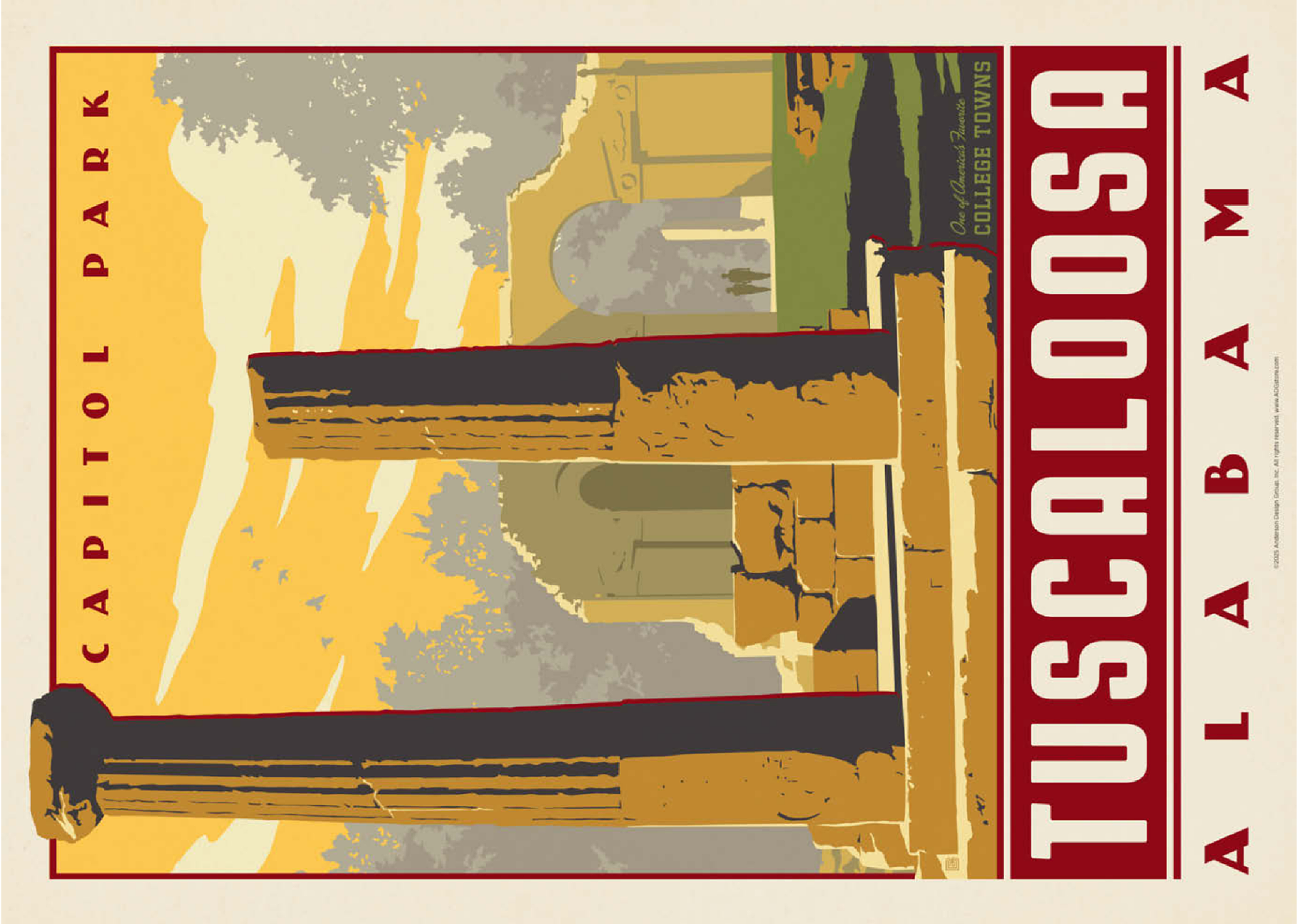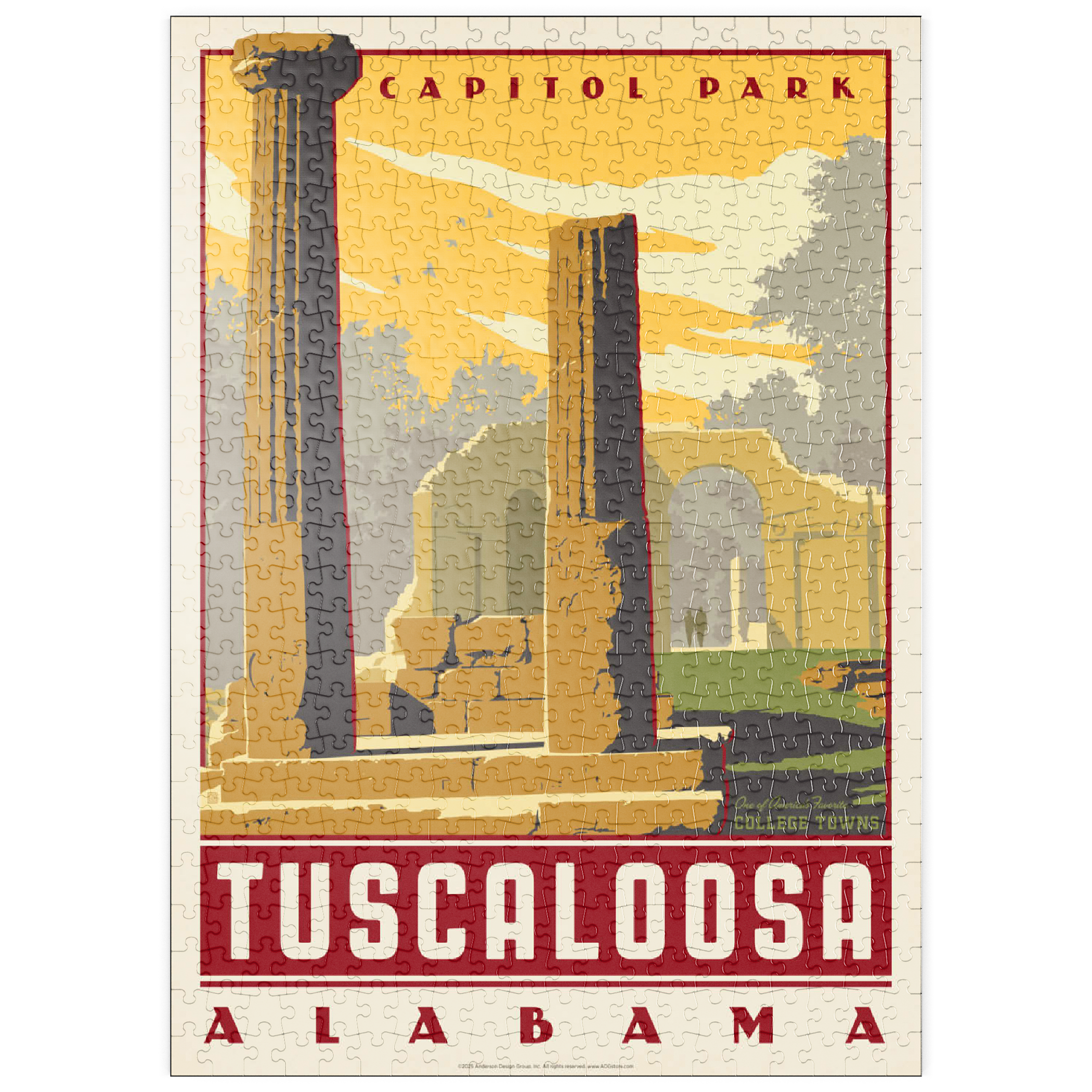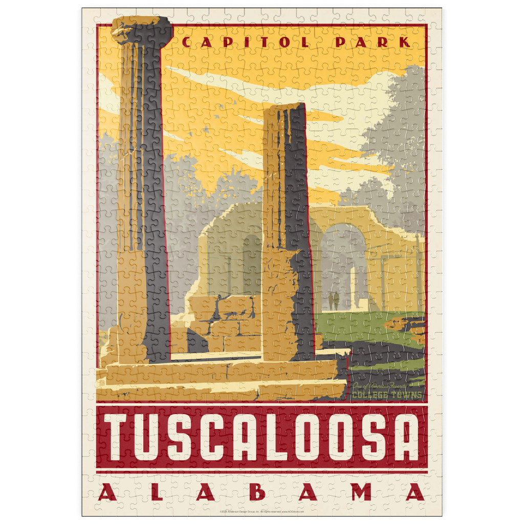 Tuscaloosa, Alabama, Heimat der University of Alabama, wird hier durch die beeindruckenden Ruinen des Capitol Park repräsentiert, wo einst das ehemalige Kapitol des Bundesstaates stand. Die verwitterten Steinsäulen und Überreste von Bögen vermitteln ein Gefühl von Geschichte und Widerstandsfähigkeit vor dem Hintergrund des warmen Sonnenuntergangs am Himmel des Südens. Dieser Ort, der an das Erbe Alabamas aus dem 19. Jahrhundert erinnert, ist heute ein friedlicher Park, der von Einheimischen, Studenten und Besuchern gleichermaßen geschätzt wird. Tuscaloosa verbindet seine reiche Geschichte mit einem pulsierenden Universitätsleben und ist damit eine der charakteristischsten Universitätsstädte des Südens. Dieses Kunstwerk unterstreicht seinen historischen Charme und sein kulturelles Erbe.
