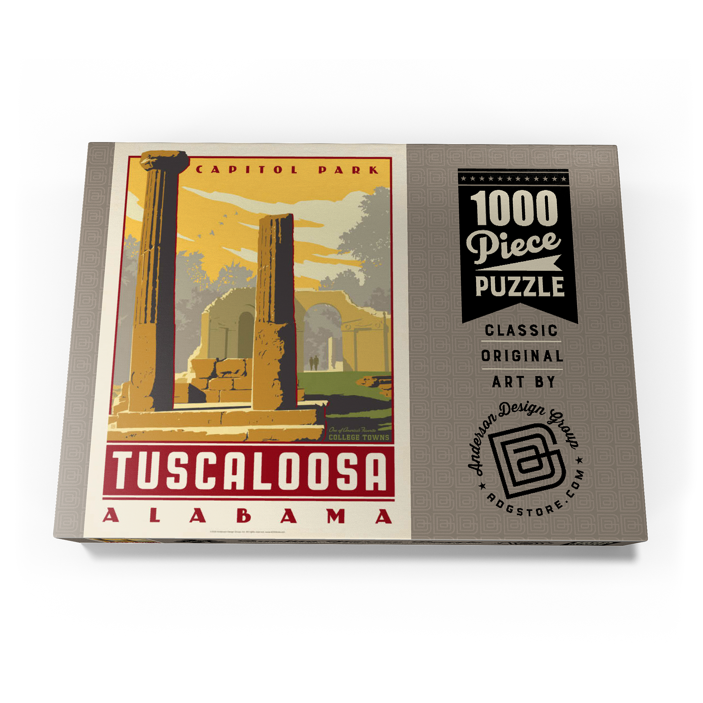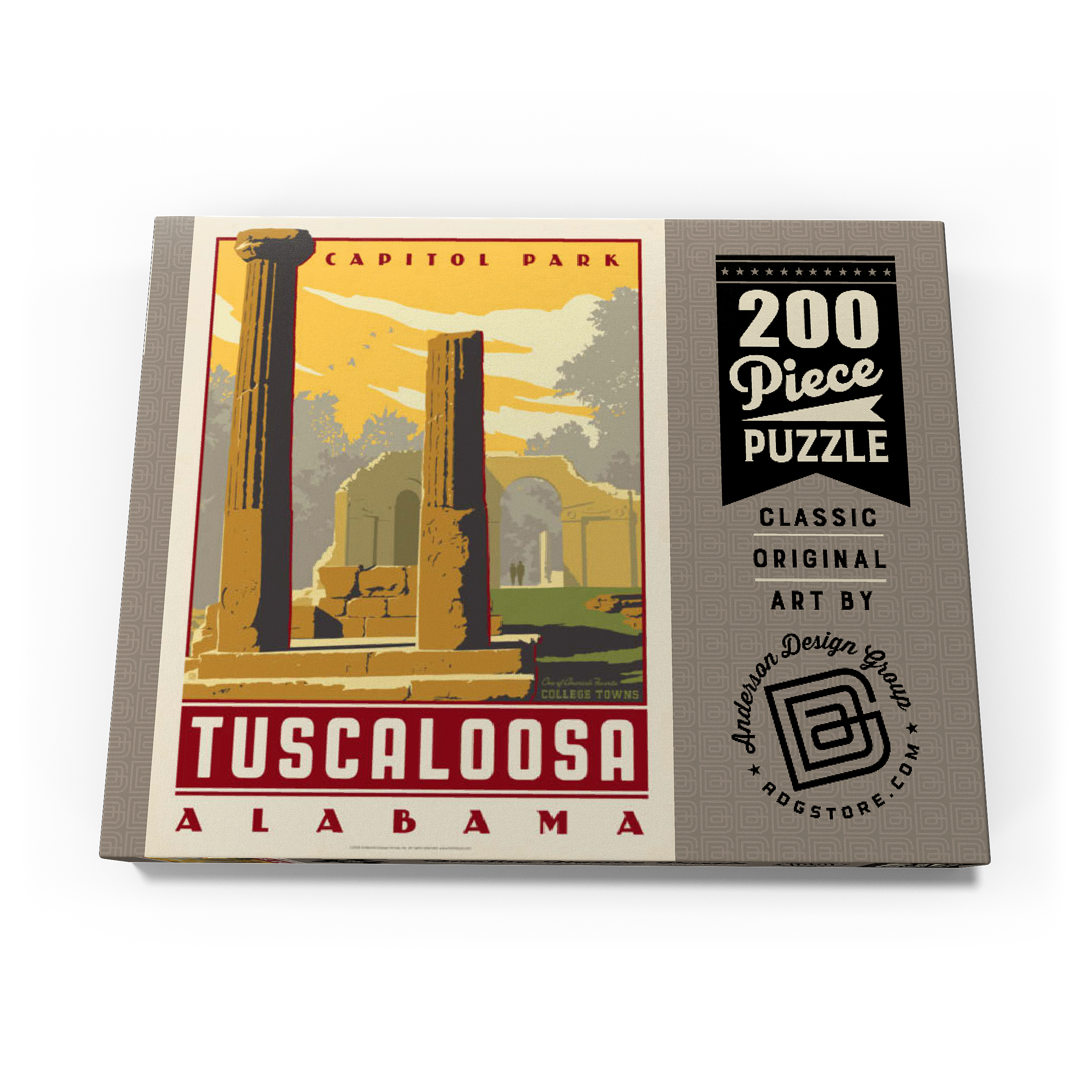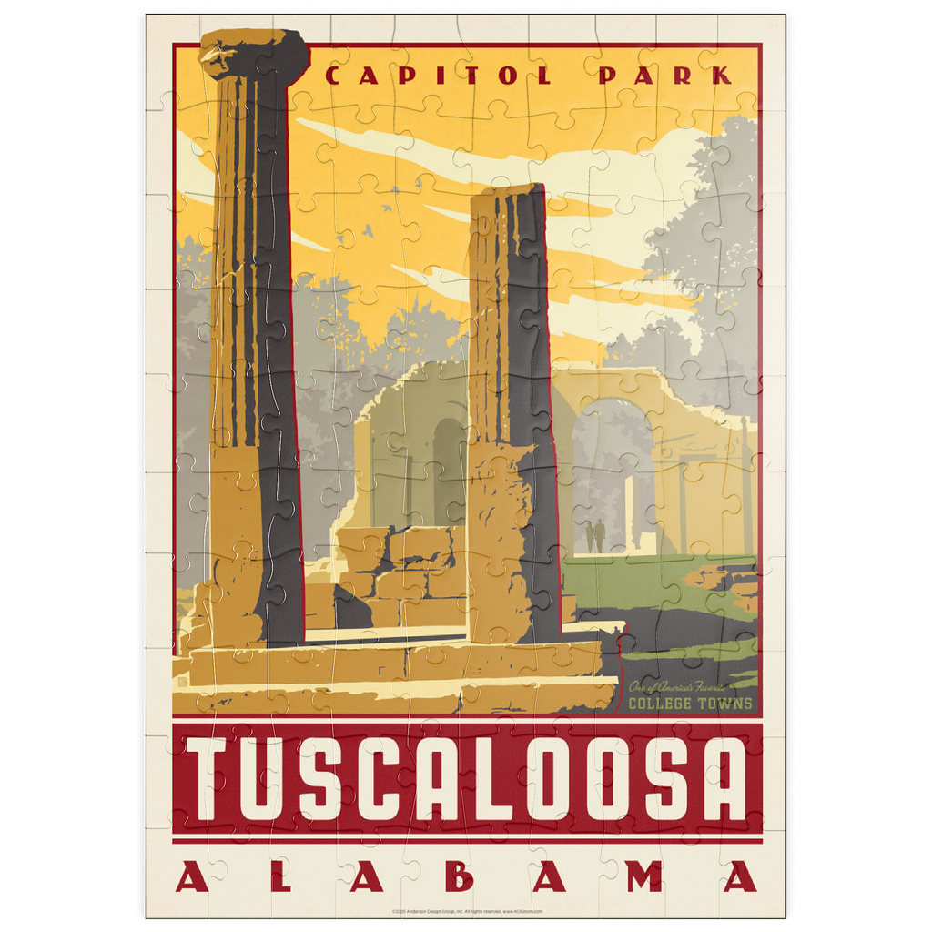Tuscaloosa, Alabama, Heimat der University of Alabama, wird hier durch die beeindruckenden Ruinen des Capitol Park repräsentiert, wo einst das ehemalige Kapitol des Bundesstaates stand. Die verwitterten Steinsäulen und Überreste von Bögen vermitteln ein Gefühl von Geschichte und Widerstandsfähigkeit vor dem Hintergrund des warmen Sonnenuntergangs am Himmel des Südens. Dieser Ort, der an das Erbe Alabamas aus dem 19. Jahrhundert erinnert, ist heute ein friedlicher Park, der von Einheimischen, Studenten und Besuchern gleichermaßen geschätzt wird. Tuscaloosa verbindet seine reiche Geschichte mit einem pulsierenden Universitätsleben und ist damit eine der charakteristischsten Universitätsstädte des Südens. Dieses Kunstwerk unterstreicht seinen historischen Charme und sein kulturelles Erbe.