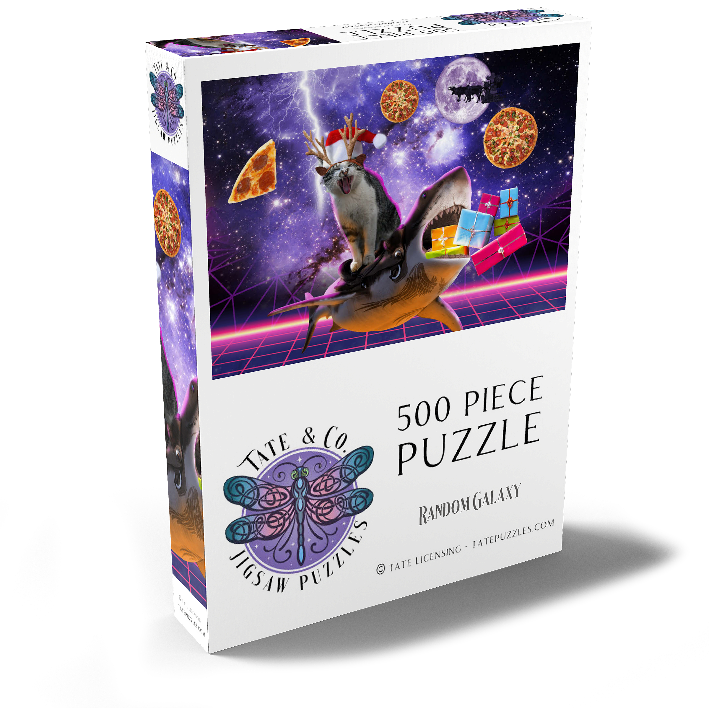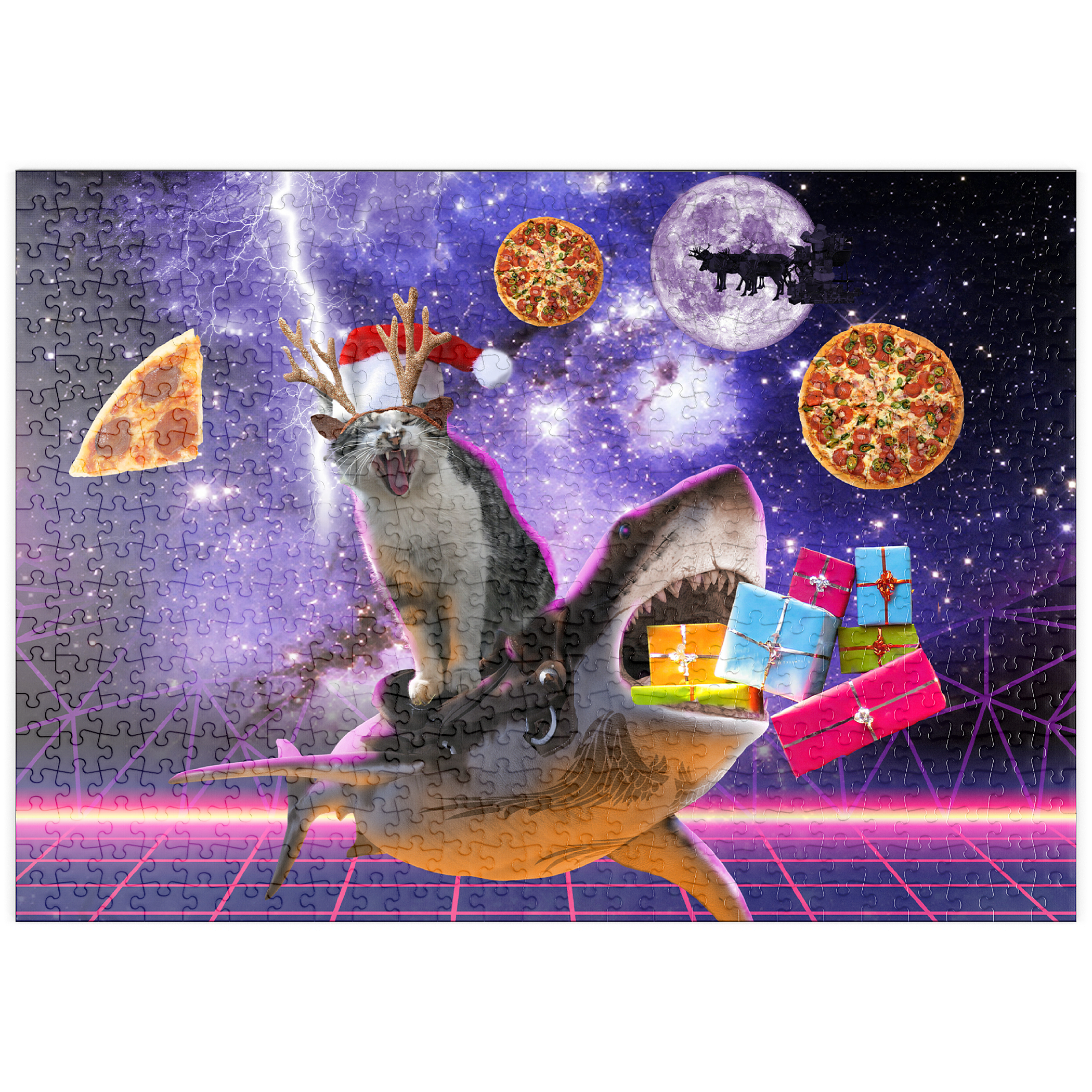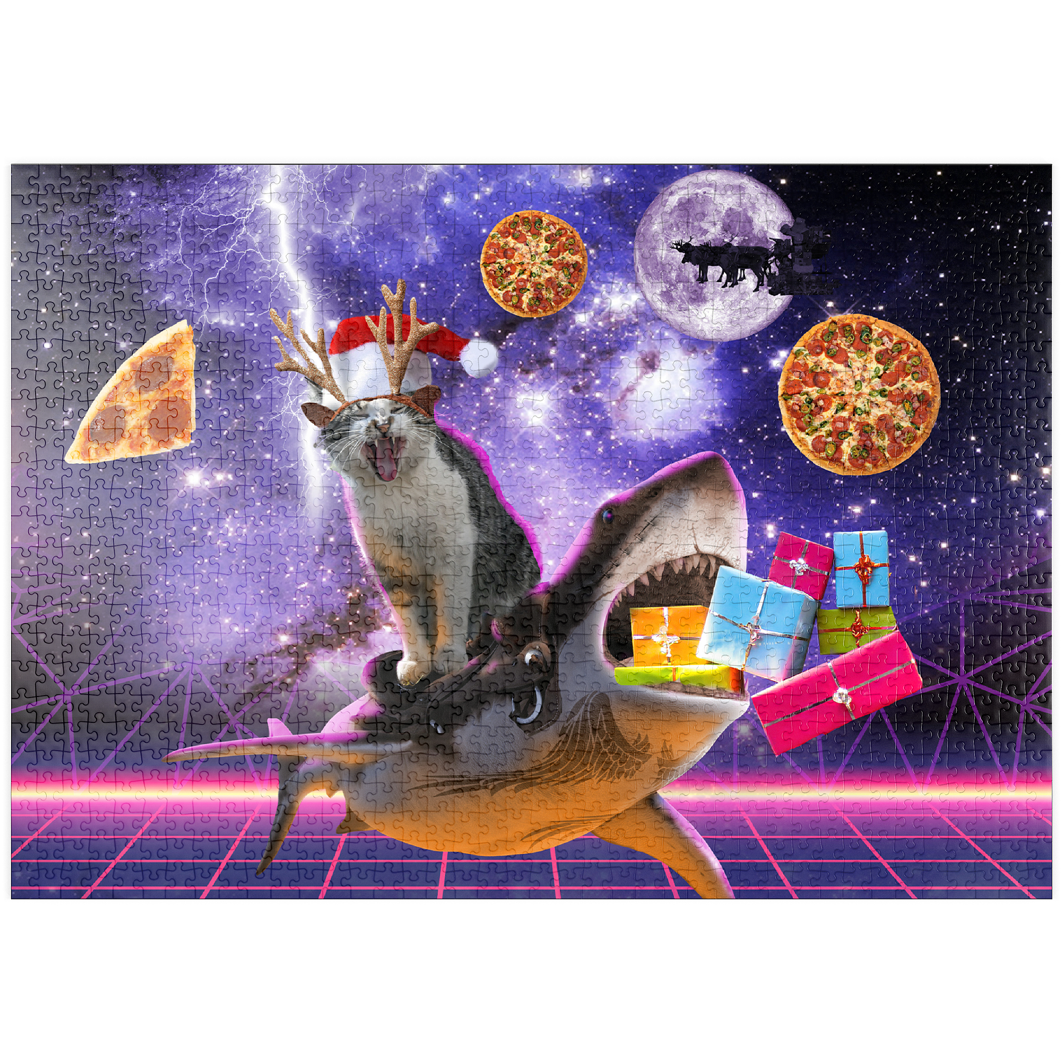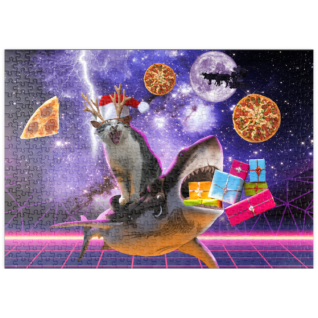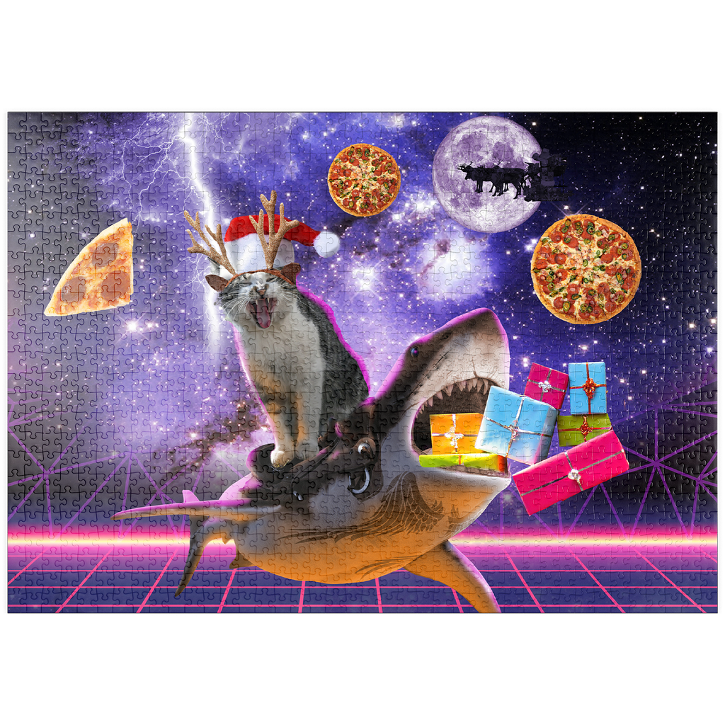 Ein furchtloser Katzen-Surfer rast auf einem mächtigen Weltraumhai durch den Kosmos! Glitzerndes Sternenlicht und funkelnde Weihnachtskometen erhellen diese abenteuerliche Weihnachtsfahrt. Dieses Puzzle strotzt nur so vor interstellarer Fröhlichkeit und fängt den typischen Humor von Random Galaxy ein – wo Katzen, Haie und Weihnachtsmützen sich zu einer kosmischen Feier vereinen.