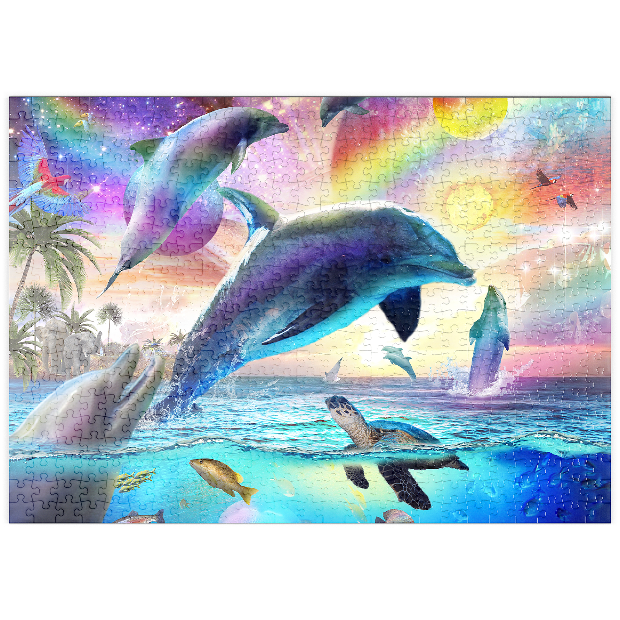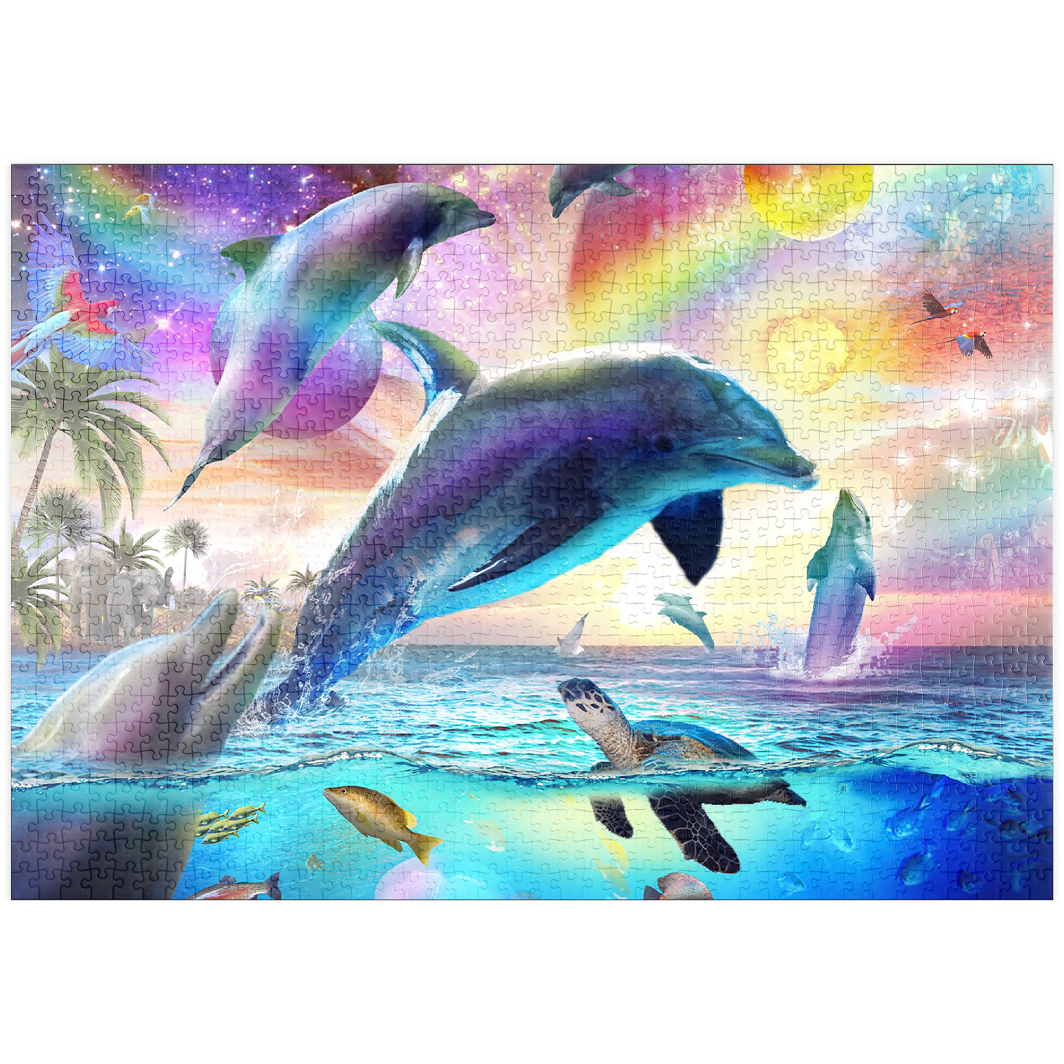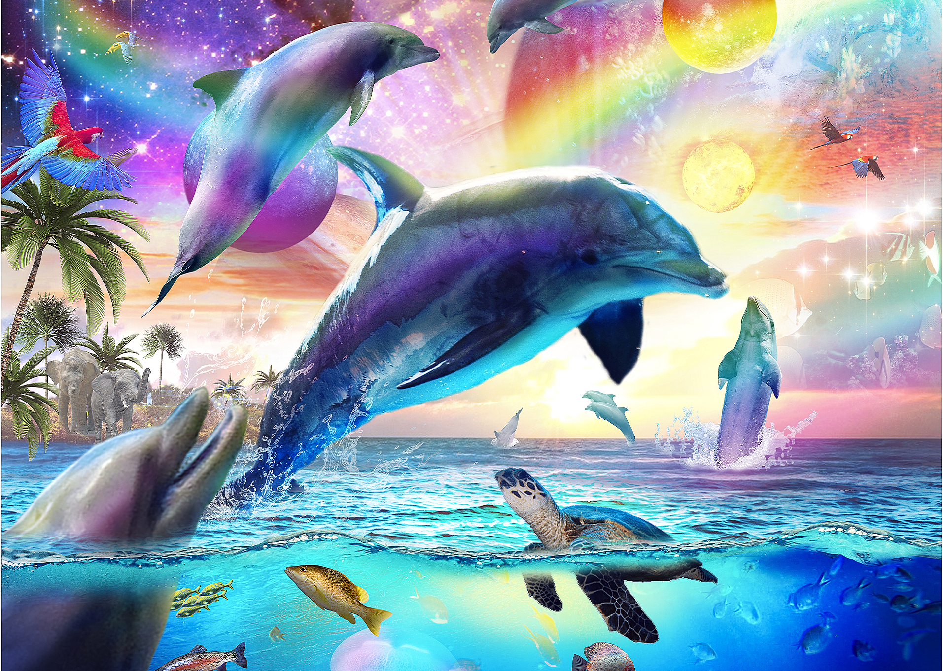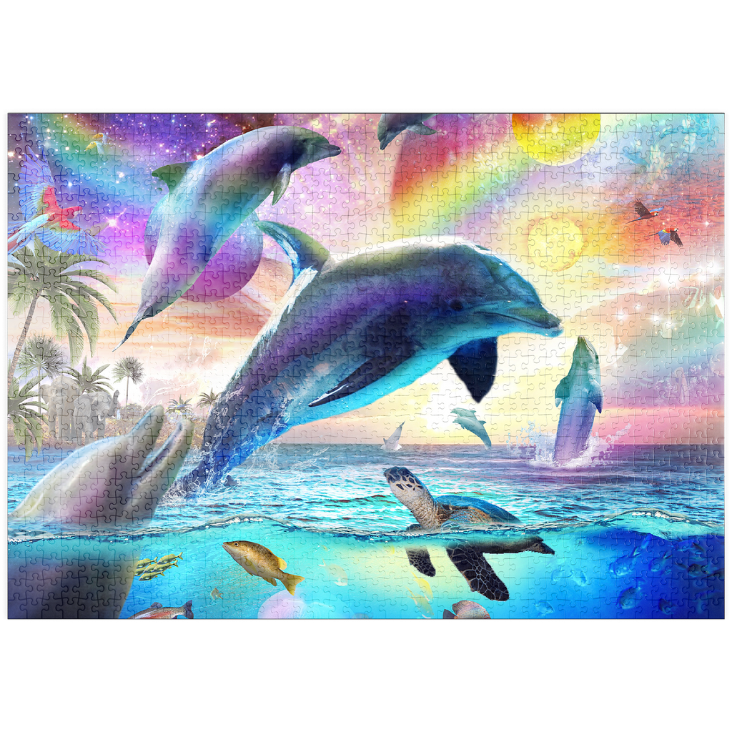 Ein strahlender Delphin springt durch türkisfarbene Wellen, die in allen Farben des Kosmos schimmern. Sternenlicht tanzt entlang seiner Flossen, während sich Galaxien auf der Meeresoberfläche spiegeln. Dieses bezaubernde Kunstwerk „Random Galaxy“ verbindet die Schönheit des Meeres mit den Wundern des Himmels und verwandelt eine einfache Meereslandschaft in einen Traum aus Farben, Licht und grenzenloser Fantasie.