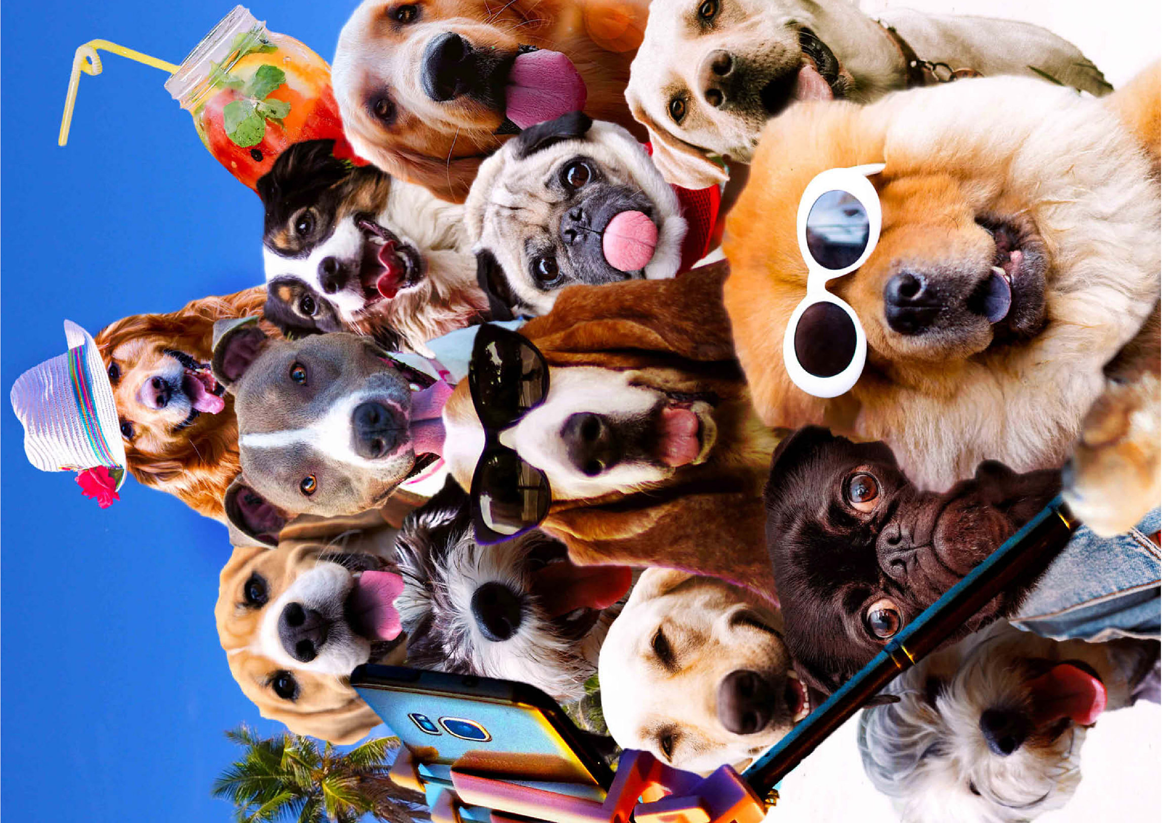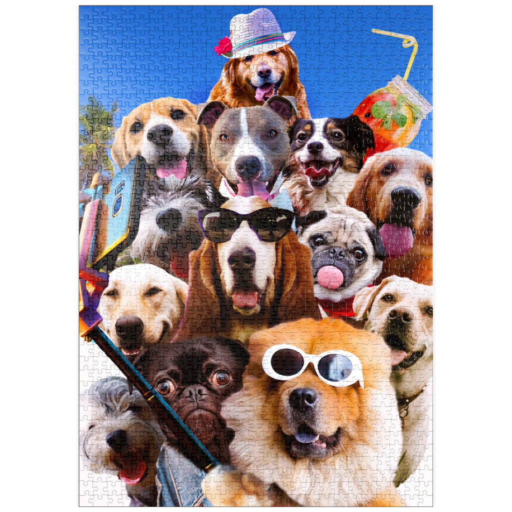 Entzückende Hunde posieren für ein Strand-Selfie und wedeln mit dem Schwanz. Dieses fröhliche Werk fängt Random Galaxys humorvolle Sichtweise auf Haustiere und moderne Popkultur ein.