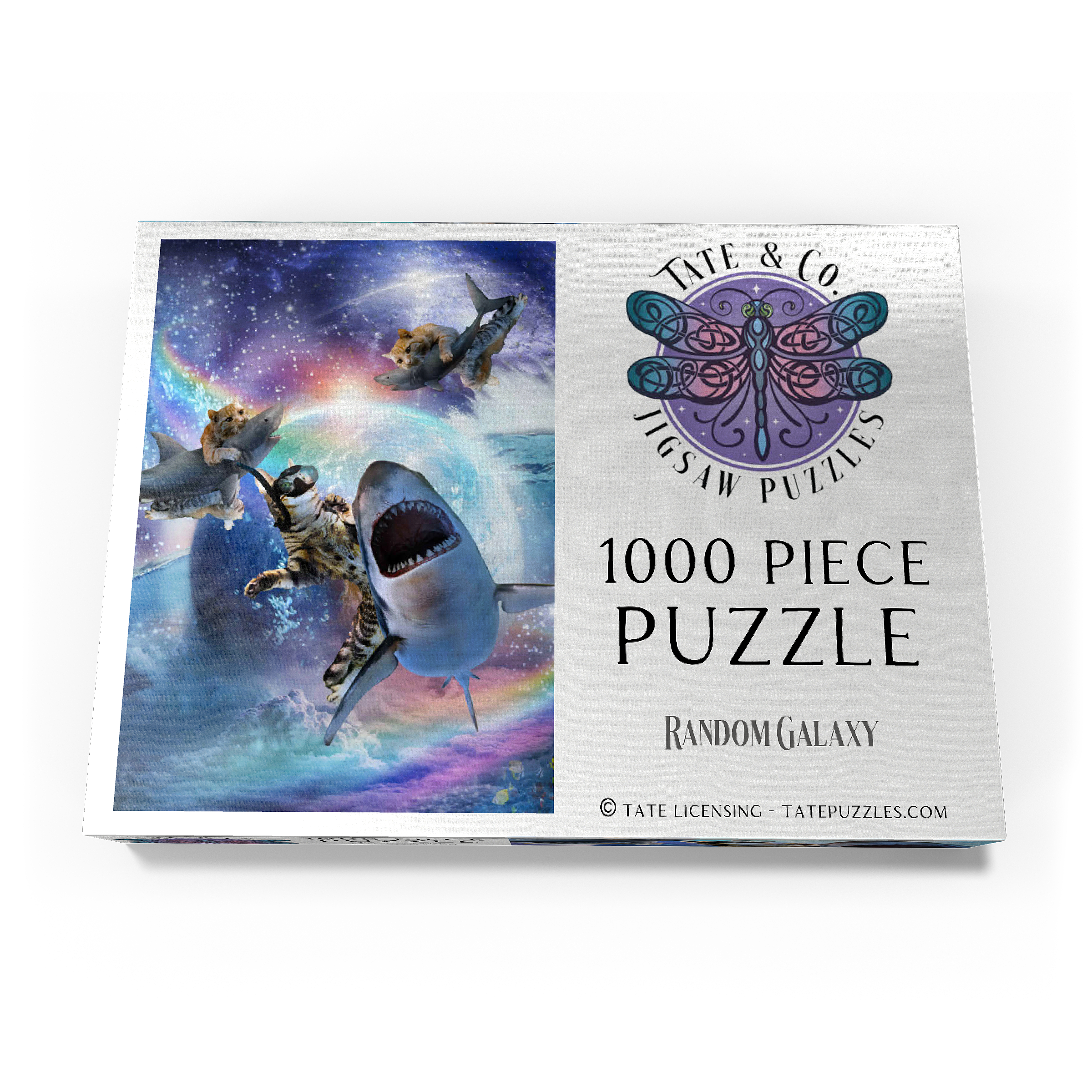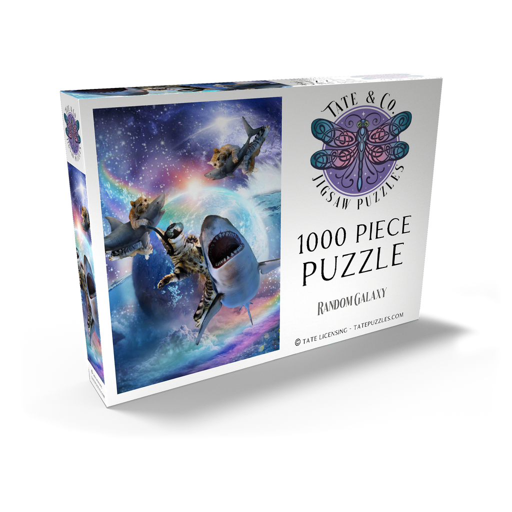 Eine furchtlose Katze in Astronautenanzug reitet auf einem kosmischen Hai durch leuchtende Galaxien. Ein surreales Abenteuer, das Gefahr, Weltraum und katzenhafte Heldentaten im typischen Random Galaxy-Stil miteinander verbindet.
