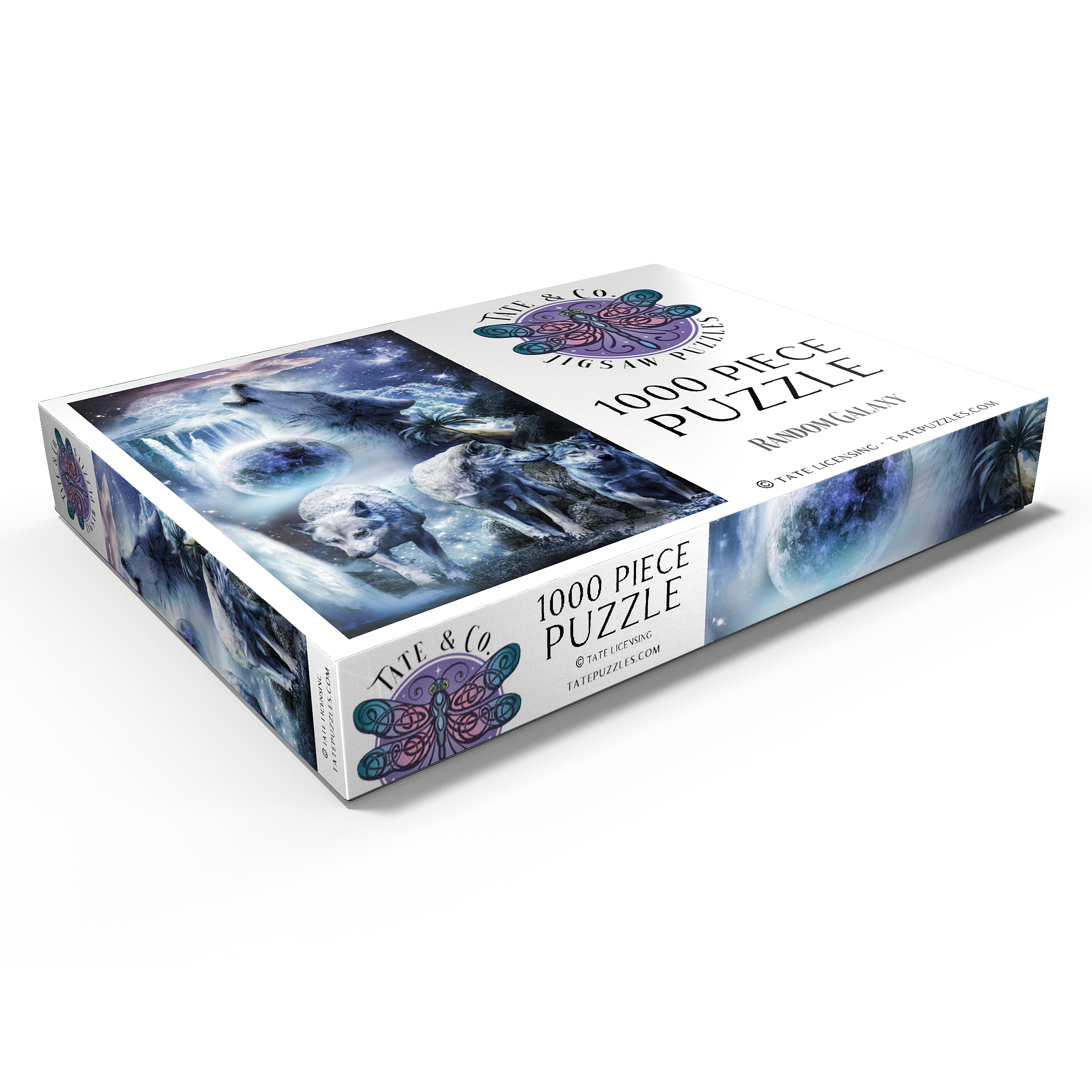 Ein leuchtender Wolf steht am Rande eines himmlischen Wasserfalls und heult unter fallenden Sternen. Dieses Werk verbindet die Erhabenheit der Natur mit überirdischer Wunderbarkeit und verkörpert Random Galaxys traumhafte Verschmelzung von Fantasie und Weltraum.