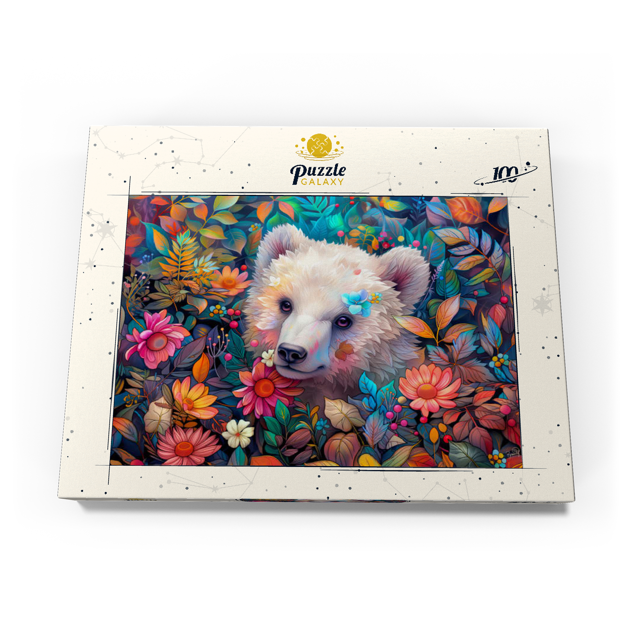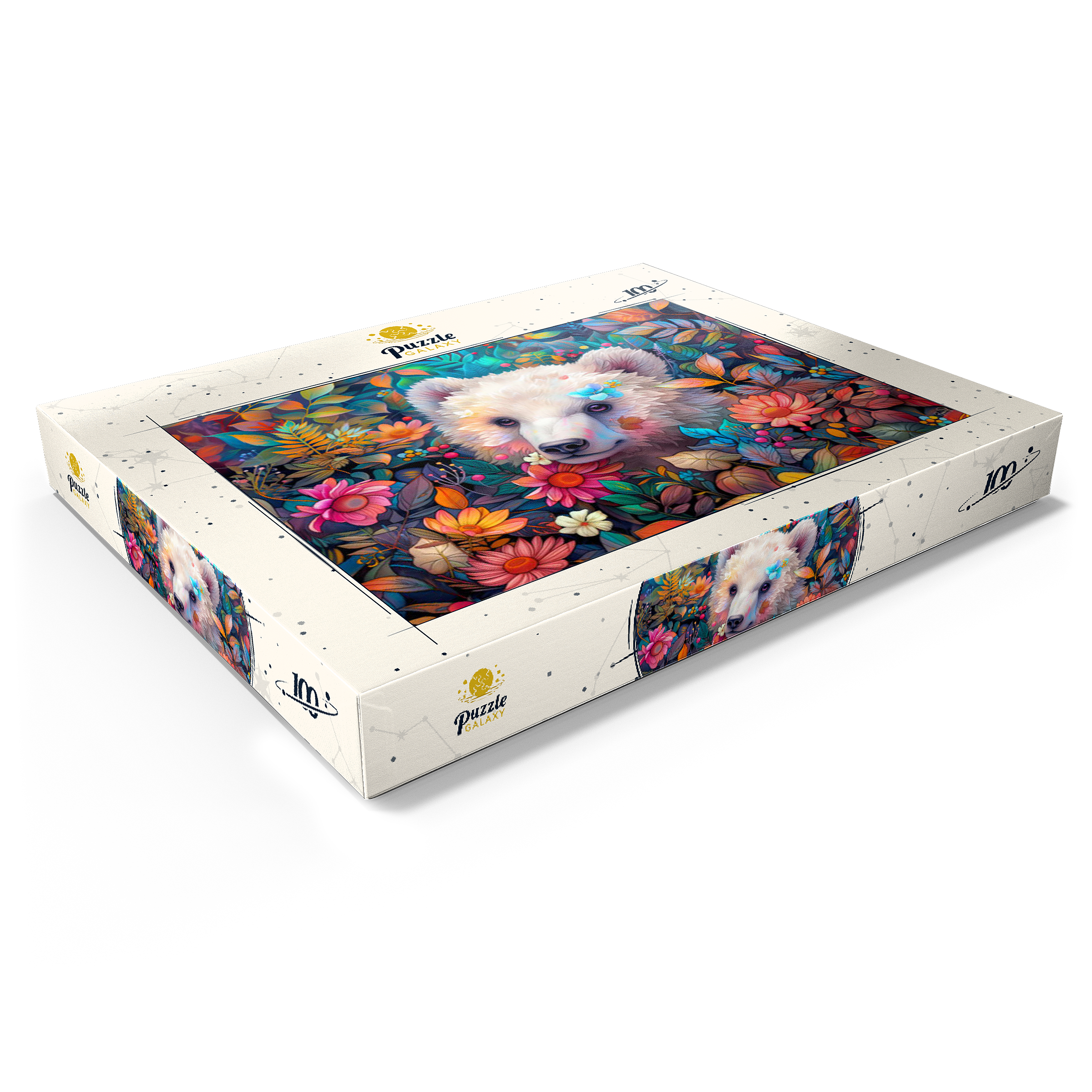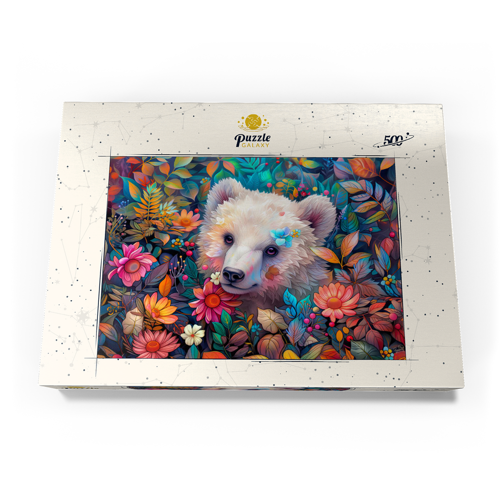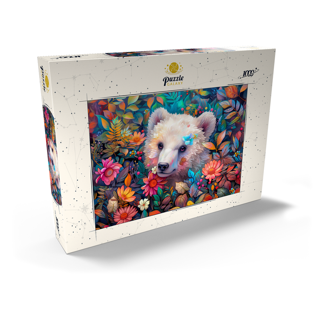 Entzückendes weißes Bärenjunges, umgeben von bunten Blumen