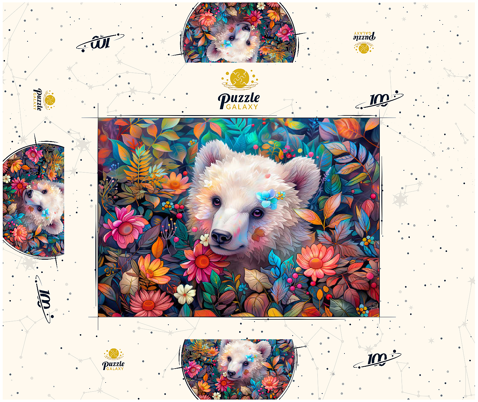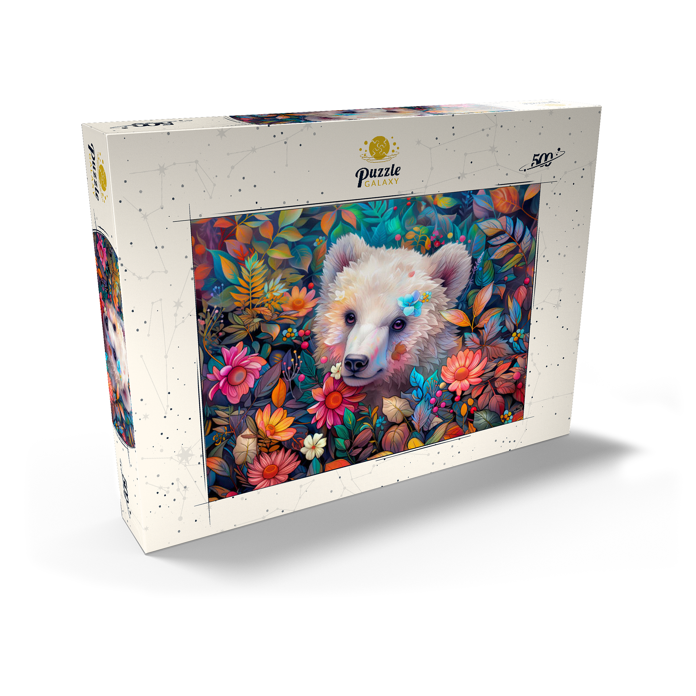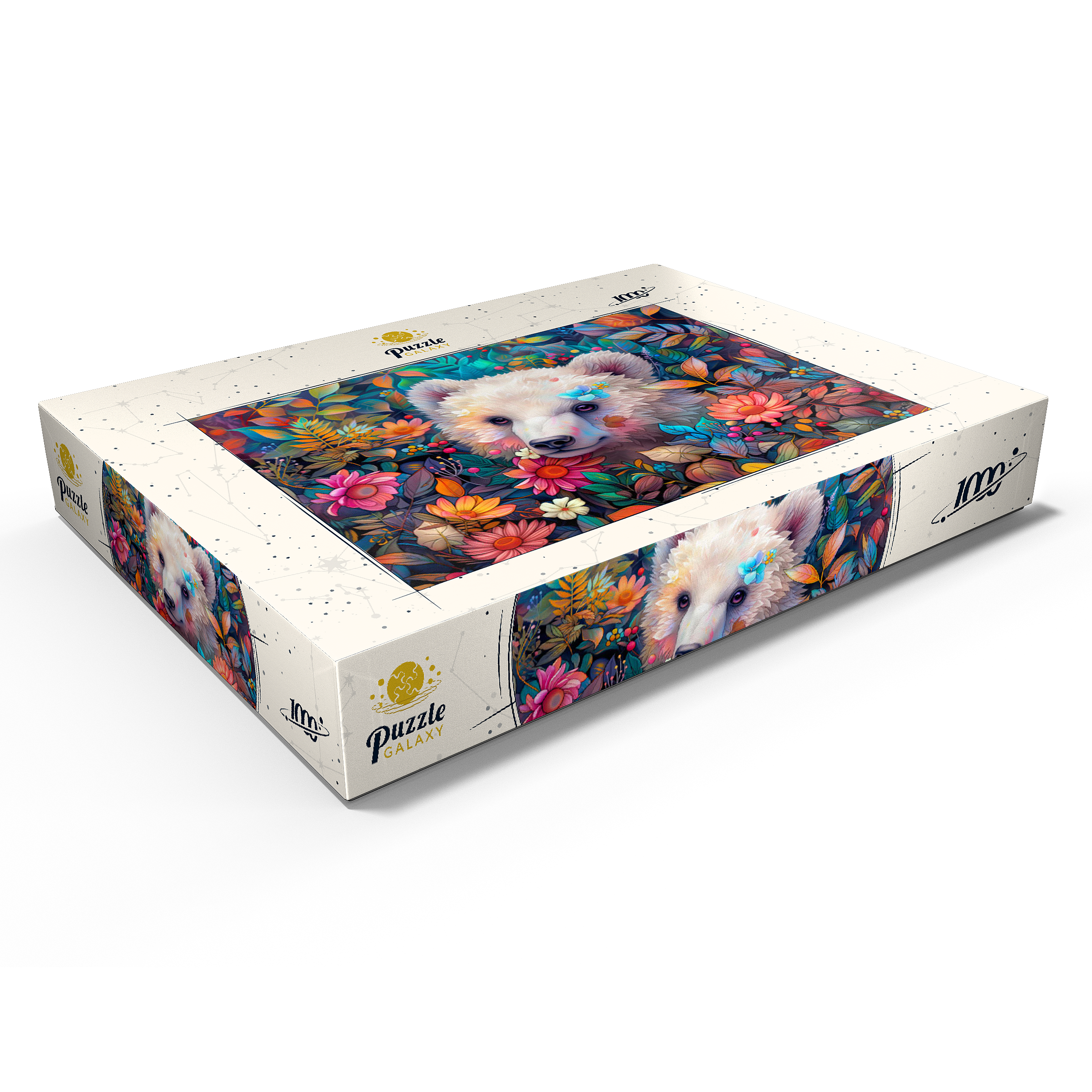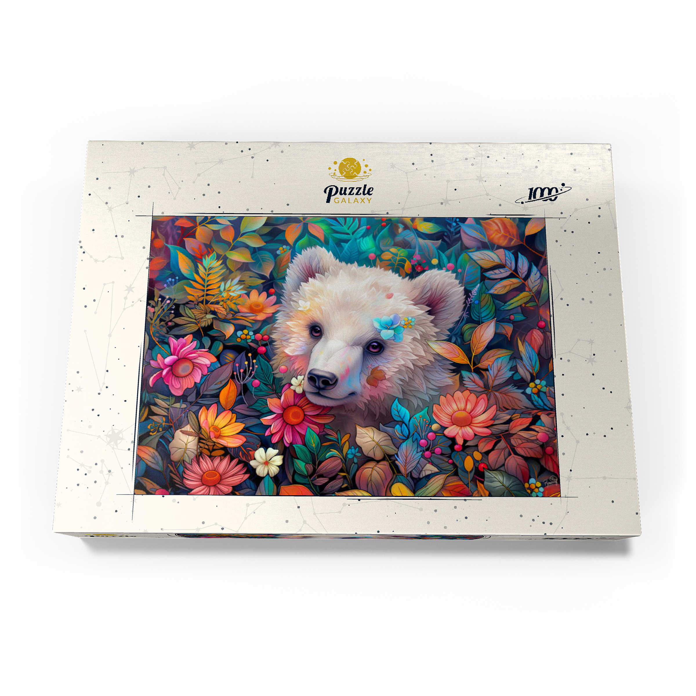 Entzückendes weißes Bärenjunges, umgeben von bunten Blumen